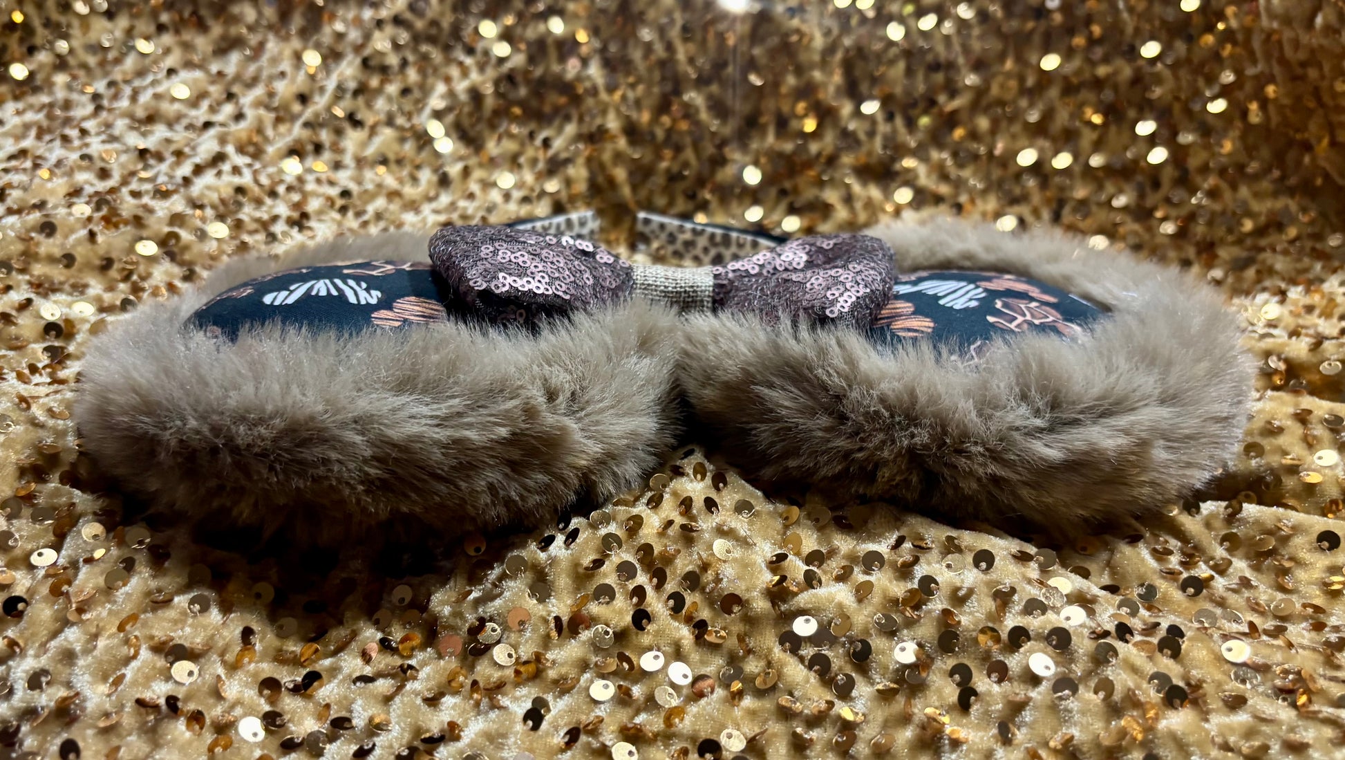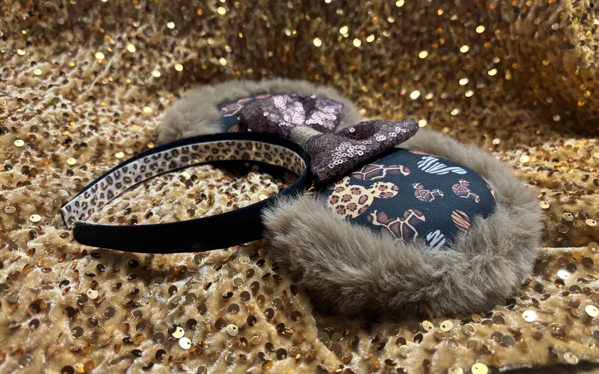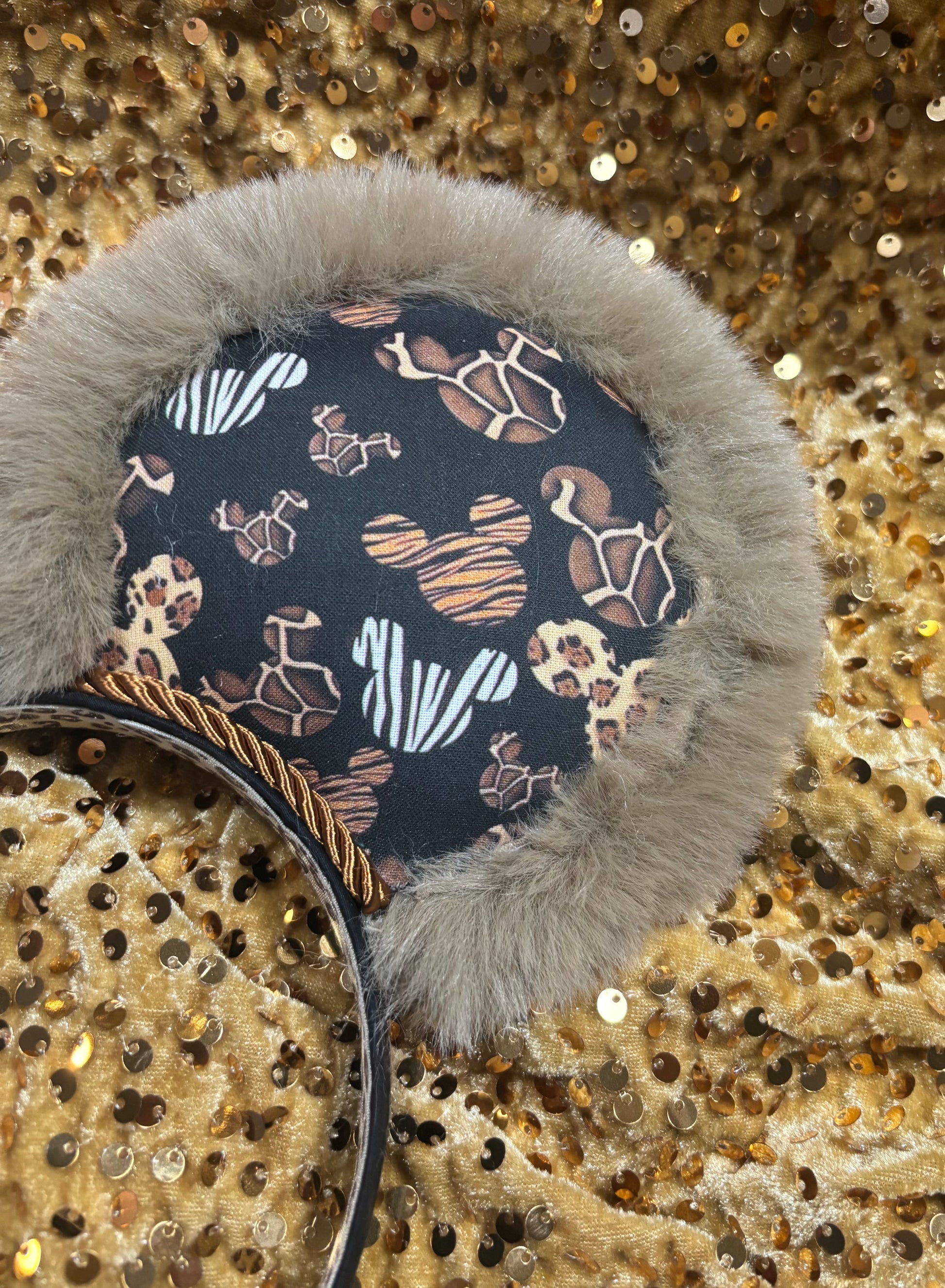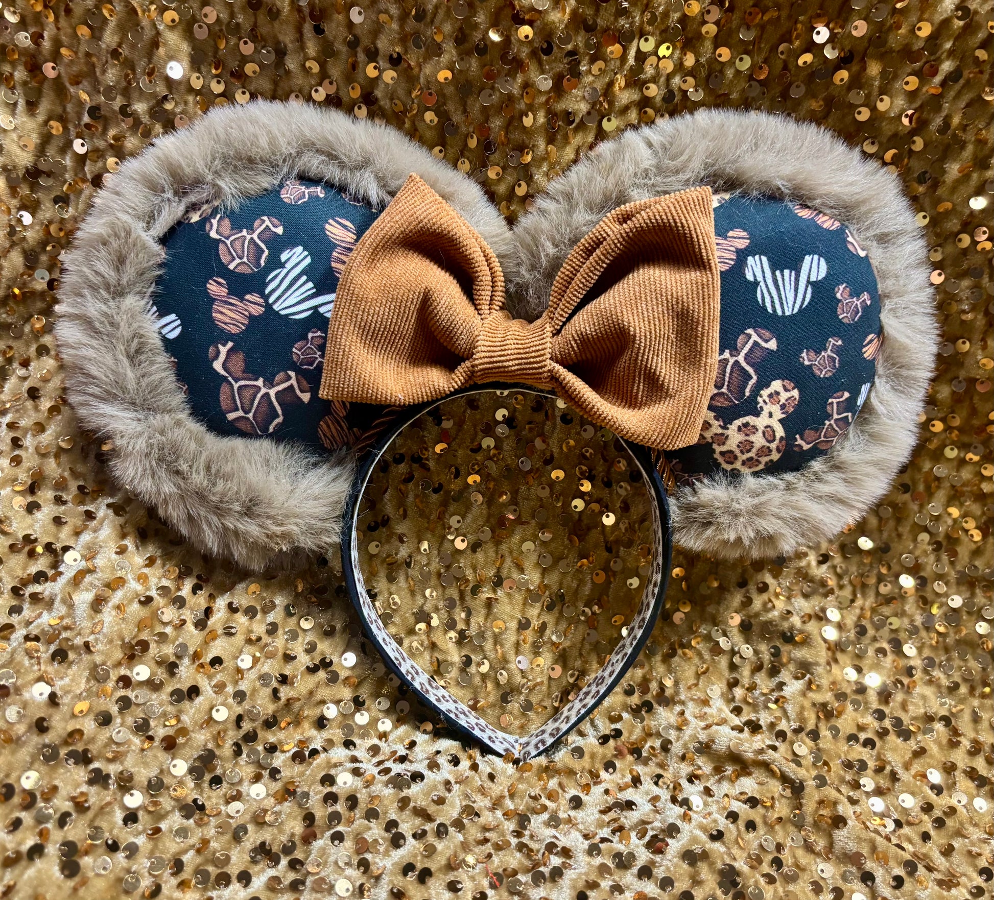 The fabric is on the mouse ears front and back. The headband has black fabric and is elastic lined. Copper colored Twisted trim along inner ears and a bow of your choice. All items are made and ready to ship. I ship through usps in a box. Not responsible for shipping delays once usps has your order. No refunds but please contact me if anything is wrong with your order when it arrives. These are handmade and ready to ship. headband is universal sized and fits most. Please write which bow you want in the notes or send me a message. If not, the default bow color attached it gold velvet sequin. Thank you for looking.