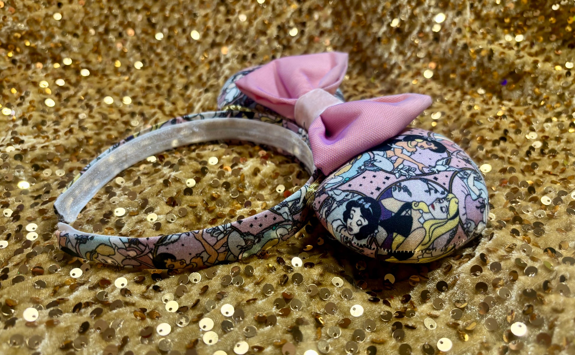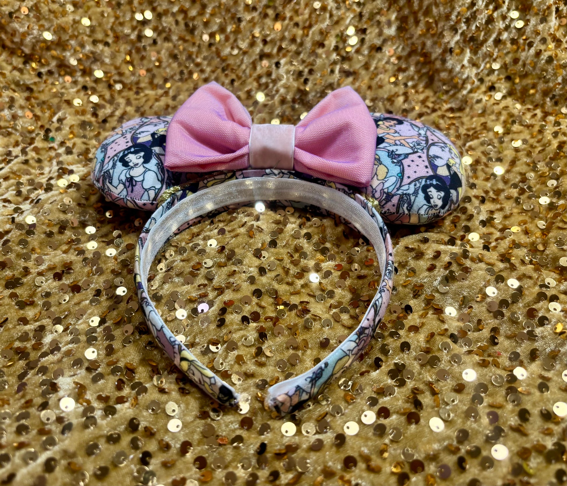 Blushing Princesses Mouse Ears! Made with fabric on both front and back, these ears feature a stunning gold twisted trim and a pink bow. I also have a golden pleather bow as pictured if you prefer. If you want a sequin bow, No problem, just leave a note or message us what color and I’ll happily attach it. Handmade with love, each set is unique and features elastic on the inner headband for a comfortable fit. Perfect for any Disney fan!
