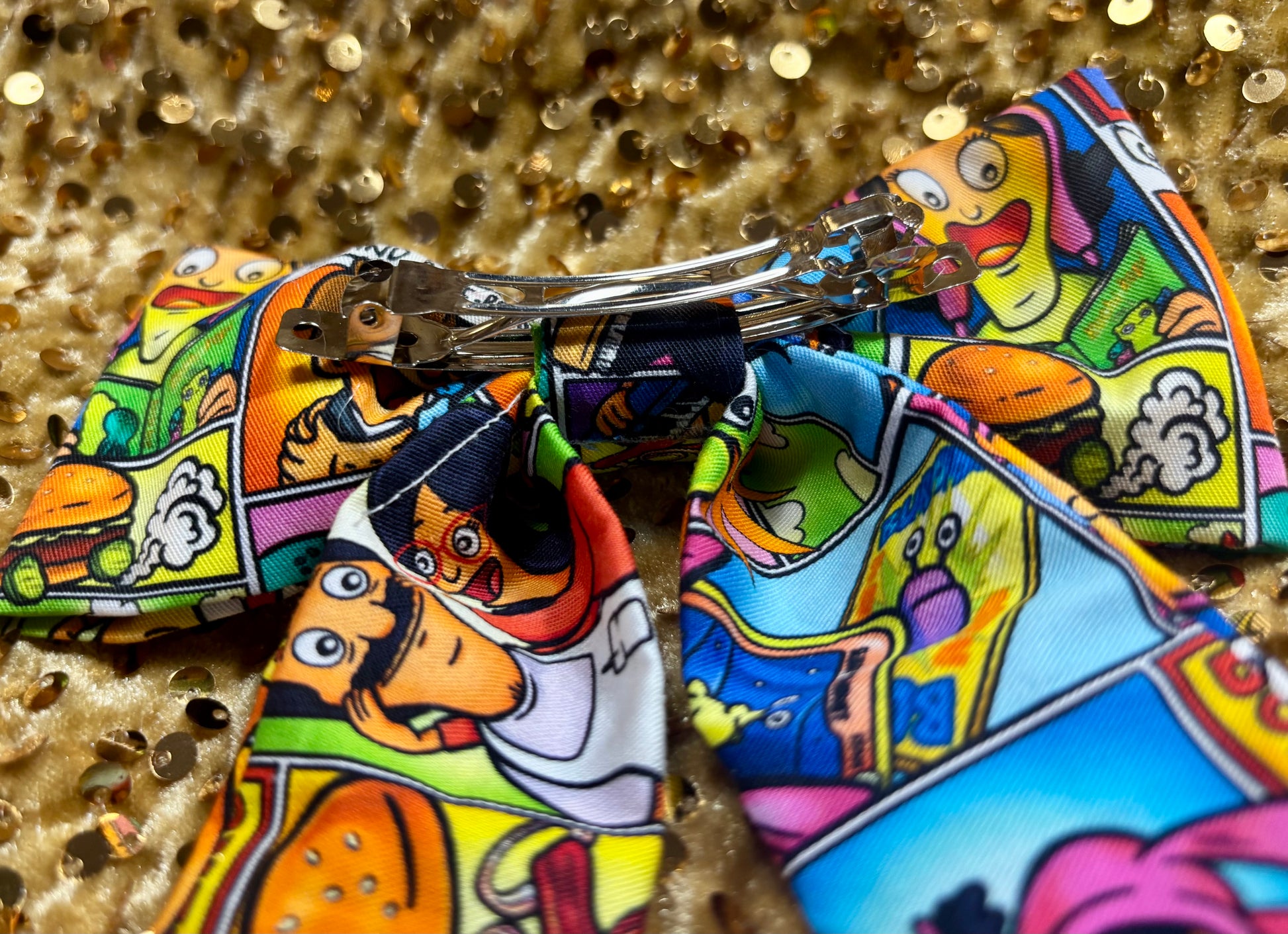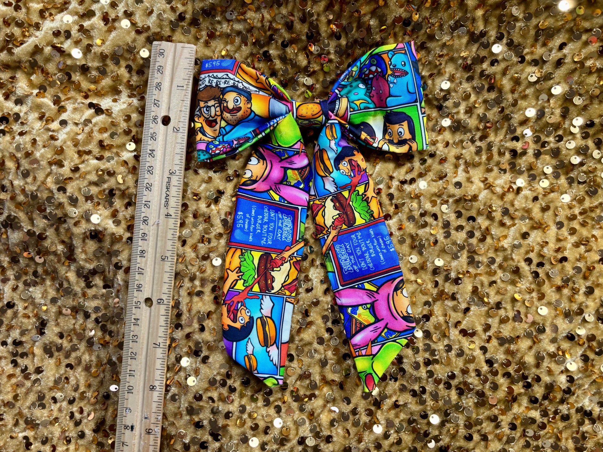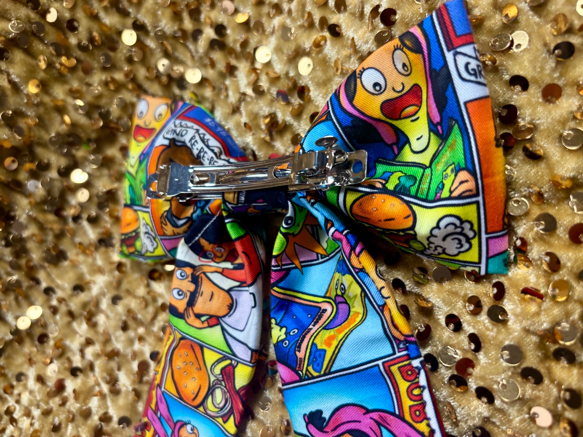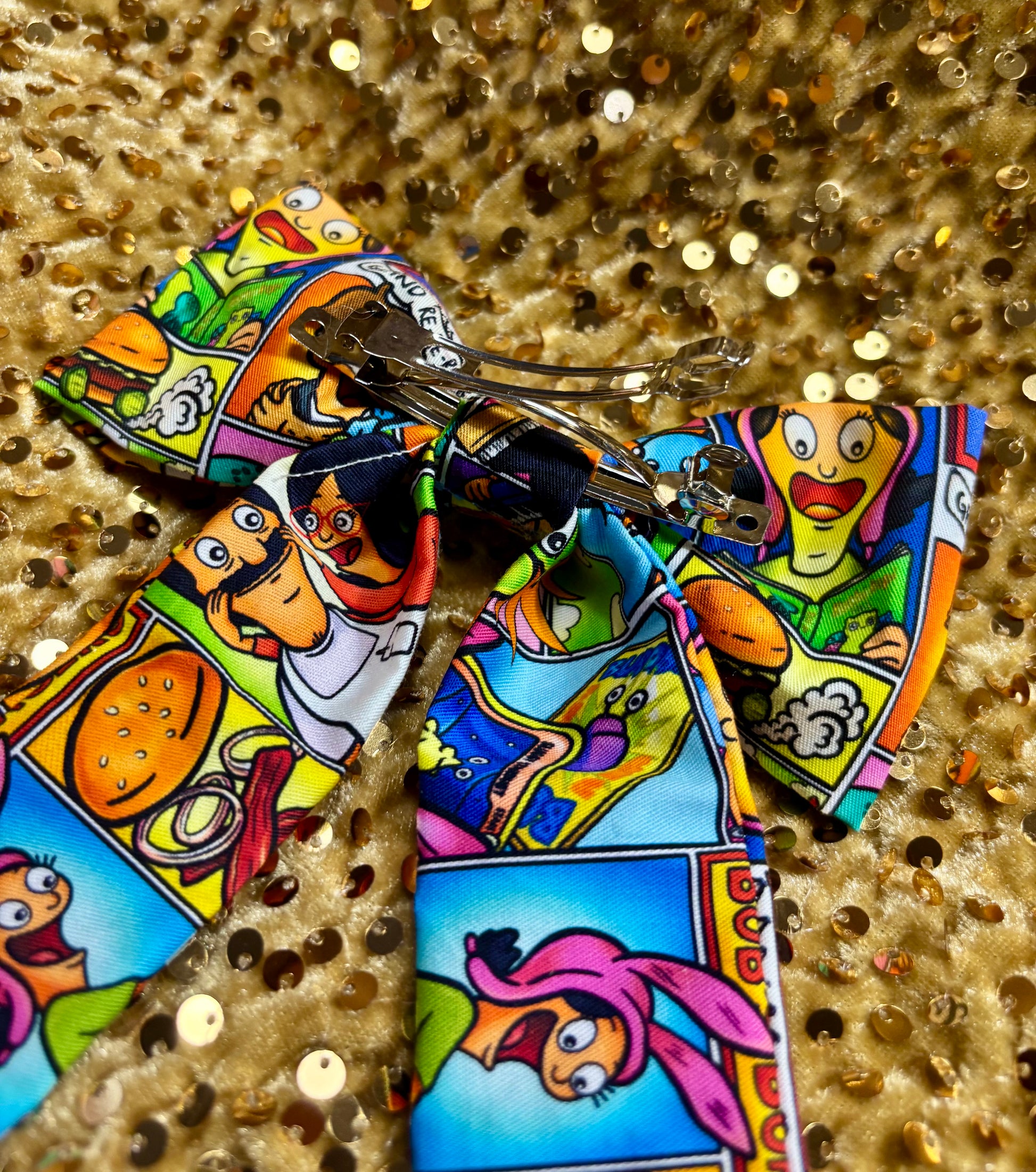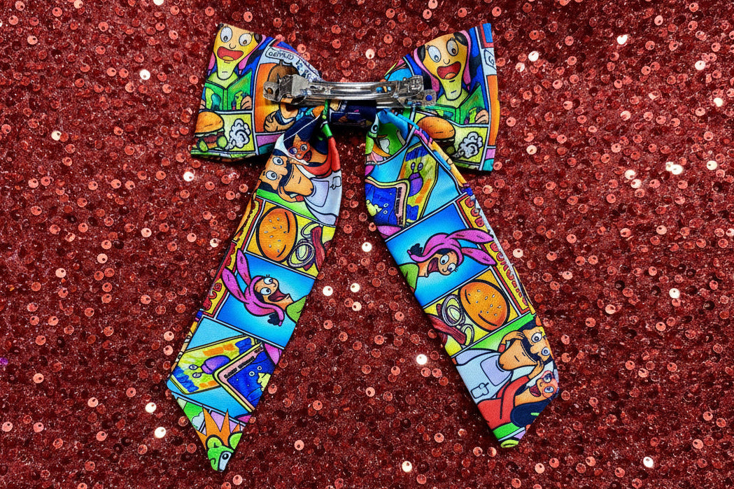 - French-Tailed Hair Bow โ Bob's Burgers themed, cotton fabric with a secure French barrette backing