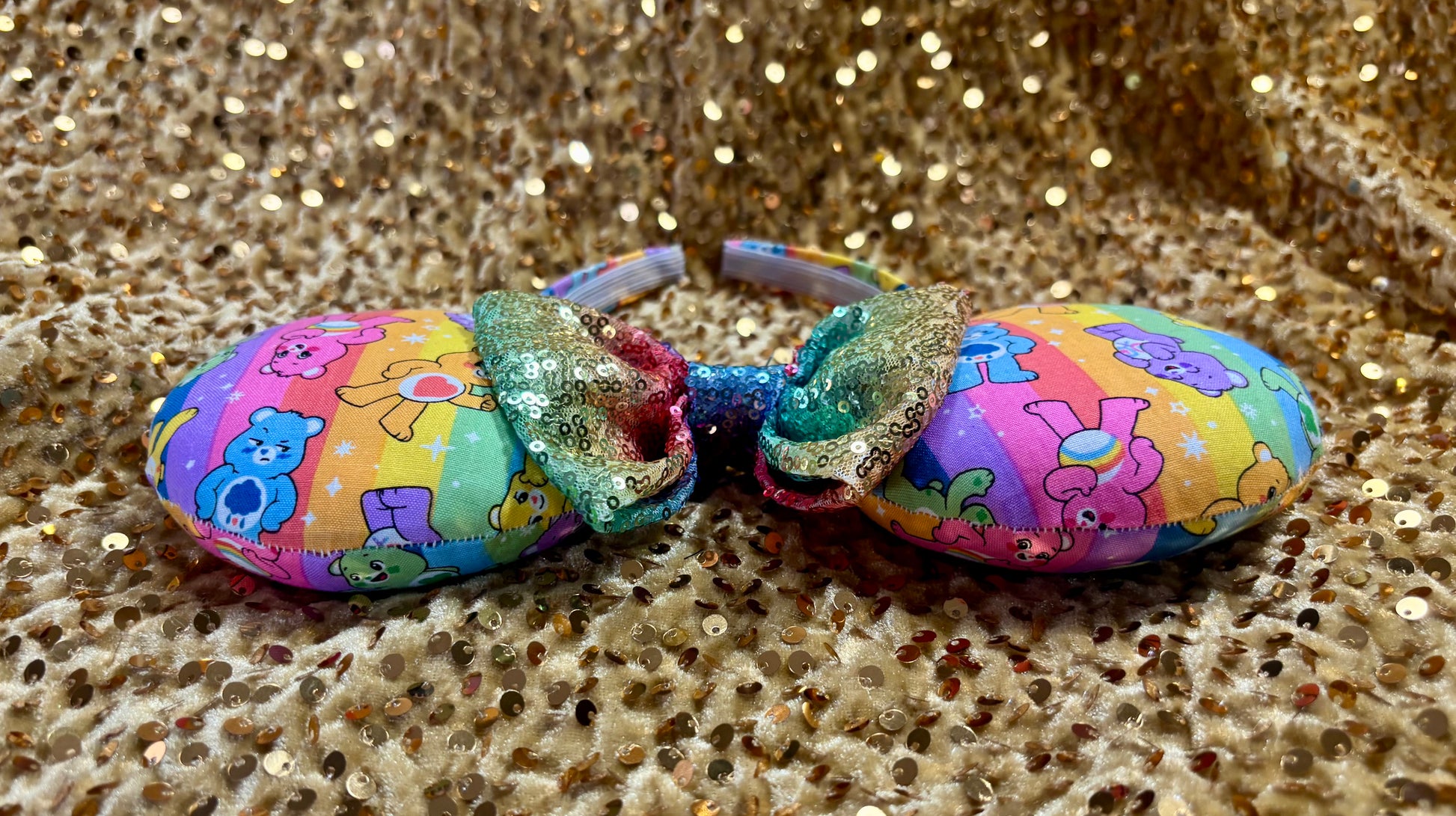 A beloved nostalgic print mixed with theme park fashion with our Care Bears Inspired Mouse Ears! Would be perfect for PRIDE as well. Featuring a unique design with fabric on both sides and on the headband as well. With reinforced stitching, pink trim, and a rainbow sequin bow. If you prefer a different color, just write what sequin bow color in the note in your order and I’ll happily attach it. These ears are both stylish and sturdy. One size fits most. Contact us with any issues upon arrival. US shipping is FREE.