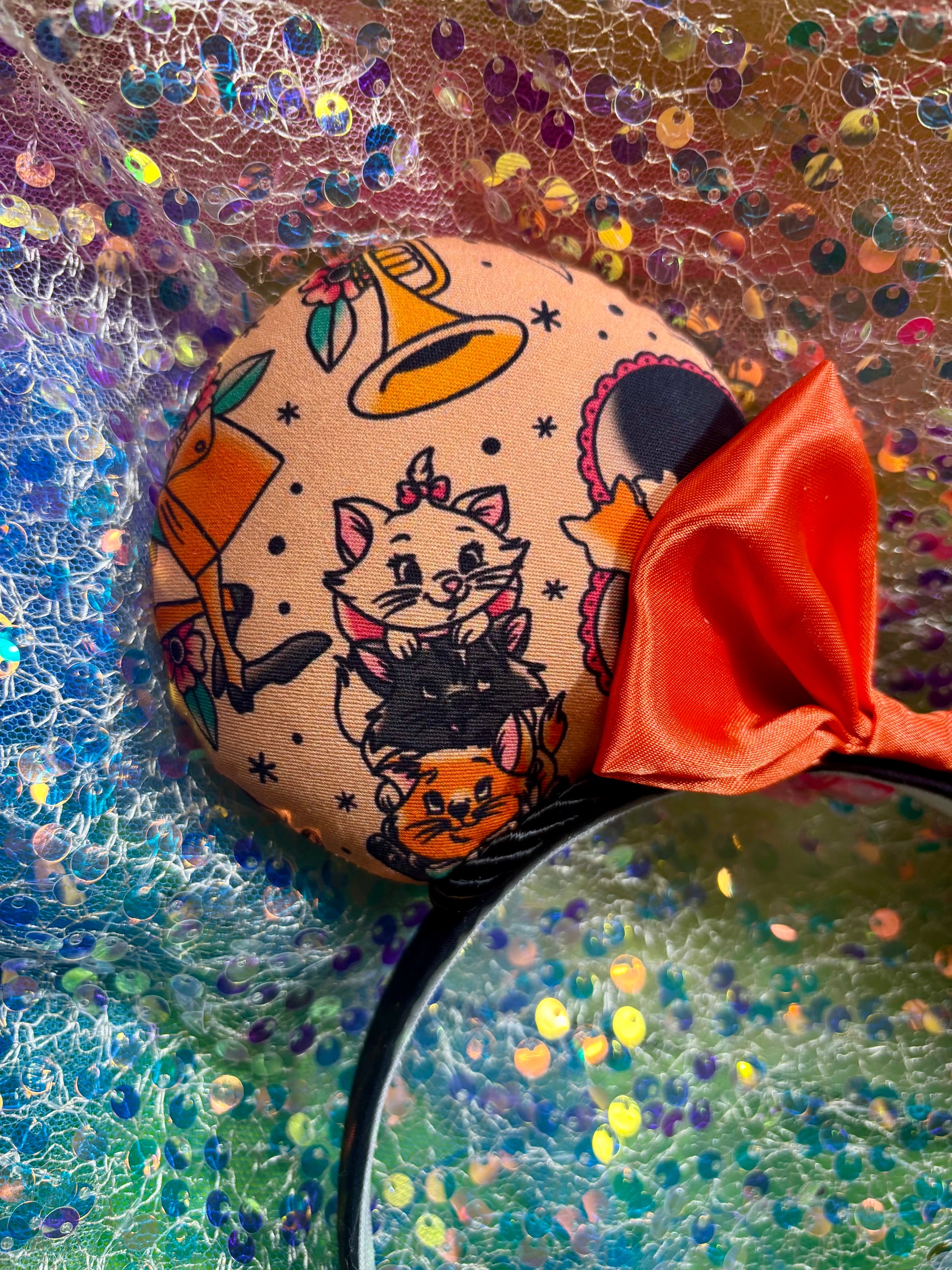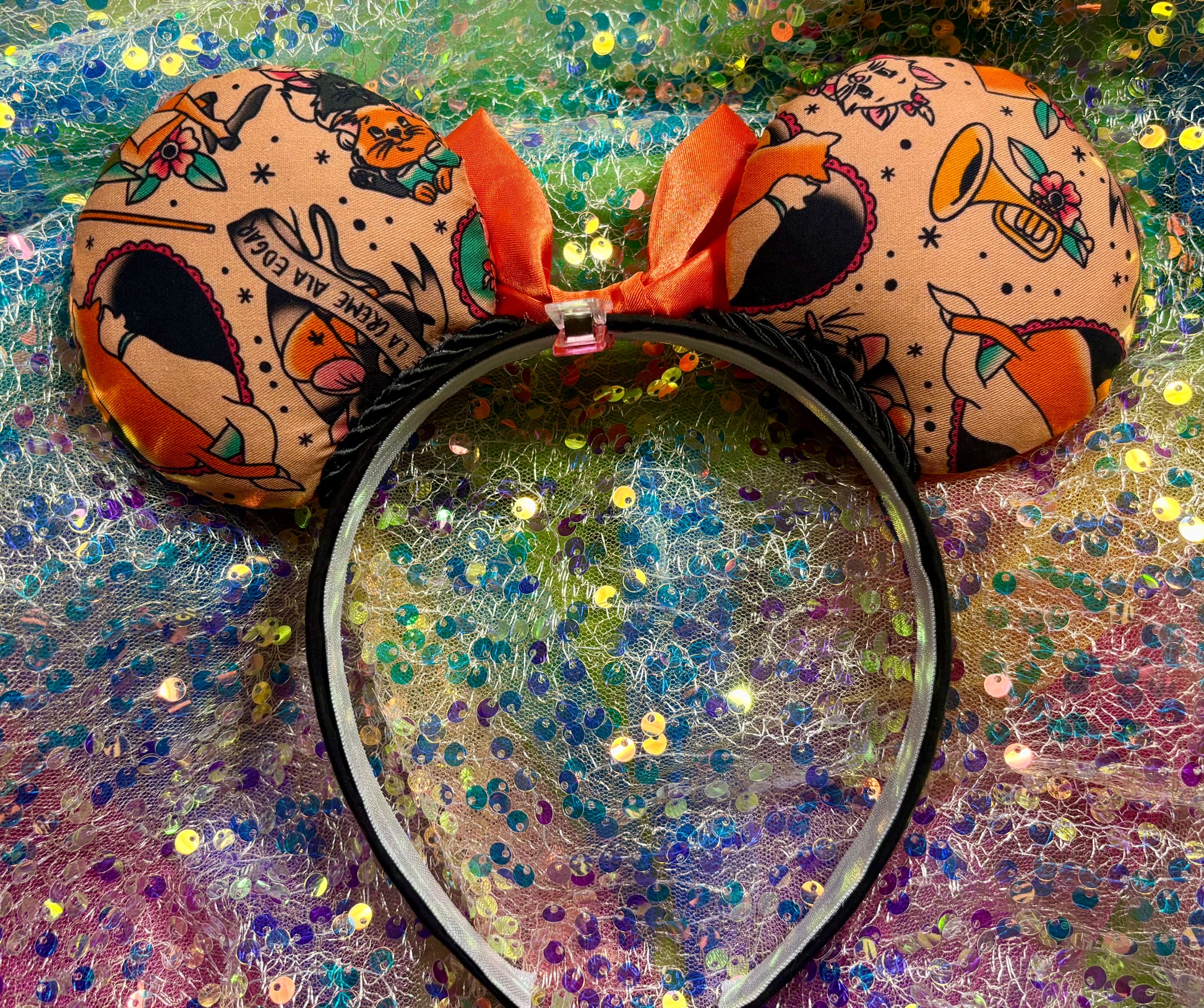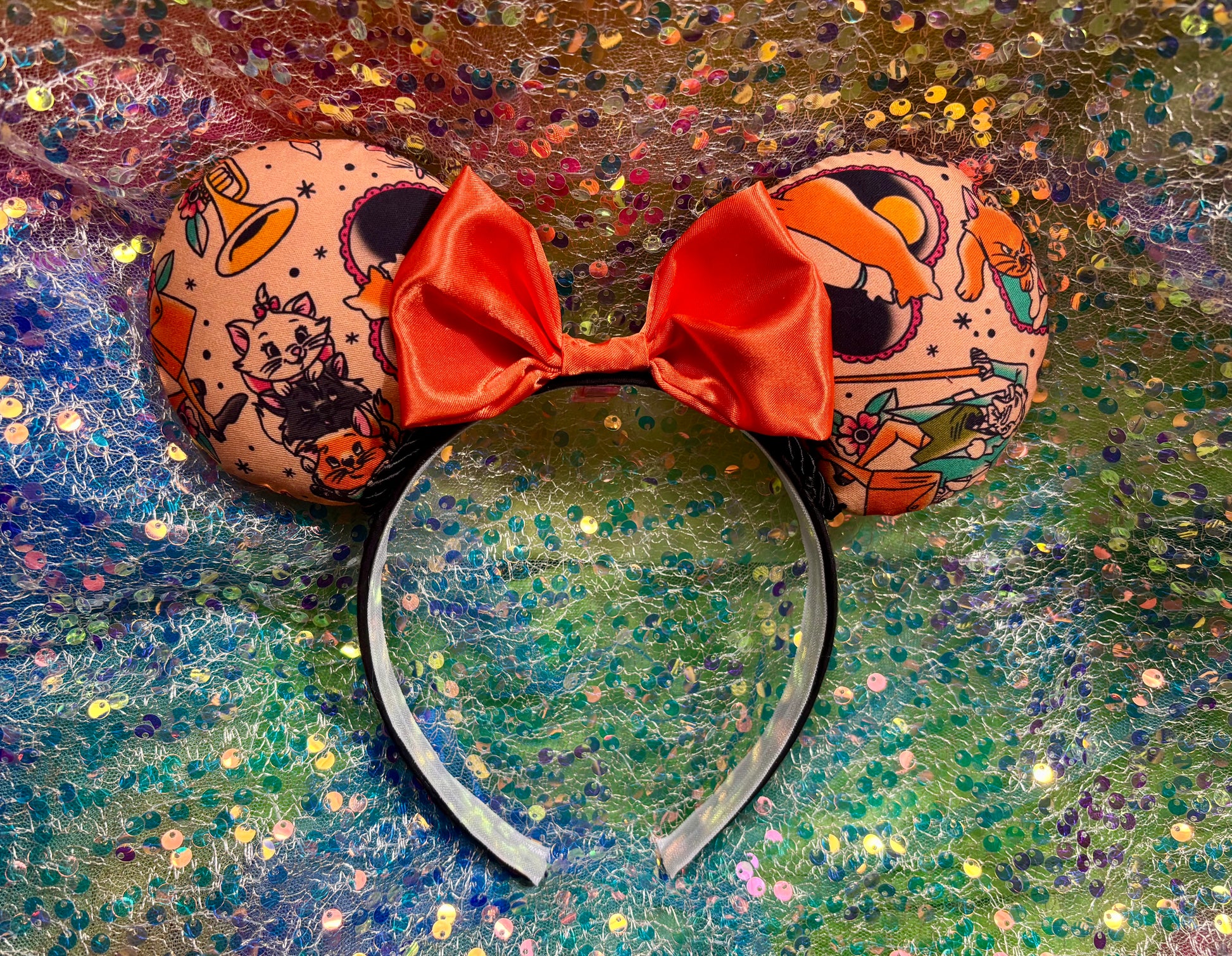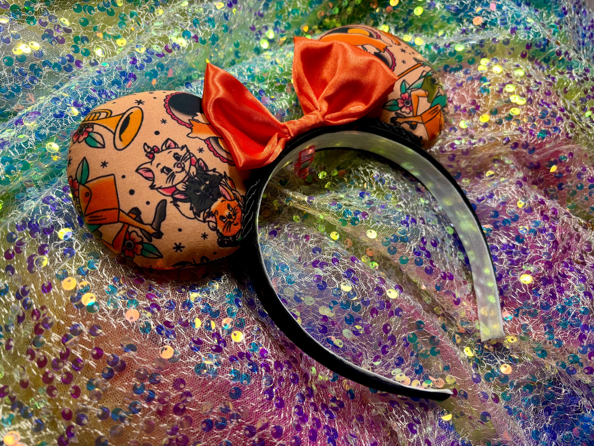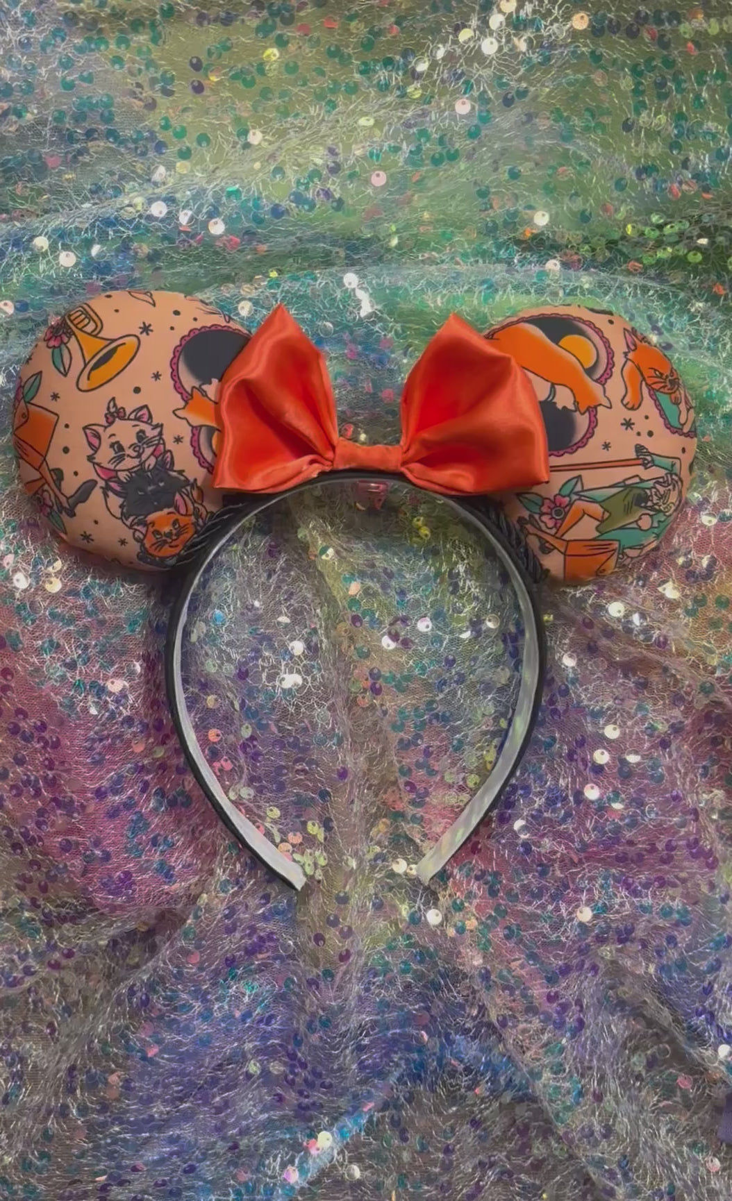 Cat Lover Mouse Ears are on handmade headband that is both unique and elegant. The fabric on the ears is placed in various patterns, making each set one-of-a-kind. The black twisted trim and satin orange bow add a touch of charm. With elastic on the inner headband, it fits most sizes. Please note that I am not affiliated with the Disney Company. All sales are final and I am not responsible for shipping delays after handing the package to USPS.