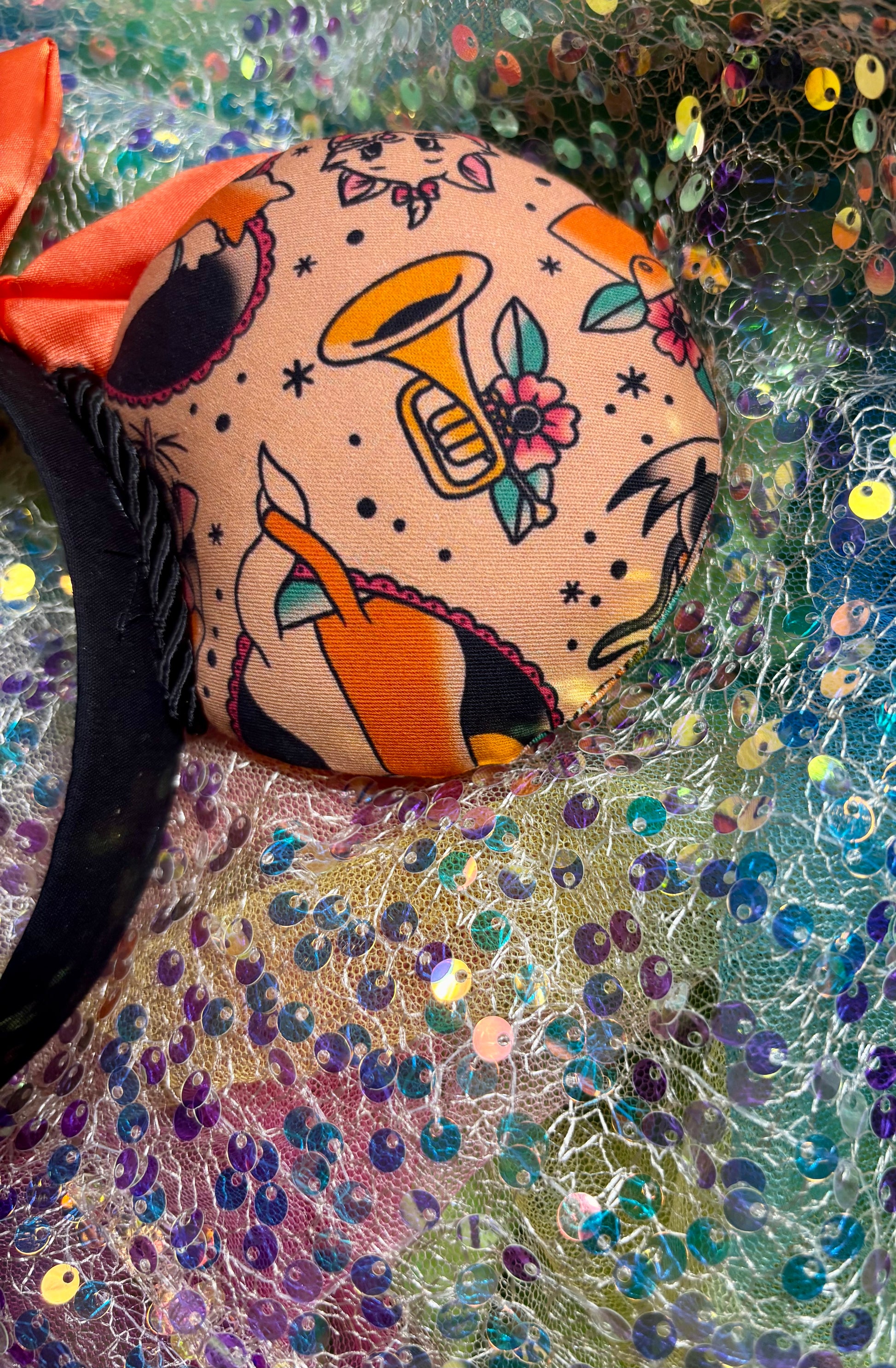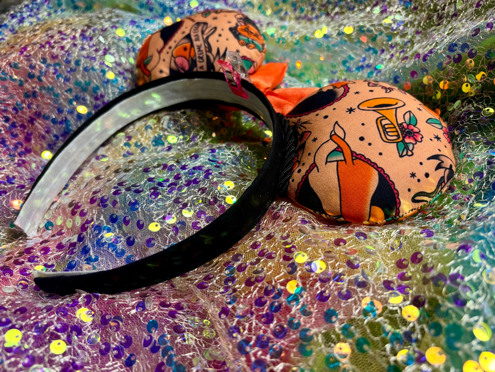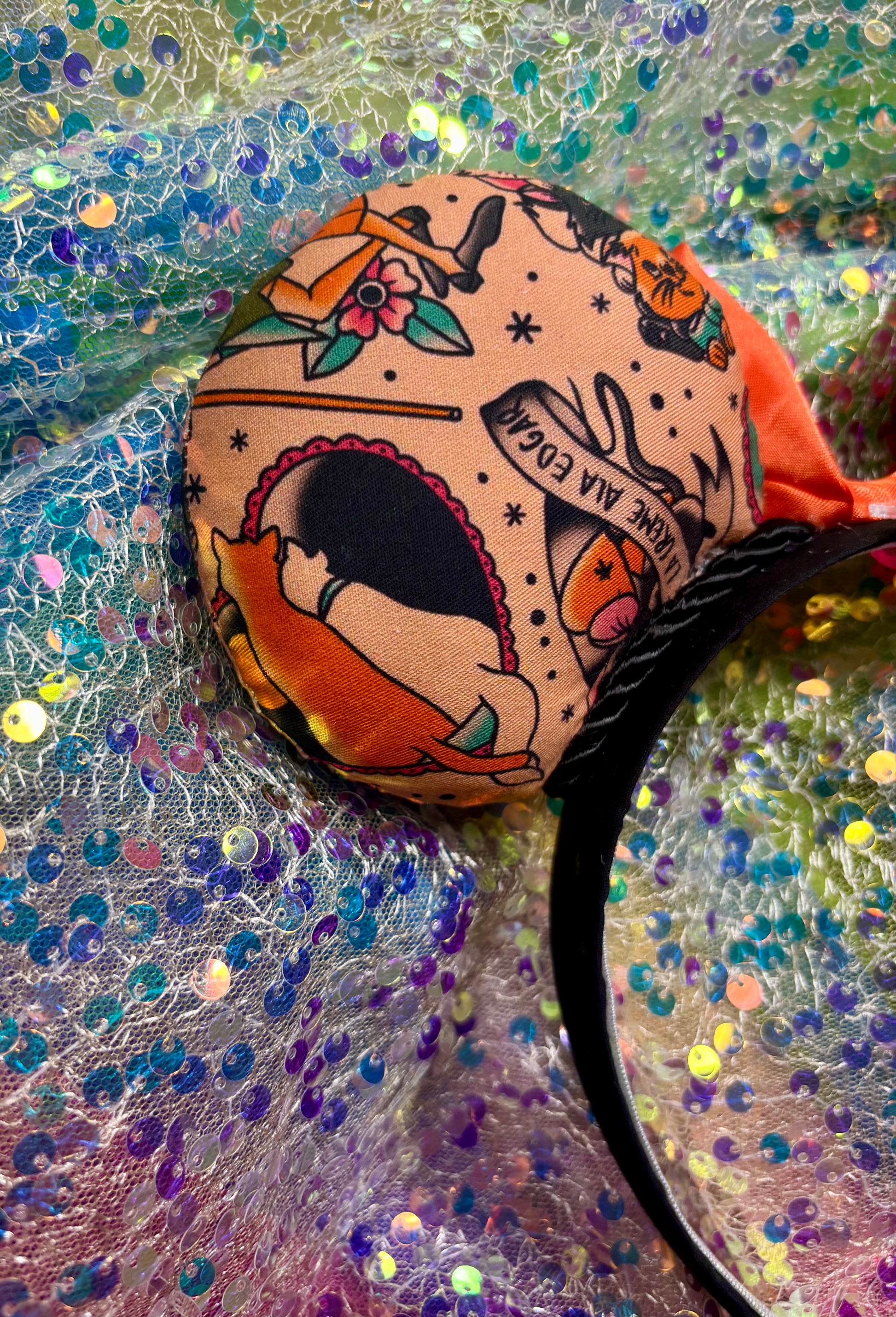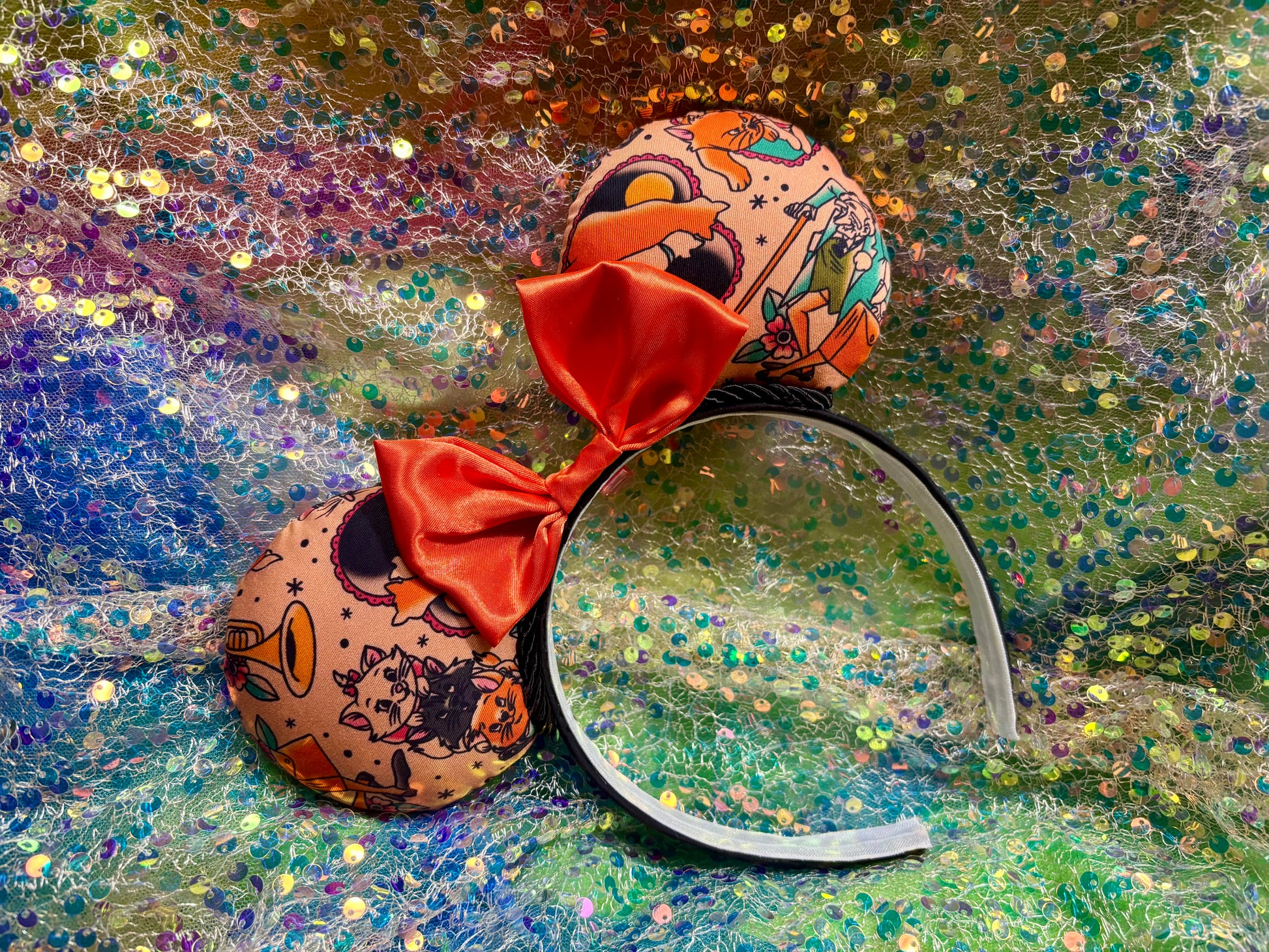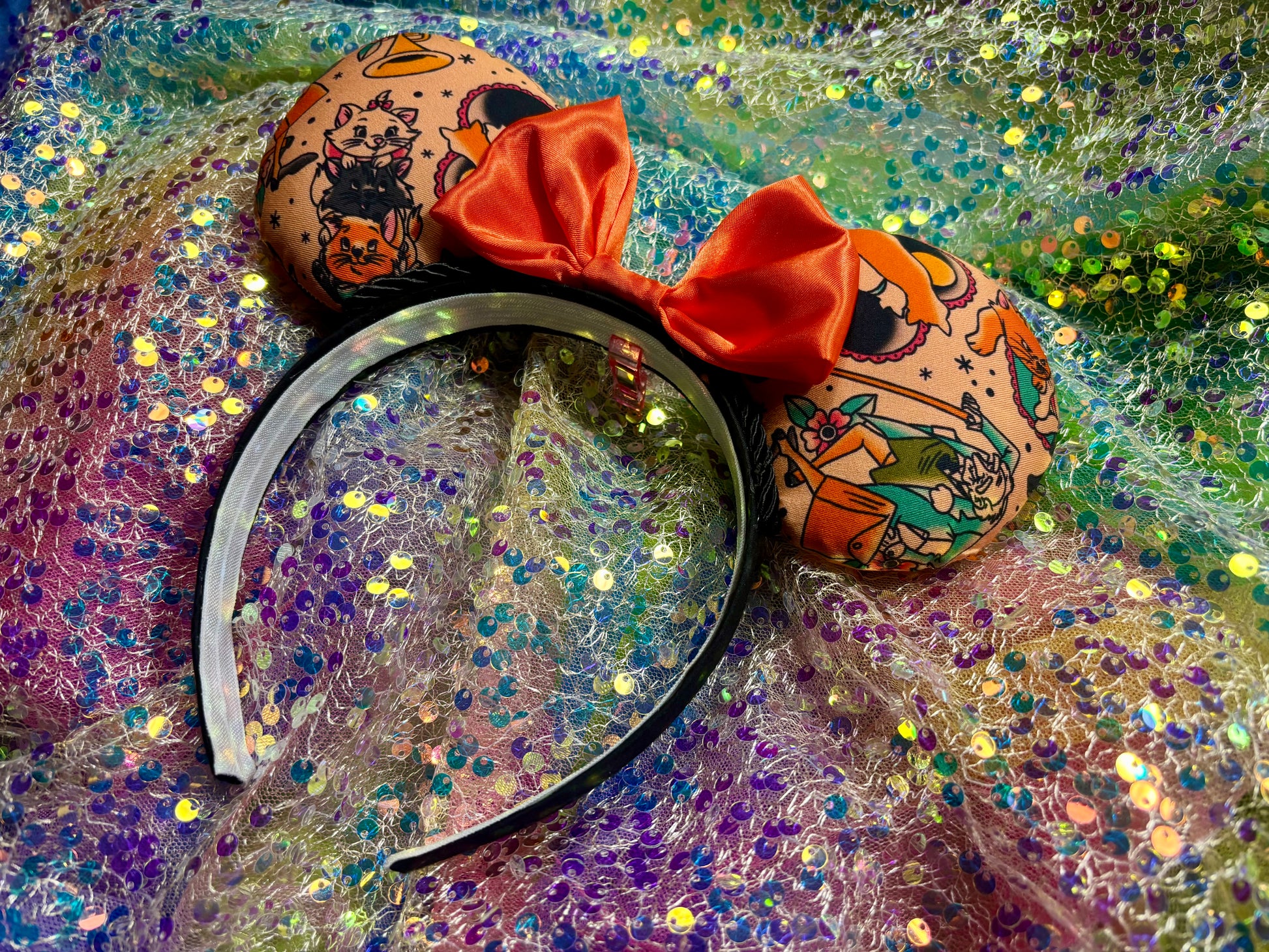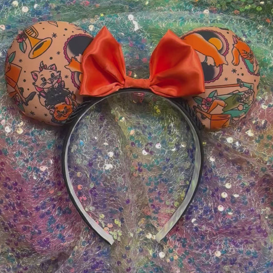 Cat Lover Mouse Ears are on handmade headband that is both unique and elegant. The fabric on the ears is placed in various patterns, making each set one-of-a-kind. The black twisted trim and satin orange bow add a touch of charm. With elastic on the inner headband, it fits most sizes. Please note that I am not affiliated with the Disney Company. All sales are final and I am not responsible for shipping delays after handing the package to USPS.
