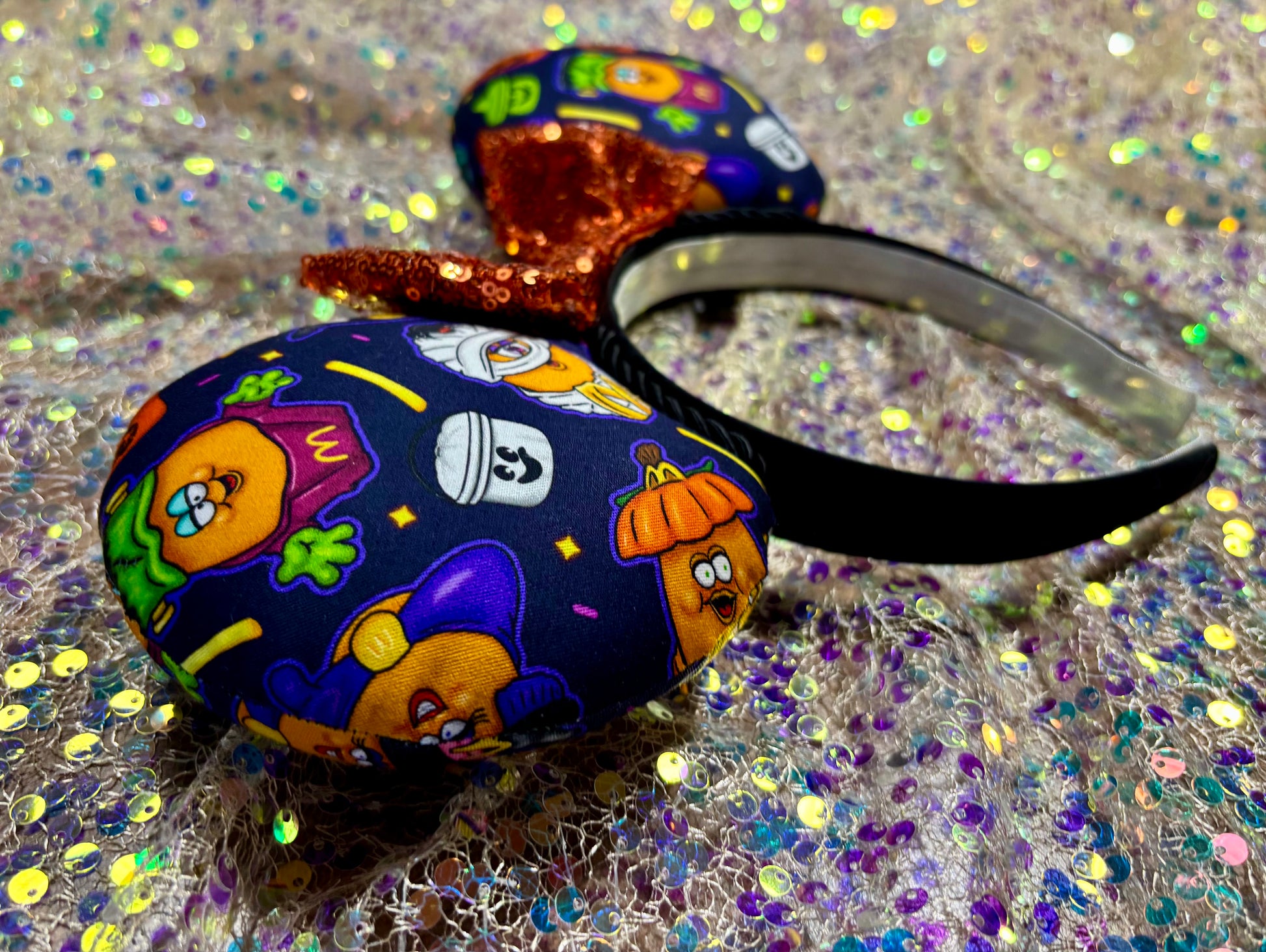 These fun and quirky Spooky Nuggies mouse ears are the perfect mashup of Halloween vibes and everyoneโs favorite comfort food. Featuring spooky chicken nugget fabric and your choice of Halloween bow color โ these ears are a one-of-a-kind treat for the parks.