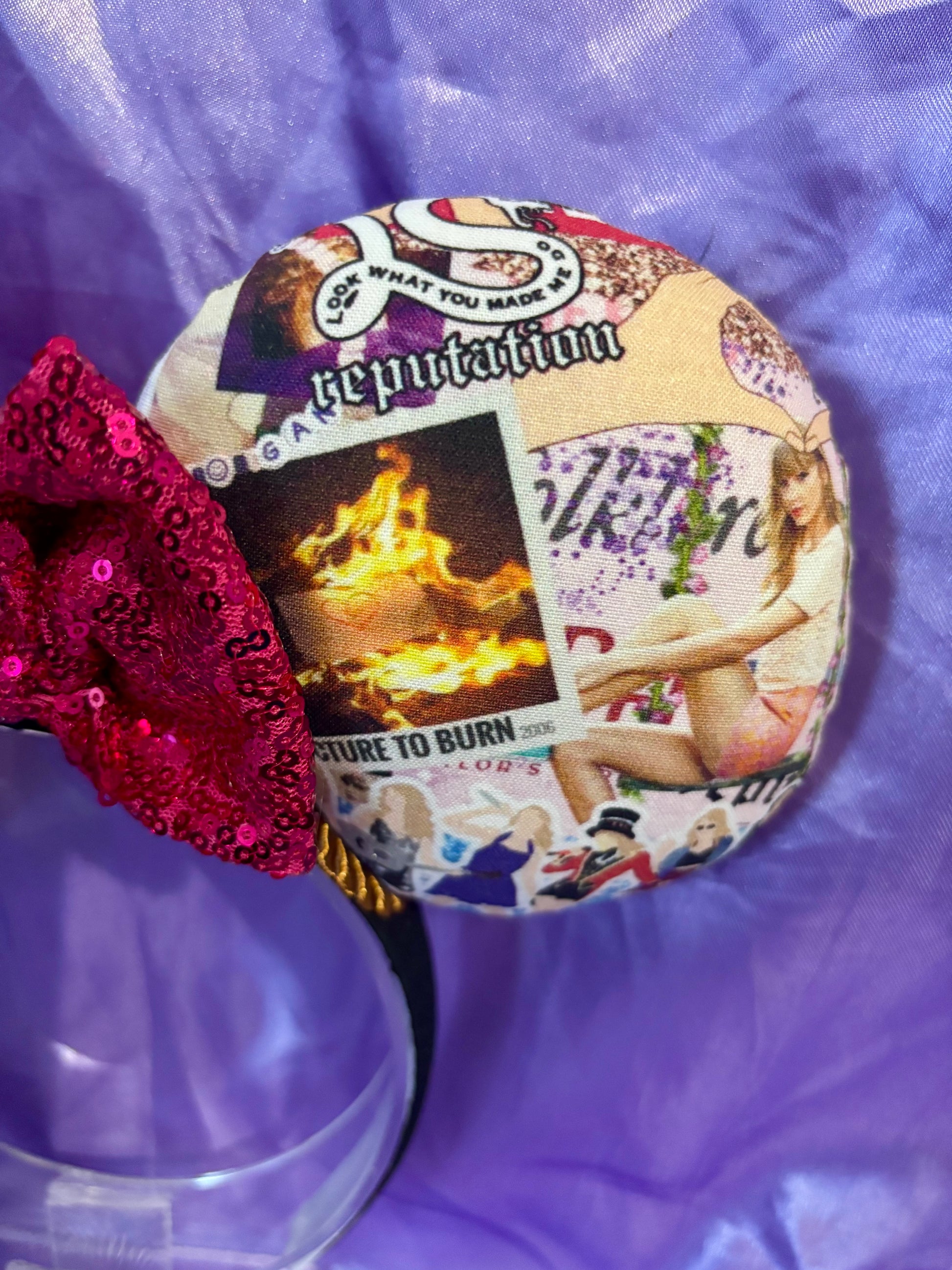 Cartoon Eras Mouse Ears β Taylor Swift Inspired Collage Handmade Disney Headband | Hot Pink Sequin Bow