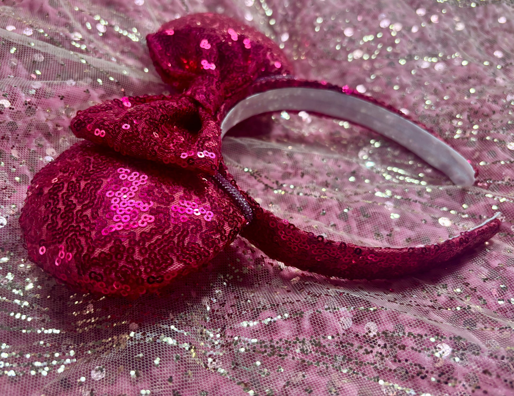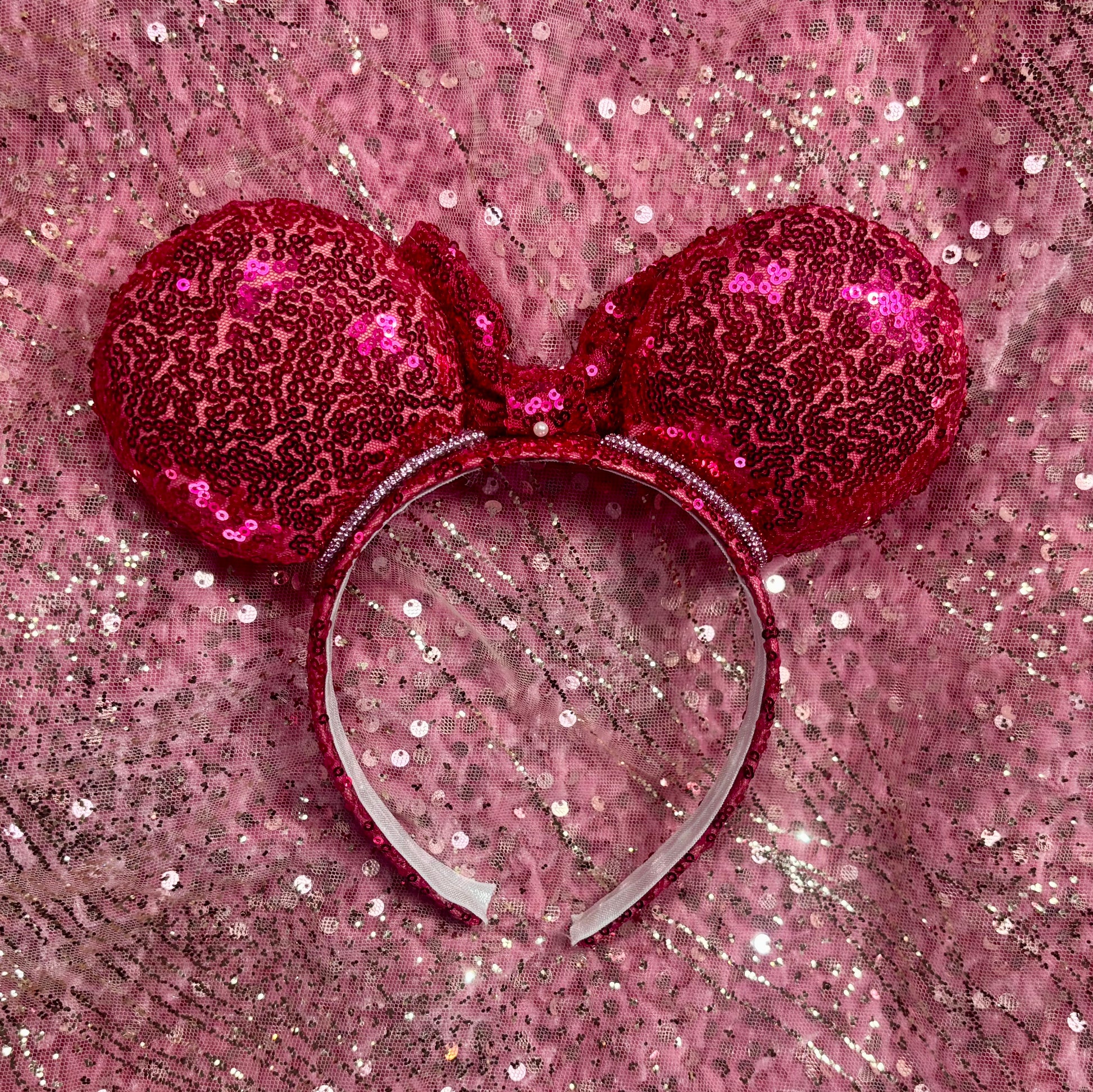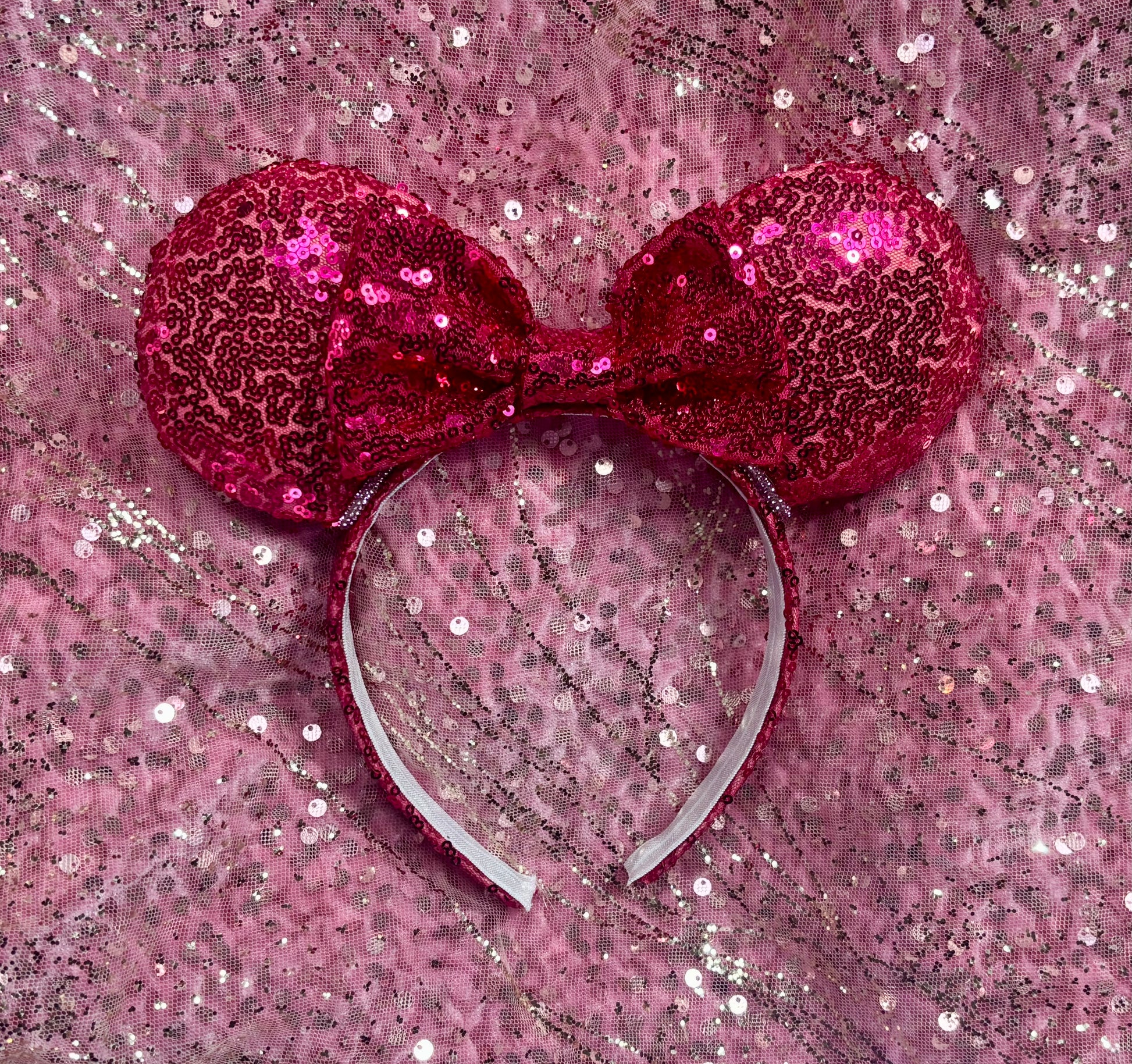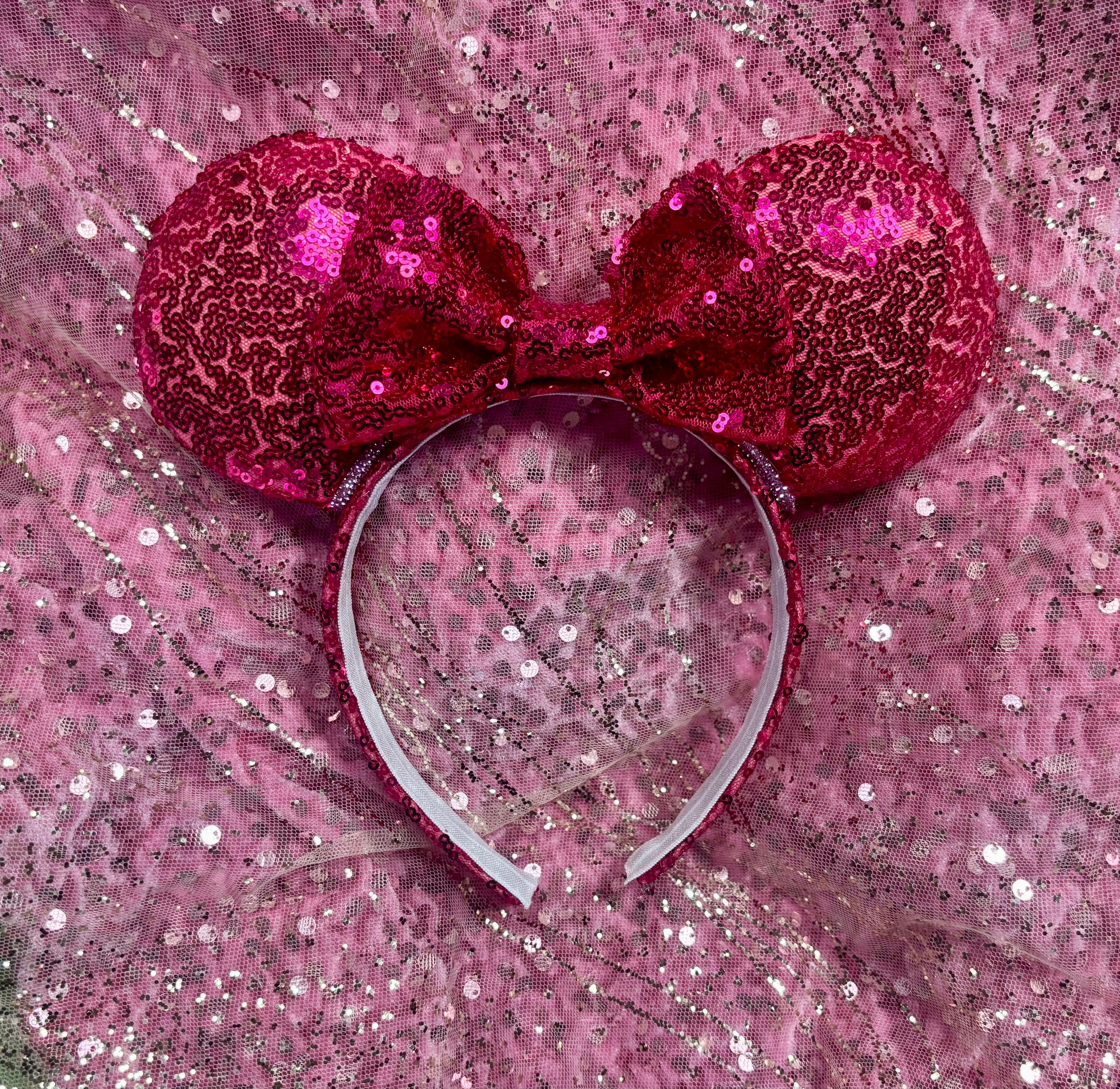 These handmade Pink Sequin Mouse Ears feature a sparkling design with front and back fabric, rhinestone twisted trim, and a matching sequin bow. The headband has elastic lined in the middle and headband fits most sizes for a comfortable and stylish fit. Perfect for Disney fans or special occasions. The bow isn’t attached, just pinned for photographs. If you’d like any other bow color, just write me and note in your order and I’ll happily attach it. If you’d don’t write a note, I attach the matching pink sequin bow. *Headband is handmade and not affiliated with Disney. No refunds or returns.