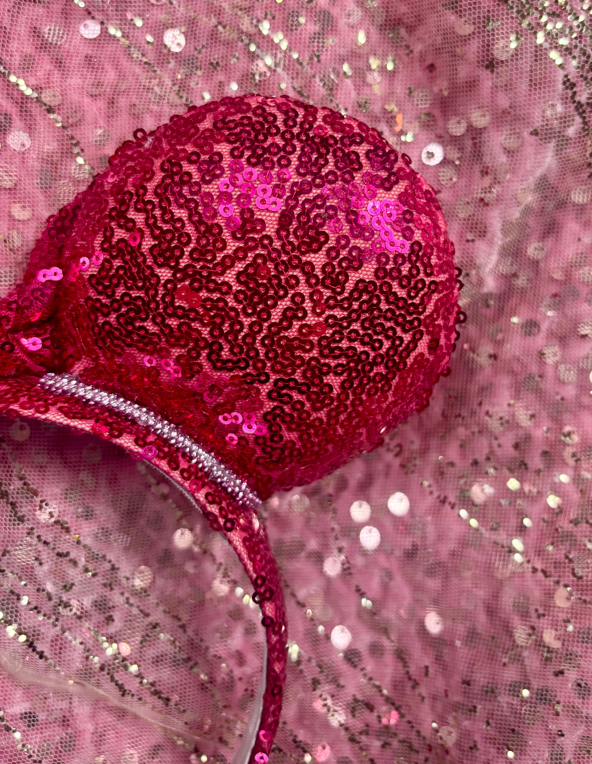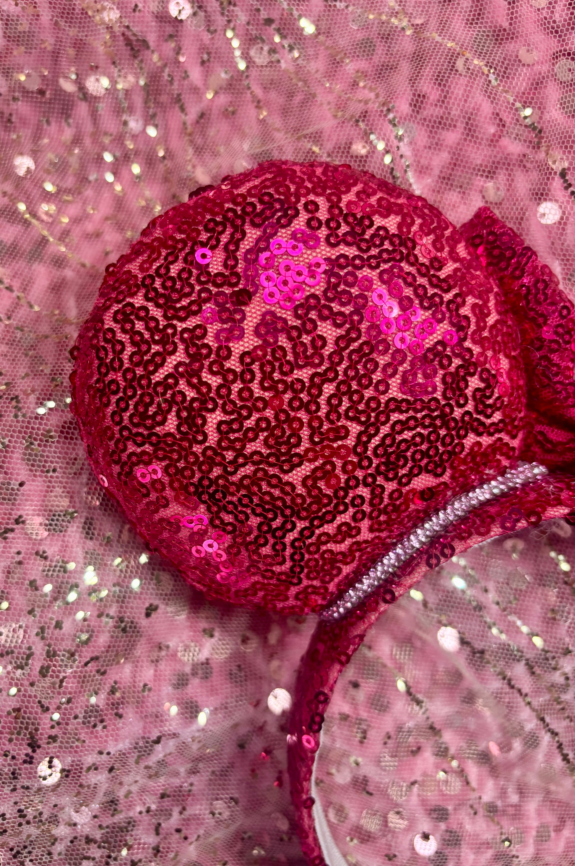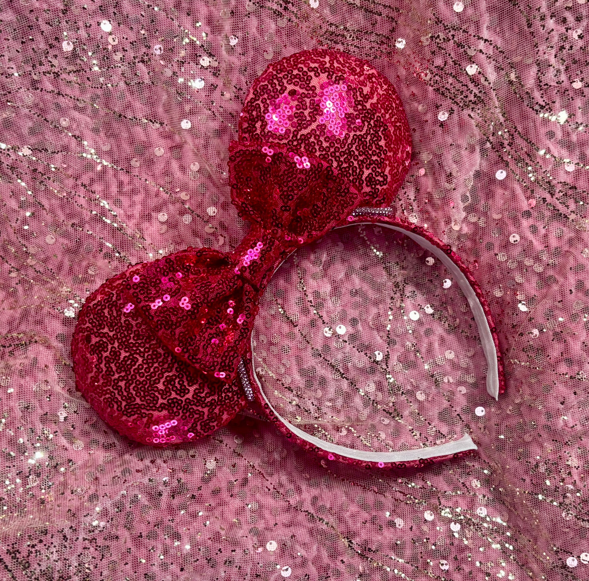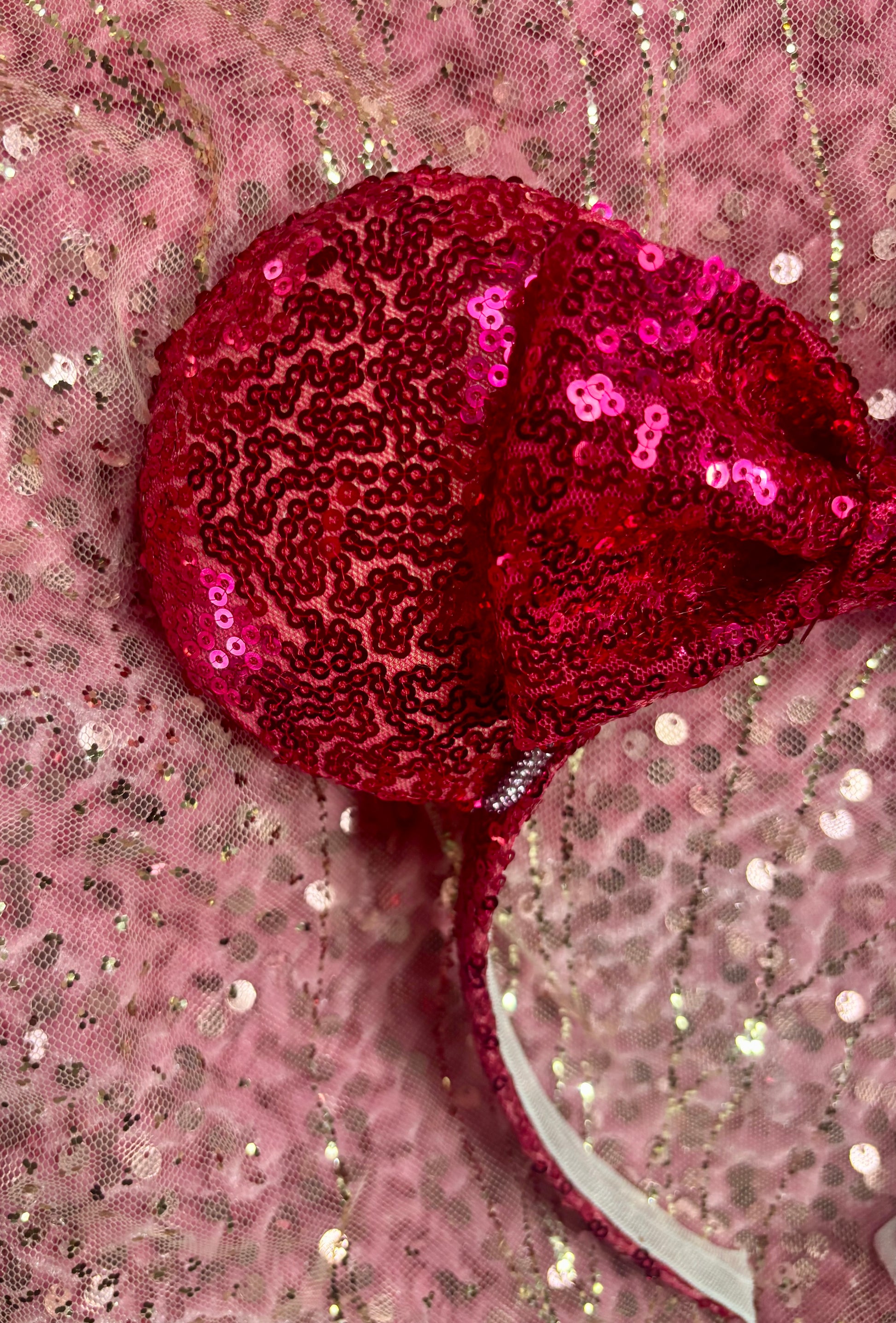 These handmade Pink Sequin Mouse Ears feature a sparkling design with front and back fabric, rhinestone twisted trim, and a matching sequin bow. The headband has elastic lined in the middle and headband fits most sizes for a comfortable and stylish fit. Perfect for Disney fans or special occasions. The bow isn’t attached, just pinned for photographs. If you’d like any other bow color, just write me and note in your order and I’ll happily attach it. If you’d don’t write a note, I attach the matching pink sequin bow. *Headband is handmade and not affiliated with Disney. No refunds or returns.