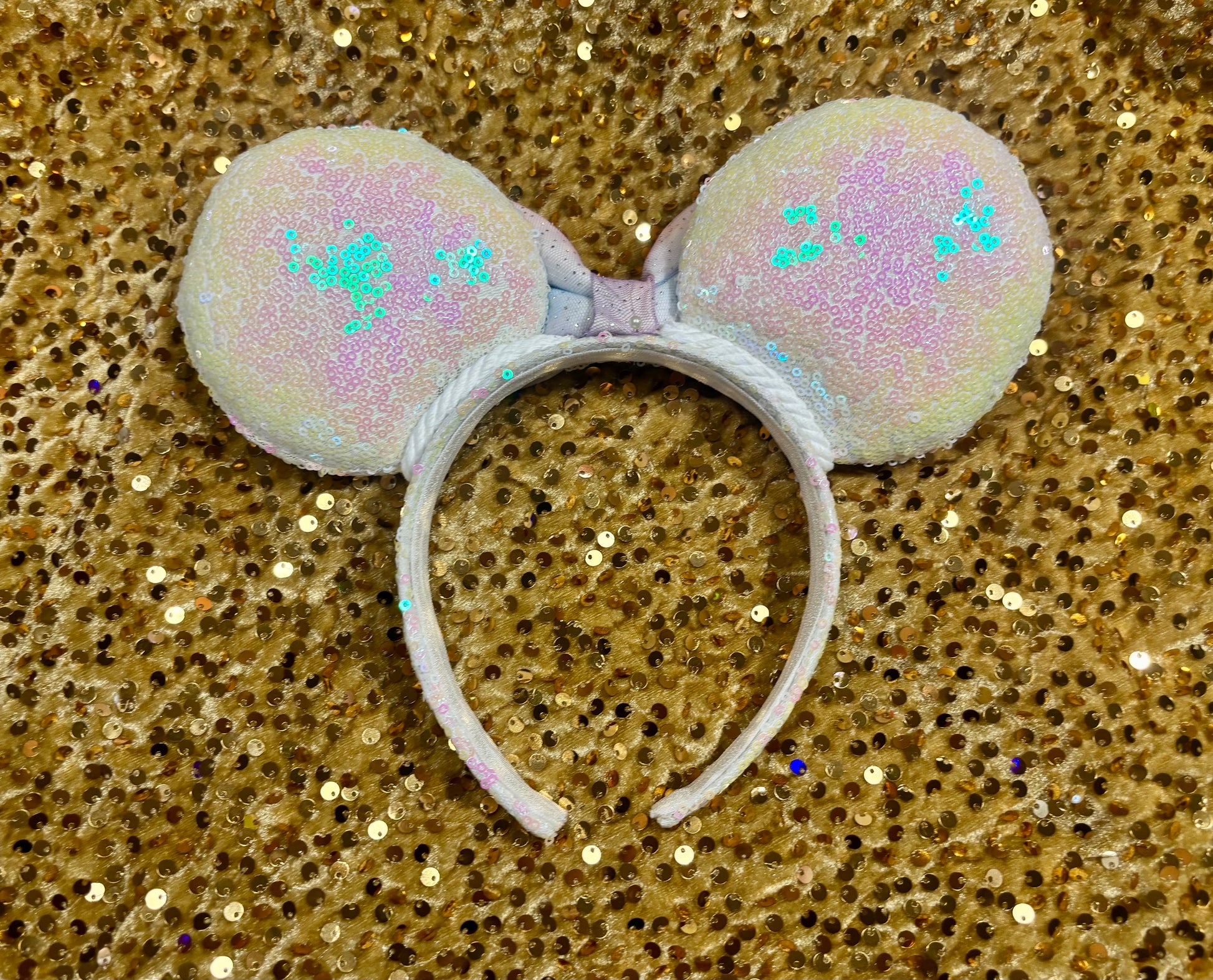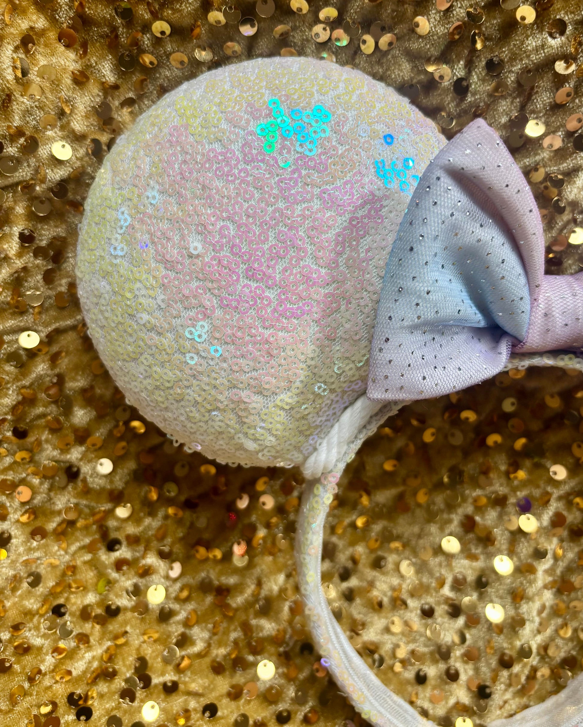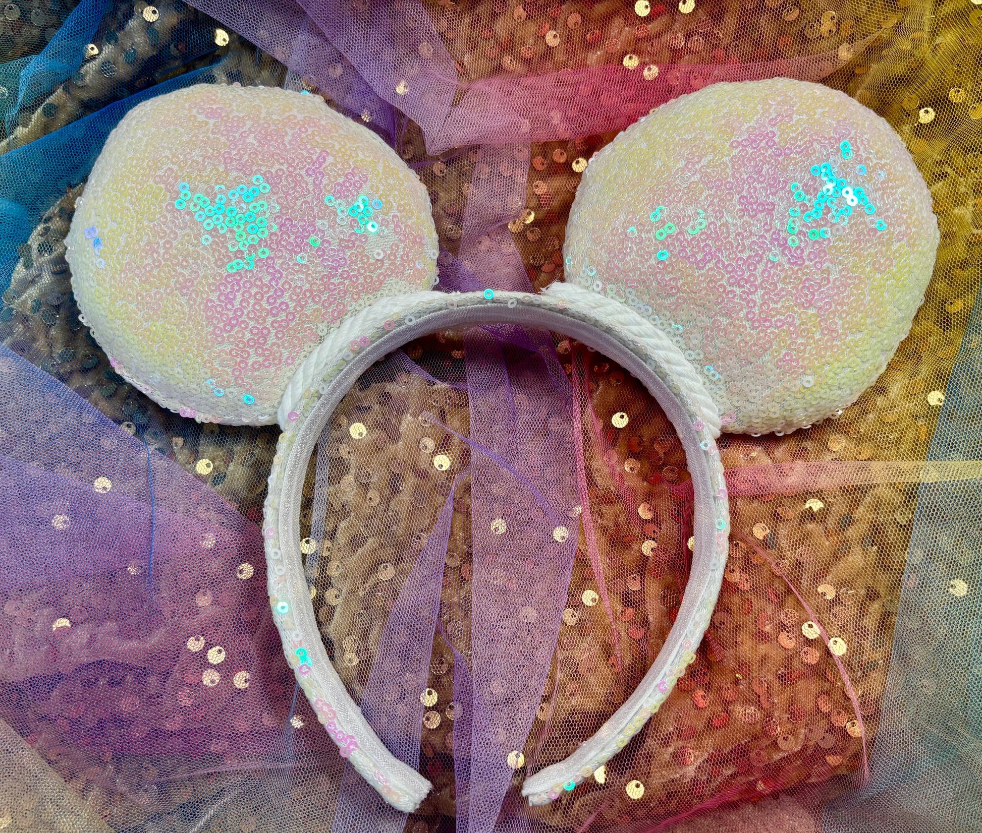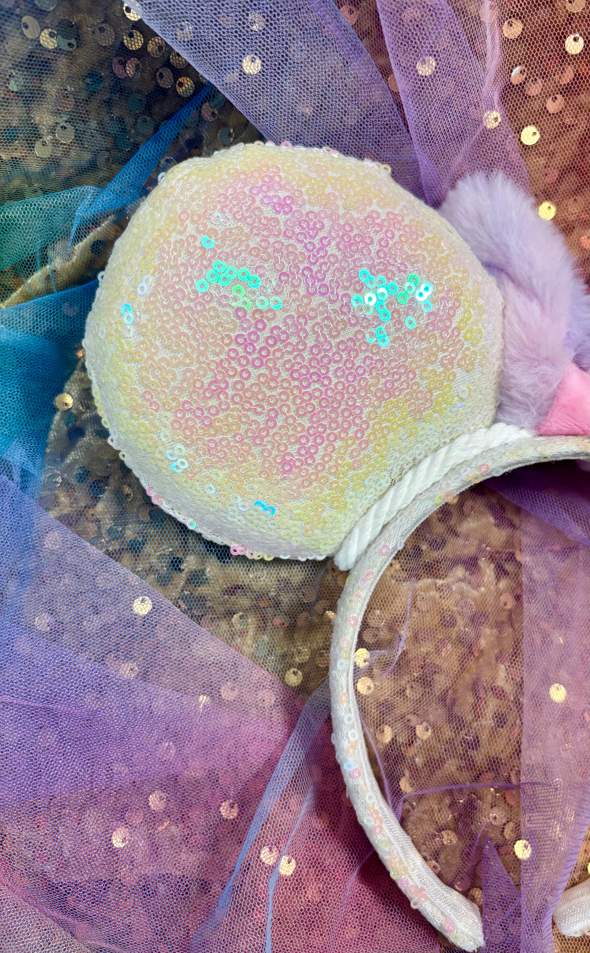 White iridescent sequin fabric is on the ears front and back along with the headband as well. White Twisted trim along inner ears with a bow. White Elastic on inner headband. The mouse ears are sewn then hot glued to headband then handstitched to band for extra protection. These are handmade items. Headband is universal size and fits most. (Bow is just pinned for photos and isn’t attached. I don’t attach bows until I’m filling the order for a customer)