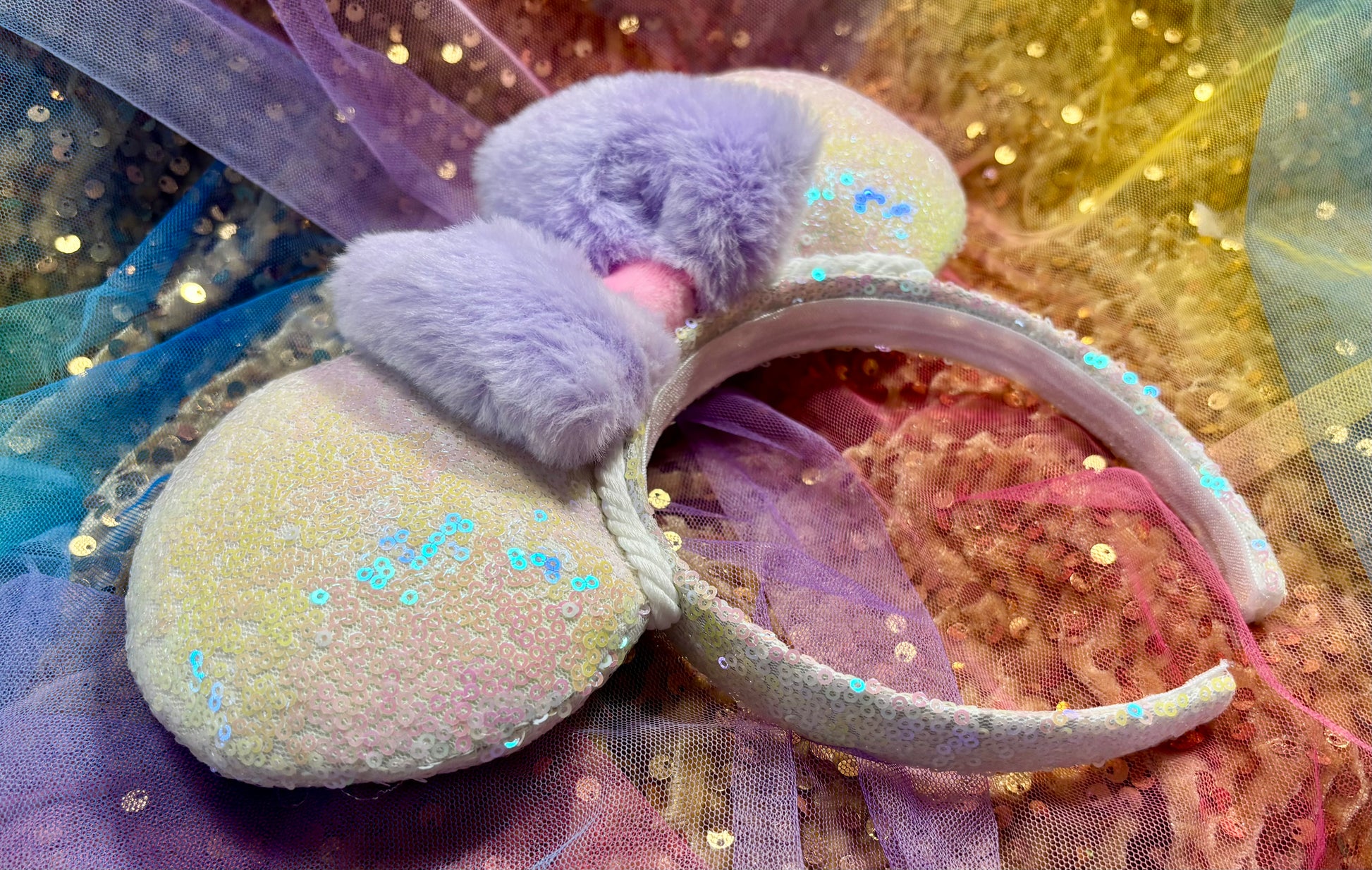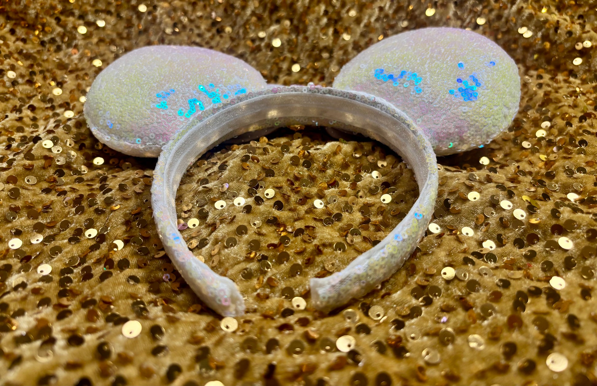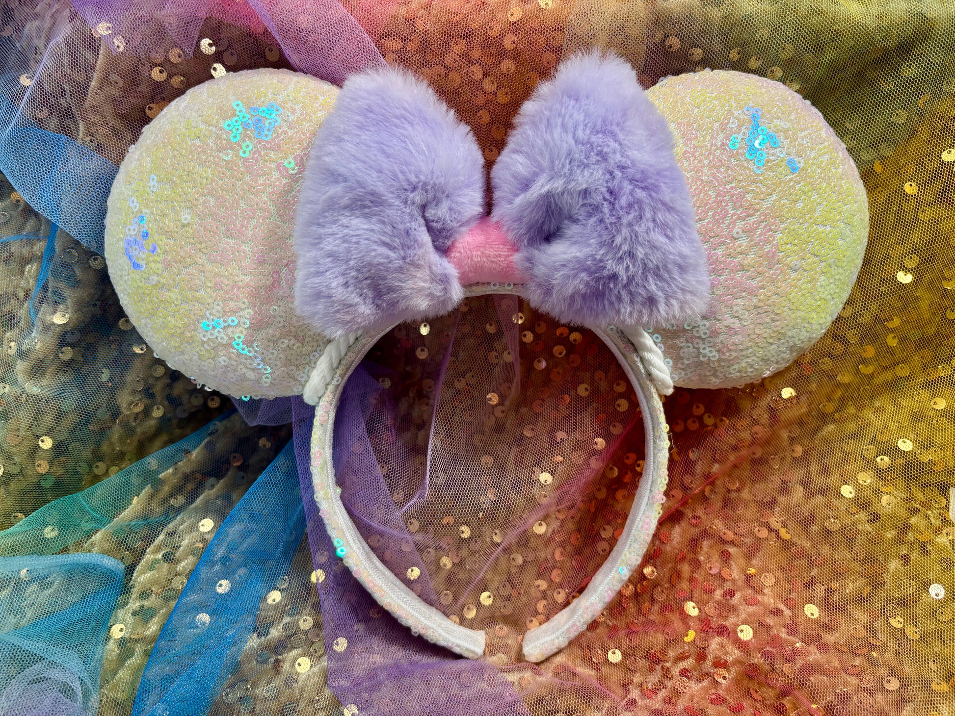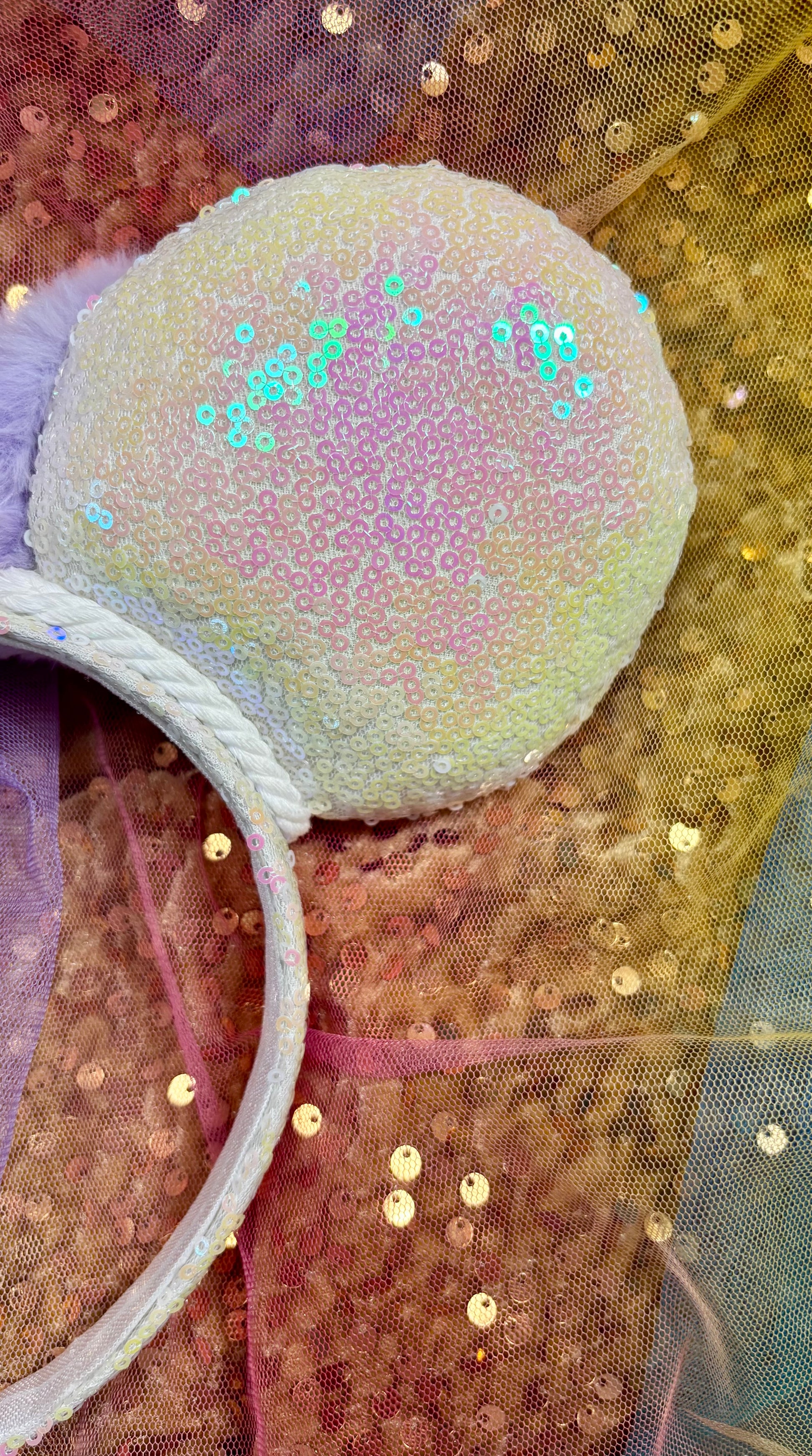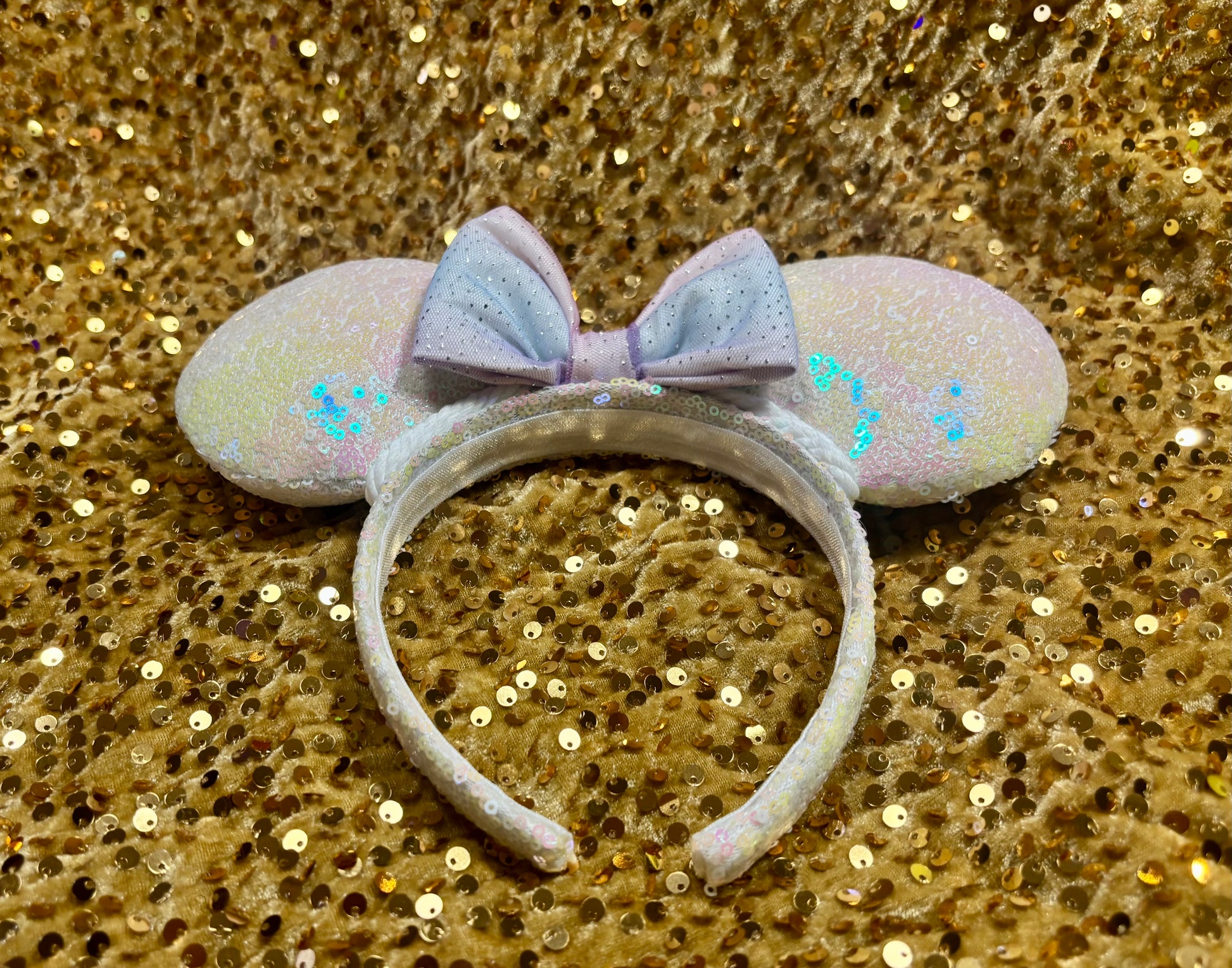 White iridescent sequin fabric is on the ears front and back along with the headband as well. White Twisted trim along inner ears with a bow. White Elastic on inner headband. The mouse ears are sewn then hot glued to headband then handstitched to band for extra protection. These are handmade items. Headband is universal size and fits most. (Bow is just pinned for photos and isn’t attached. I don’t attach bows until I’m filling the order for a customer)