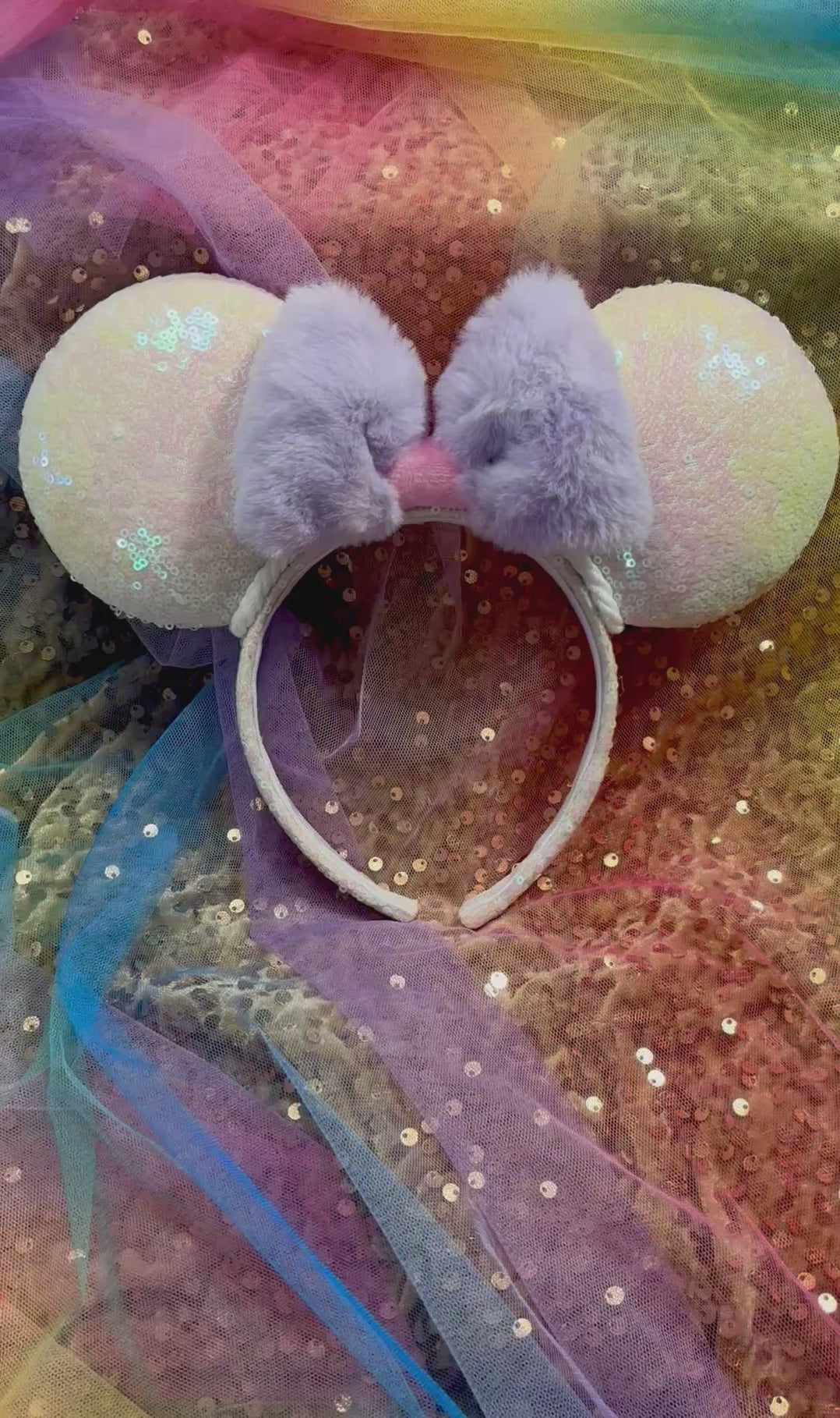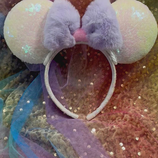 Handcrafted white iridescent sequin mouse ears with an iridescent sparkle bow and elastic inner band for a comfortable fit. Universal size fits most. Expertly sewn and hand-stitched for extra protection. Perfect for any Disney fan, these ears add a touch of sparkle to any outfit. Order now and add some magic to your day! If you’d prefer the fluffy purple or any other sequin color bow, just write me a note and I’ll happily attach the bow color you want.