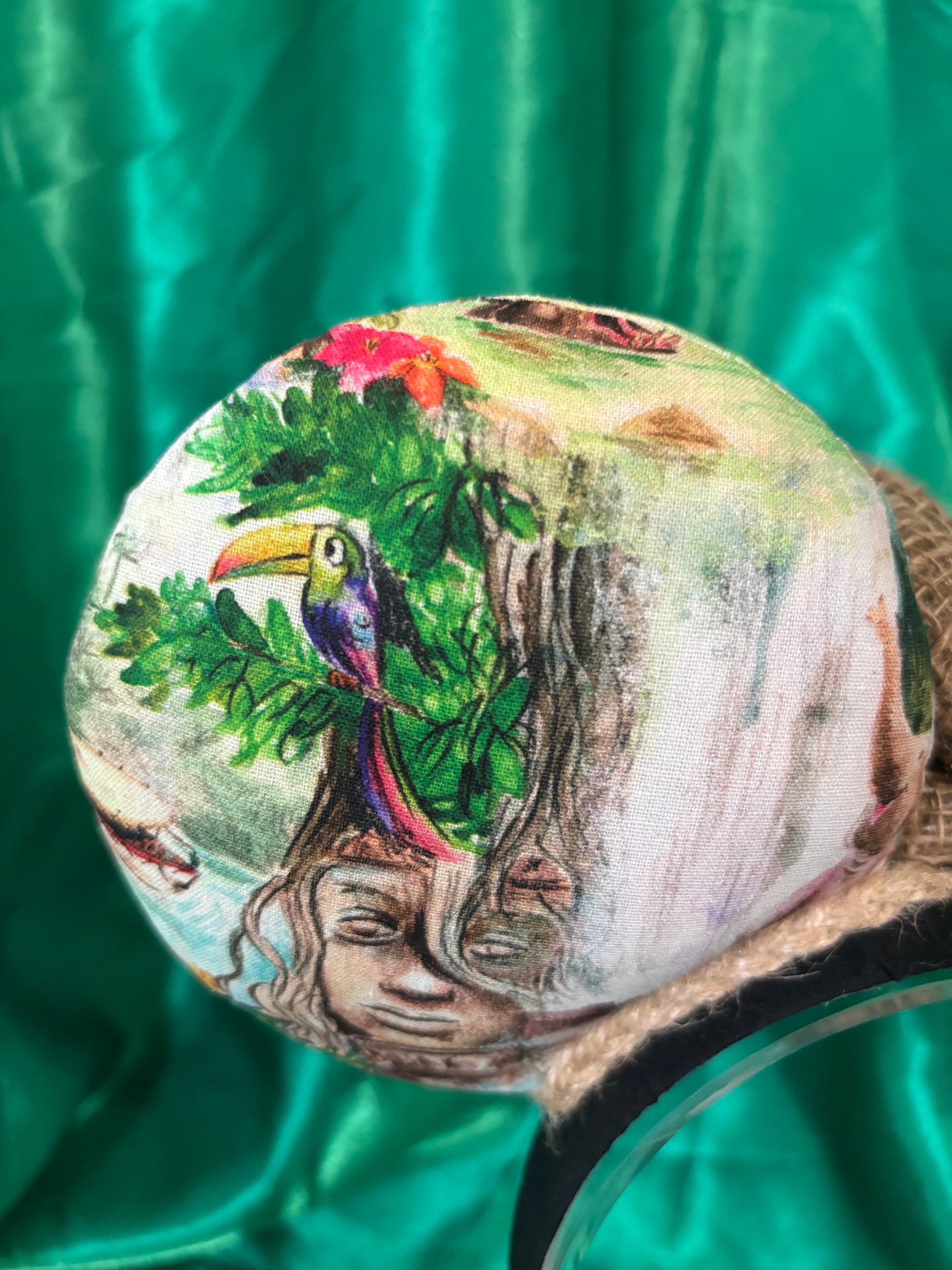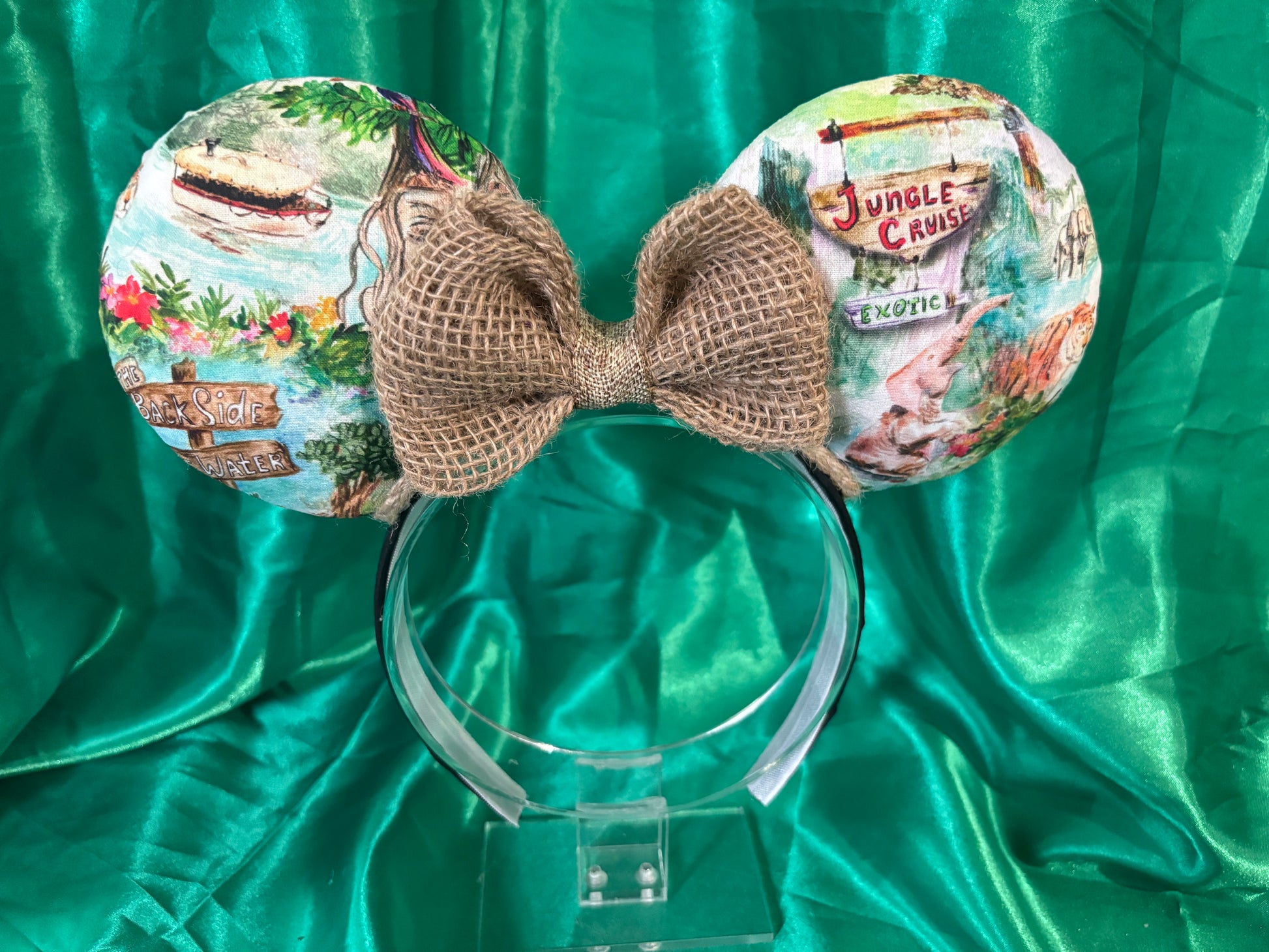 These adventurous Jungle Cruisin' Mouse Ears celebrate the iconic Jungle Cruise attraction! Featuring jungle-themed fabric and unique burlap accents, these ears are perfect for fans of the world-famous Jungle Cruise and Adventureland explorers.