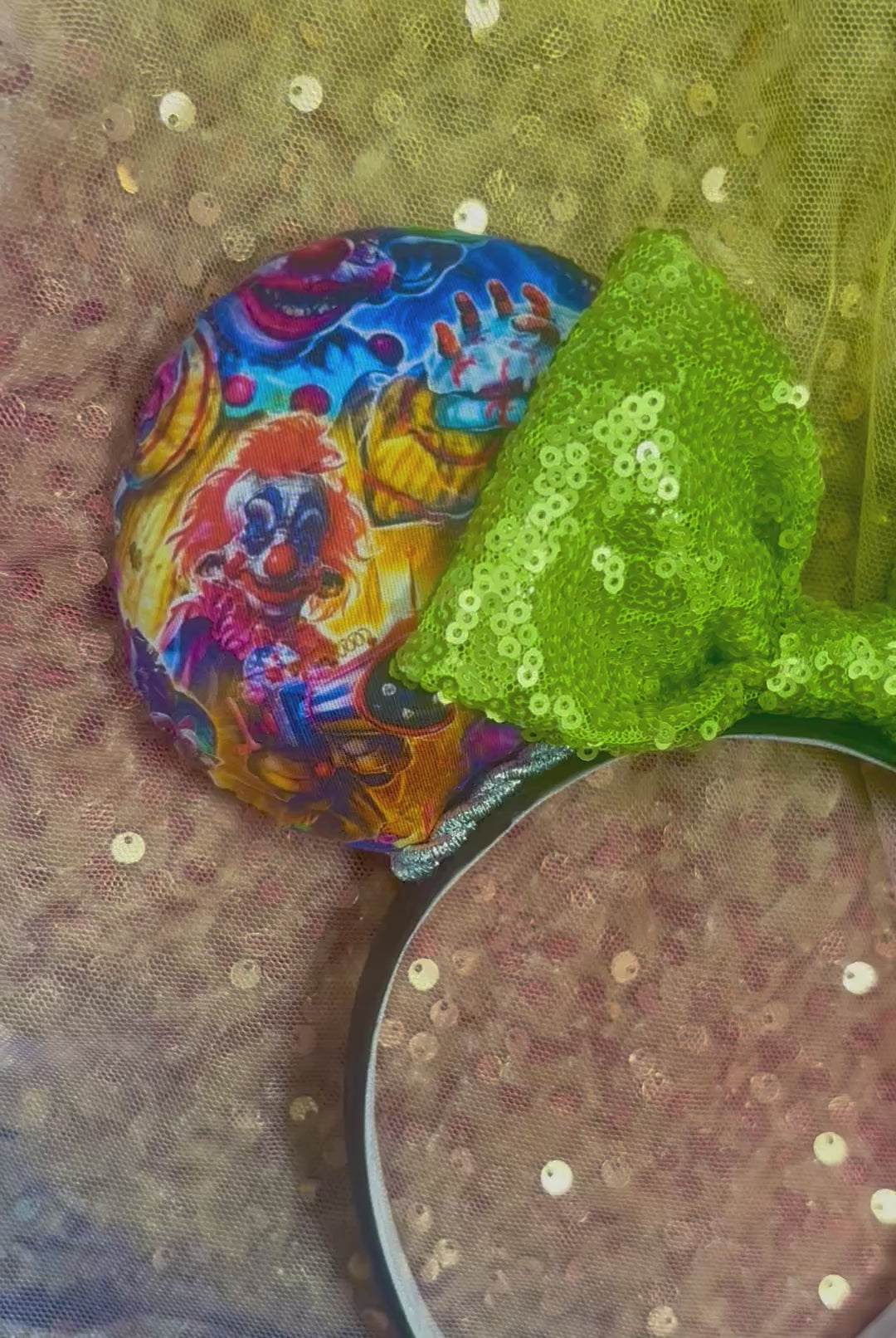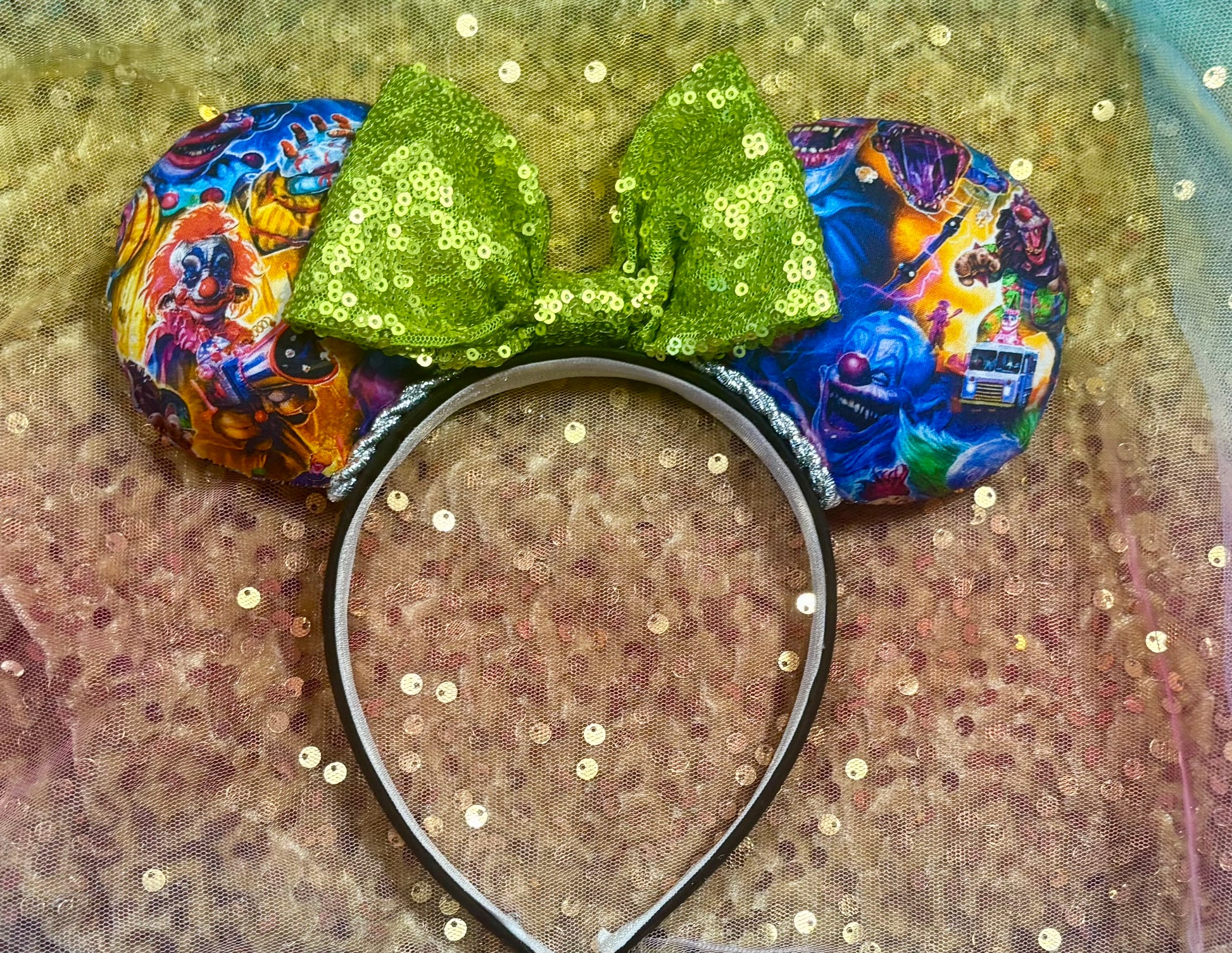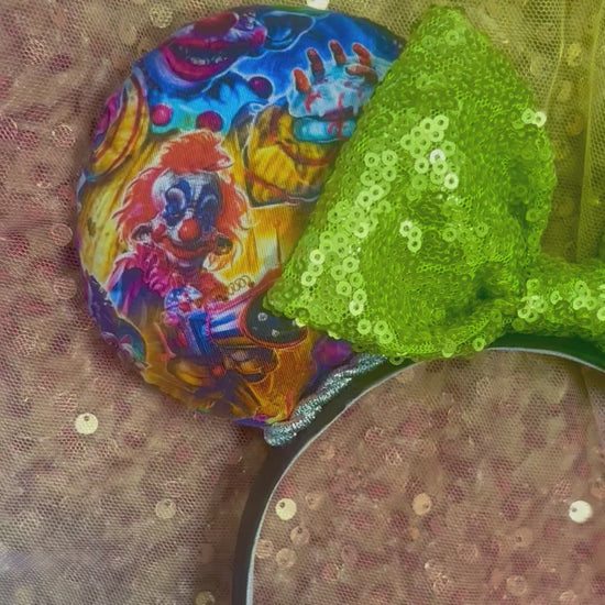 Killer Klowns Mouse Ears | Handmade Horror-Inspired Disney Headband with Lime Green Sequin Bow
