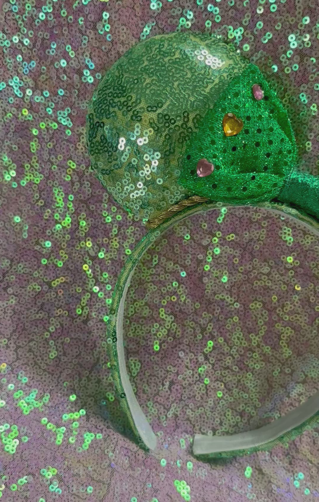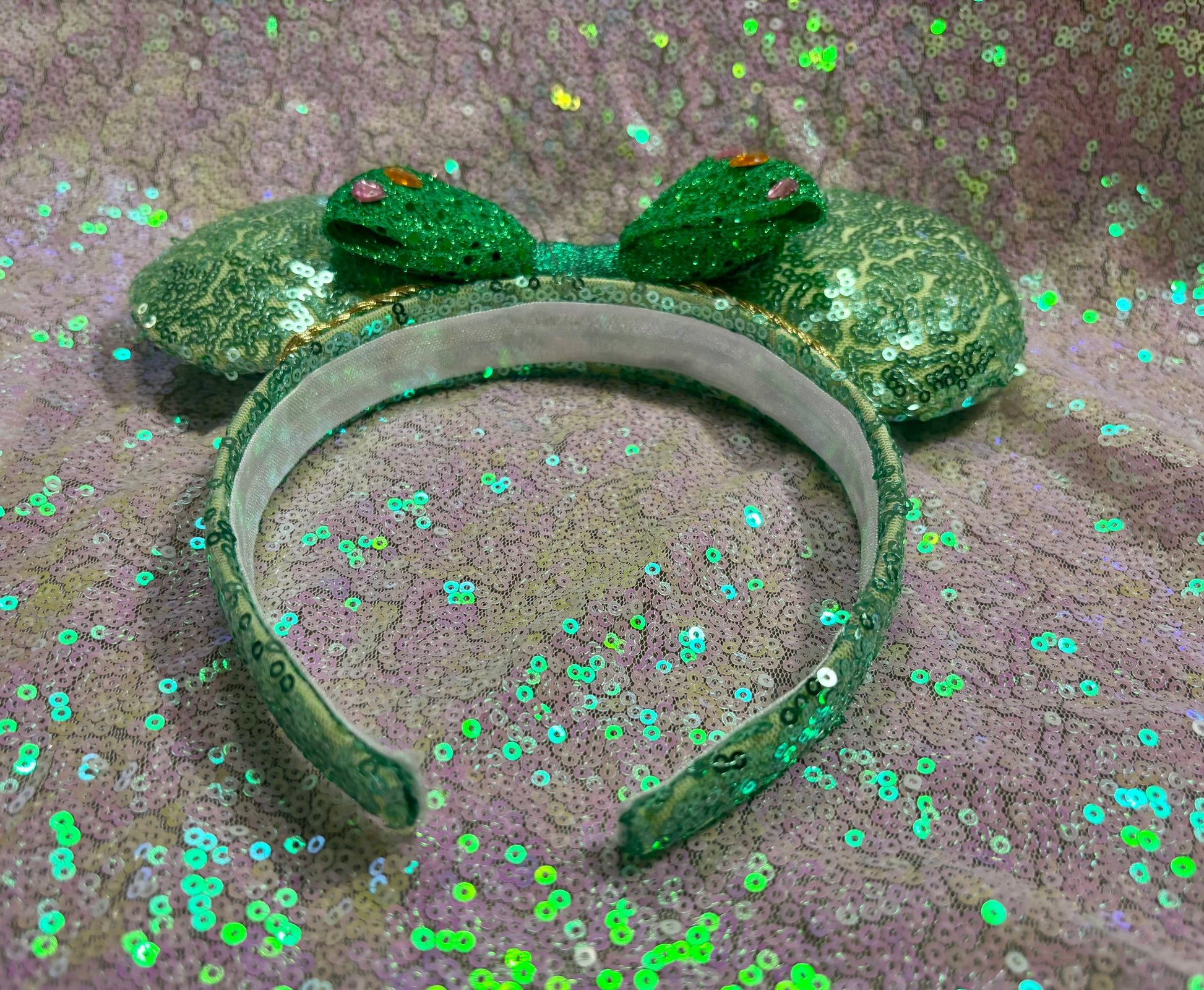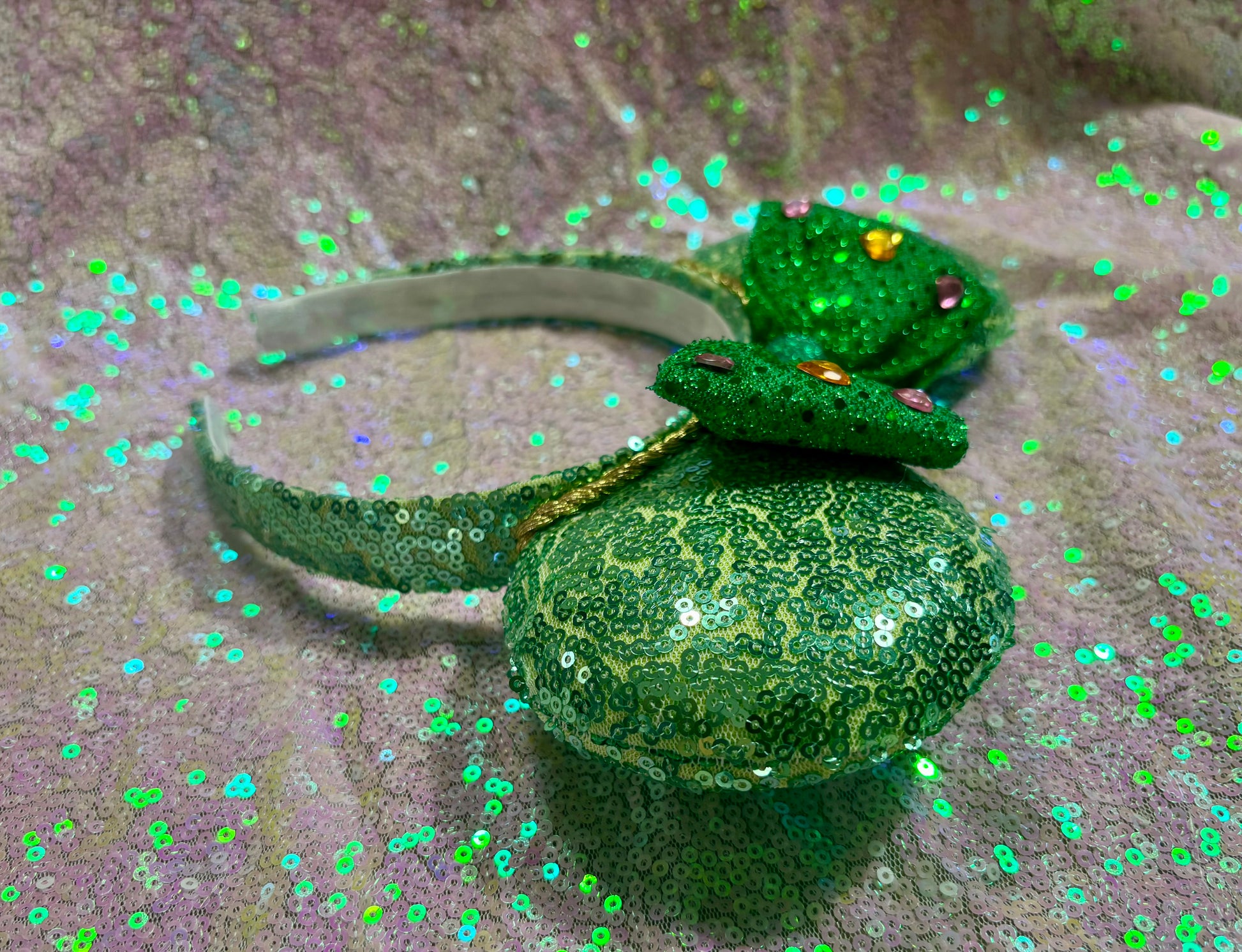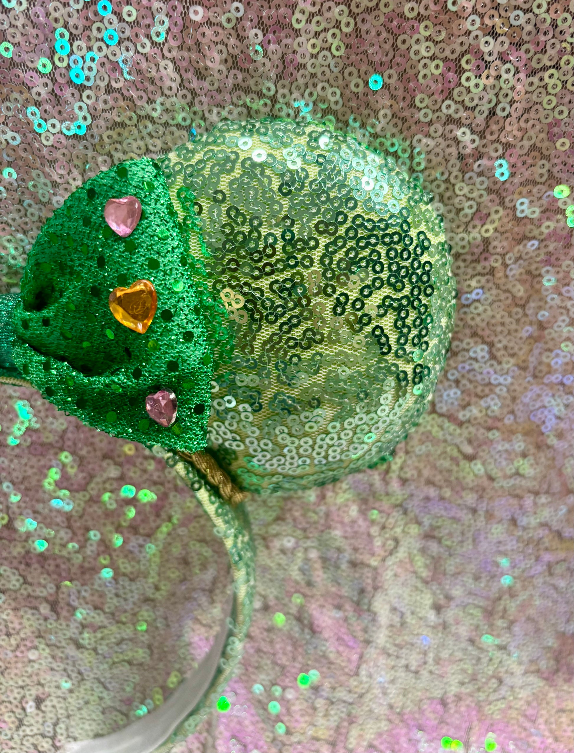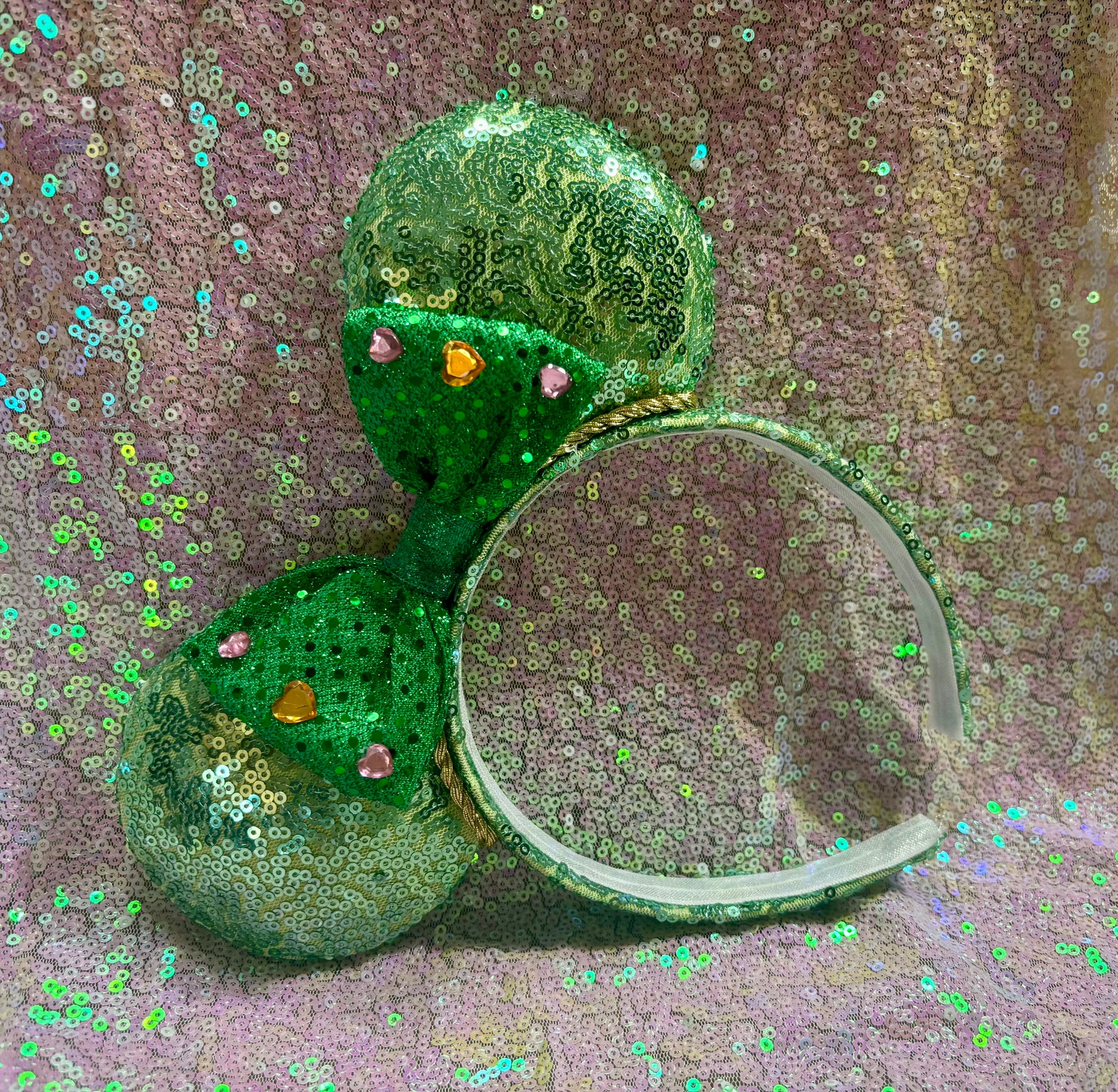Professionally handcrafted with love for Disney fans, these ears feature mint sequin fabric on both sides and a headband with an elastic liner for a comfortable fit. The bow on the mouse ears is an green bow with heart gemstones attached. The inner ears have gold trim along them. The ears are also padded with batting for added dimension. Please note, these ears are not licensed by The Disney Company. Free US shipping is included, and we carefully package your order for a safe arrival. No returns or exchanges available.