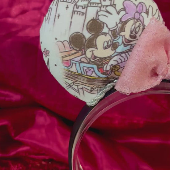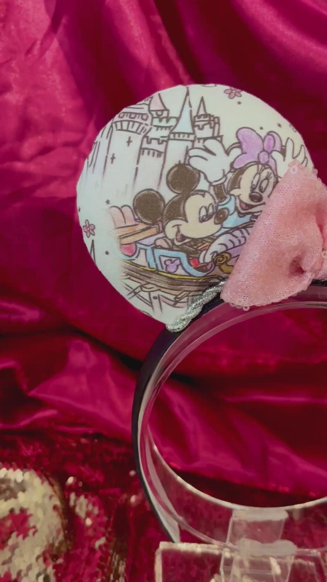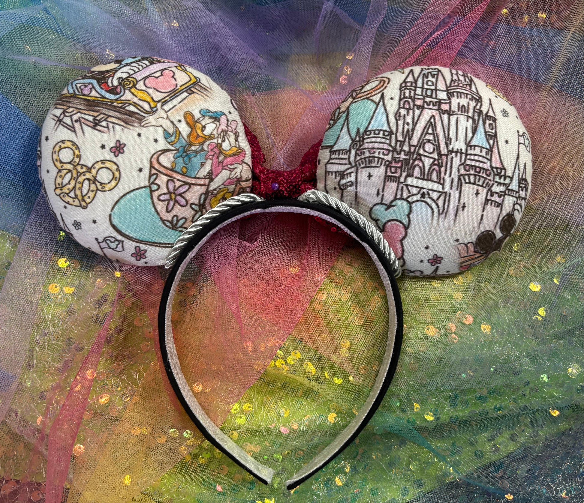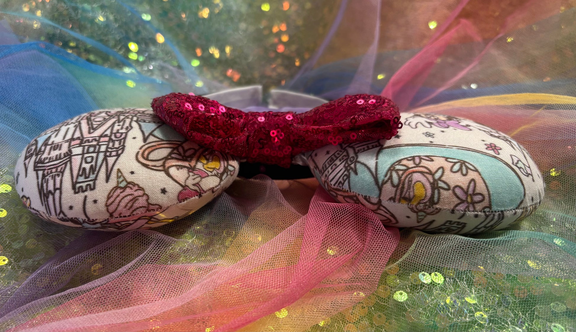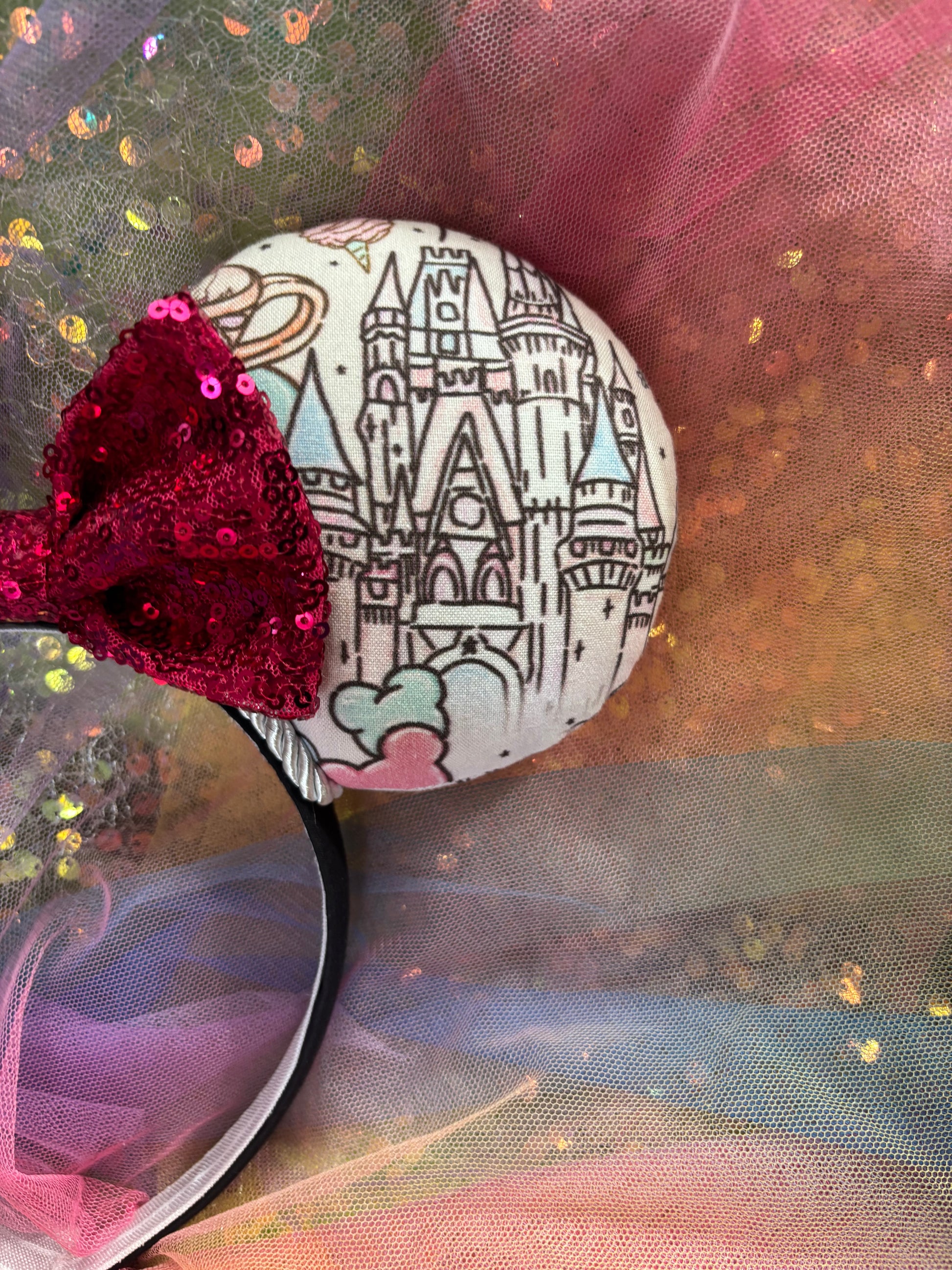 Fabric is on ears front and back. Headband has black fabric. Twisted trim along inner ears with a hot pink sequin bow. If you’d prefer a different color, I have almost every color in sequin bows, just write in notes what bow you want or message me and I’ll attach the one you want. Elastic on inner headband. The ears are sewn and filled with batting then hot glue to headband and then hand stitched for extra protection. No floppy ears here!!!! The headband is universal sized and fits most. Made and ready to ship! Fabric placement may vary slightly at these are collage fabric prints.