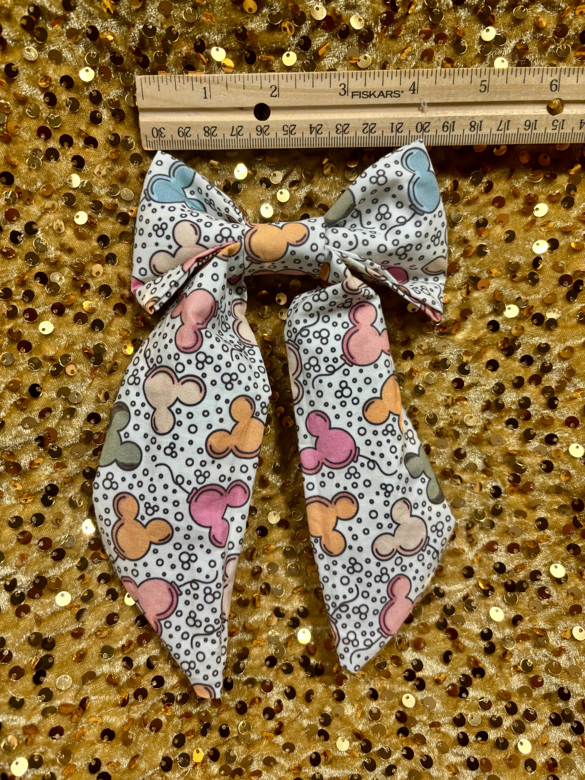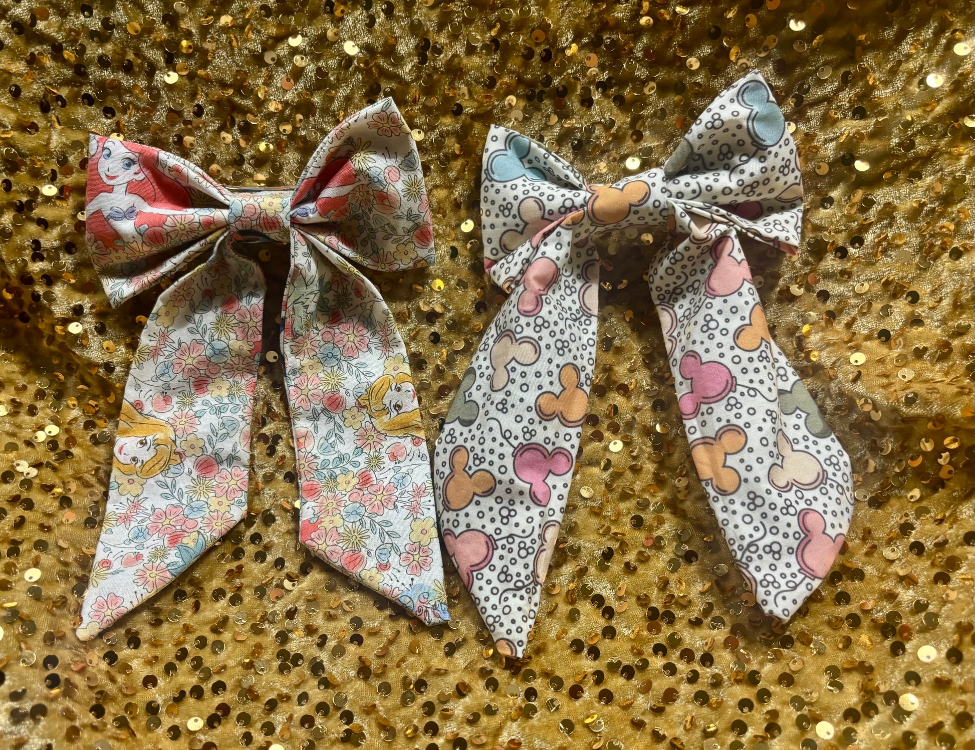 These bows are perfect for Disney trips and more. This bundle includes the two French tailed bows shown. They’re all handmade and sewn. The backs have French barrette backings on them. All are handmade by me! Made and ready to ship with free shipping.