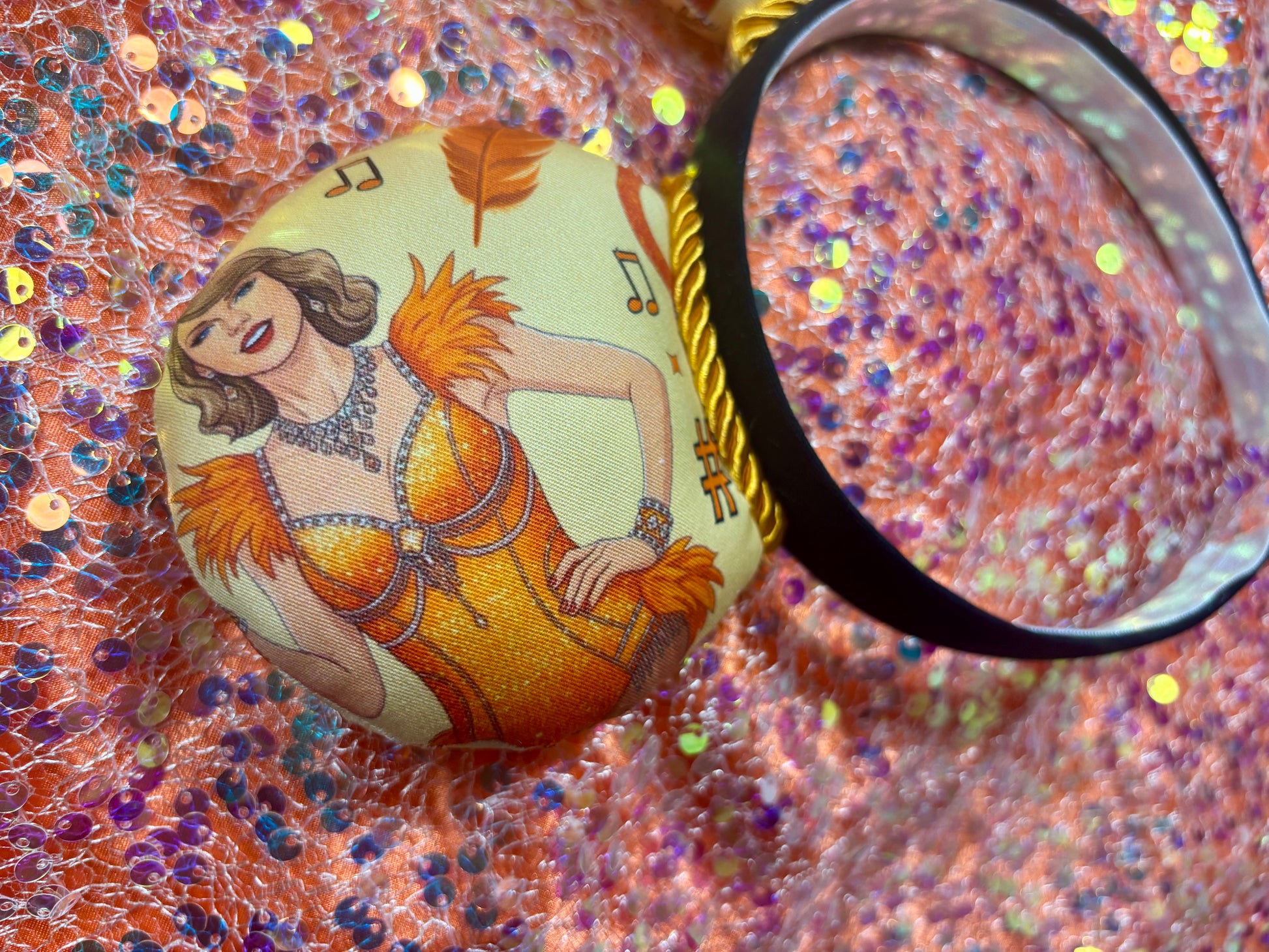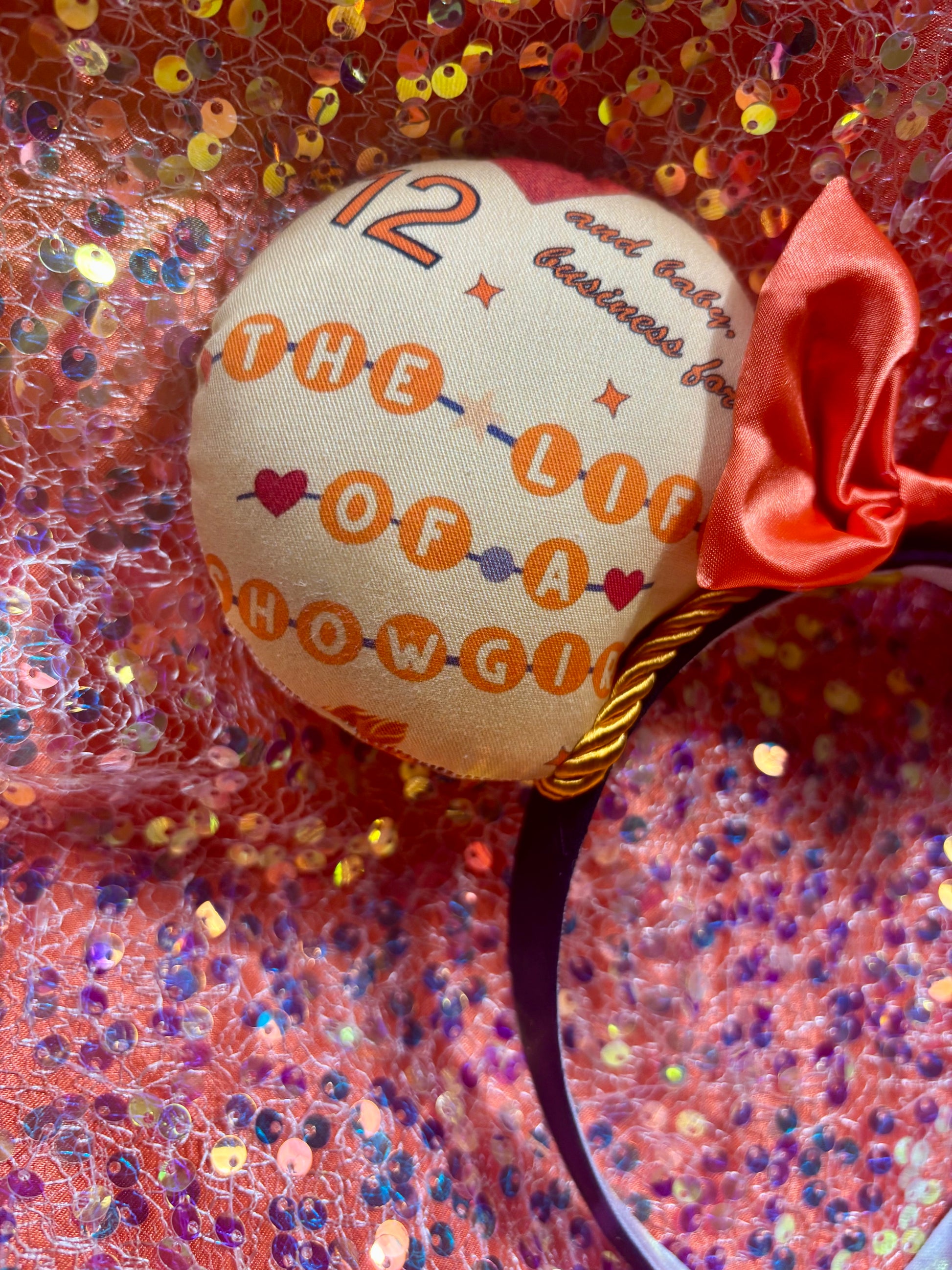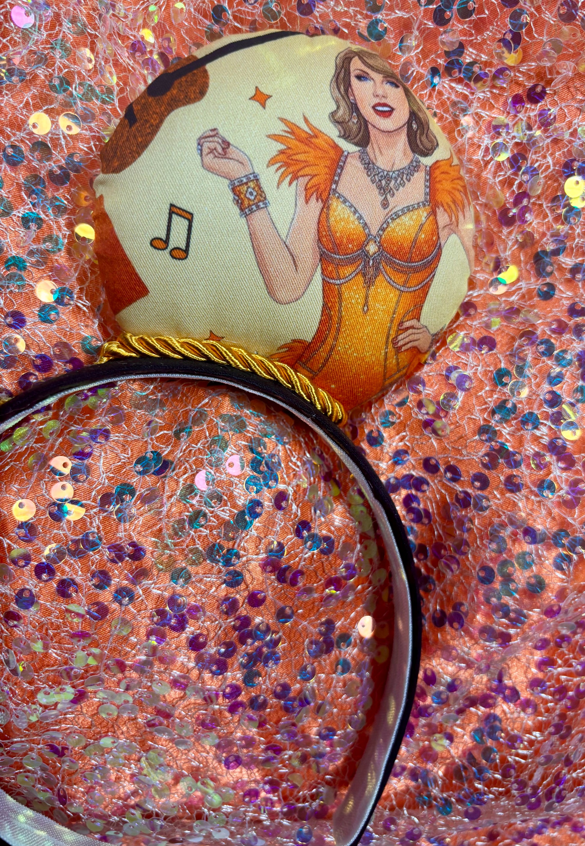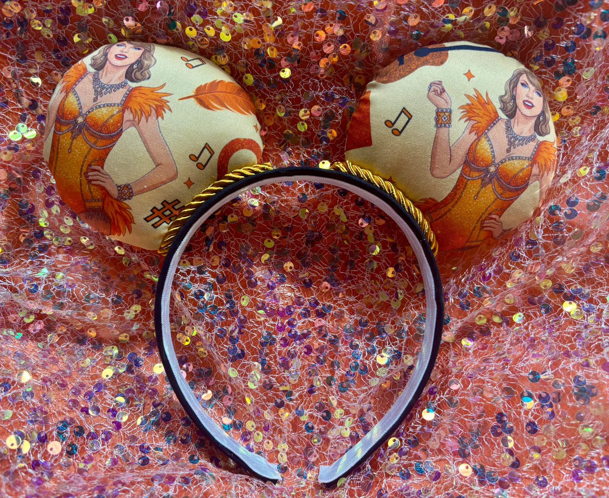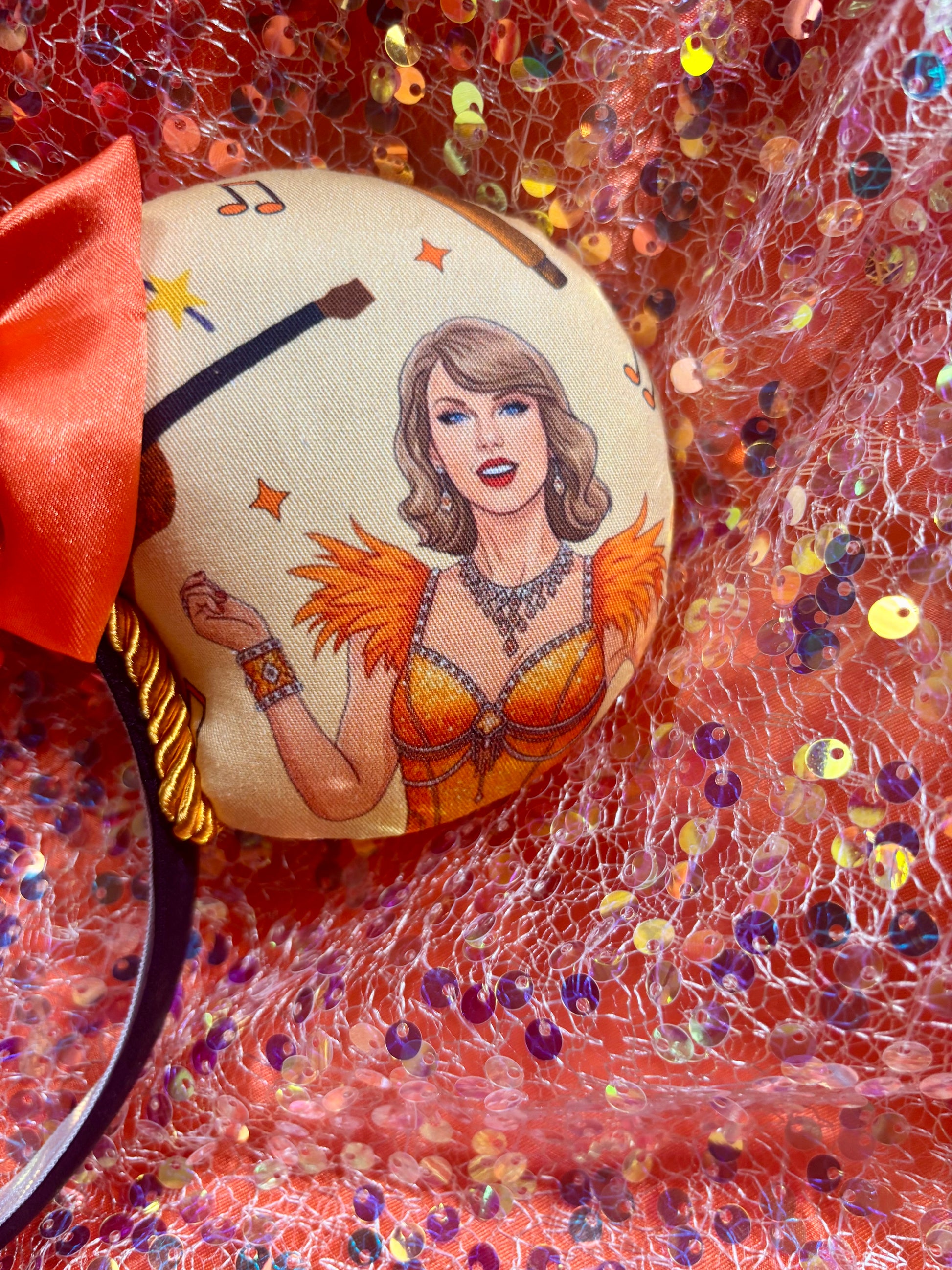 Channel your inner showgirl — these Ophelia mouse ears are handcrafted for Taylor Swift and LOAS fans who love the bold orange and mint color palette with an elegant satin finish. Featuring coordinated fabric, orange twisted trim, and a luxe satin bow, these ears are made to stand out at the parks or any concert celebration.