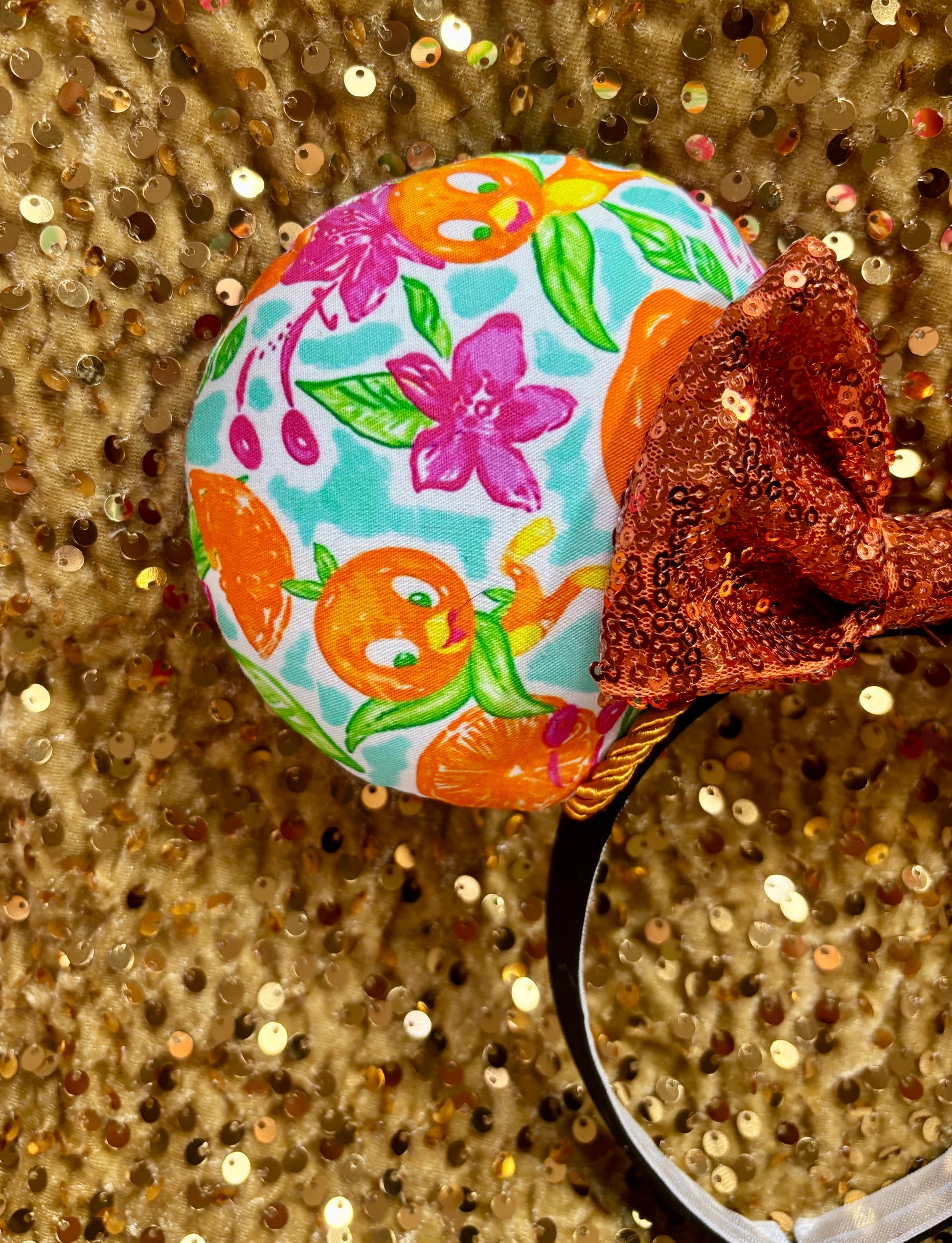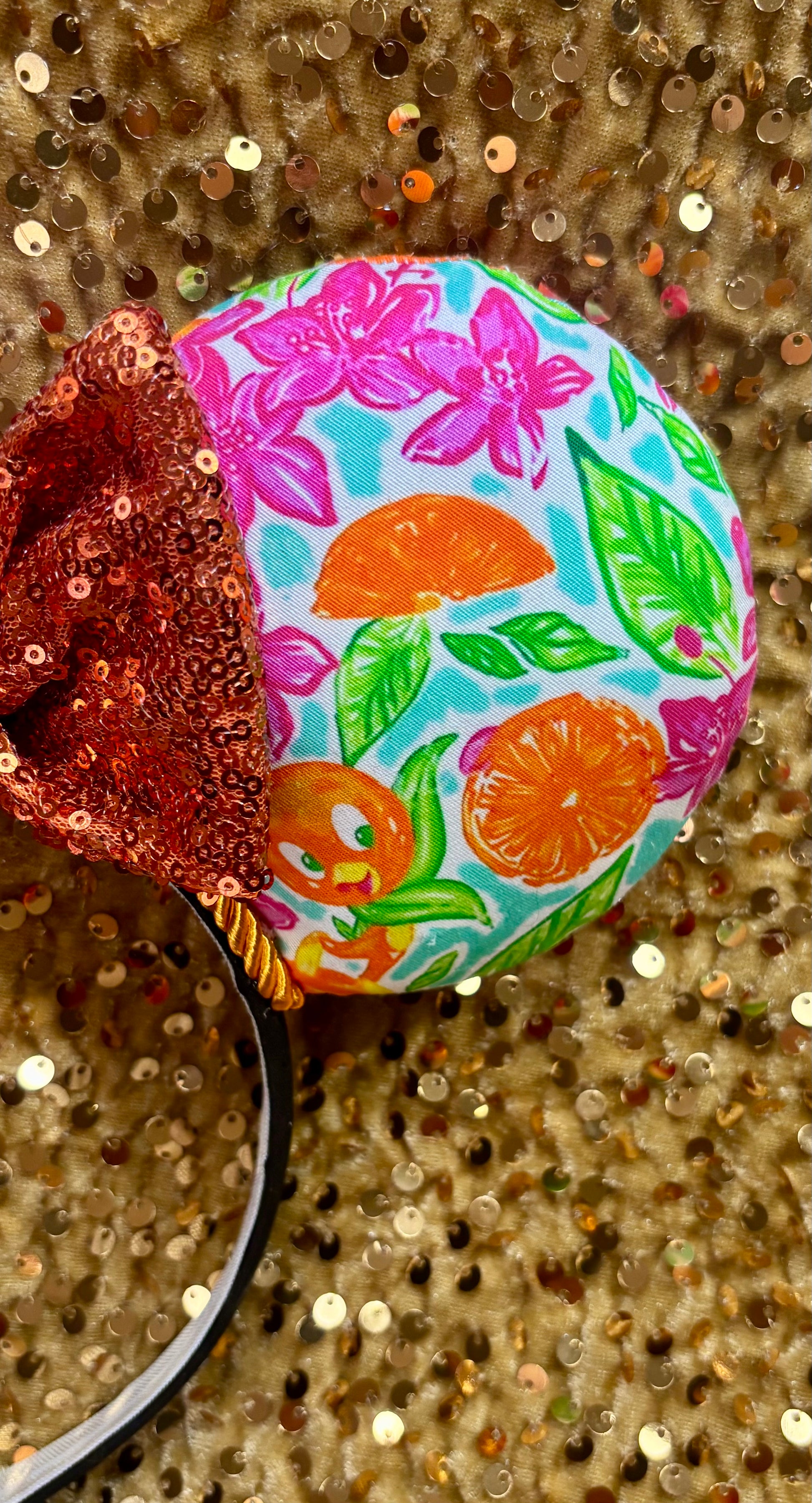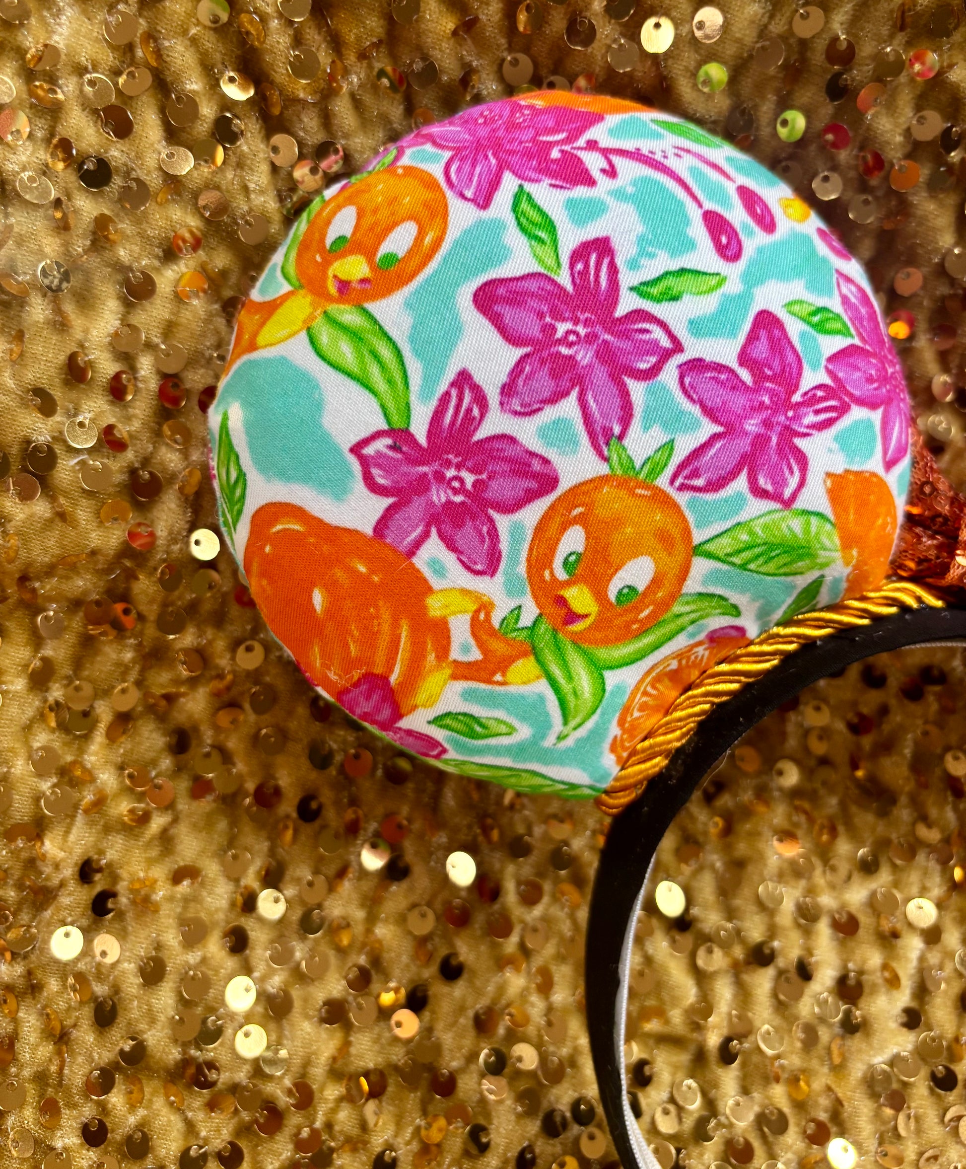 - Orange Bird fabric on ears (front and back) with adorable citrus designs