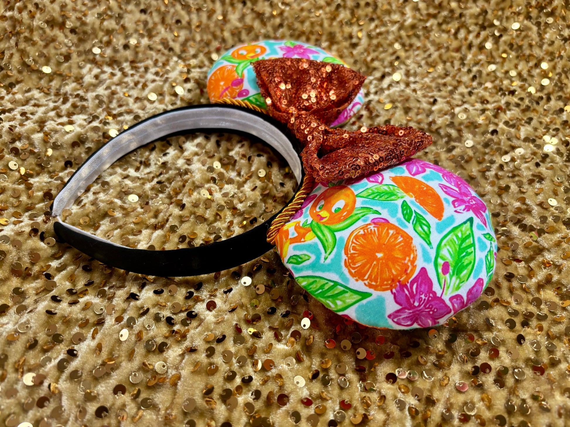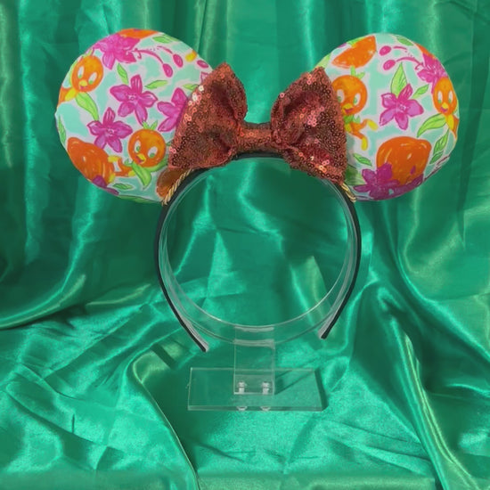 These cheerful Orange Bird Mouse Ears celebrate everyone's favorite citrus-loving bird! Featuring vibrant Orange Bird fabric and bright orange accents, these ears are perfect for fans of this beloved Magic Kingdom icon and Adventureland explorers.