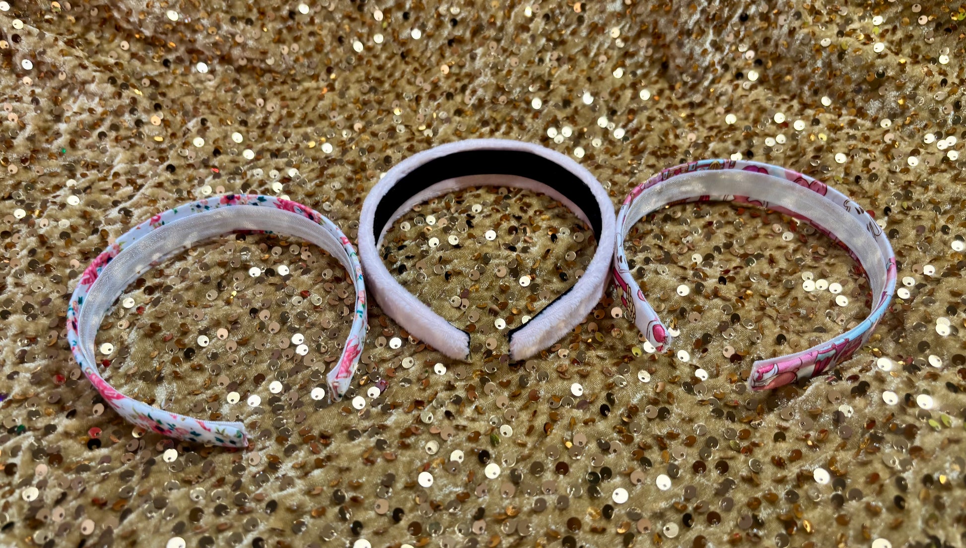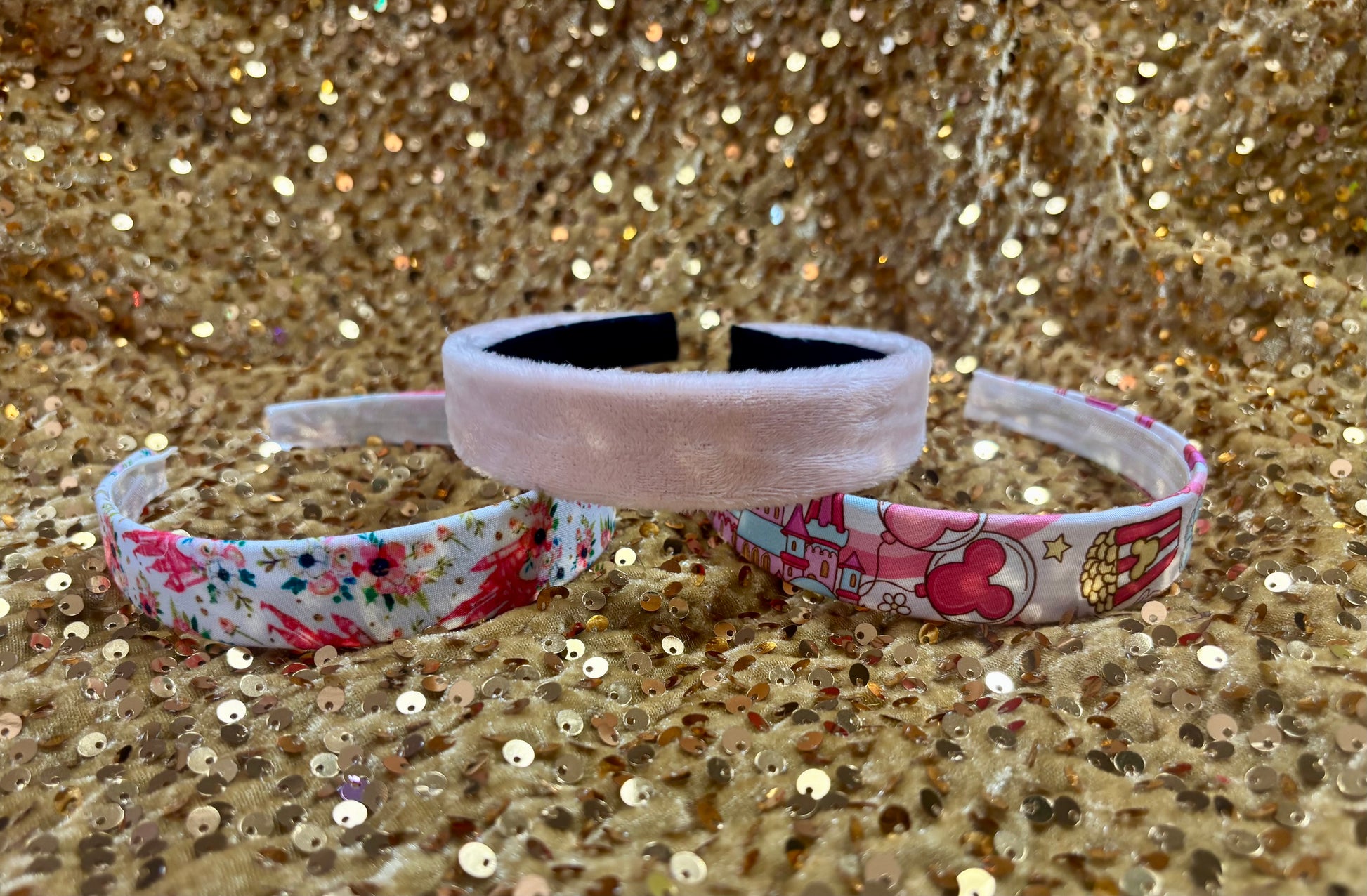 The bundle includes one pink floral castle headband, one magical day headband and one plush light pink headband. 3 headband total. Placement varies on headbands. Handmade and ready to ship with free shipping. Inner headbands are secured with elastic.