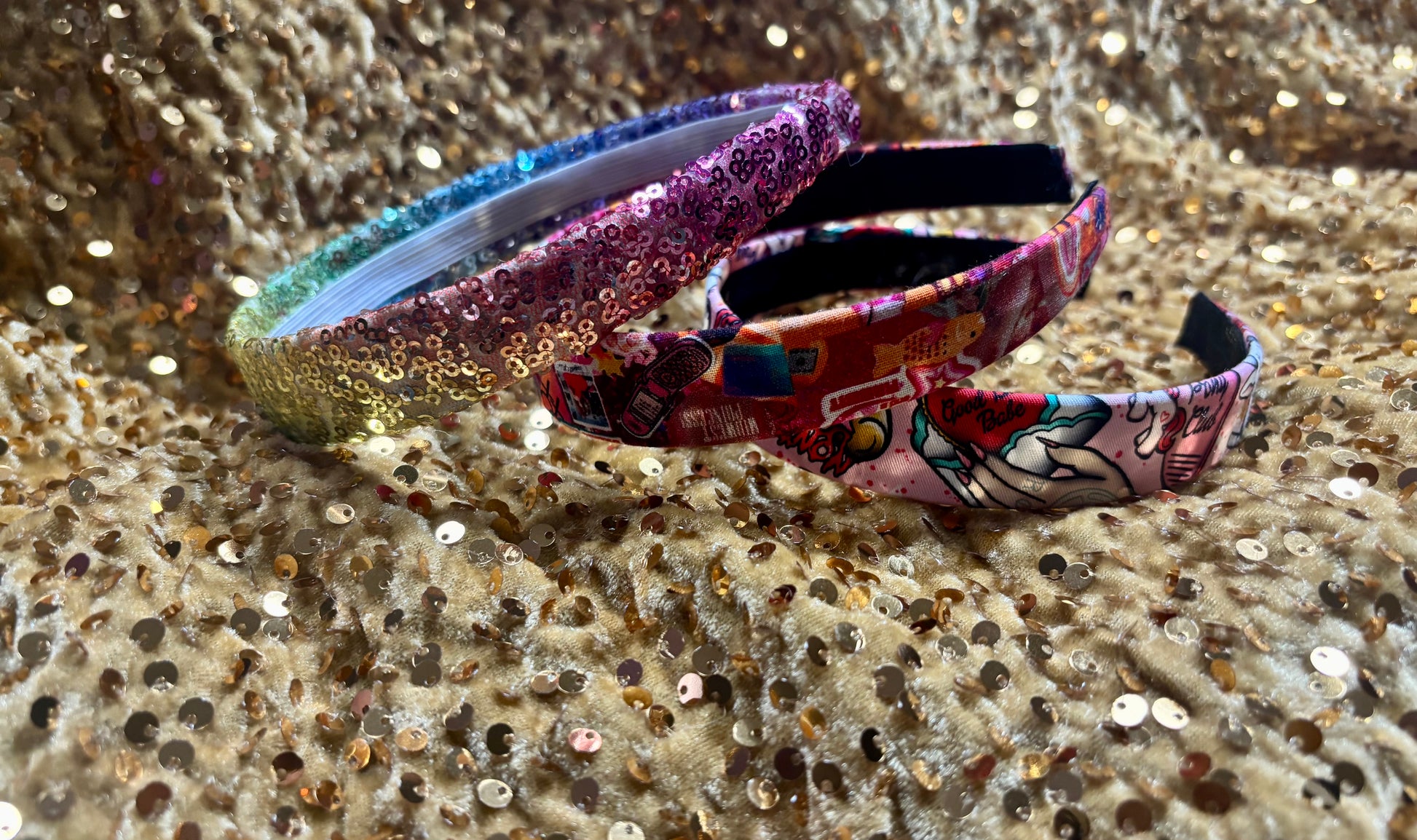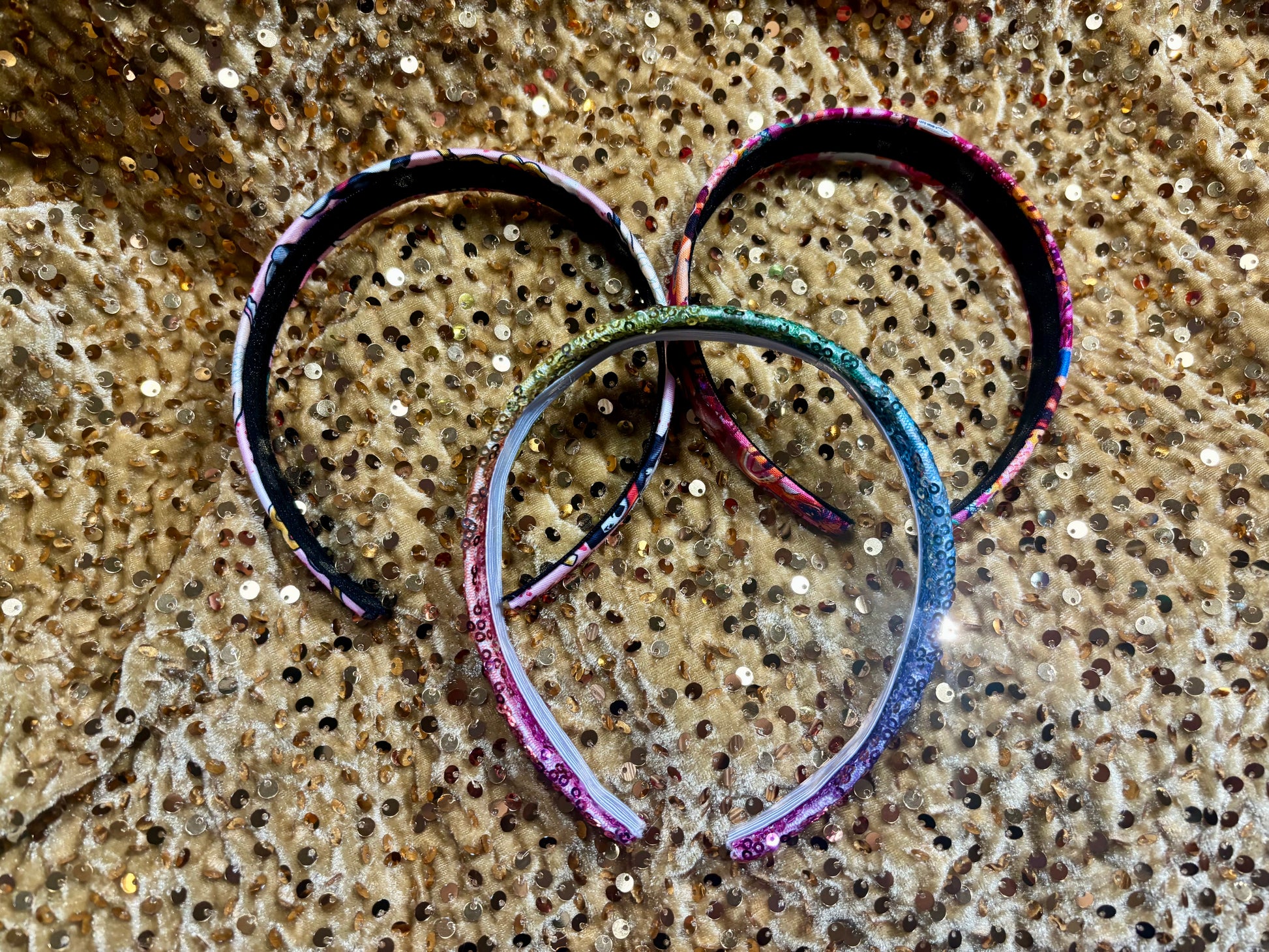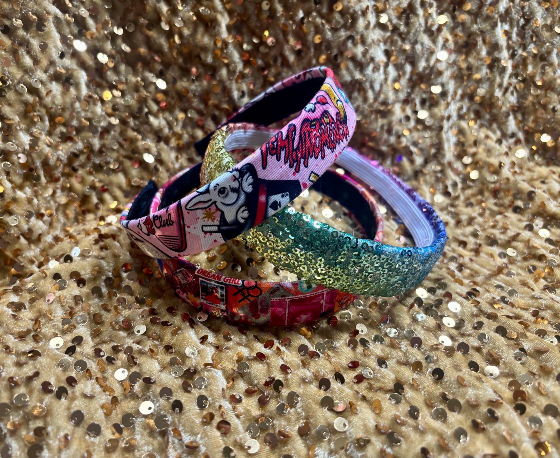 The bundle includes one pink chappell, good luck, babe headband, one rainbow sequin headband. Handmade and ready to ship with free shipping. Inner headbands are secured with elastic.
