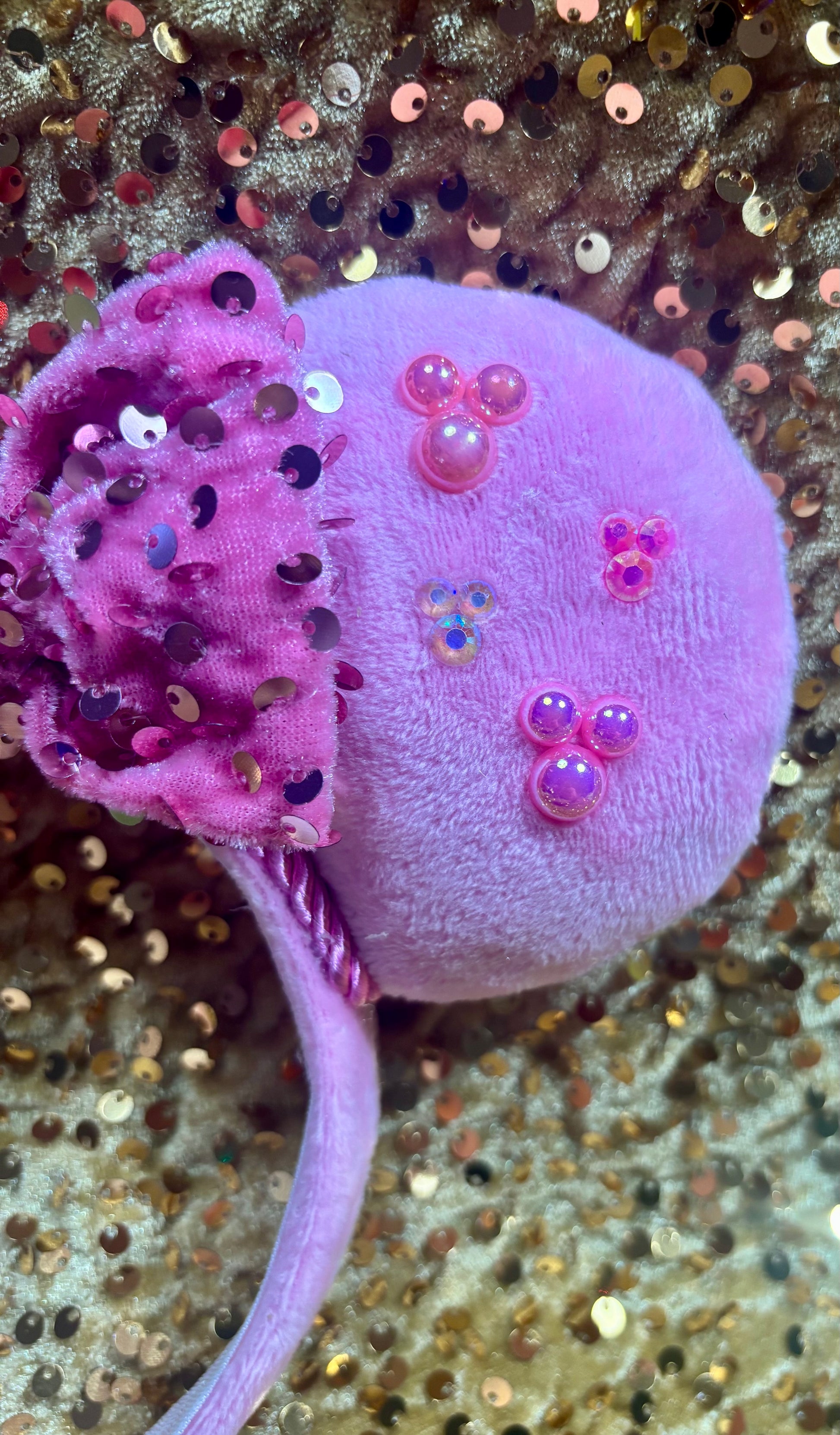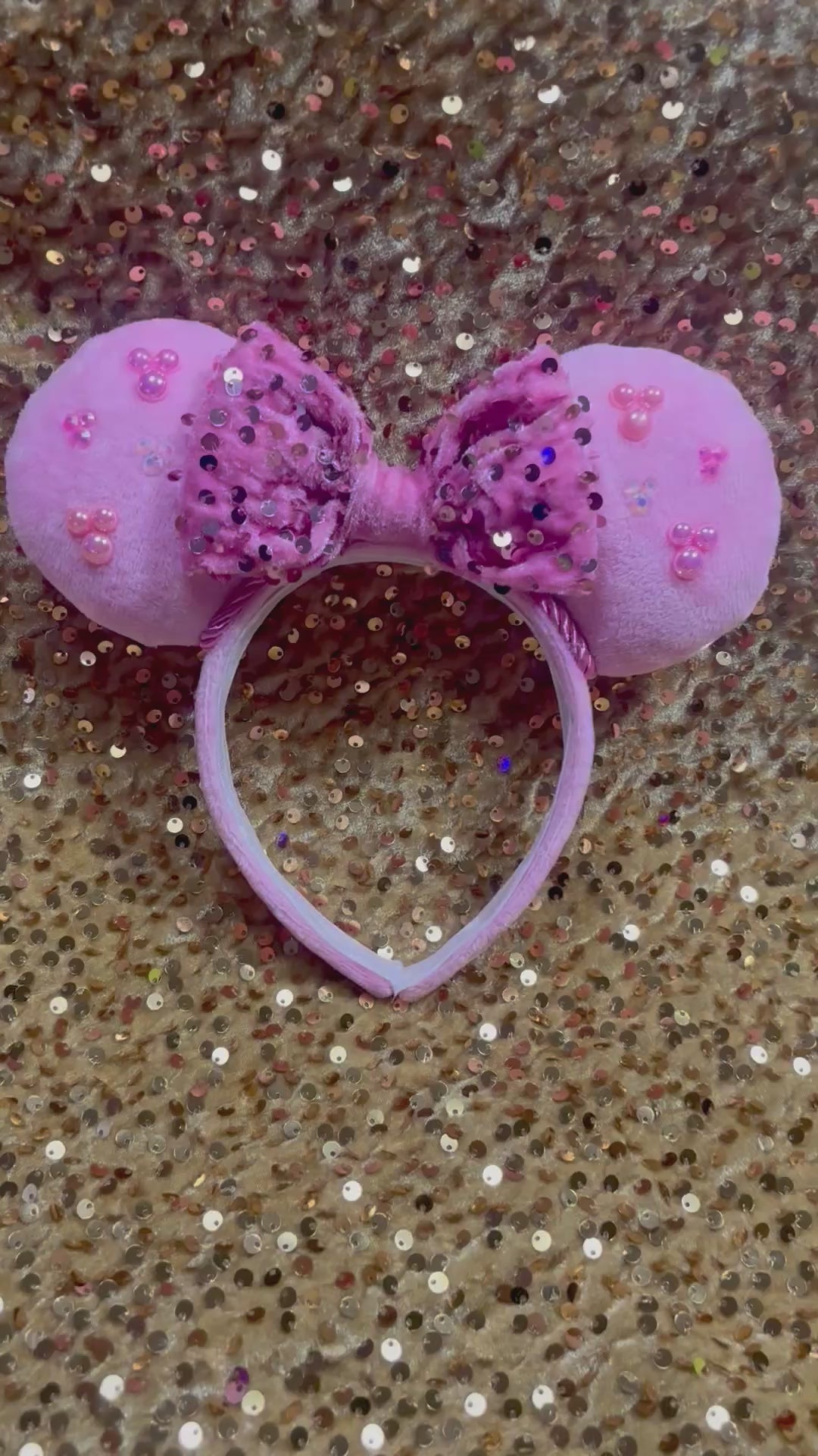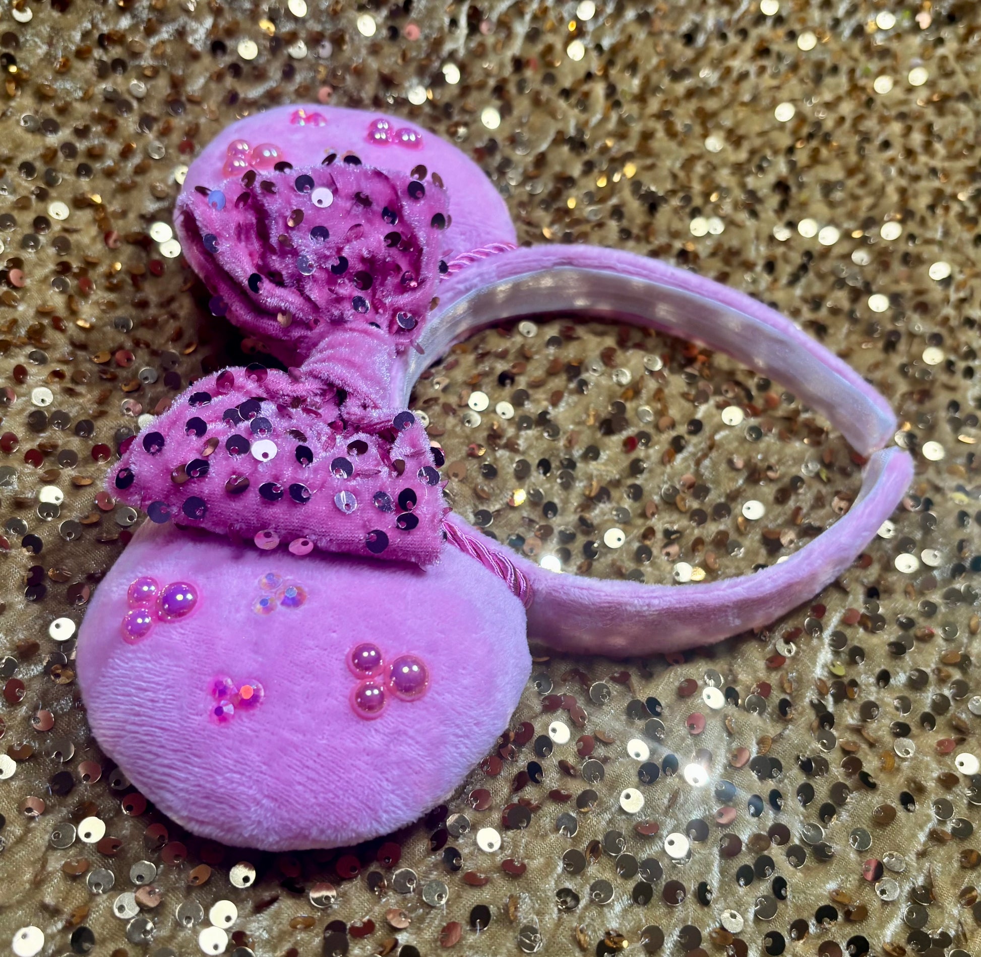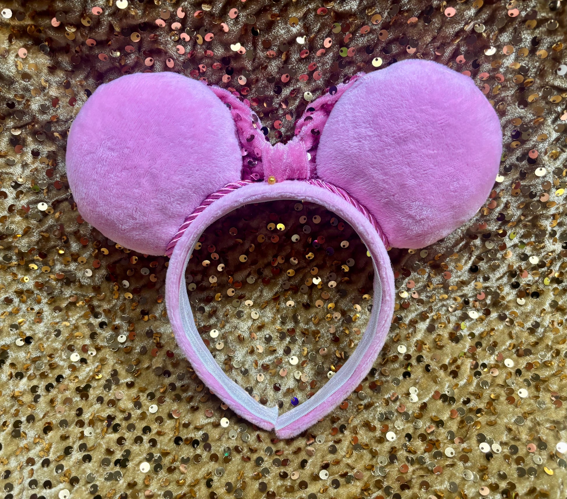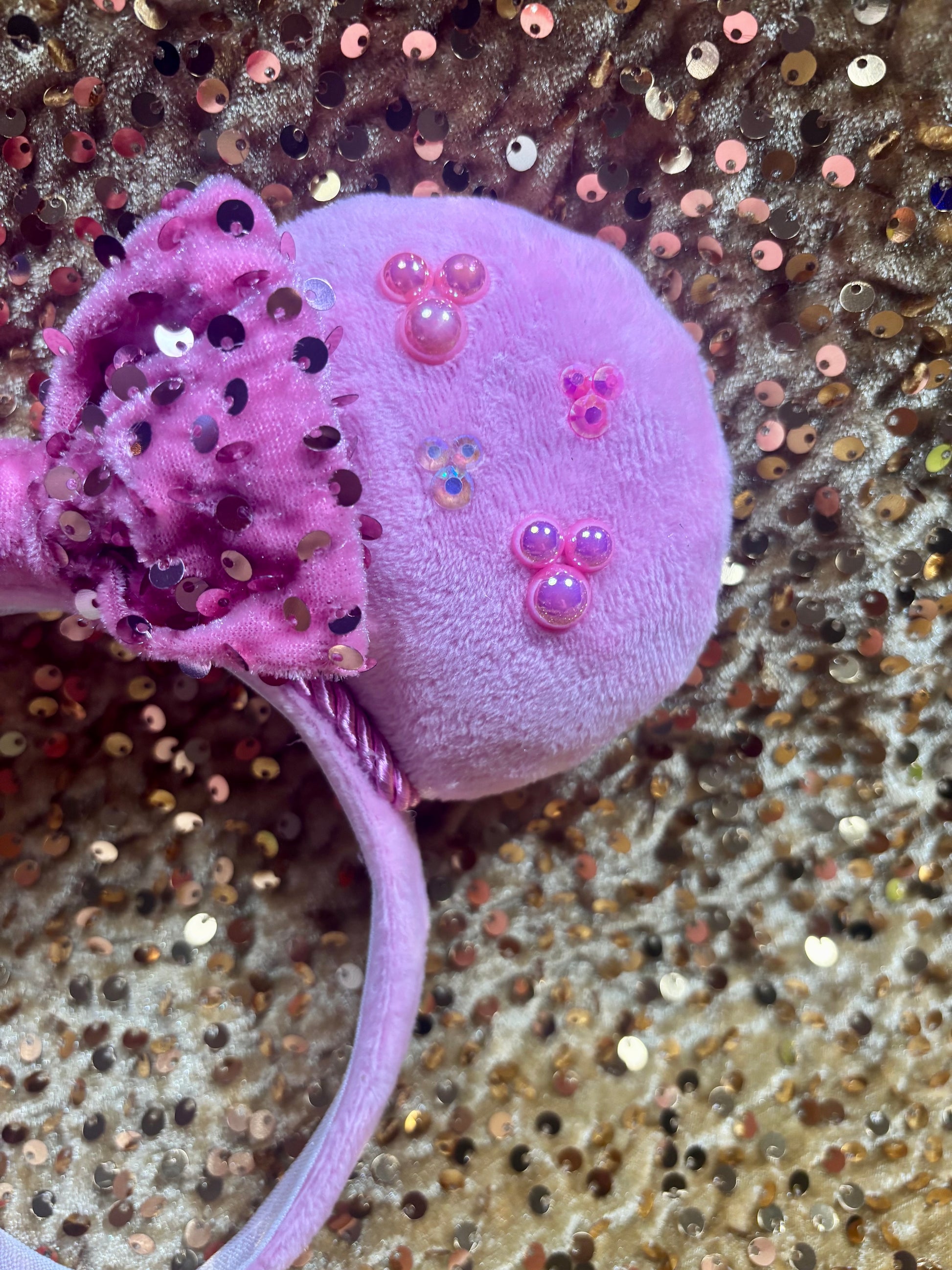Soft Pink Fabric is on ears front and back and on the headband as well with elastic on inner headband. Pink trim along inner ears with a pink velvet sequin bow. Gemstones are secured on it to make mouse heads. Made and ready to ship with free U.S. shipping. The headbands are universal sized and fit most. The ears are sewn, hot glued to headband and then handstitched to headband for extra protection!!! 🫶🏻