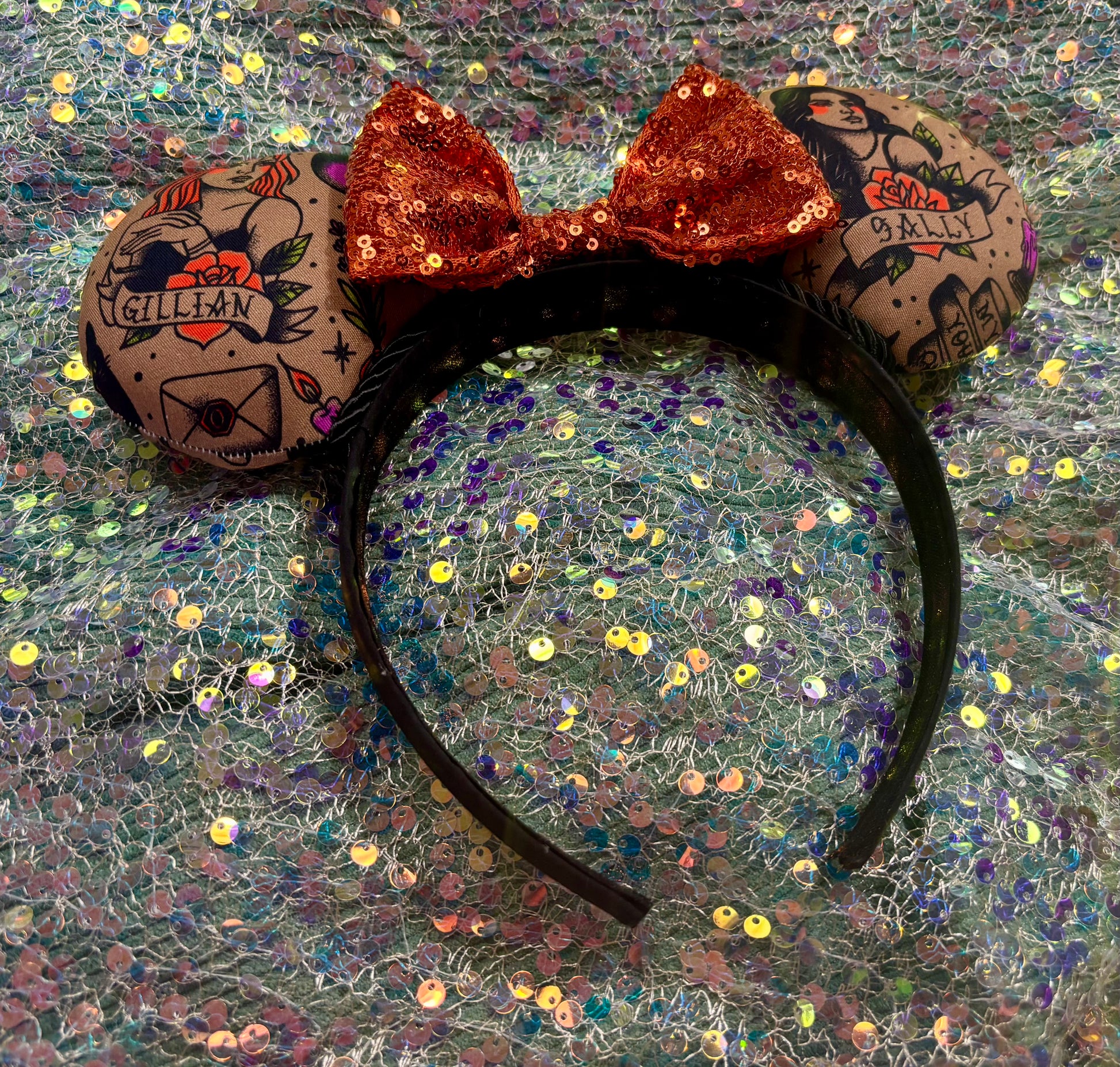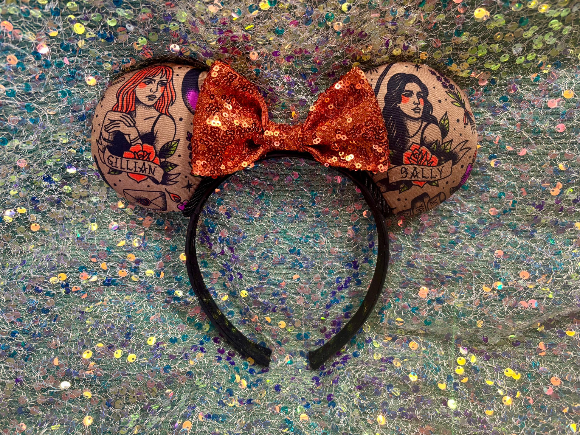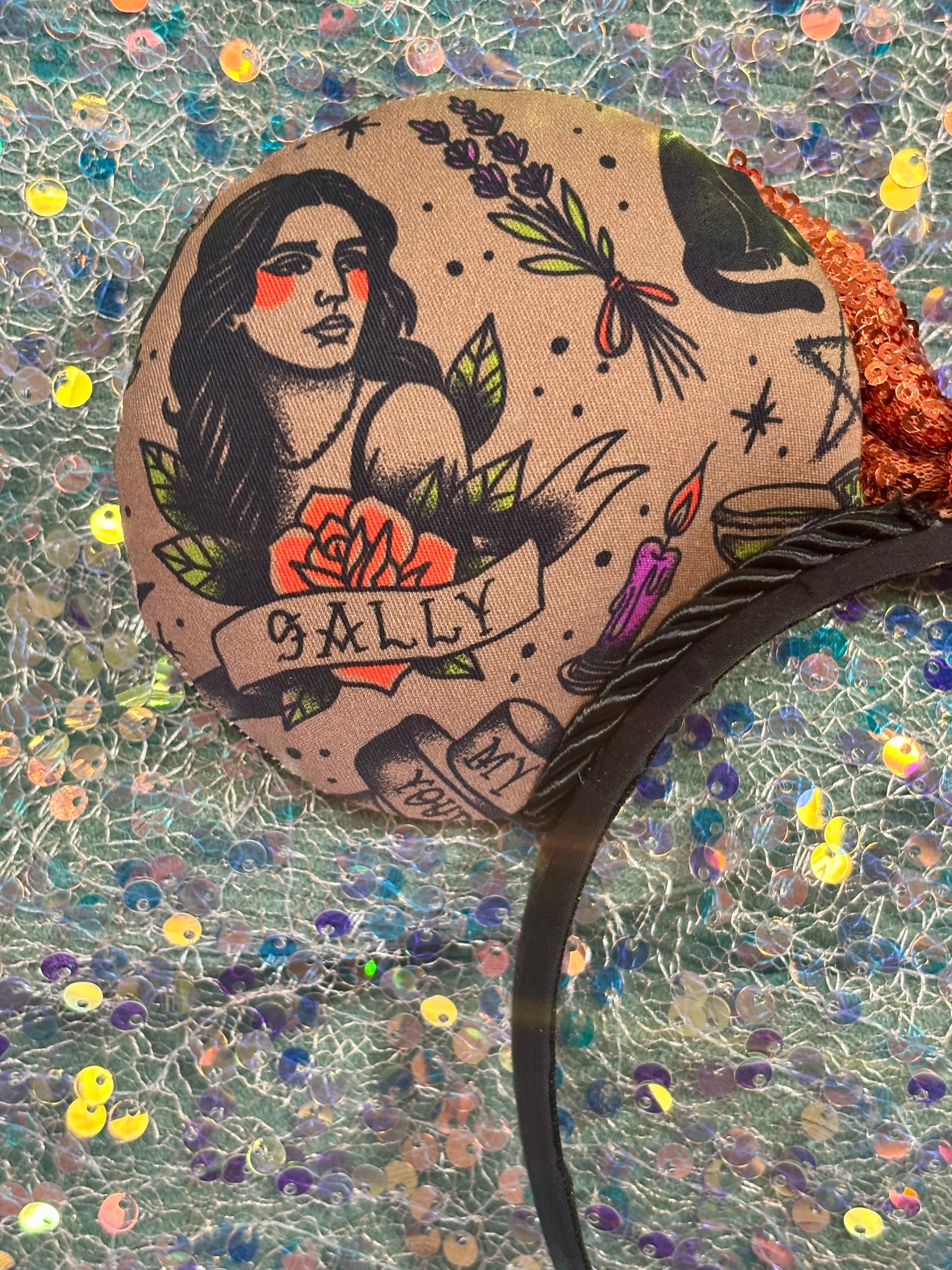 Practically perfect in every way — these Owens Sisters inspired mouse ears are handcrafted for Hocus Pocus fans who love spellbinding style at the parks or any Halloween celebration. Featuring themed collage fabric, black twisted trim, and a customizable sequin bow, these ears are ready to ship and ready to bewitch.