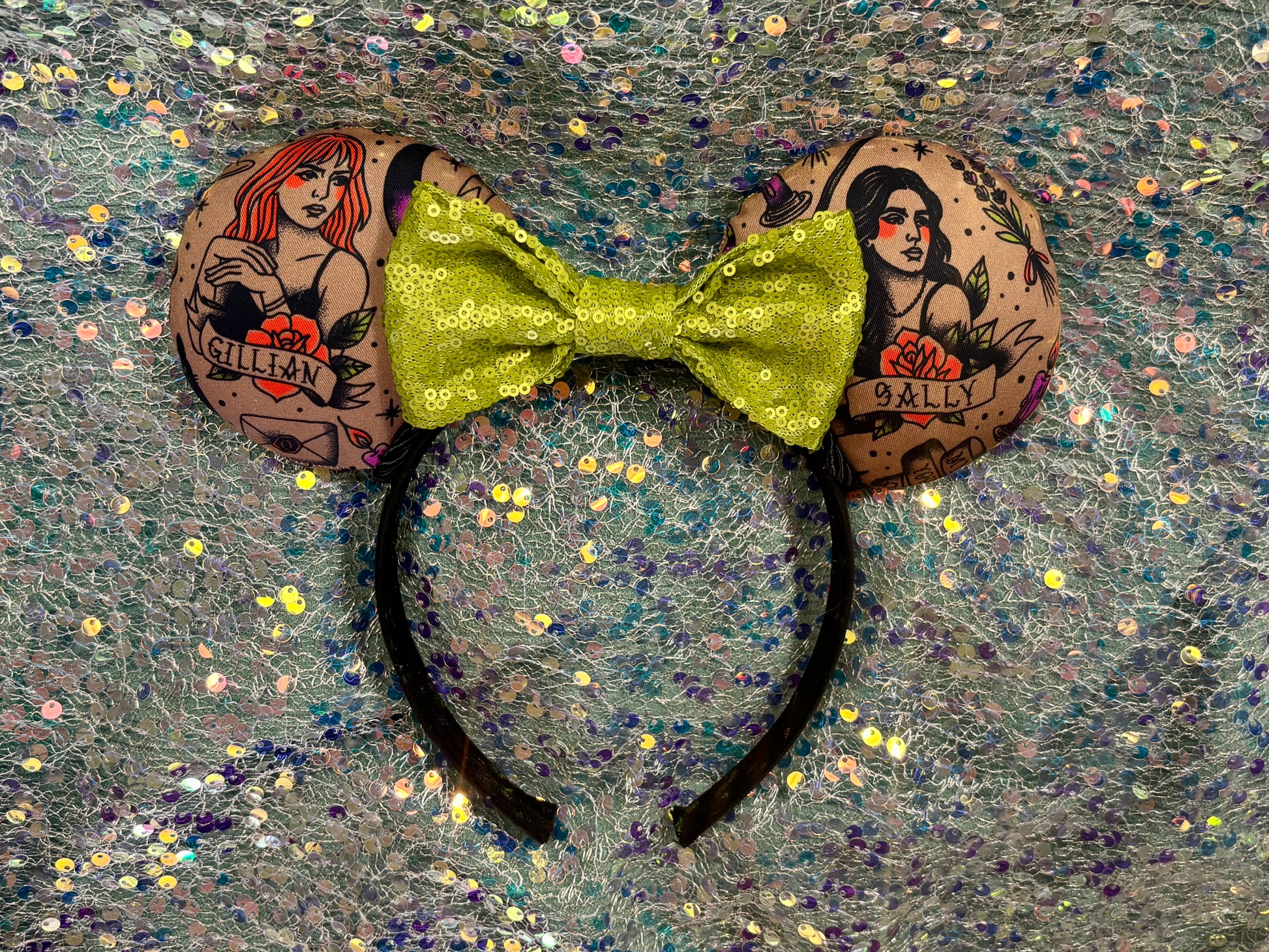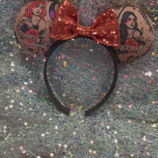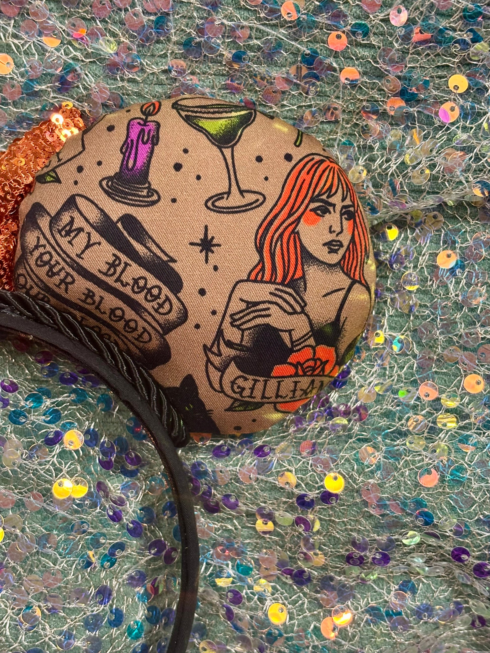 Practically perfect in every way — these Owens Sisters inspired mouse ears are handcrafted for Hocus Pocus fans who love spellbinding style at the parks or any Halloween celebration. Featuring themed collage fabric, black twisted trim, and a customizable sequin bow, these ears are ready to ship and ready to bewitch.