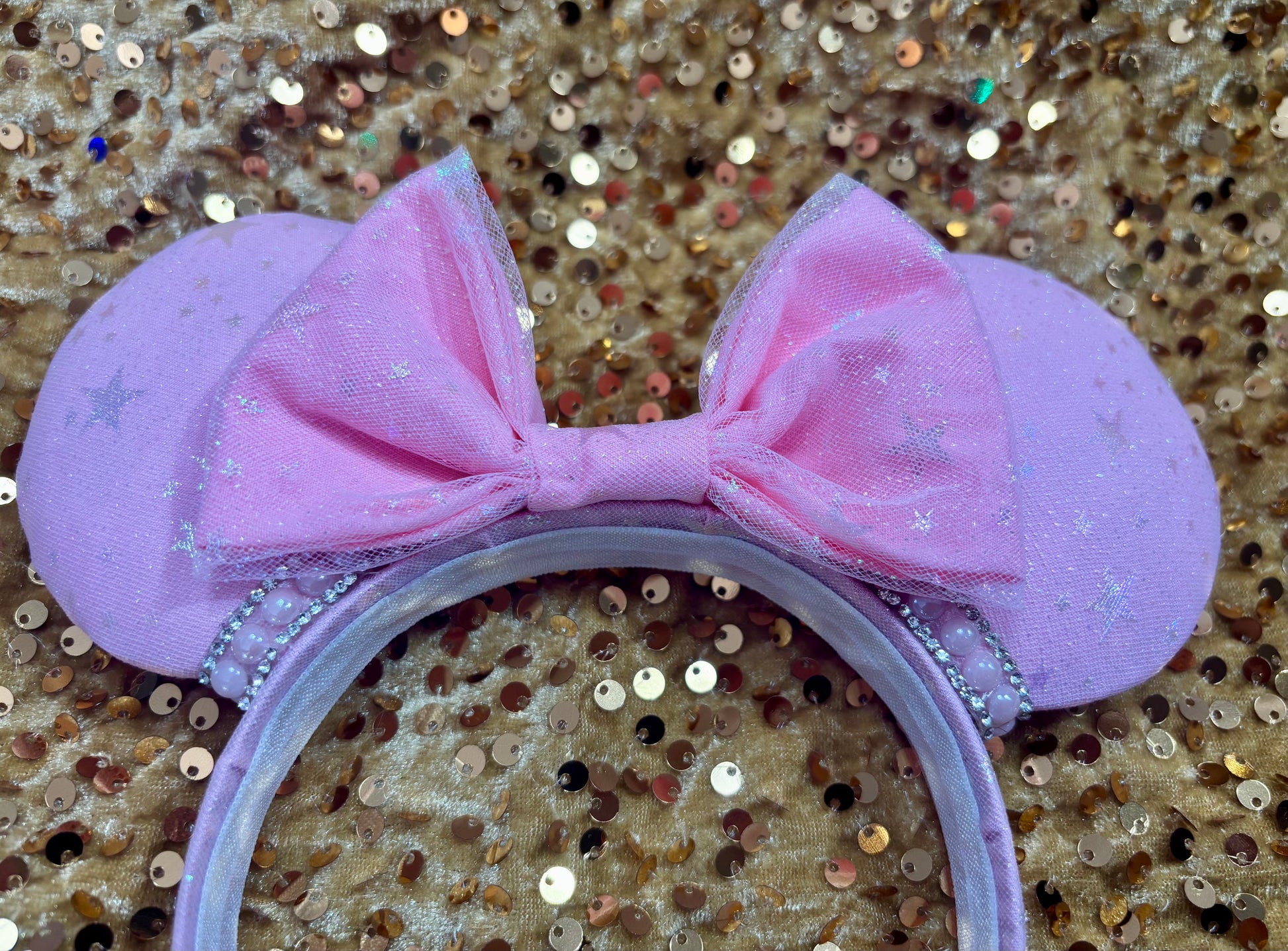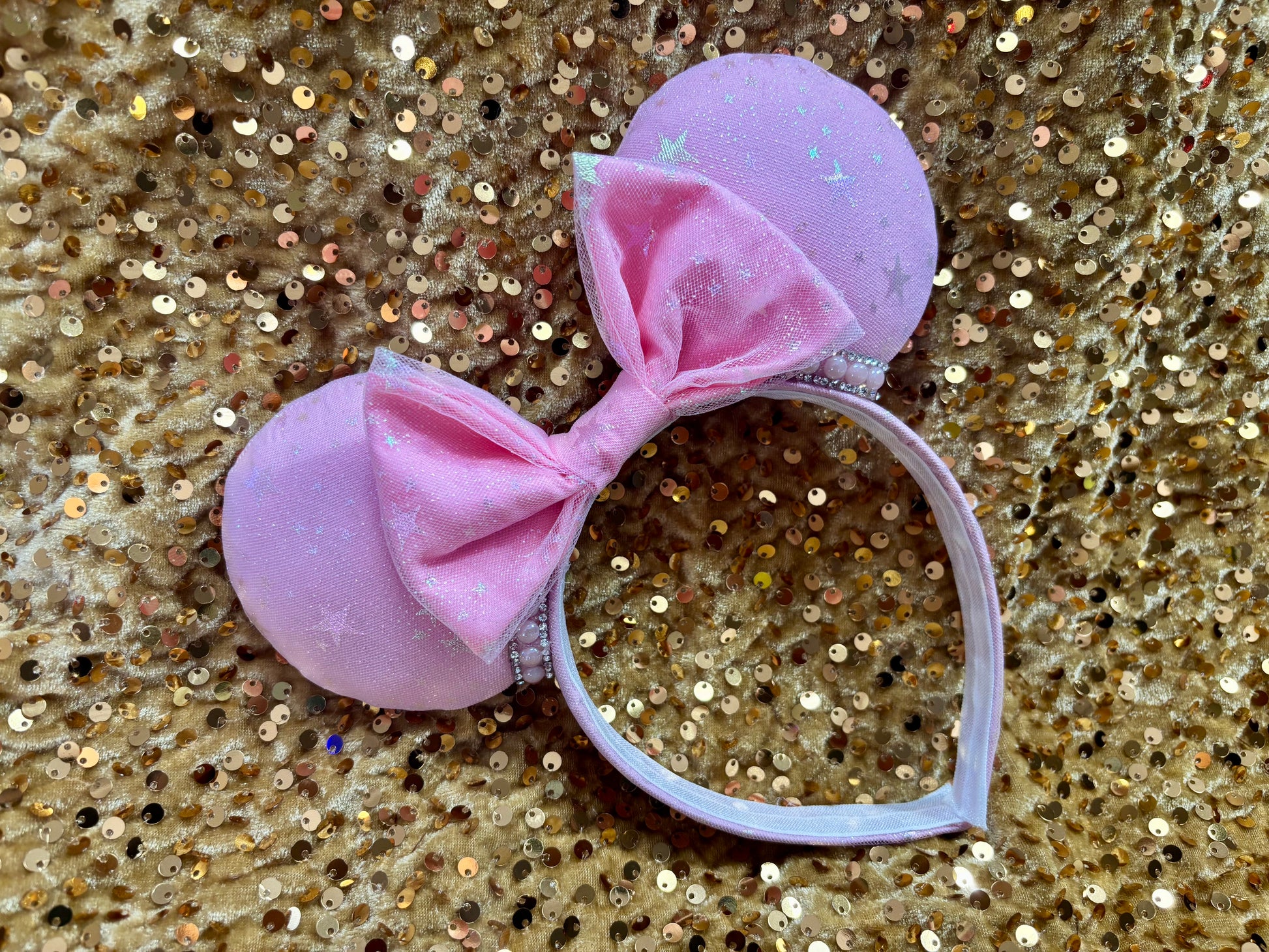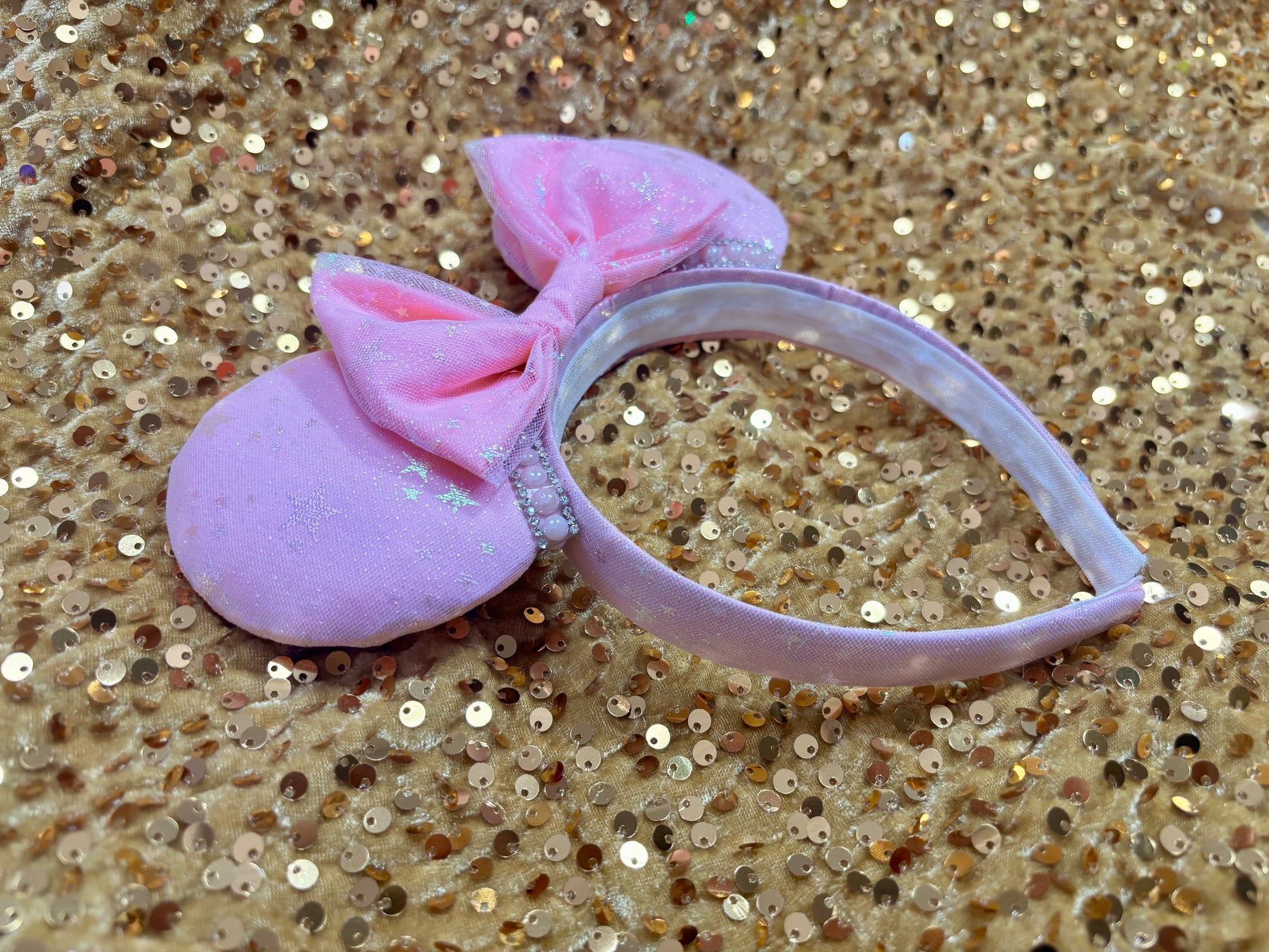 Pink iridescent Star Fabric is featured on the front and back of the ears, and also on the headband. The ears are accented with a rhinestone and pink trim, while the inner ears have elastic for a comfortable fit. A matching pink bow is secured on the ears, but if you'd like a different bow, just let me know in the notes section of your order. These ears are made and ready to ship with free shipping included. They are carefully crafted with batting and hand-stitched for added durability. The universal-sized headband fits most, and your order will arrive in a box with bubble wrap for safe shipping. Please note that I am not affiliated with The Disney Company and all rights belong to their respective owners. And of course, have no fear - I always ship with a playful, quirky tone and a touch of humor! Just remember that once your package is handed over to USPS, any shipping delays are out of my control and all sales are final. Thanks for your understanding.