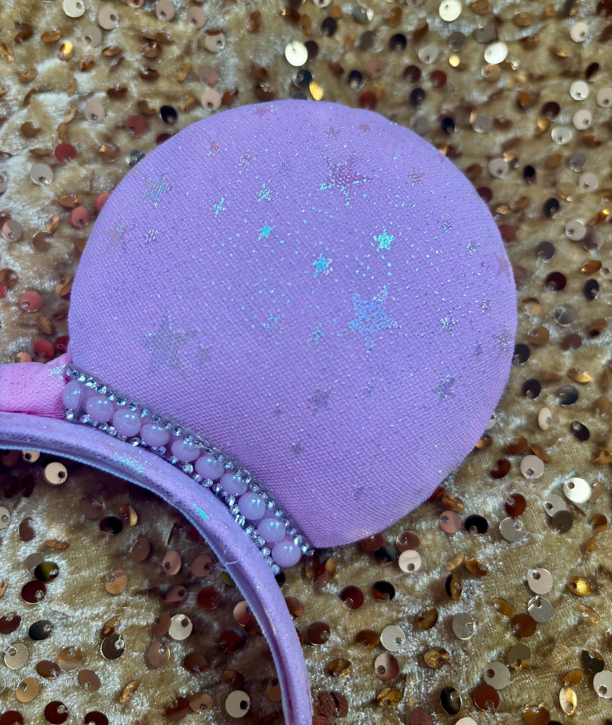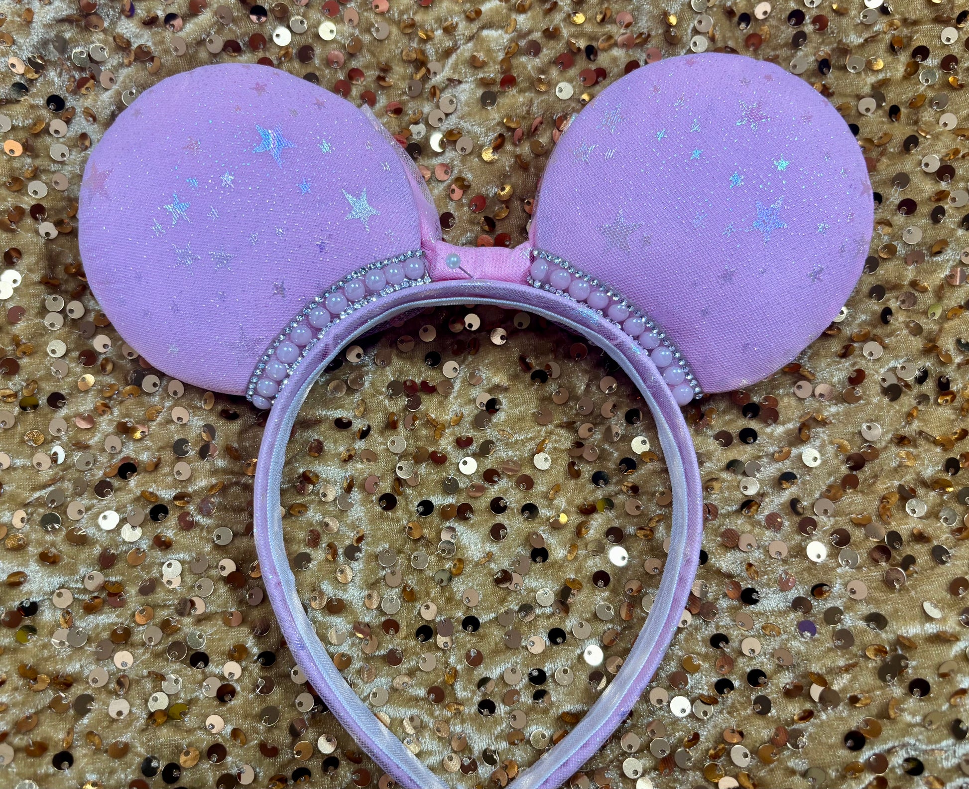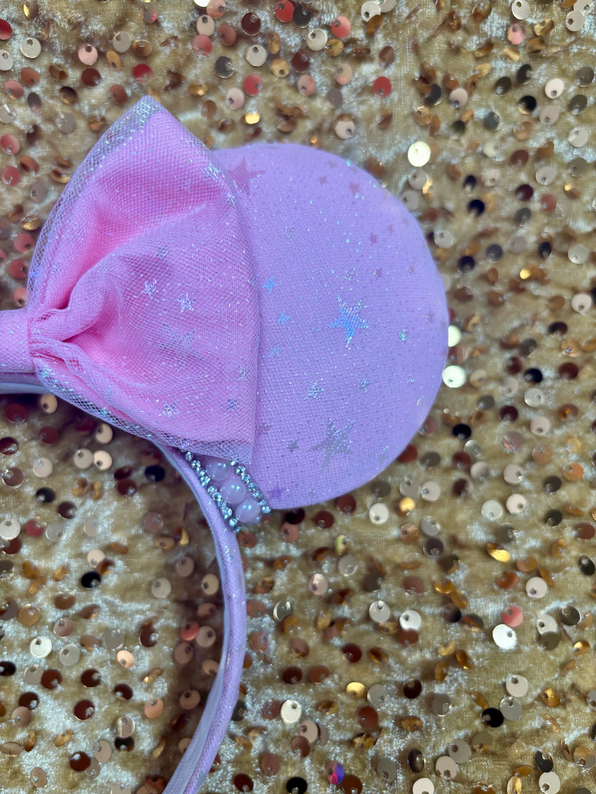 Pink iridescent Star Fabric is featured on the front and back of the ears, and also on the headband. The ears are accented with a rhinestone and pink trim, while the inner ears have elastic for a comfortable fit. A matching pink bow is secured on the ears, but if you'd like a different bow, just let me know in the notes section of your order. These ears are made and ready to ship with free shipping included. They are carefully crafted with batting and hand-stitched for added durability. The universal-sized headband fits most, and your order will arrive in a box with bubble wrap for safe shipping. Please note that I am not affiliated with The Disney Company and all rights belong to their respective owners. And of course, have no fear - I always ship with a playful, quirky tone and a touch of humor! Just remember that once your package is handed over to USPS, any shipping delays are out of my control and all sales are final. Thanks for your understanding.