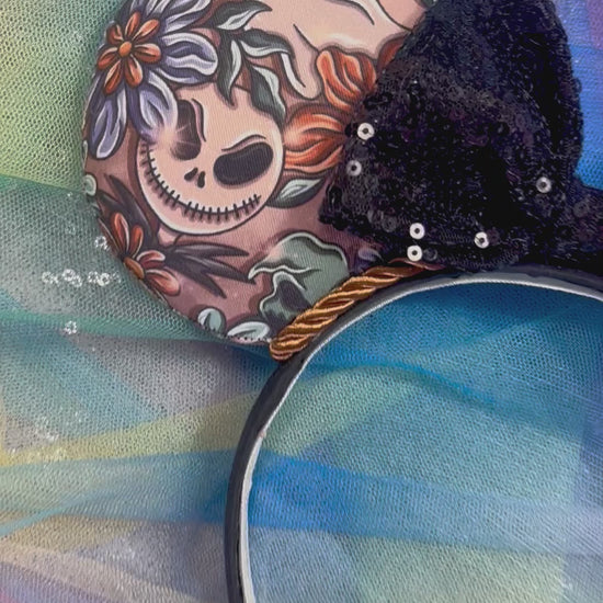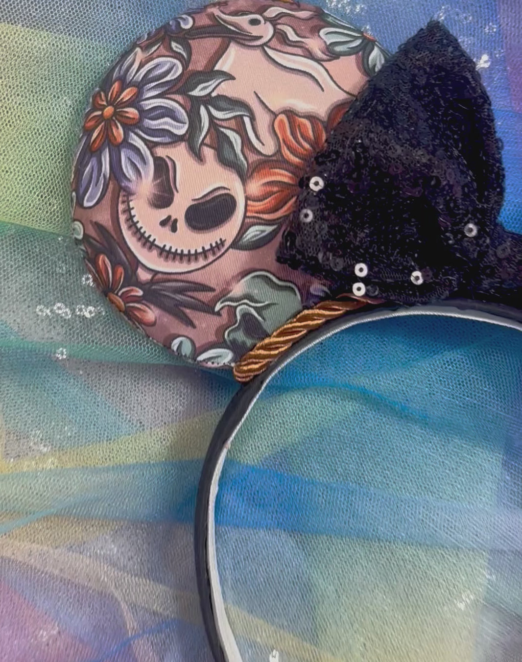 🎃 Beautifully Spooky & Perfectly Elegant! These handmade Pretty Nightmare mouse ears embrace the dark magic of Halloween Town with gorgeous floral nightmare fabric, copper twisted trim, and a customizable sequin bow. Perfect for Nightmare Before Christmas fans, Halloween lovers, and anyone who rocks spooky-cute style year-round at Disney parks.