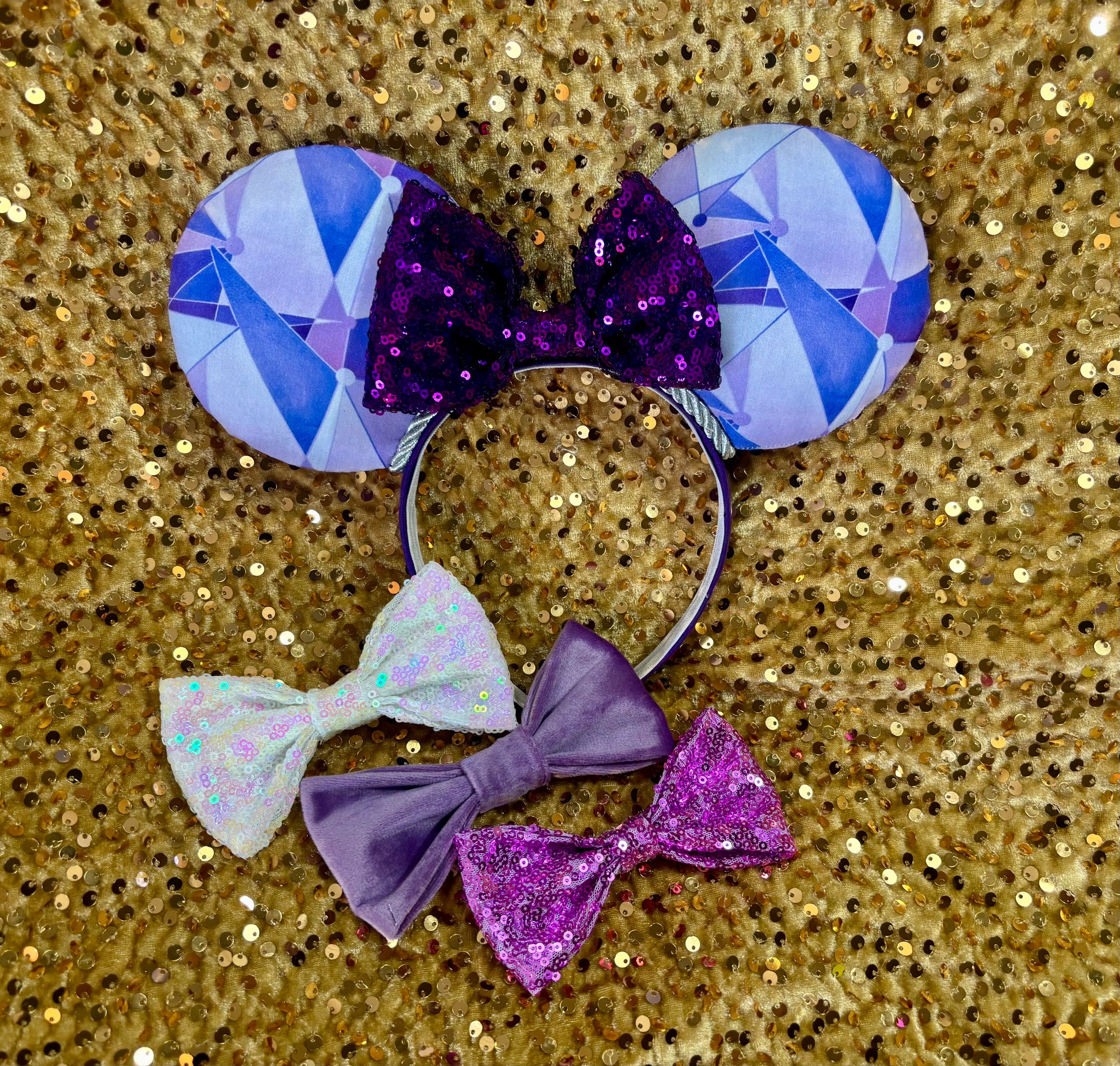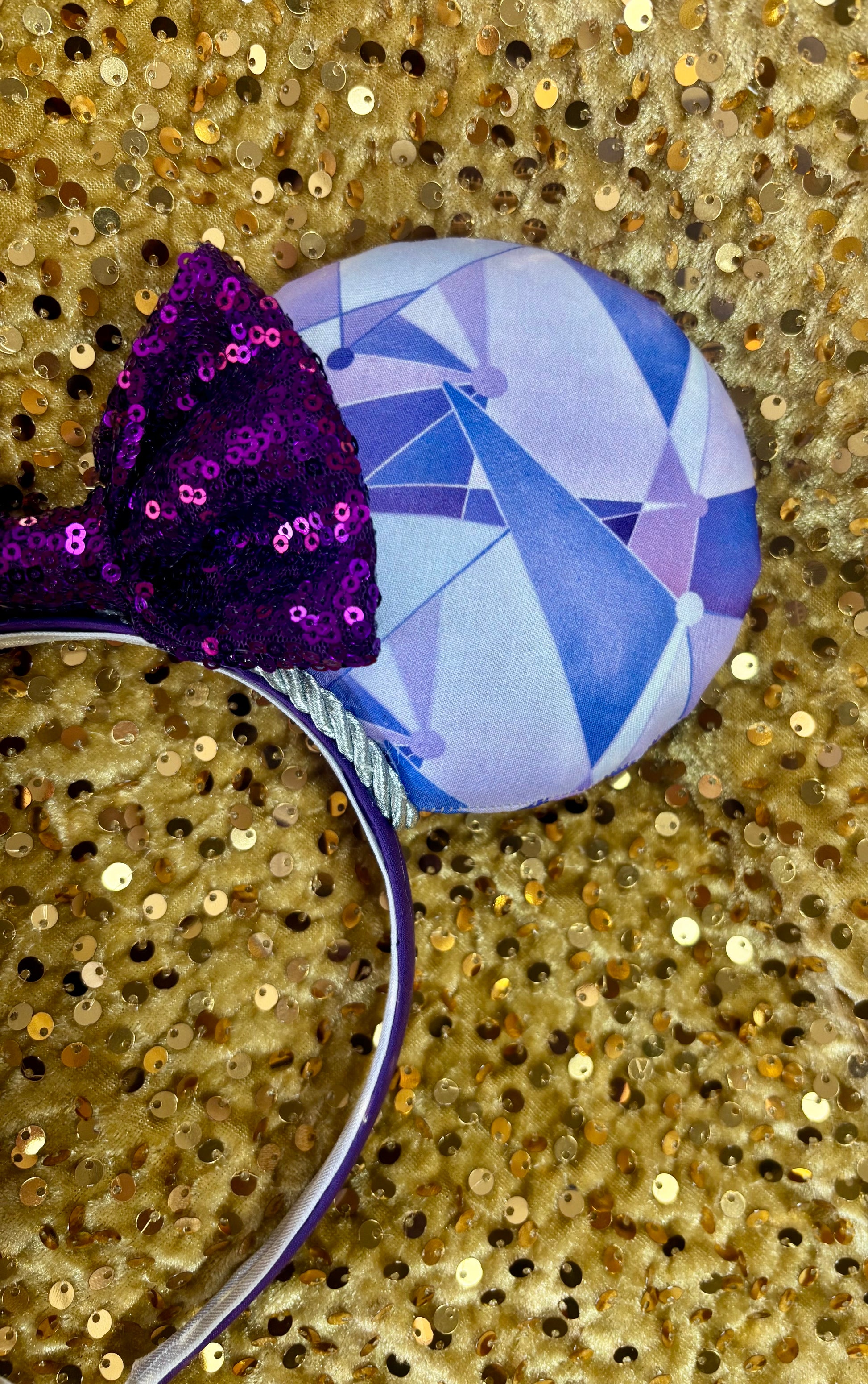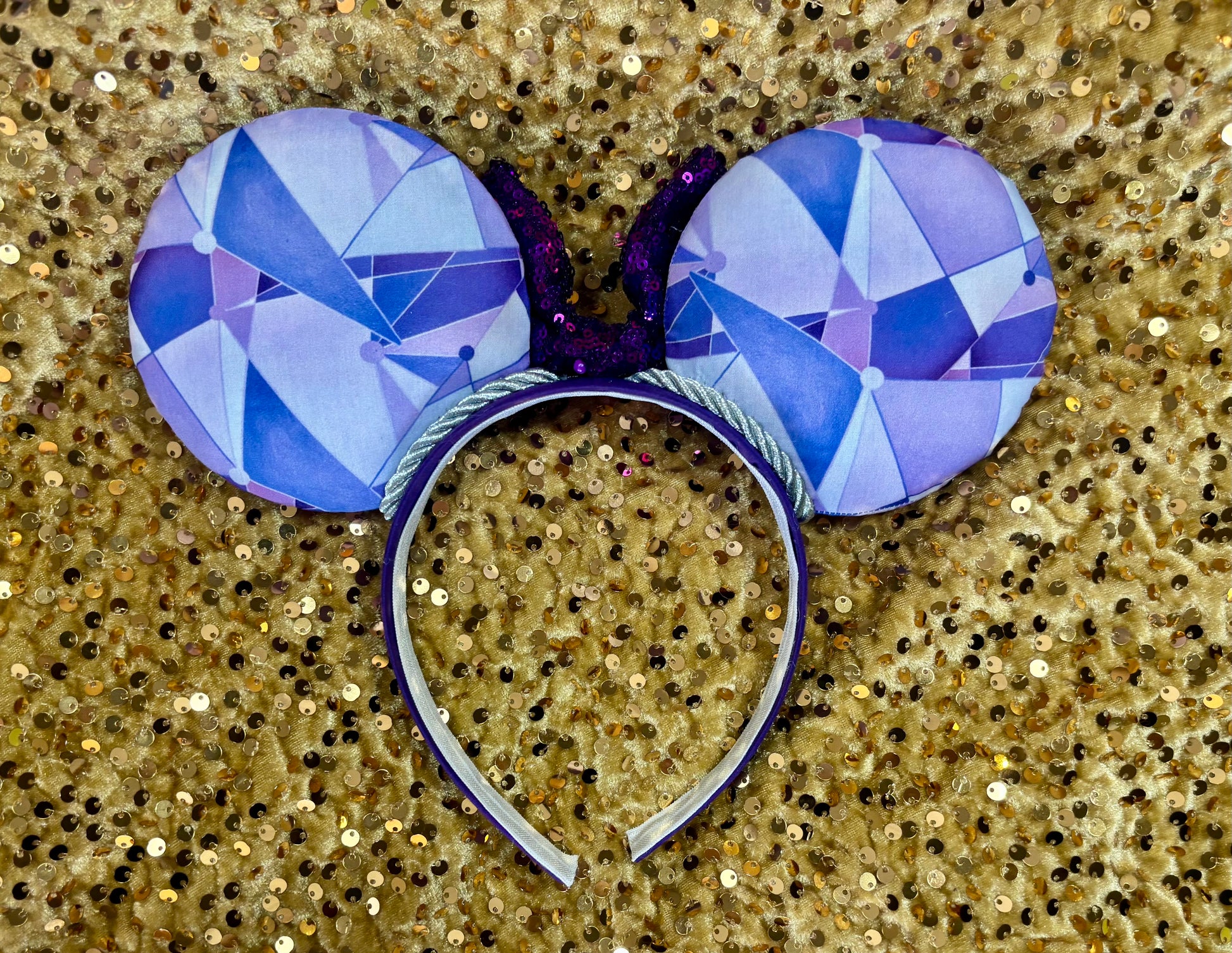 Expertly handcrafted Purple Wall Mouse Ears with fabric on both sides, silver twisted trim, and a purple sequin bow. Handmade and ready to ship, these ears come with the option to customize the bow color. Just write in notes what color bow you want and I’ll happily attach it. The headband has purple fabric and is designed for universal fit and extra durability. Show your love for Disney with these one-of-a-kind ears. These are handmade ready to ship items. The ears are sewn and then hot glued to headband. I then hand sew the ears to the headband for extra protection! Then I attach twisted trim along inner ears. Headbands are universal sized and fit most.
