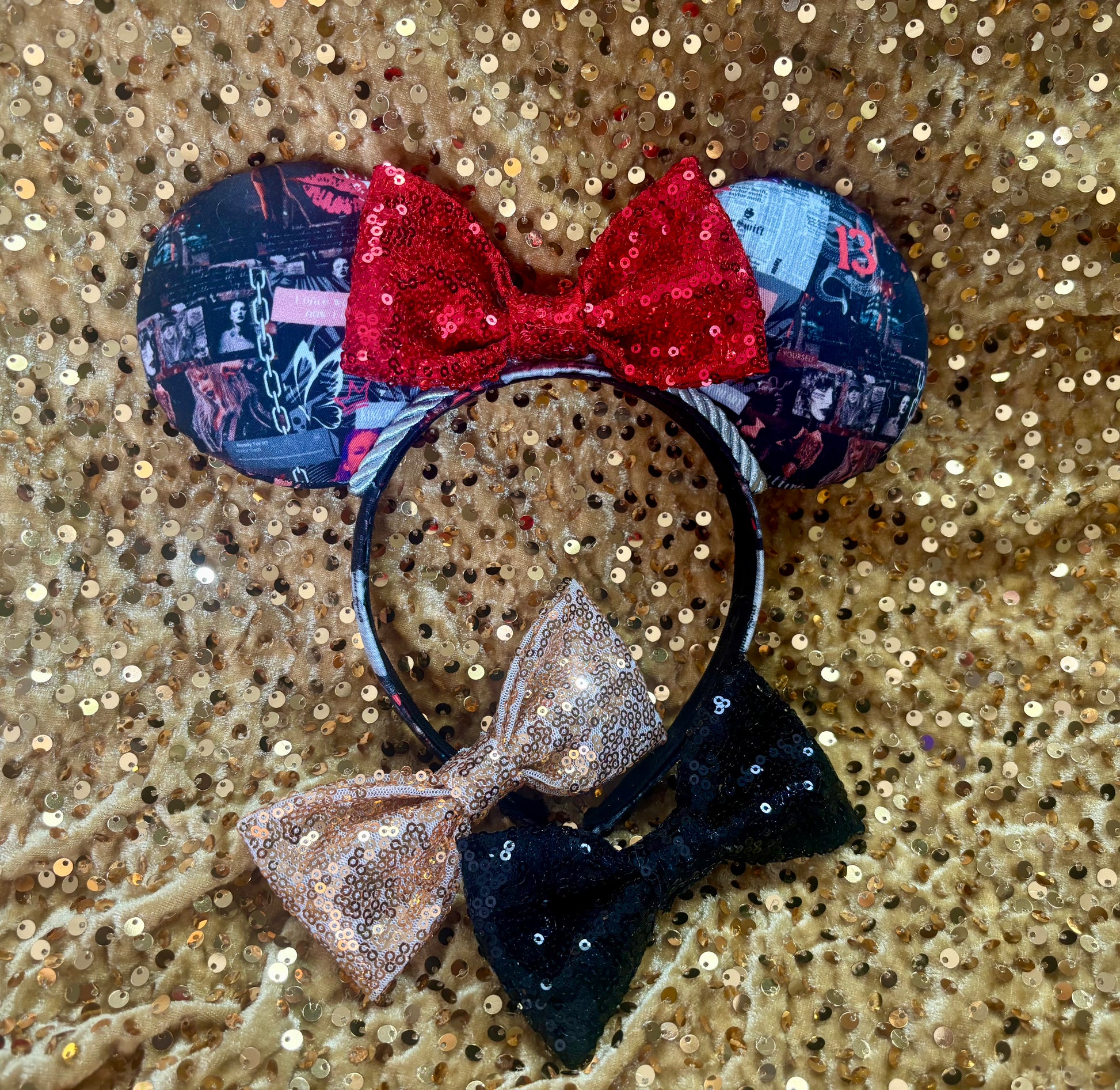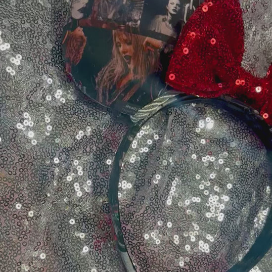 These bold Taylor Swift Getaway Car-inspired mouse ears are made for Swifties who live for the Rep era. Featuring Reputation-inspired fabric, silver twisted trim, and a striking red sequin bow — these ears are ready for your next Disney adventure or Eras Tour moment.