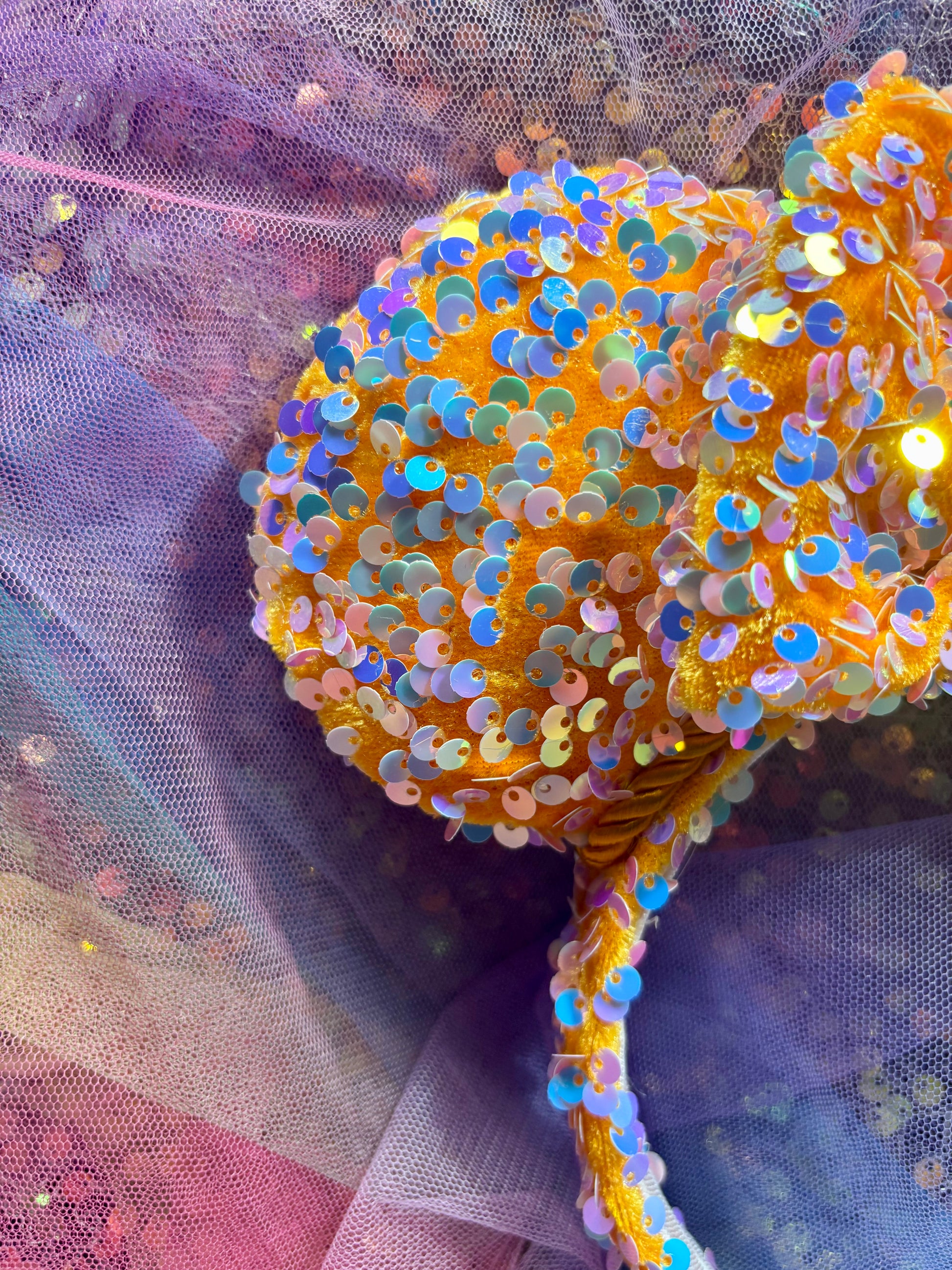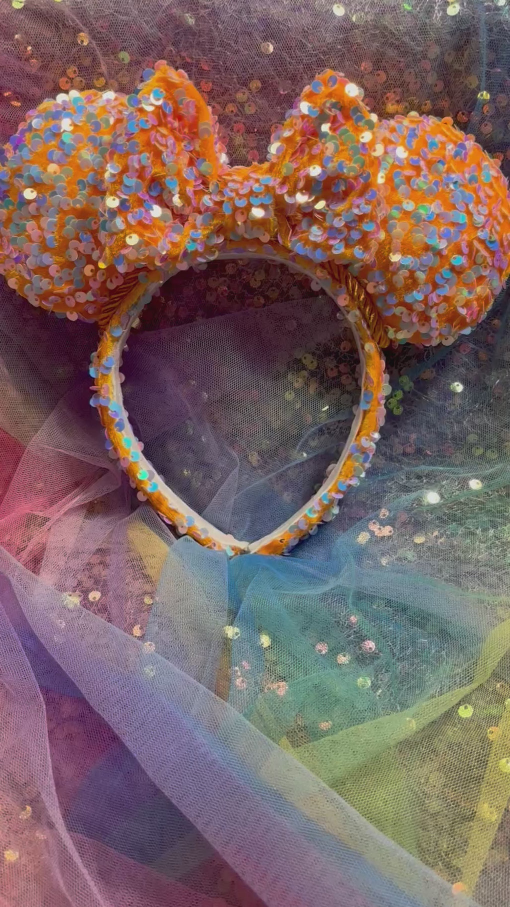 Step into your Showgirl Era — these orange velvet and mint sequin mouse ears are handcrafted for fans who love bold glamour and eye-catching color combinations. Luxe materials, premium construction, and a coordinating bow make these a standout accessory for the parks or any concert celebration.