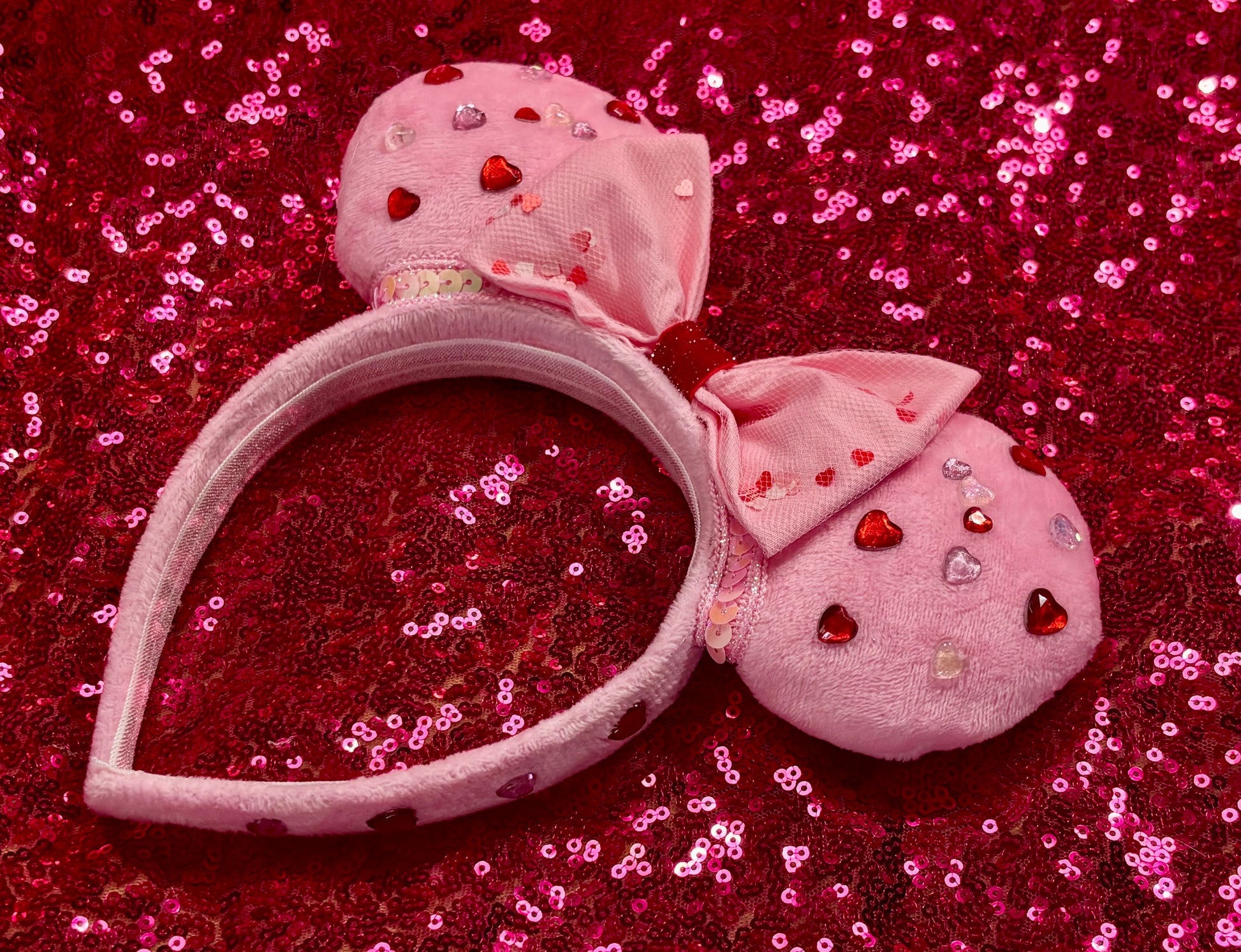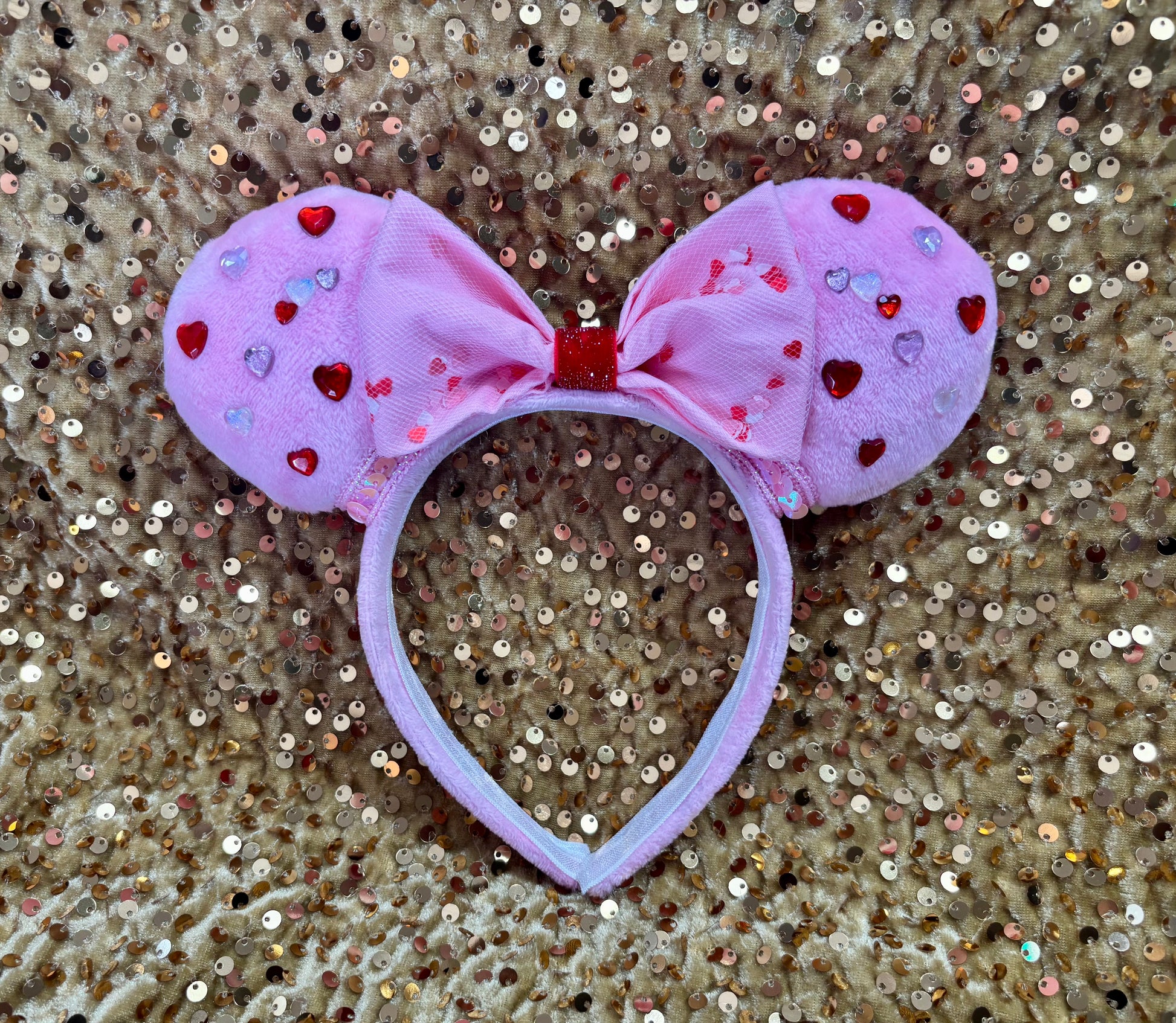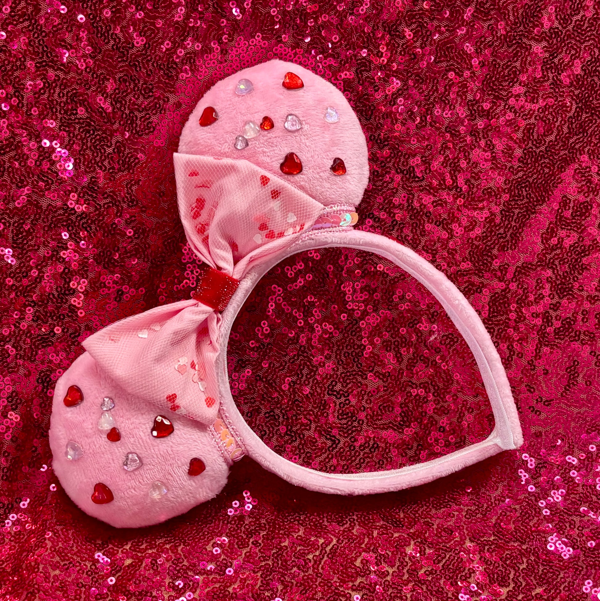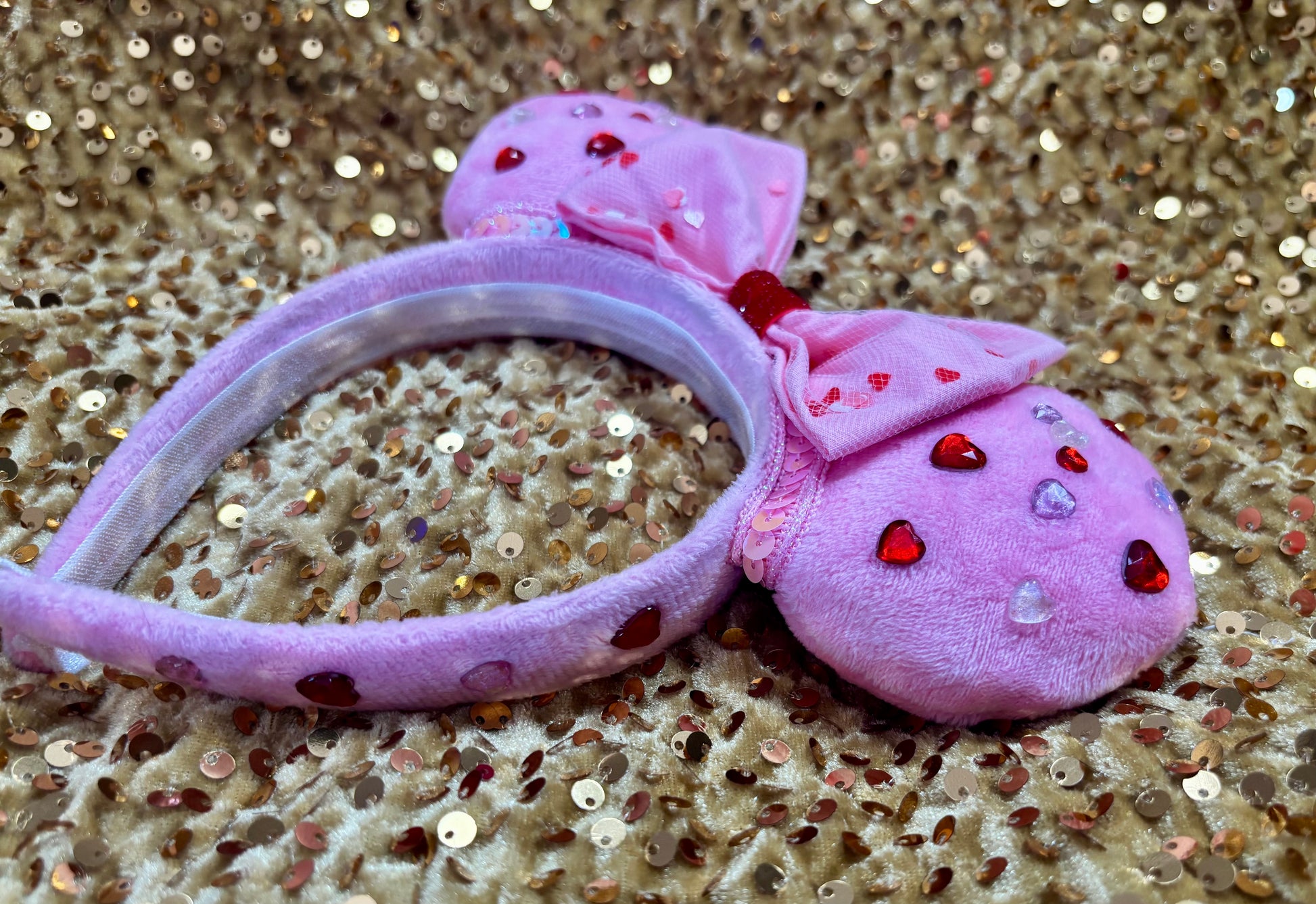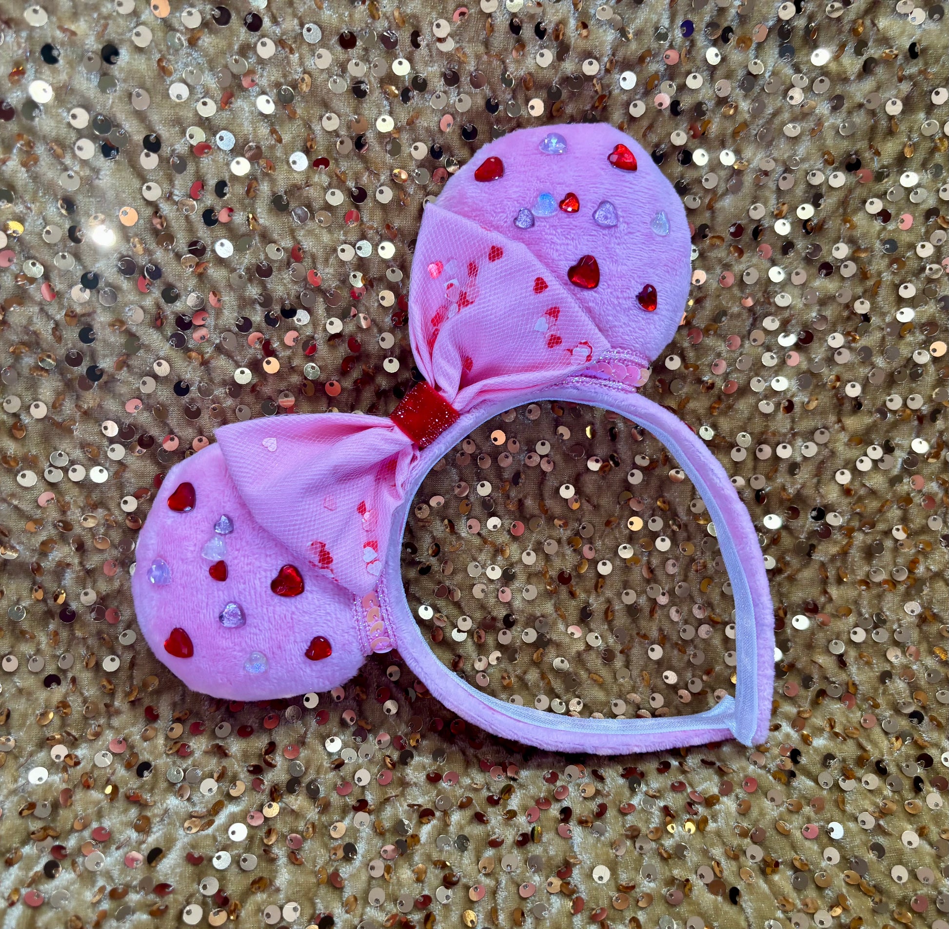 Soft Pink Fabric is on ears front and back and on the headband as well with elastic on inner headband. Pink rhinestone trim along inner ears with a pink bow that has little heart confetti inside. Gemstones are secured on with strong gemstone glue. The hearts also are along the headband sides as well. Made and ready to ship with free shipping. The headbands are universal sized and fit most. The ears are sewn, hot glued to headband and then handstitched to headband for extra protection!!! 🫶🏻