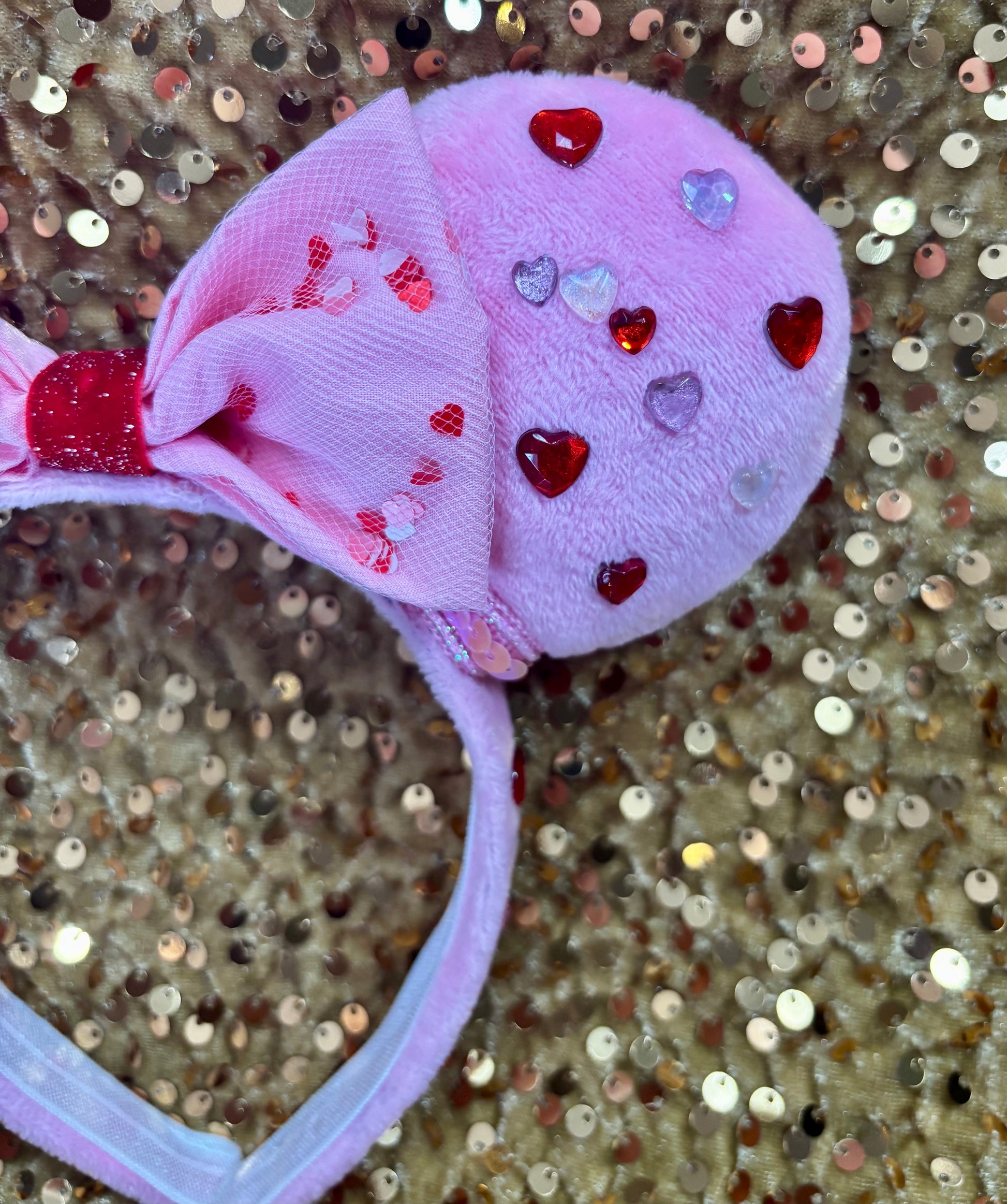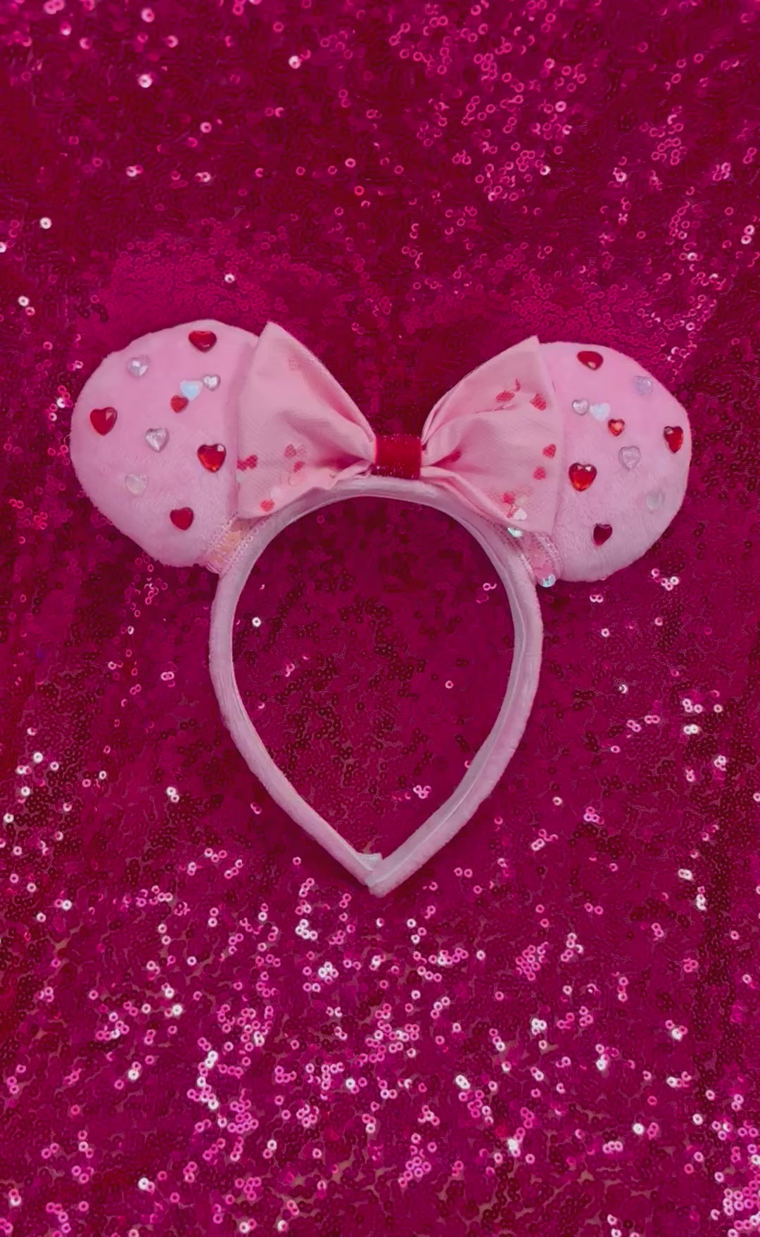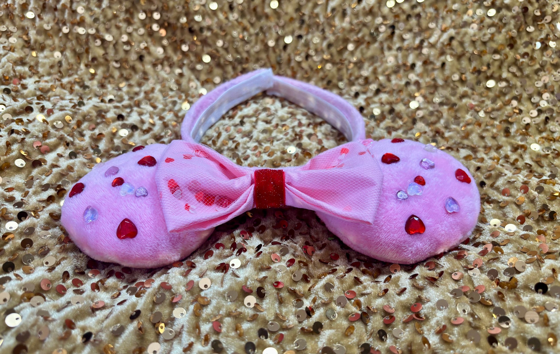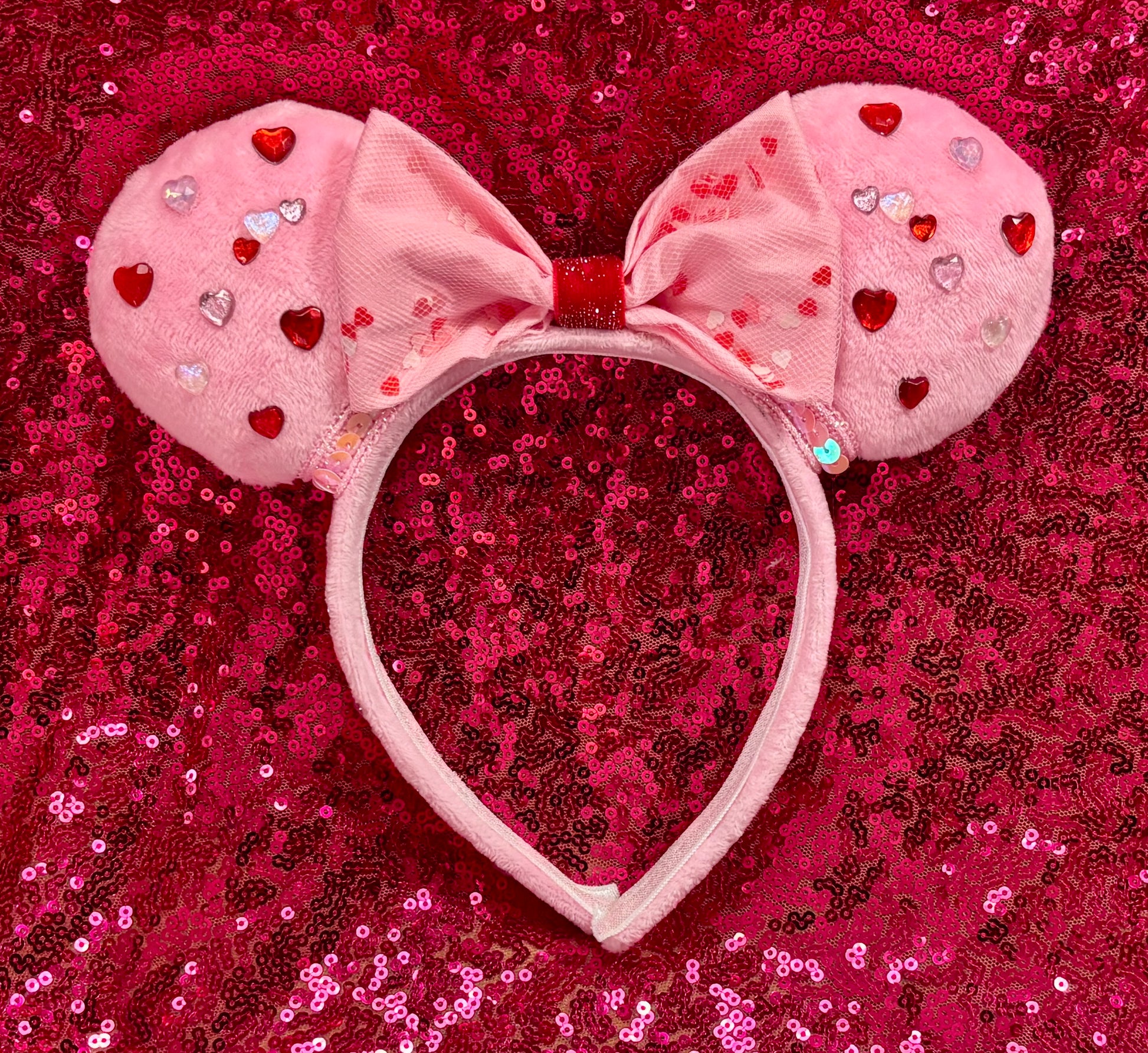 Soft Pink Fabric is on ears front and back and on the headband as well with elastic on inner headband. Pink rhinestone trim along inner ears with a pink bow that has little heart confetti inside. Gemstones are secured on with strong gemstone glue. The hearts also are along the headband sides as well. Made and ready to ship with free shipping. The headbands are universal sized and fit most. The ears are sewn, hot glued to headband and then handstitched to headband for extra protection!!! 🫶🏻
