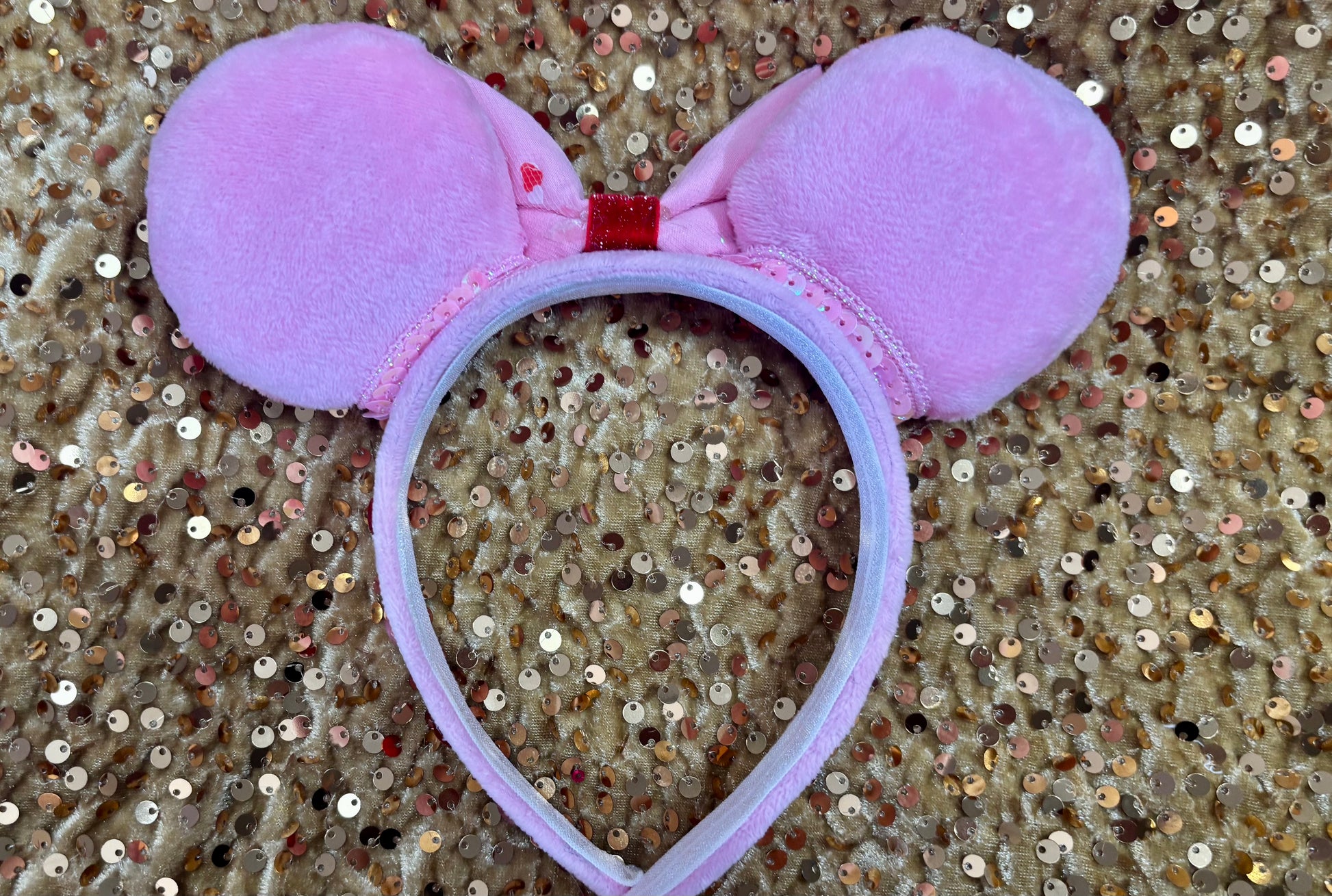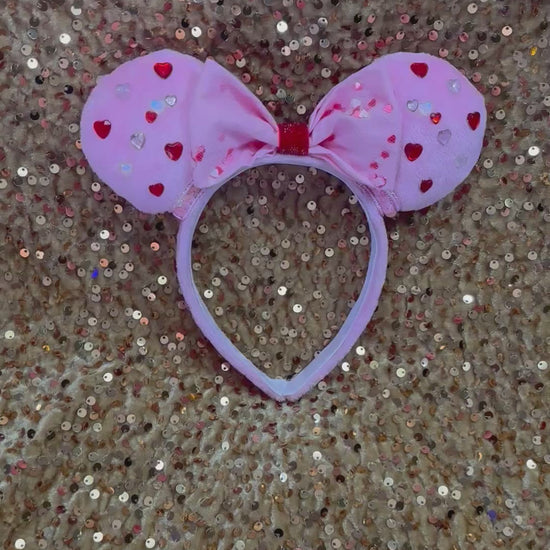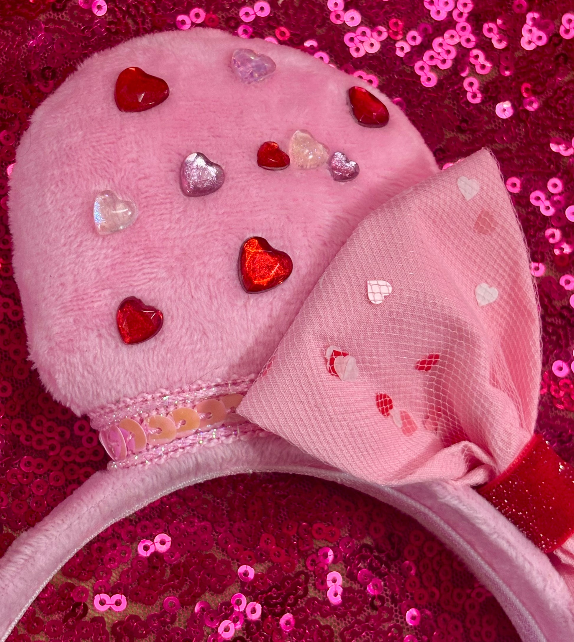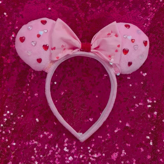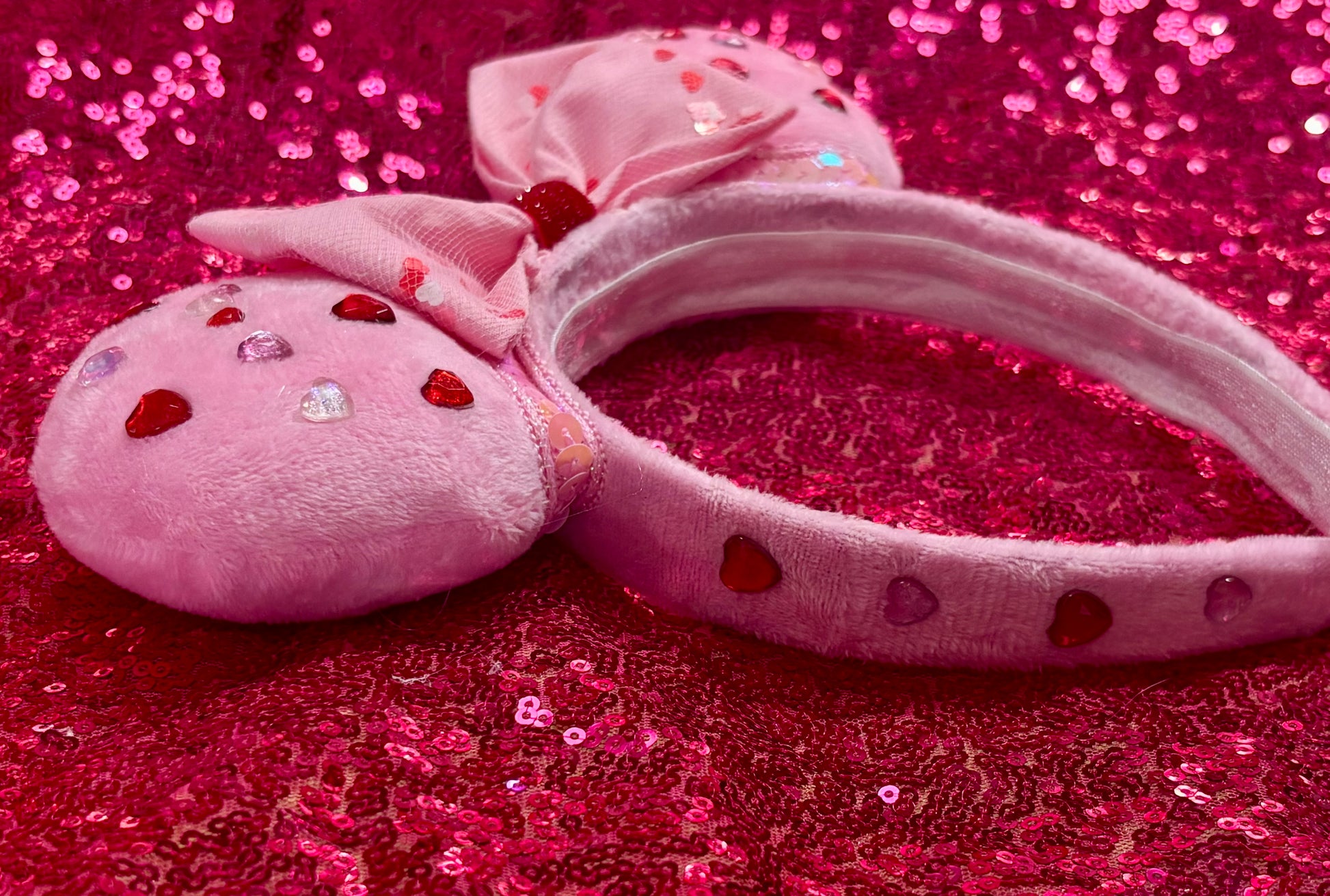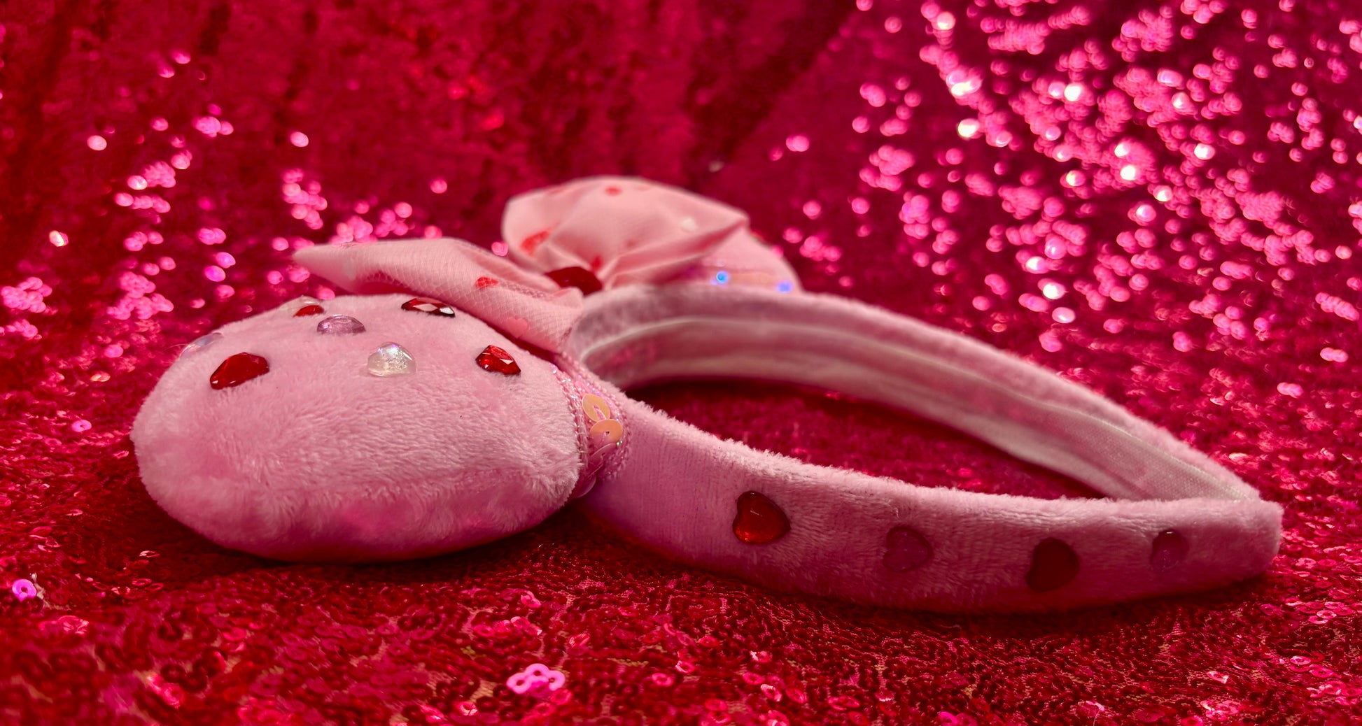 Soft Pink Fabric is on ears front and back and on the headband as well with elastic on inner headband. Pink rhinestone trim along inner ears with a pink bow that has little heart confetti inside. Gemstones are secured on with strong gemstone glue. The hearts also are along the headband sides as well. Made and ready to ship with free shipping. The headbands are universal sized and fit most. The ears are sewn, hot glued to headband and then handstitched to headband for extra protection!!! 🫶🏻