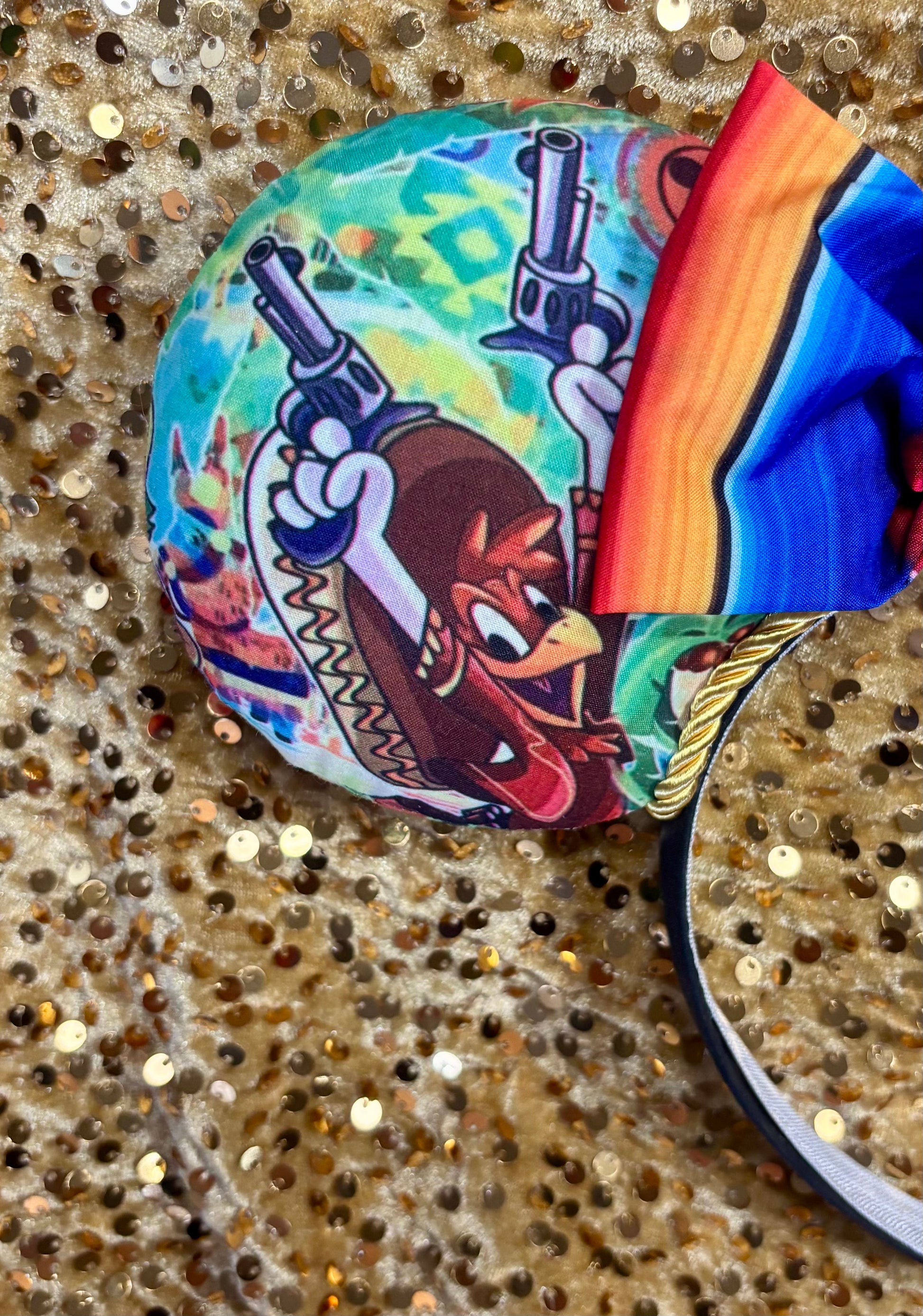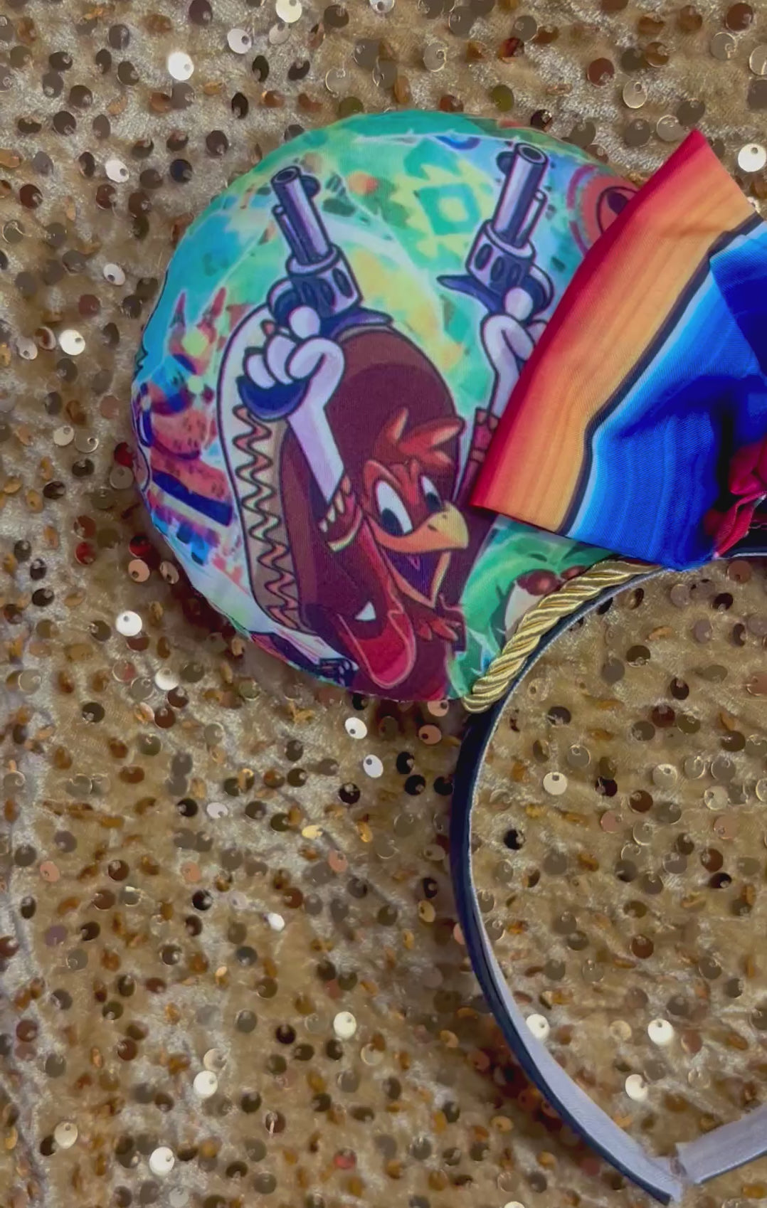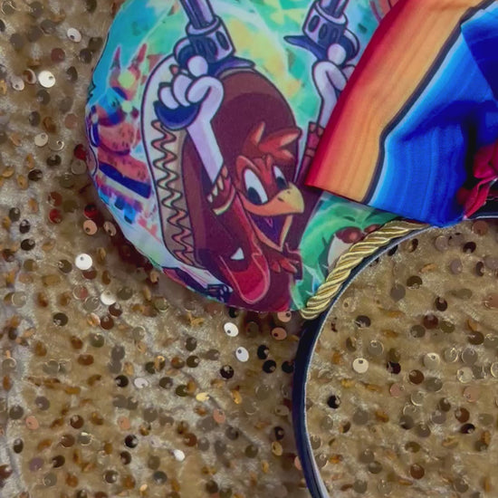 Celebrate the Three Caballeros with these vibrant handmade mouse ears! Perfect for EPCOT’s Mexico Pavilion visits, these premium ears feature colorful Three Caballeros fabric on both front and back, iridescent sequin accents, and twisted trim — a must for fans of Jose, Panchito, and Donald!