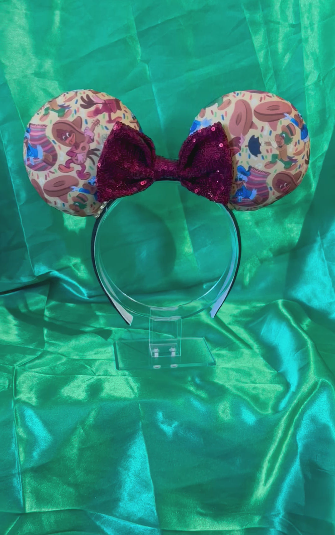 These festive 3 Caballeros Mouse Ears celebrate Donald Duck and his amigos Panchito and José Carioca! Featuring vibrant fabric inspired by the classic Disney film and attraction, these ears are perfect for Epcot's Mexico Pavilion visits and fans of this beloved trio.