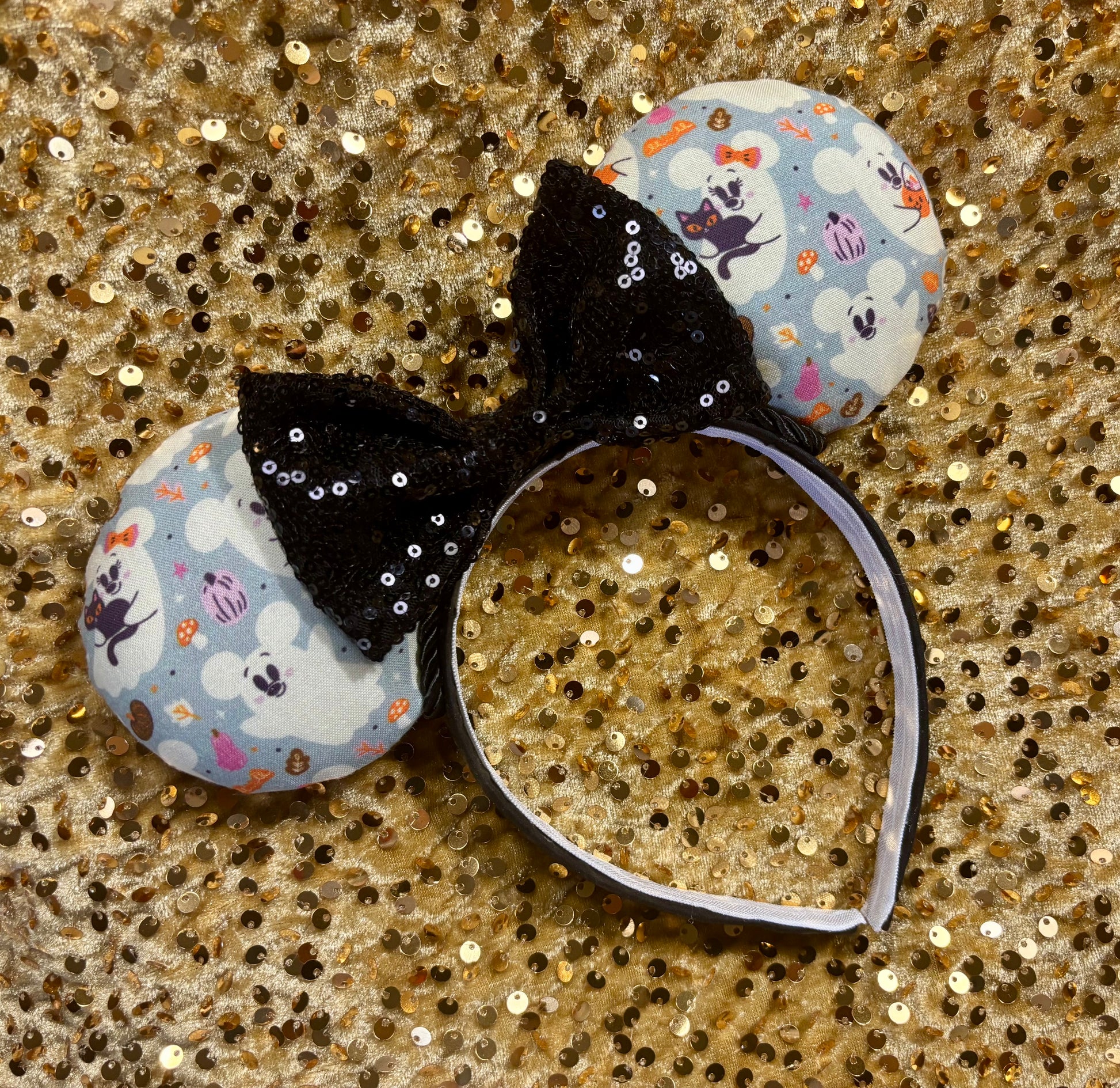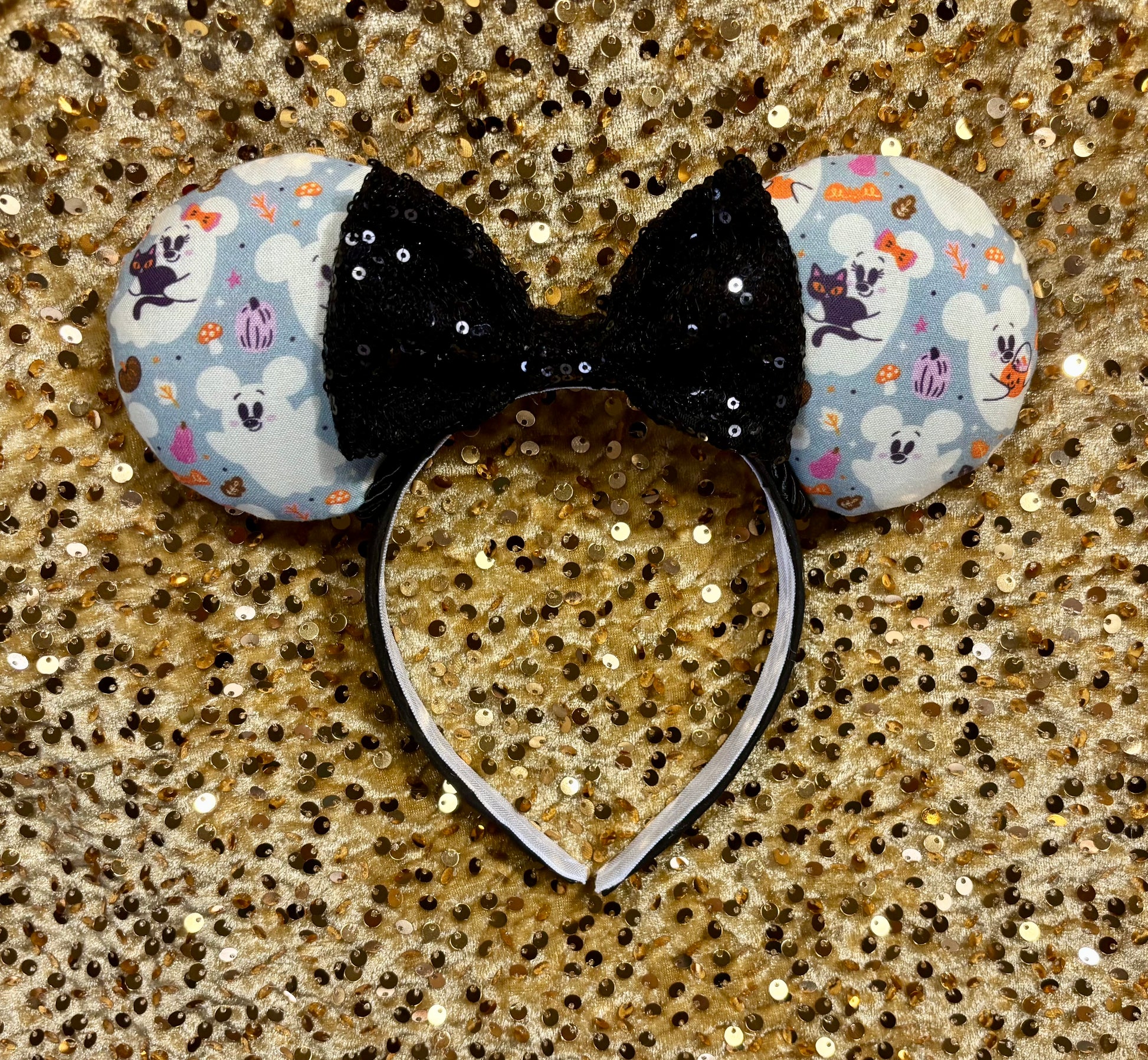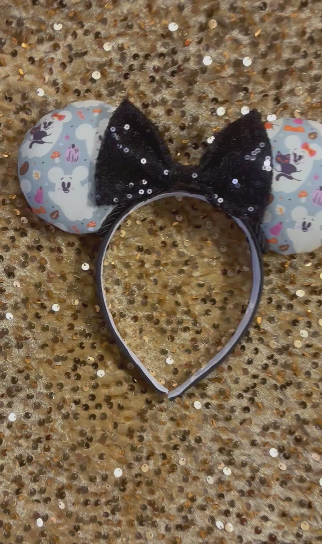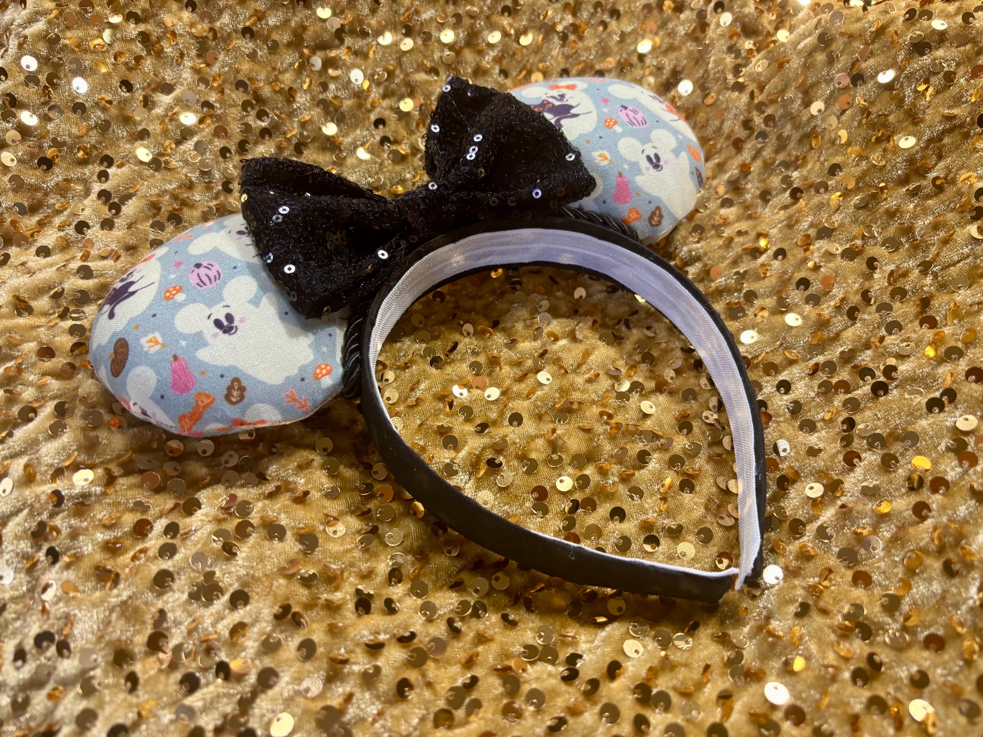 Fabric is on ears front and back. Headband has black fabric. Black Twisted trim along inner ears with a black sequin bow. If you’d prefer a different color, I have almost every color in sequin bows along with the new white waffle print. Please write in notes what bow you want or message me and I’ll attach the one you want. If not I attach the white waffle bow. Elastic is on inner headband. The ears are sewn and filled with batting then hot glue to headband and then hand stitched for extra protection. No floppy ears here!!!! The headband is universal sized and fits most. Made and ready to ship!