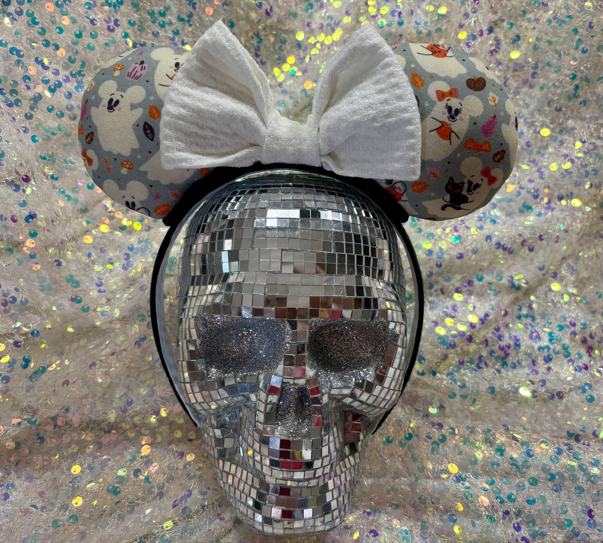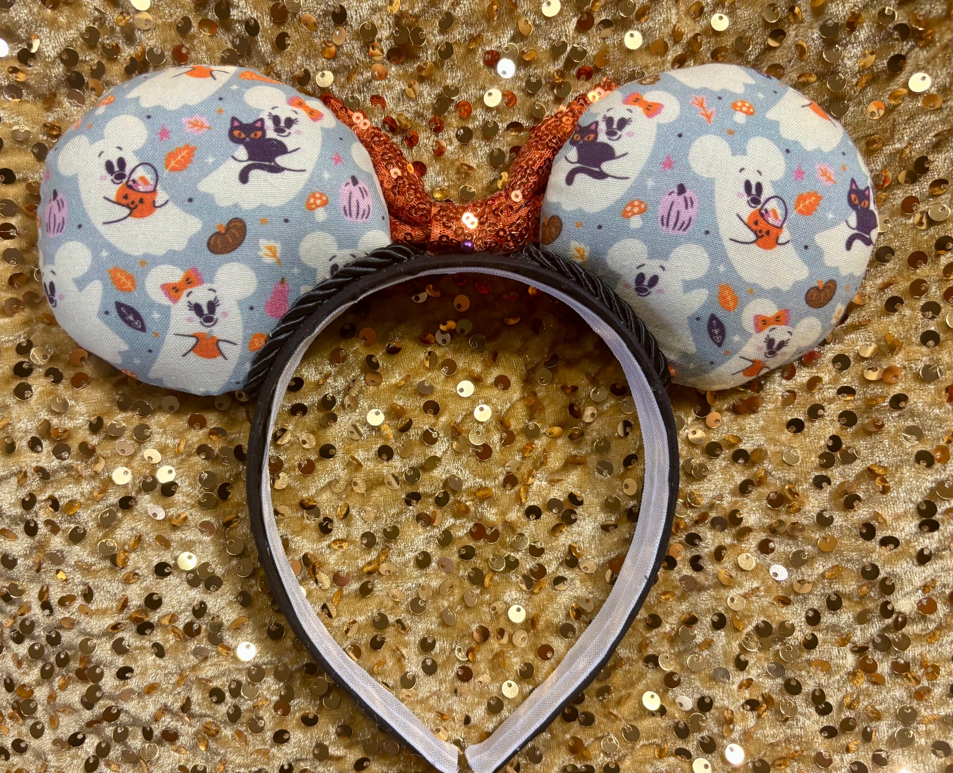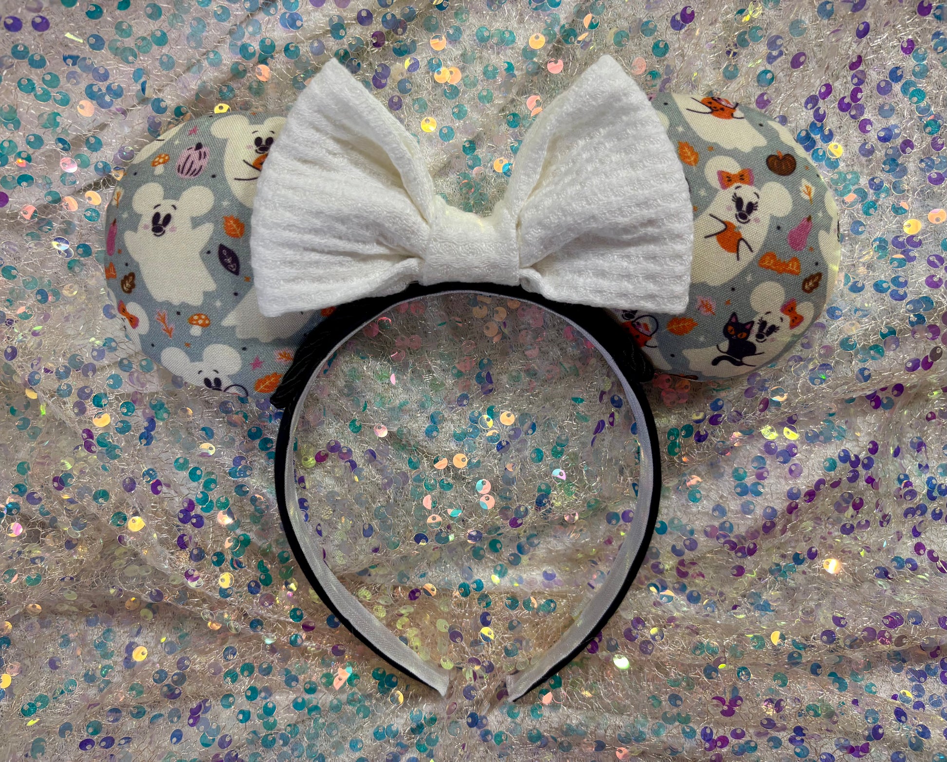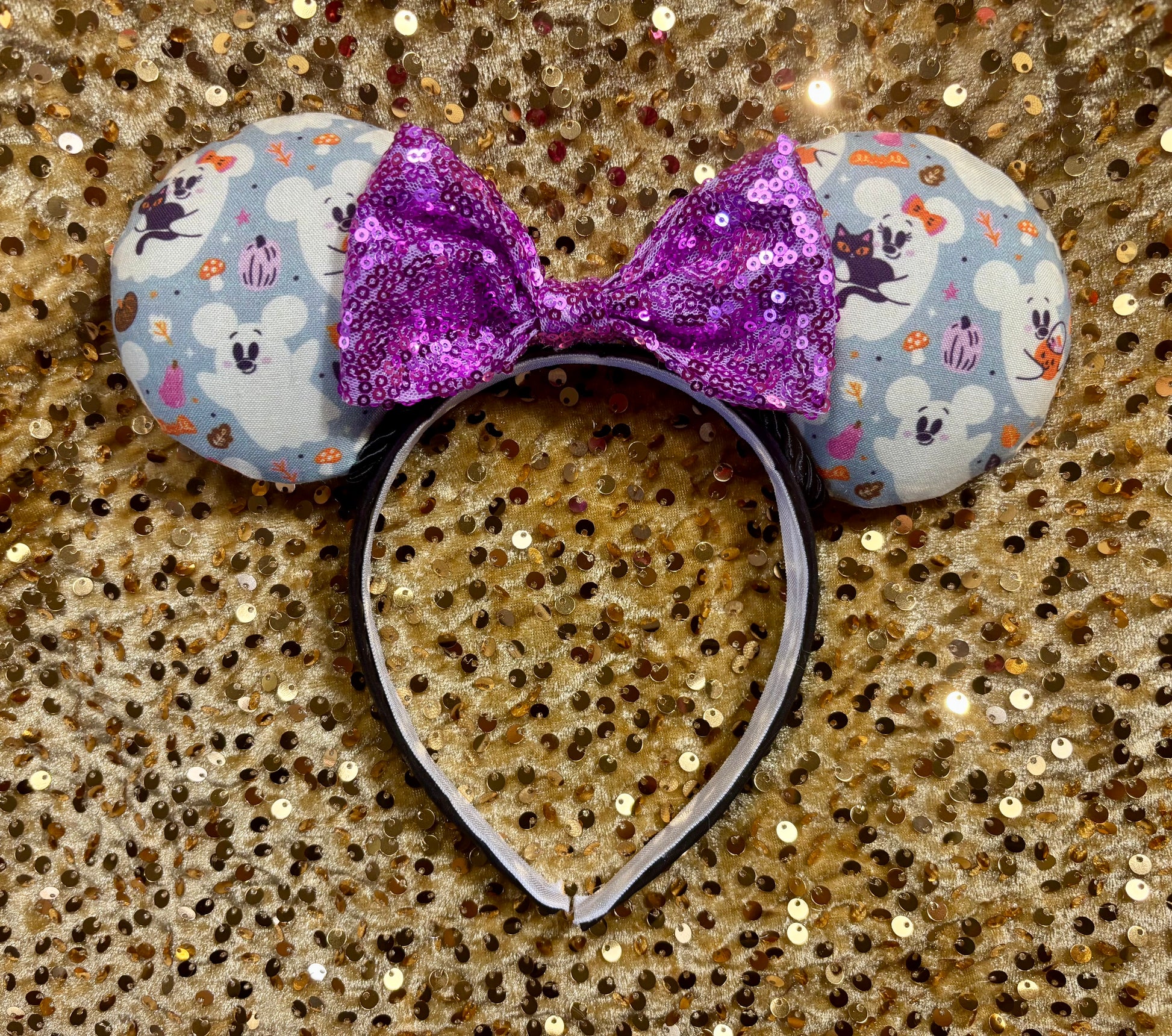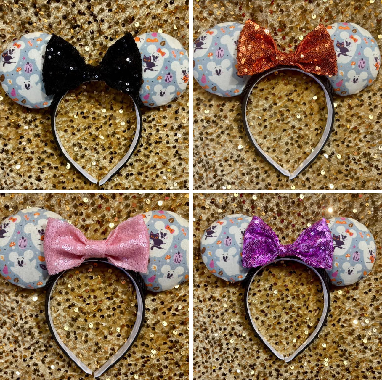 Fabric is on ears front and back. Headband has black fabric. Black Twisted trim along inner ears with a black sequin bow. If you’d prefer a different color, I have almost every color in sequin bows along with the new white waffle print. Please write in notes what bow you want or message me and I’ll attach the one you want. If not I attach the white waffle bow. Elastic is on inner headband. The ears are sewn and filled with batting then hot glue to headband and then hand stitched for extra protection. No floppy ears here!!!! The headband is universal sized and fits most. Made and ready to ship!