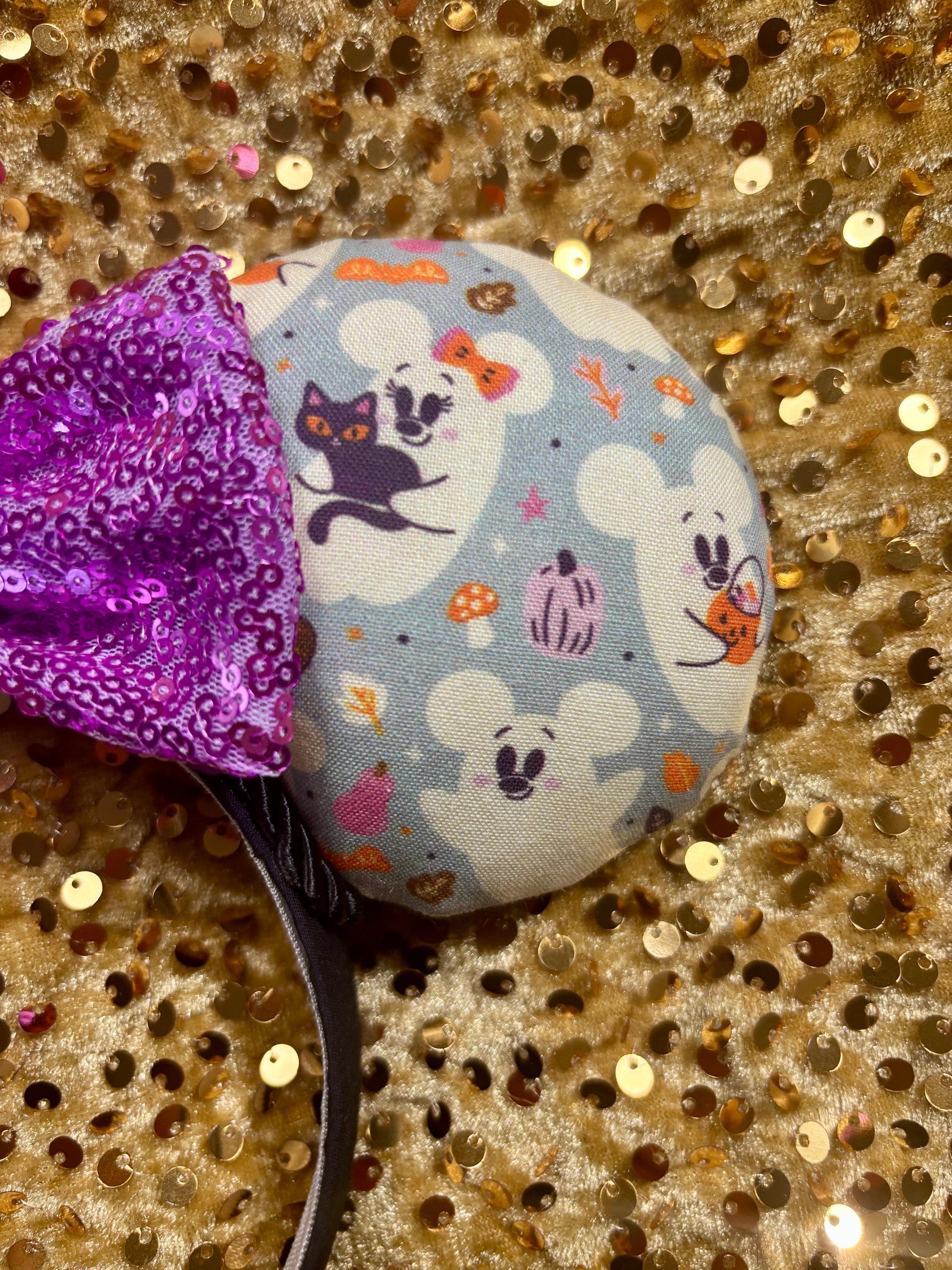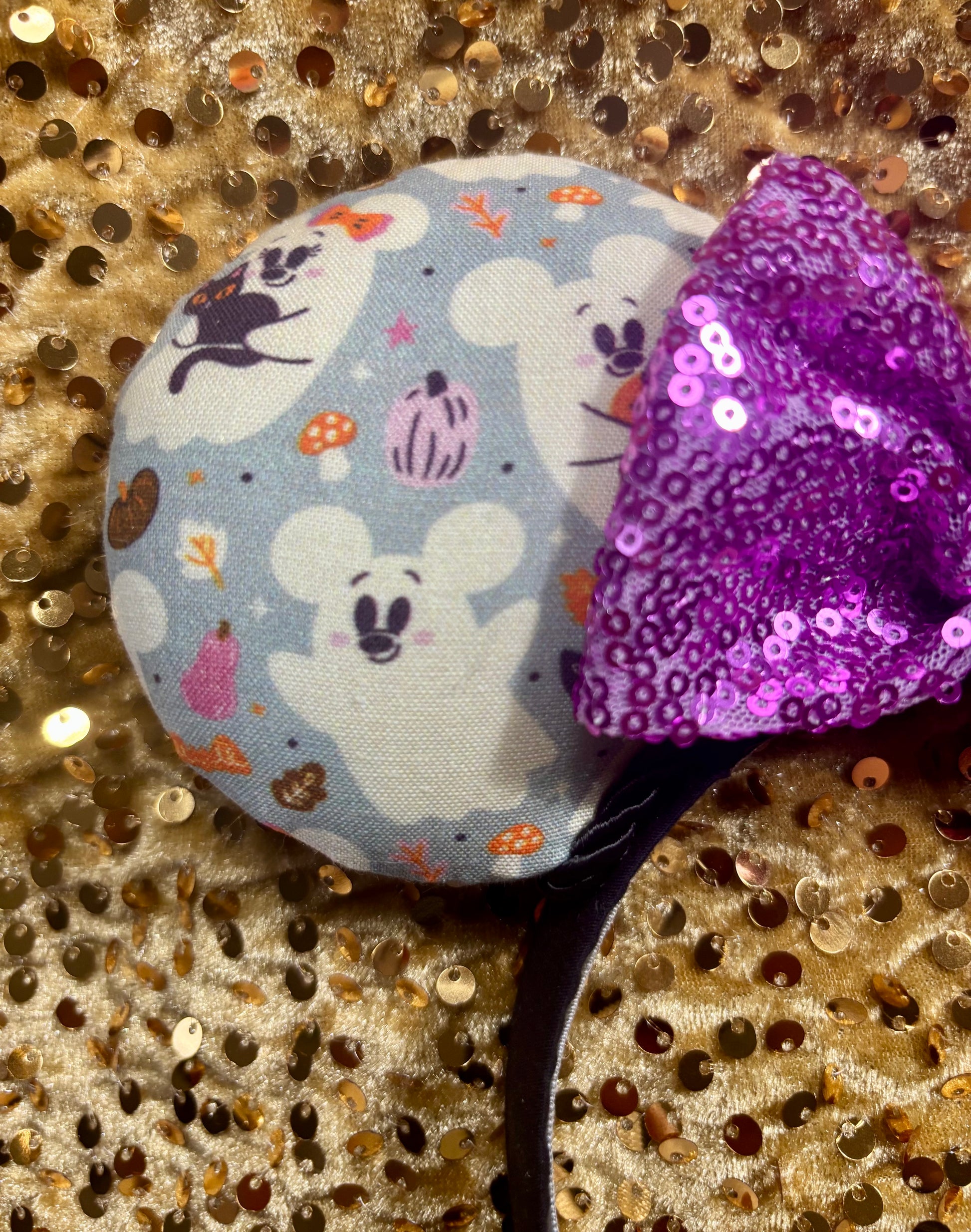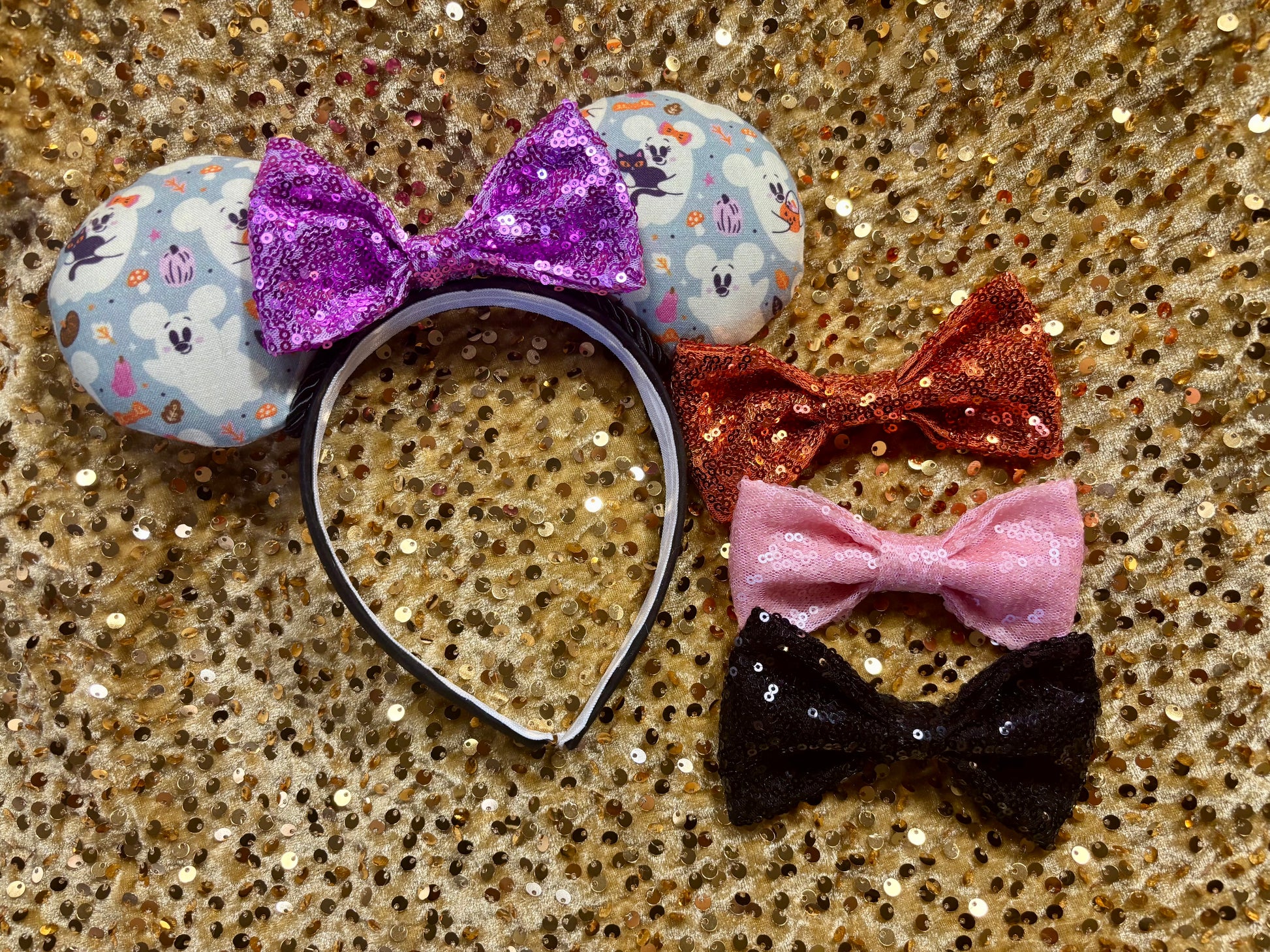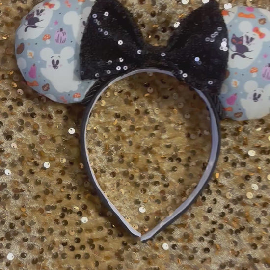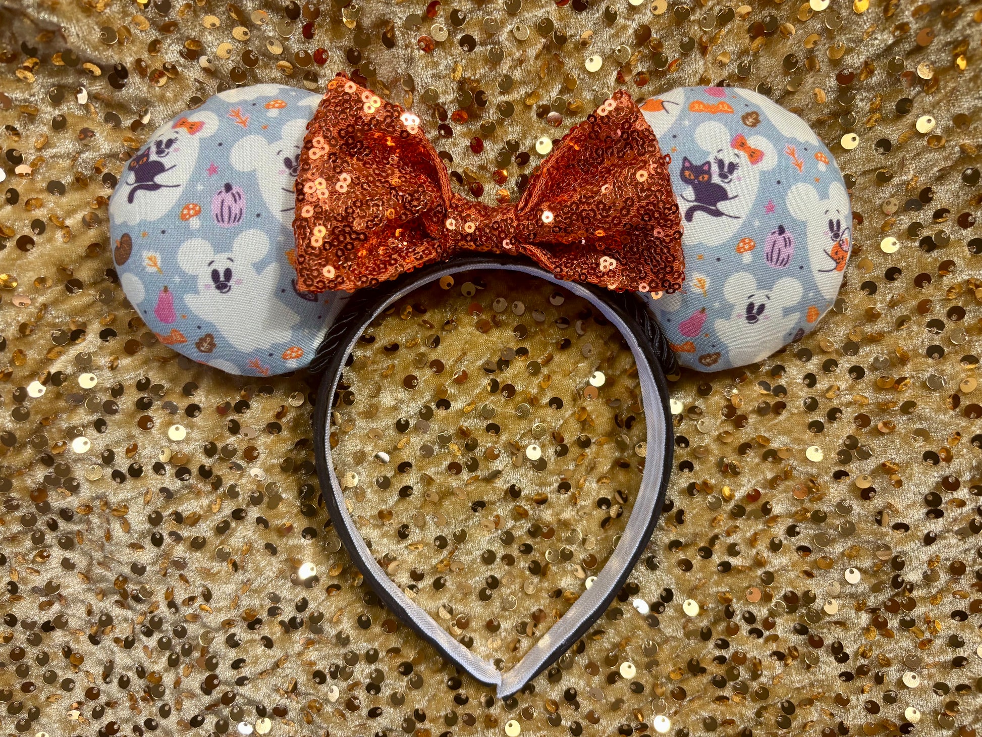 Fabric is on ears front and back. Headband has black fabric. Black Twisted trim along inner ears with a black sequin bow. If you’d prefer a different color, I have almost every color in sequin bows along with the new white waffle print. Please write in notes what bow you want or message me and I’ll attach the one you want. If not I attach the white waffle bow. Elastic is on inner headband. The ears are sewn and filled with batting then hot glue to headband and then hand stitched for extra protection. No floppy ears here!!!! The headband is universal sized and fits most. Made and ready to ship!