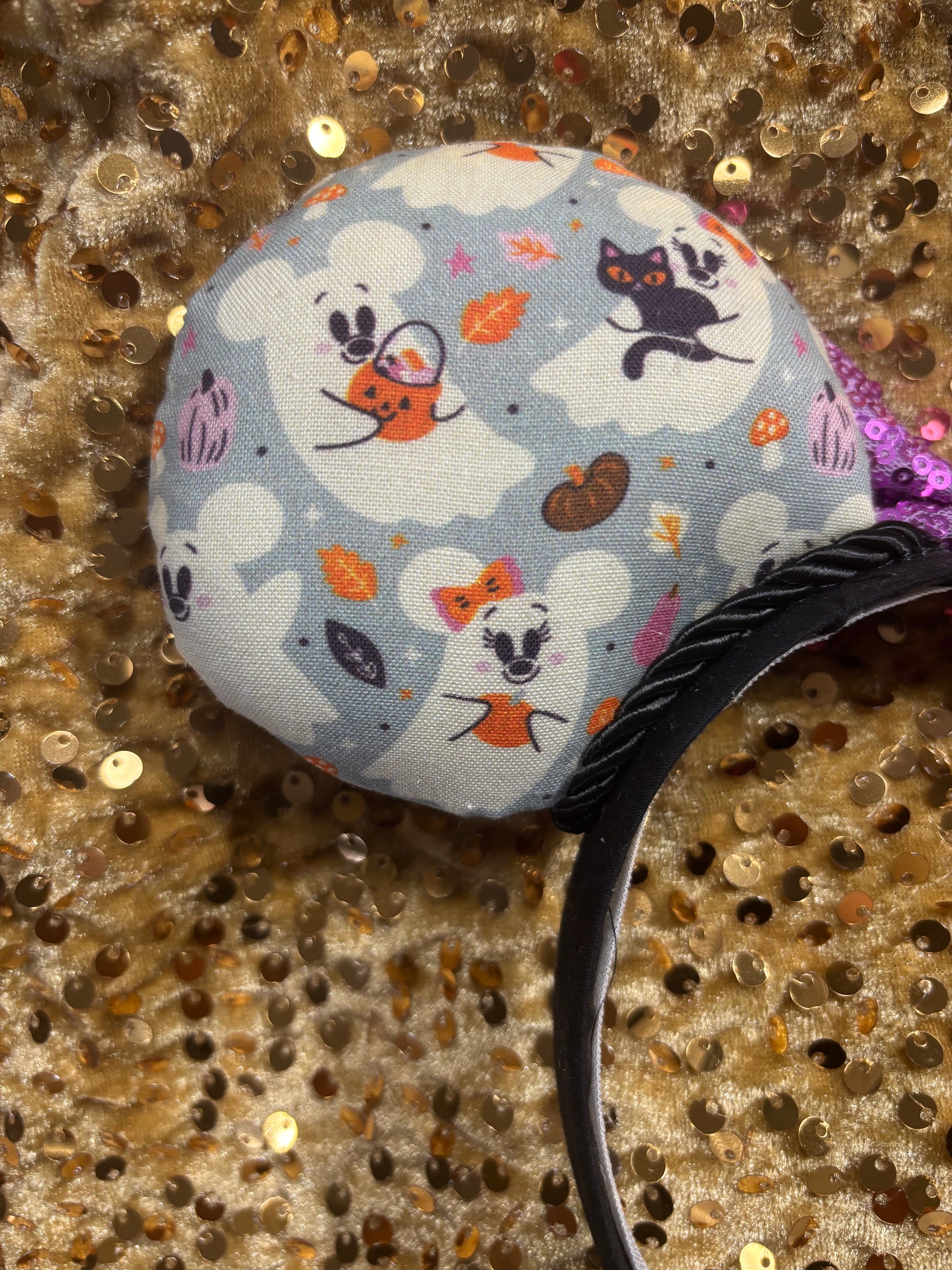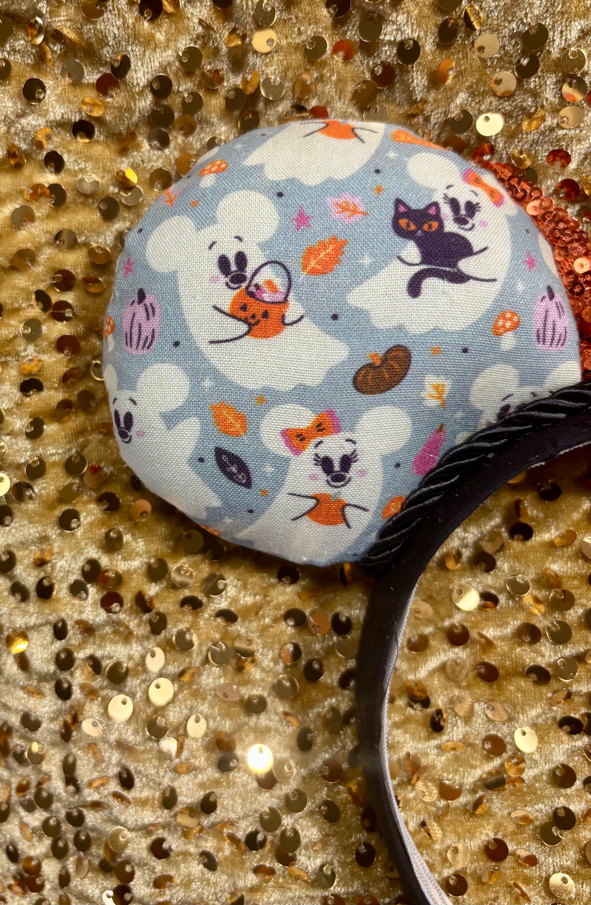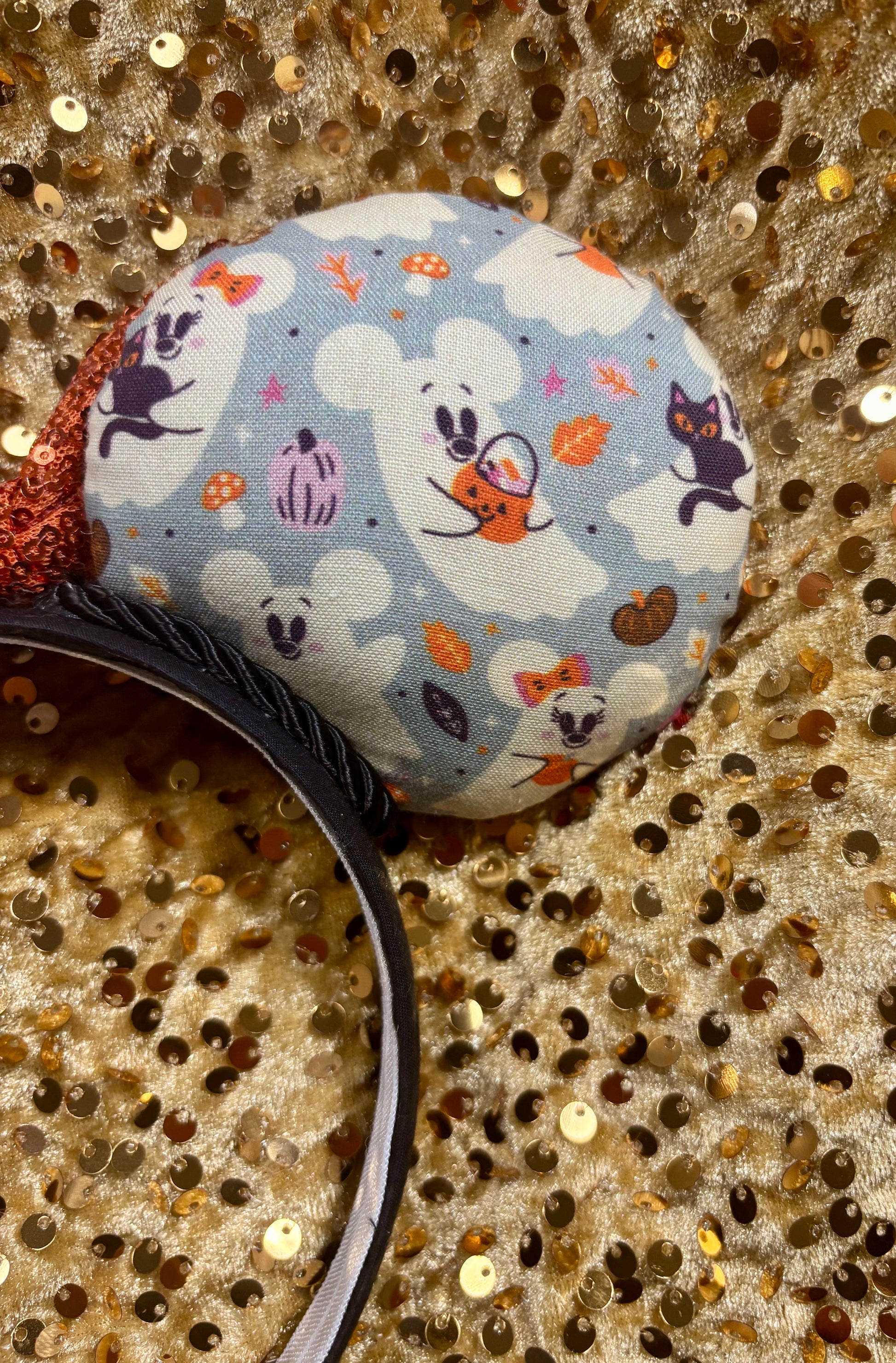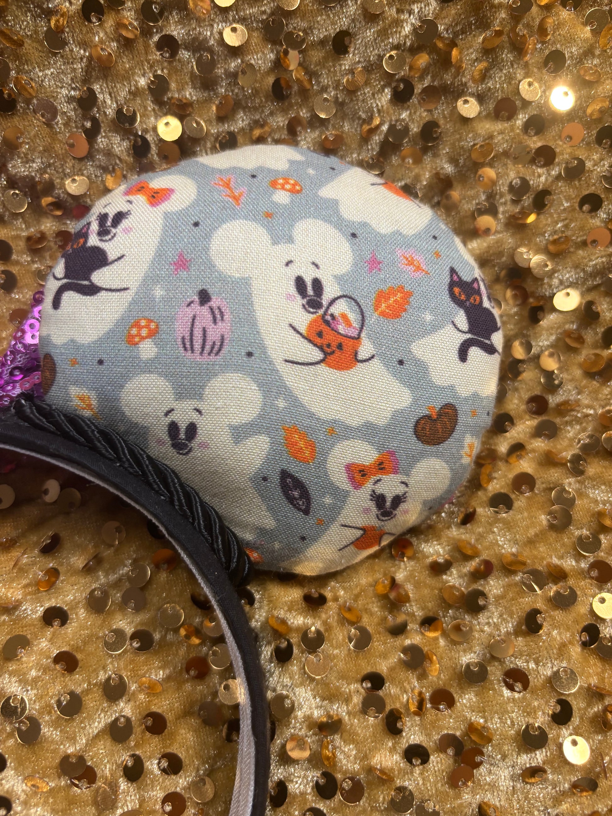 Fabric is on ears front and back. Headband has black fabric. Black Twisted trim along inner ears with a black sequin bow. If you’d prefer a different color, I have almost every color in sequin bows along with the new white waffle print. Please write in notes what bow you want or message me and I’ll attach the one you want. If not I attach the white waffle bow. Elastic is on inner headband. The ears are sewn and filled with batting then hot glue to headband and then hand stitched for extra protection. No floppy ears here!!!! The headband is universal sized and fits most. Made and ready to ship!