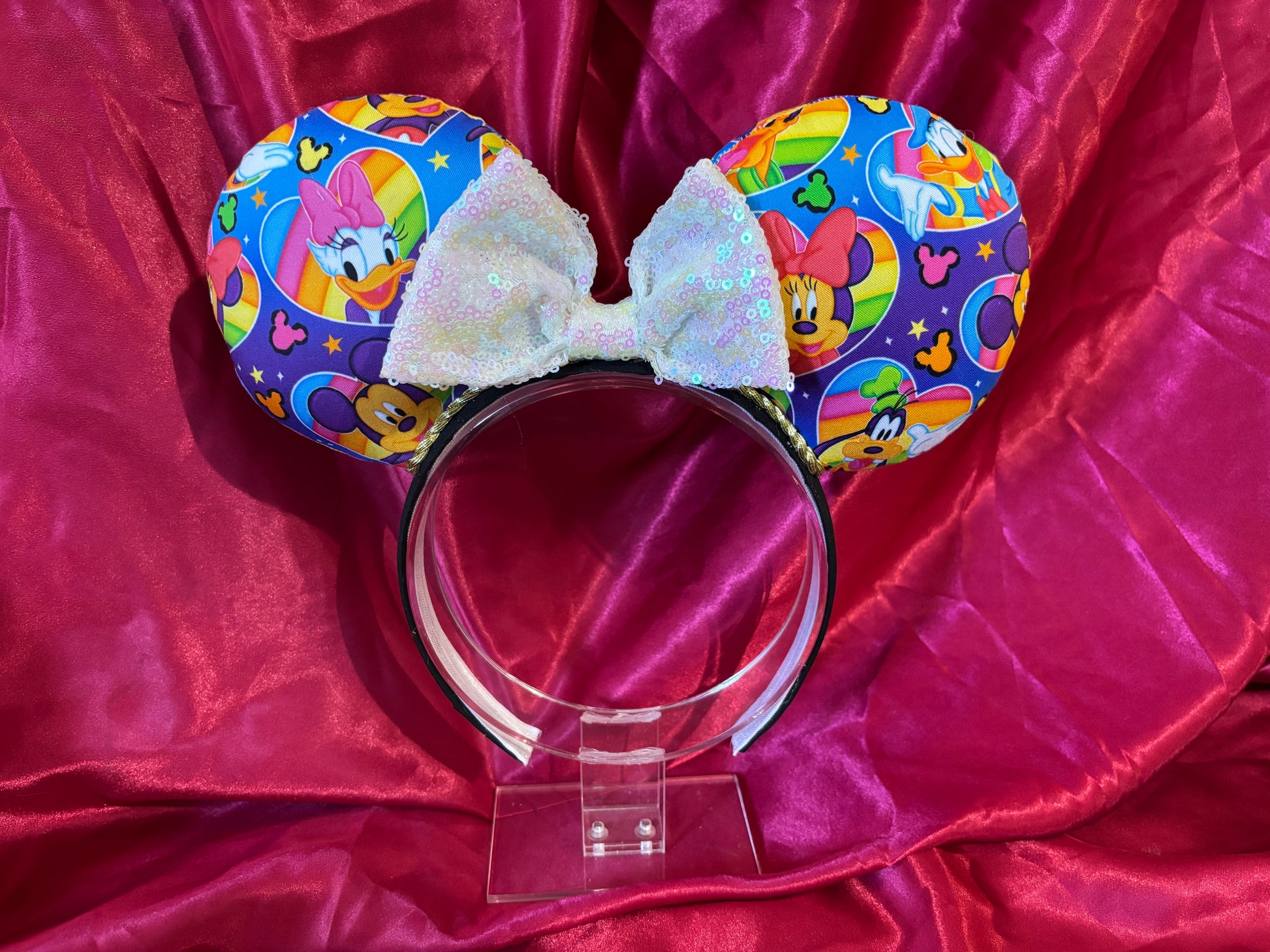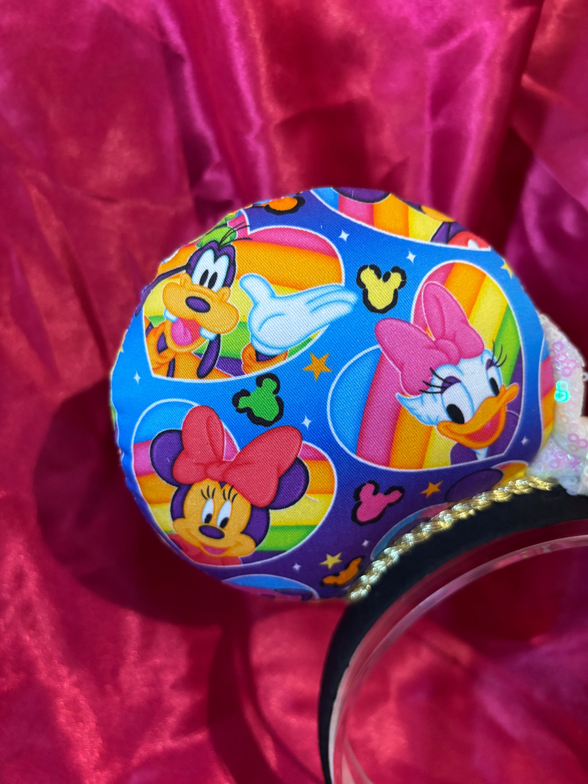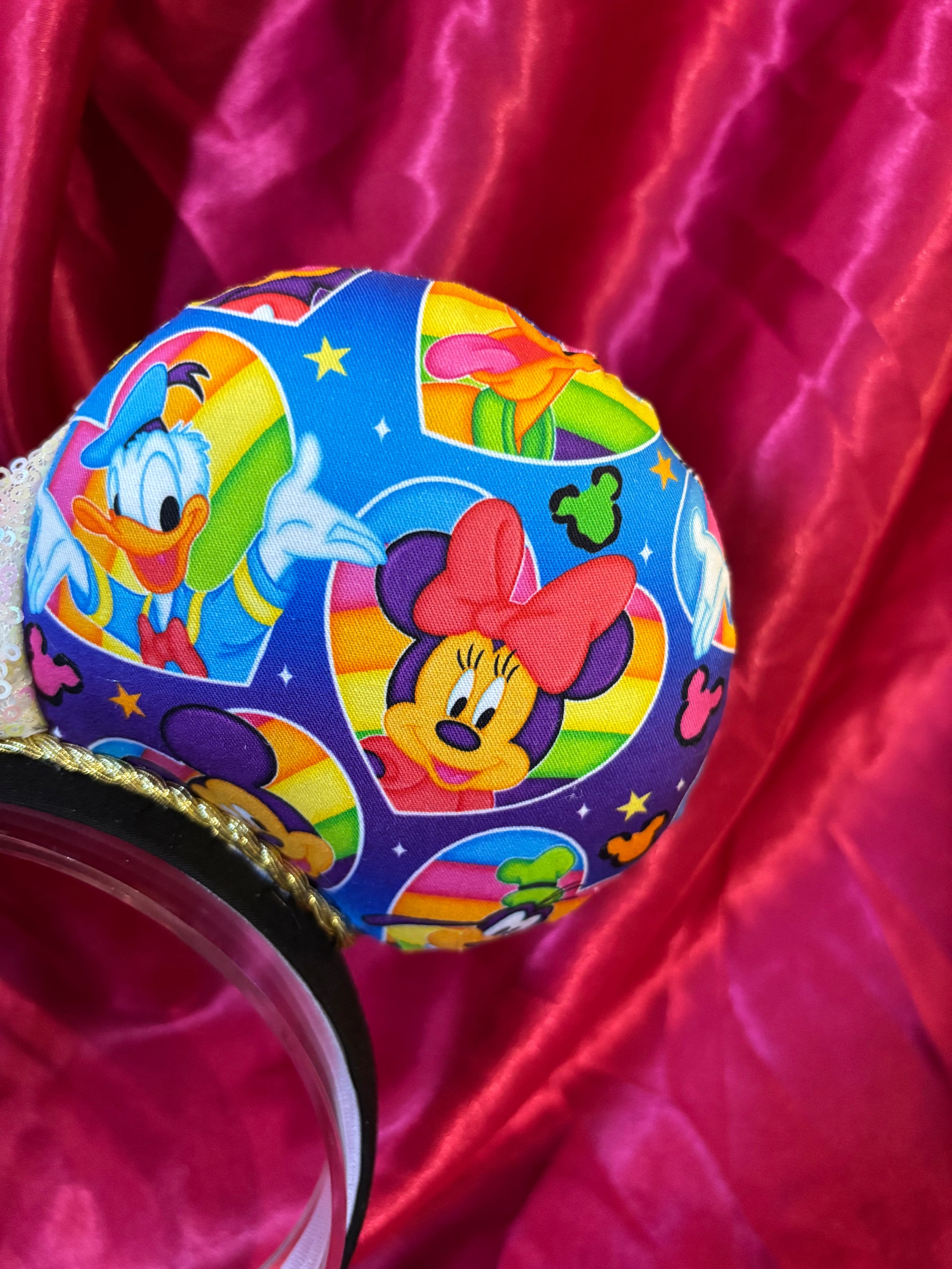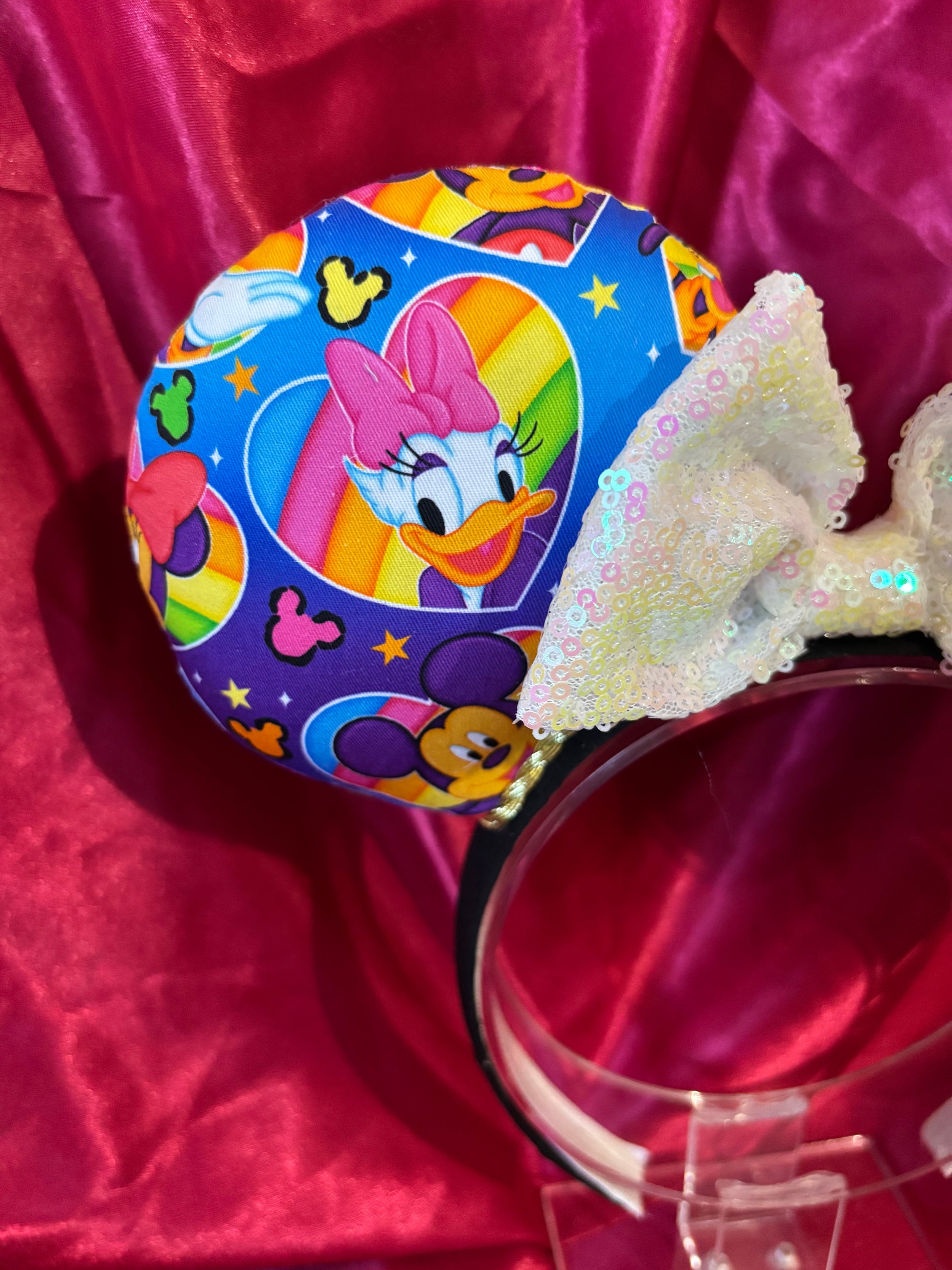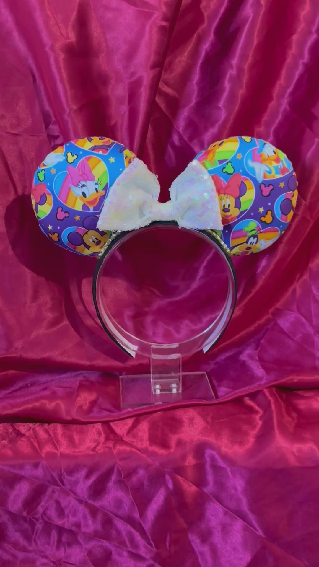 Fabric is on ears front and back. Golden Twisted trim along inner ears with a white iridescent sequin bow. If you’d prefer a different bow color, please write what color in notes or contact me. I’m happy to attach a different sequin bow and I have most colors. Fabric placement varies as these are collage print fabrics. So, each set made is unique. Ears are made and ready to ship. Elastic color on inner headband is white. These are handmade items. The ears are sewn and then hot glued to headband. I then hand sew the ears to the headband for extra protection! Then I attach twisted trim along inner ears. Headbands are universal sized and fit most.