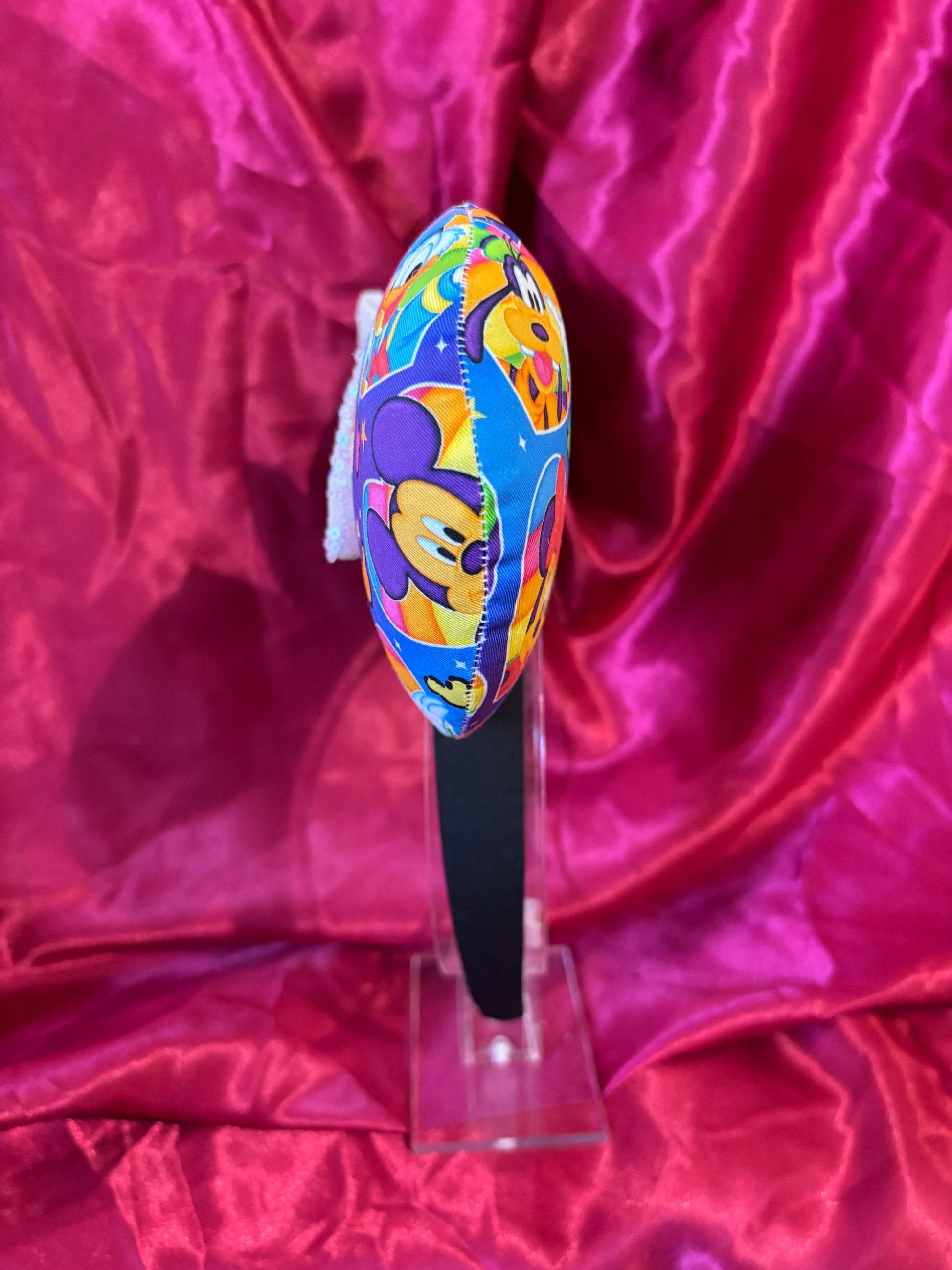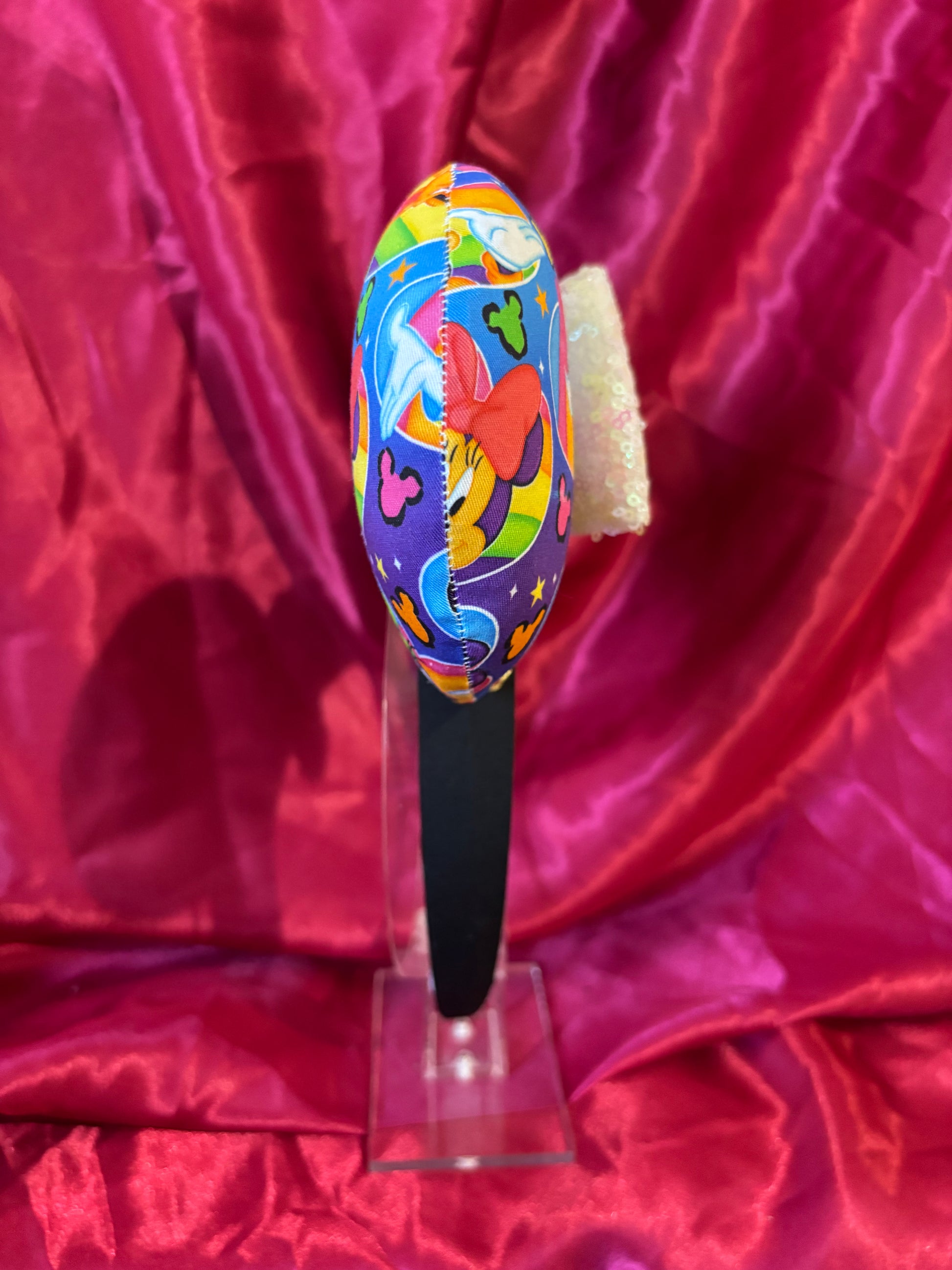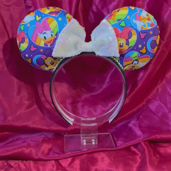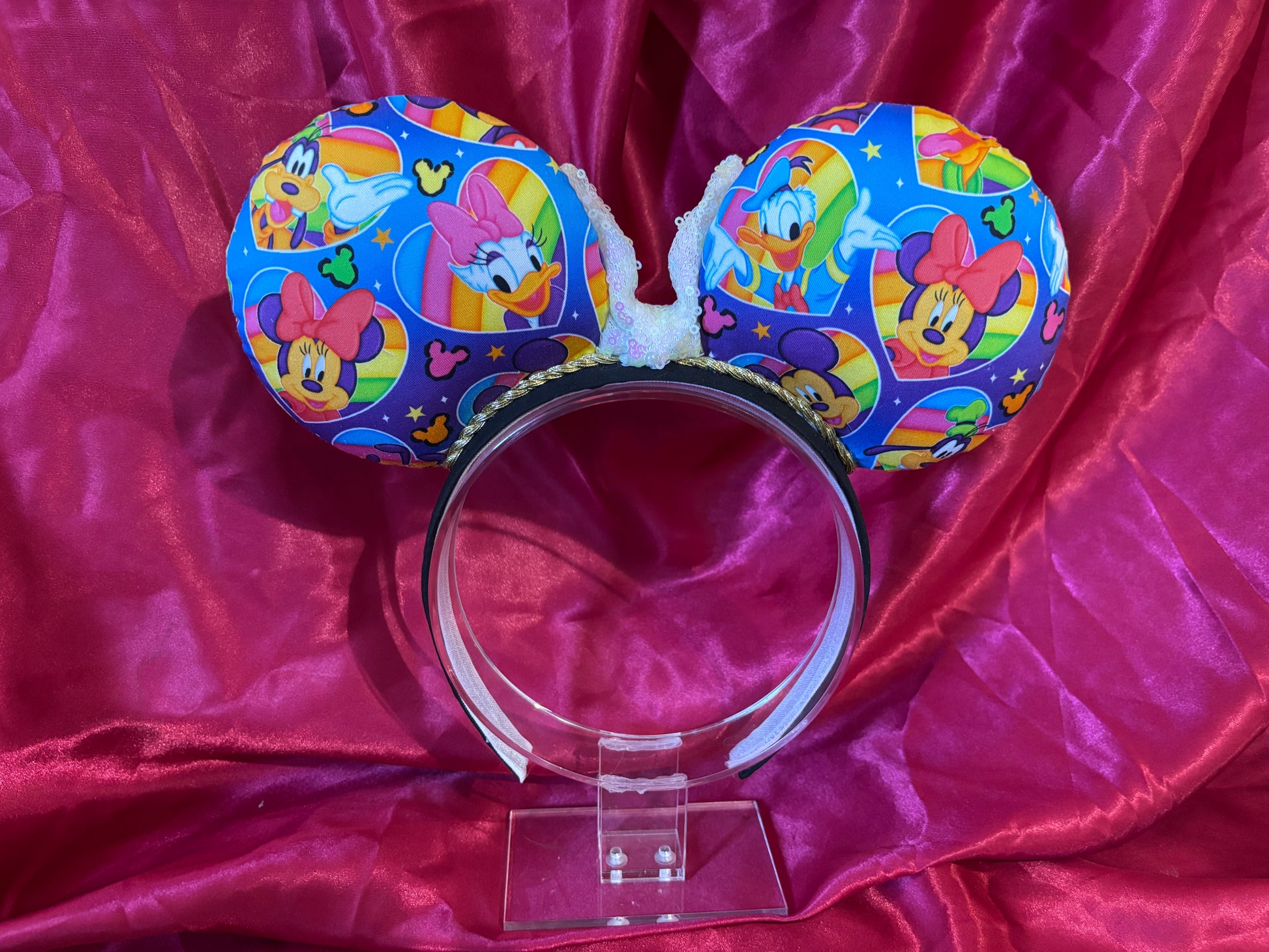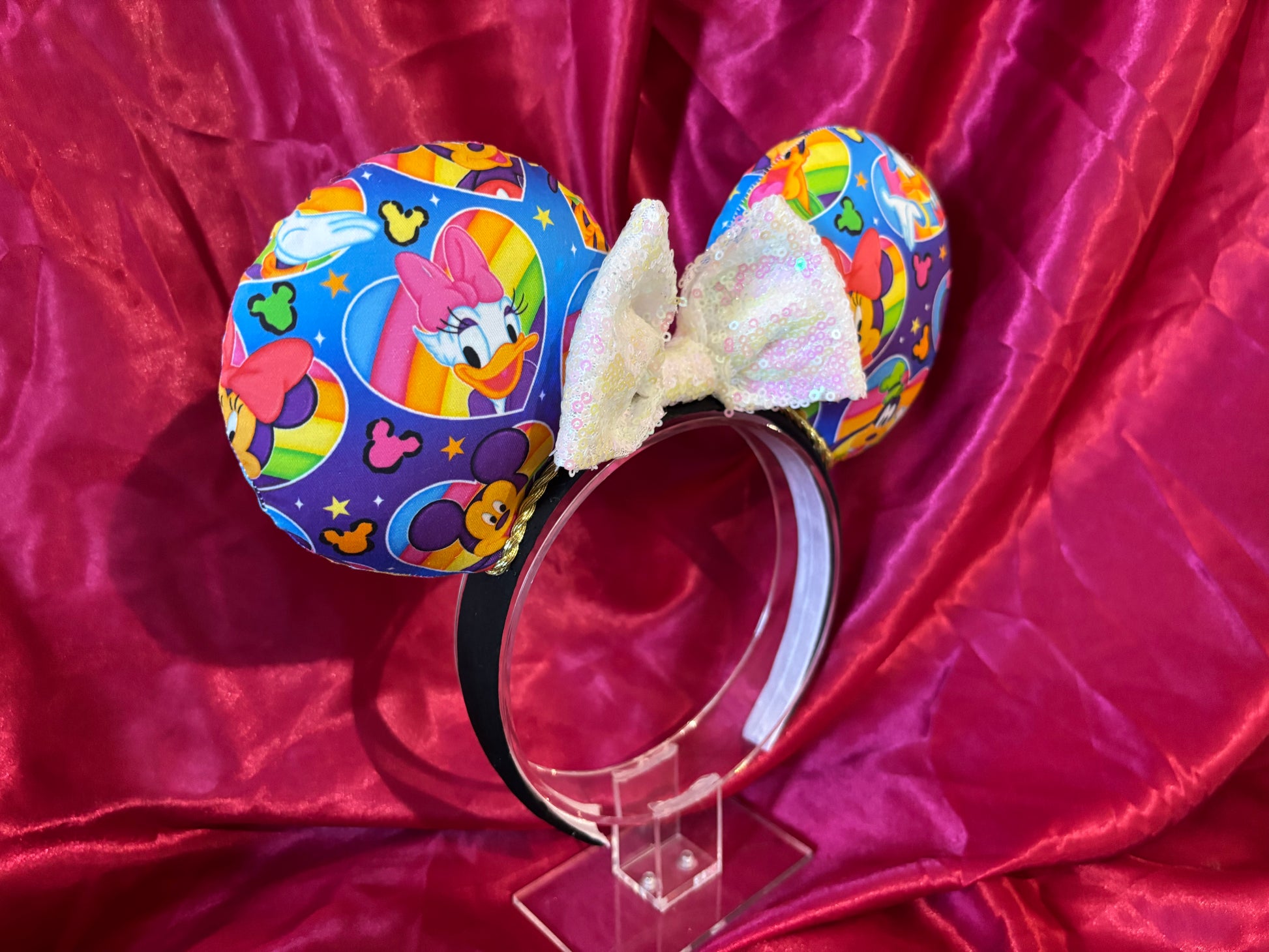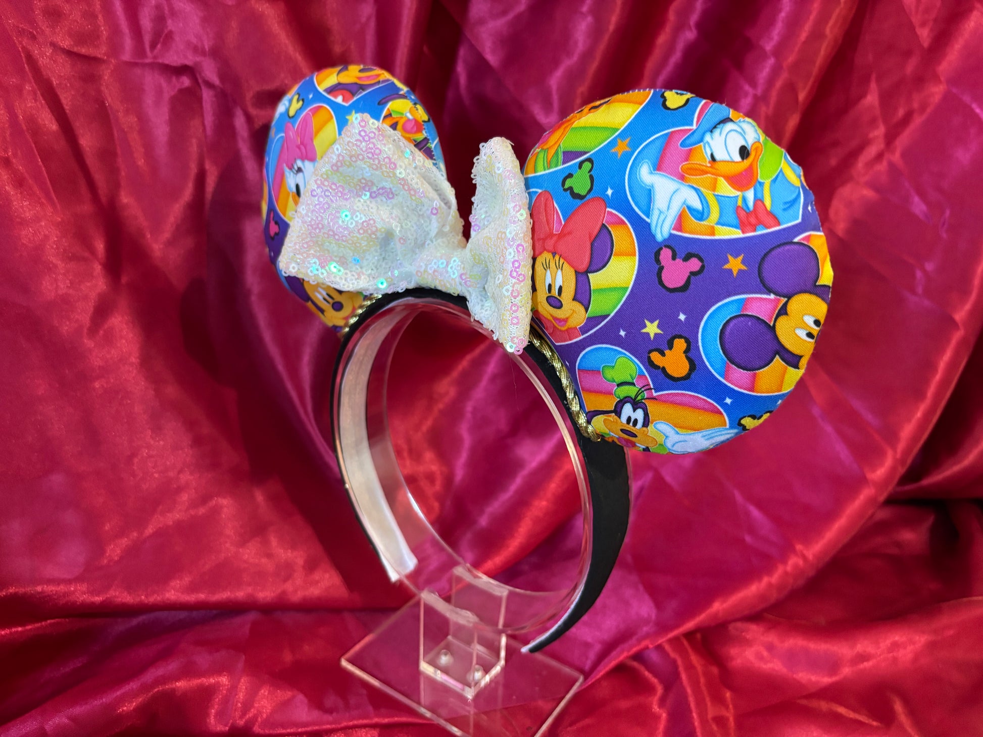 Fabric is on ears front and back. Golden Twisted trim along inner ears with a white iridescent sequin bow. If you’d prefer a different bow color, please write what color in notes or contact me. I’m happy to attach a different sequin bow and I have most colors. Fabric placement varies as these are collage print fabrics. So, each set made is unique. Ears are made and ready to ship. Elastic color on inner headband is white. These are handmade items. The ears are sewn and then hot glued to headband. I then hand sew the ears to the headband for extra protection! Then I attach twisted trim along inner ears. Headbands are universal sized and fit most.