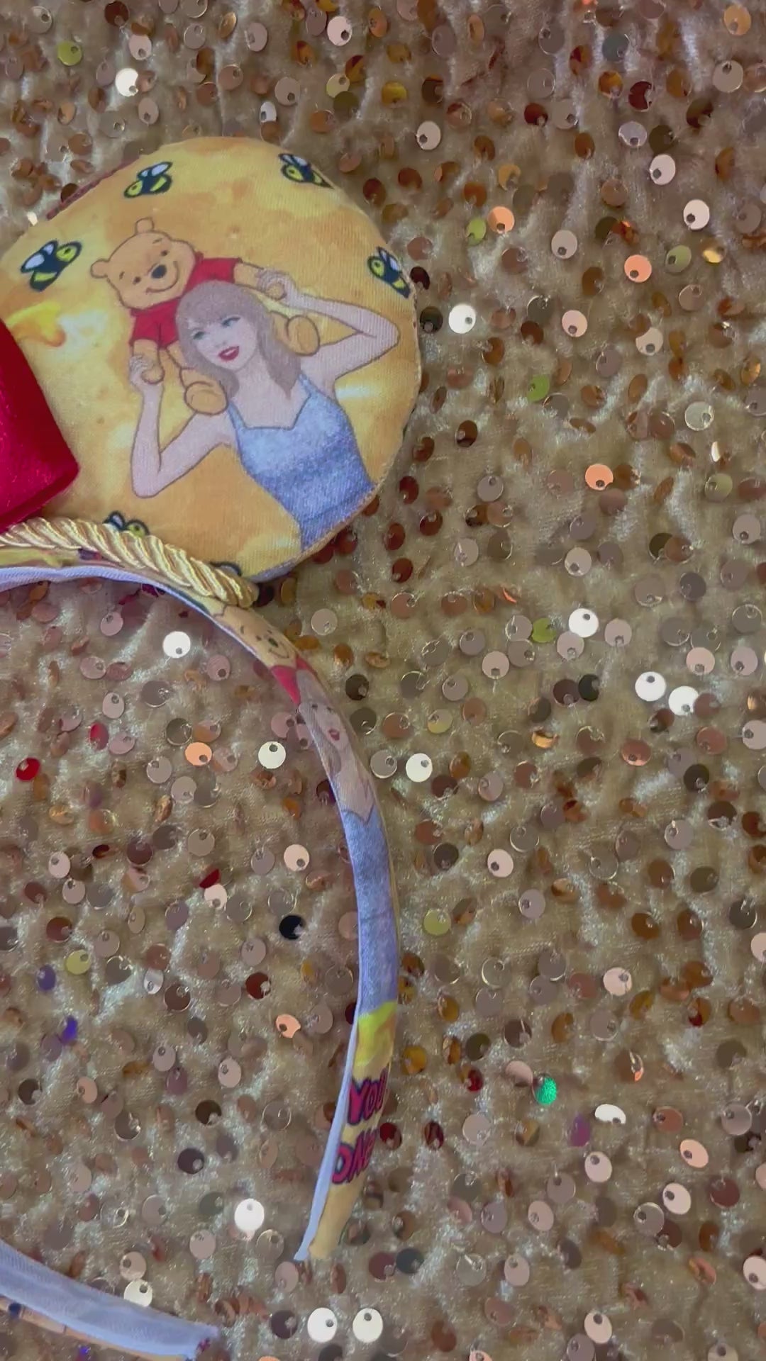 Sweet as honey and uniquely yours — these handcrafted mouse ears are made for Winnie the Pooh fans who love whimsical, one-of-a-kind accessories with elegant golden details. Featuring honey-themed fabric, gold twisted trim, and an adorable red plush bow with a honeycomb accent, every pair is truly special.