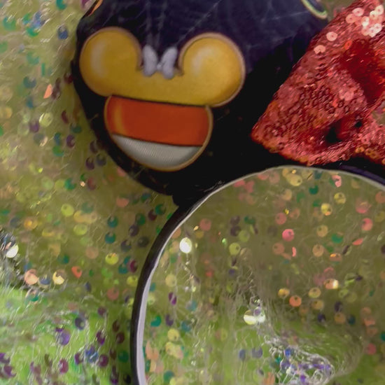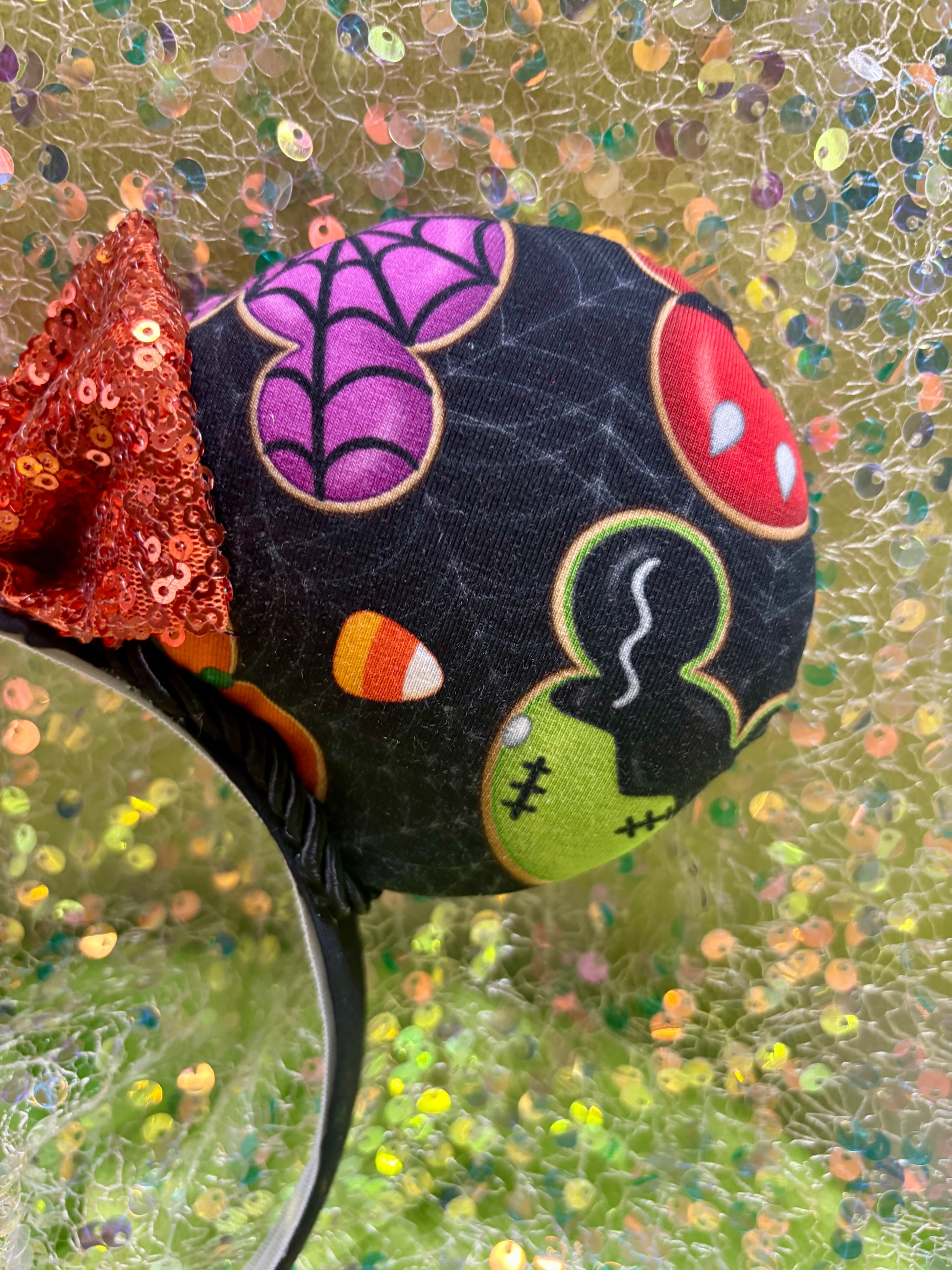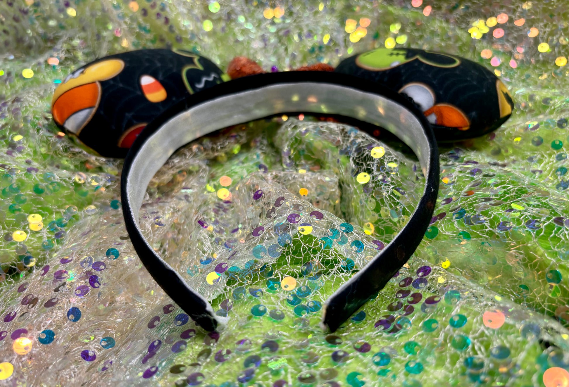 Celebrate Mickey's Not-So-Scary Halloween Party in the most adorable way — these handcrafted Halloween Treats mouse ears are made for fall park visits and spooky season fun. Featuring festive sugar cookie and candy-print fabric, an orange sequin bow, and triple-reinforced construction, these ears are ready to ship and ready to wear.