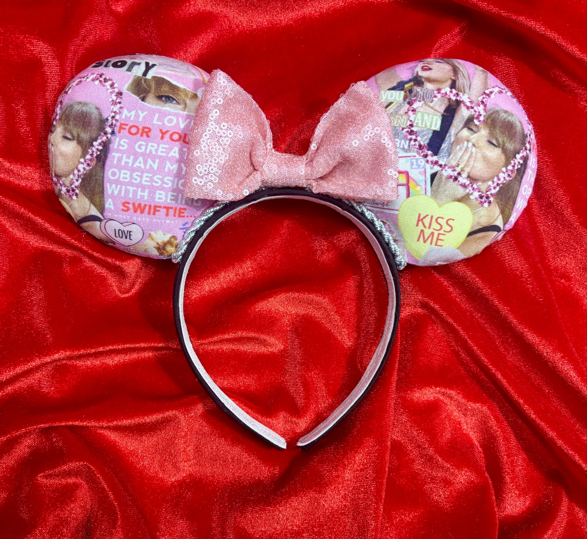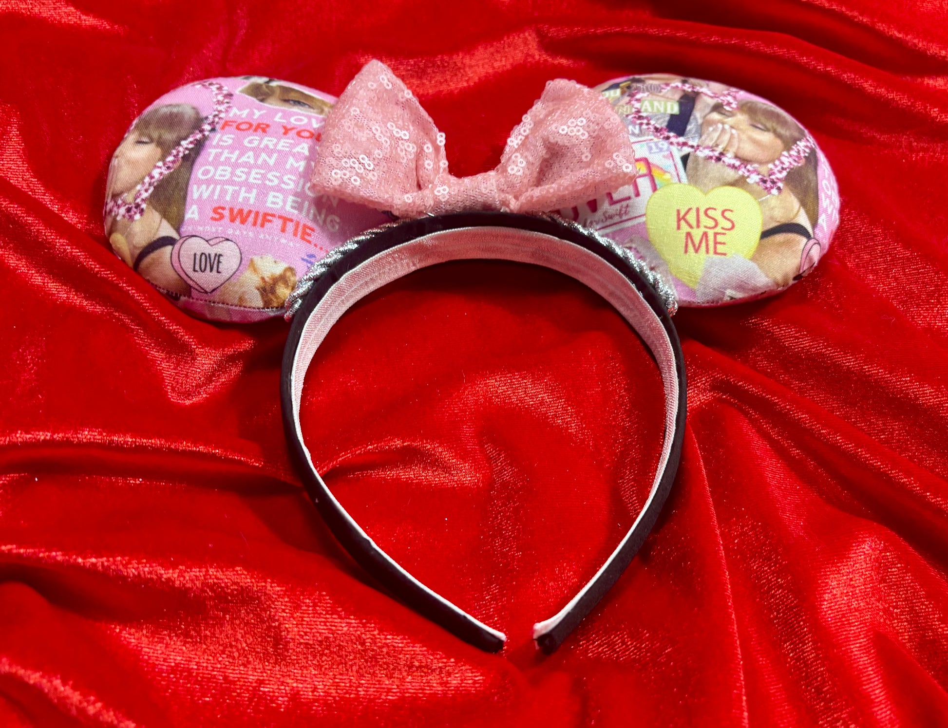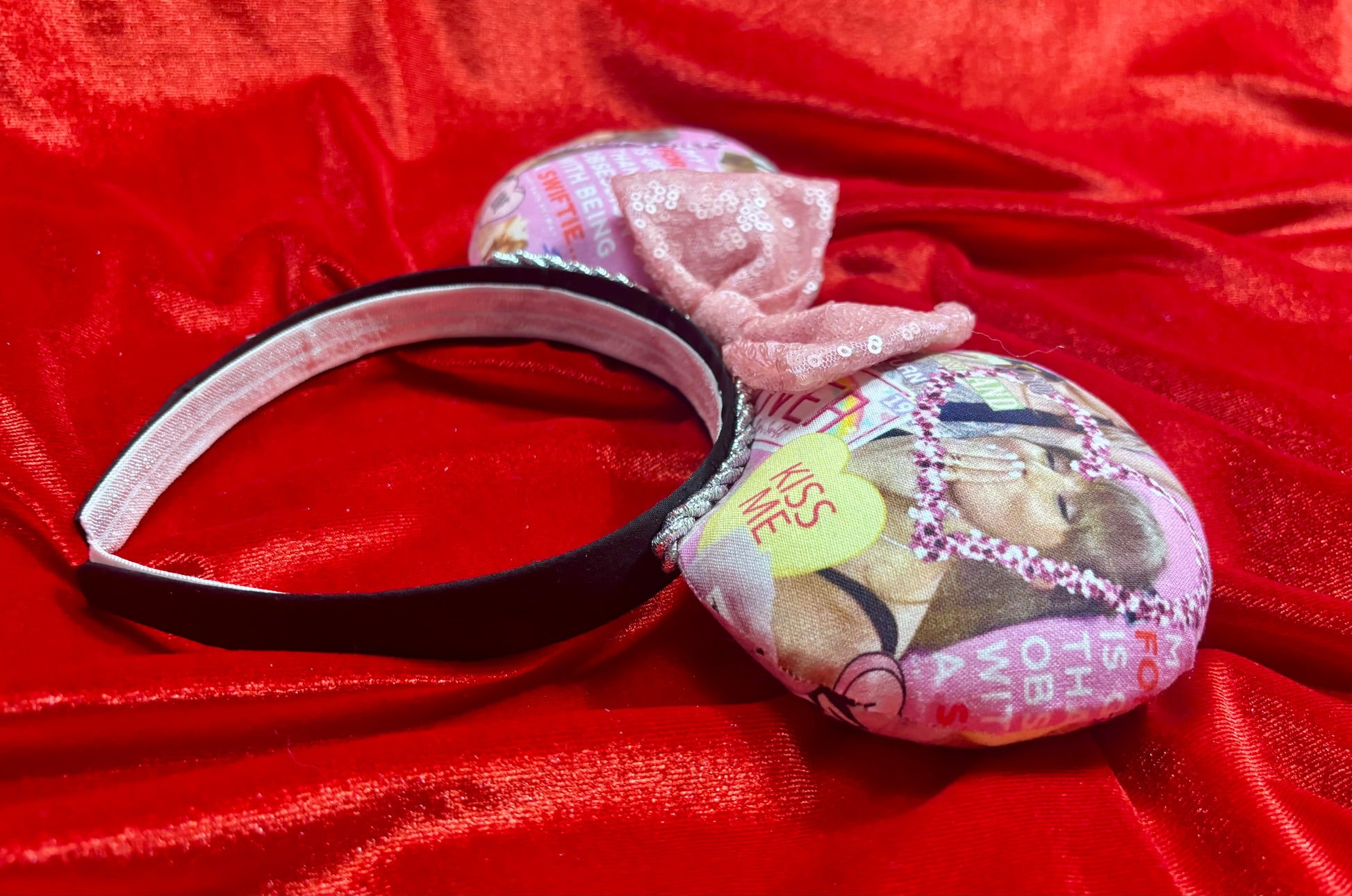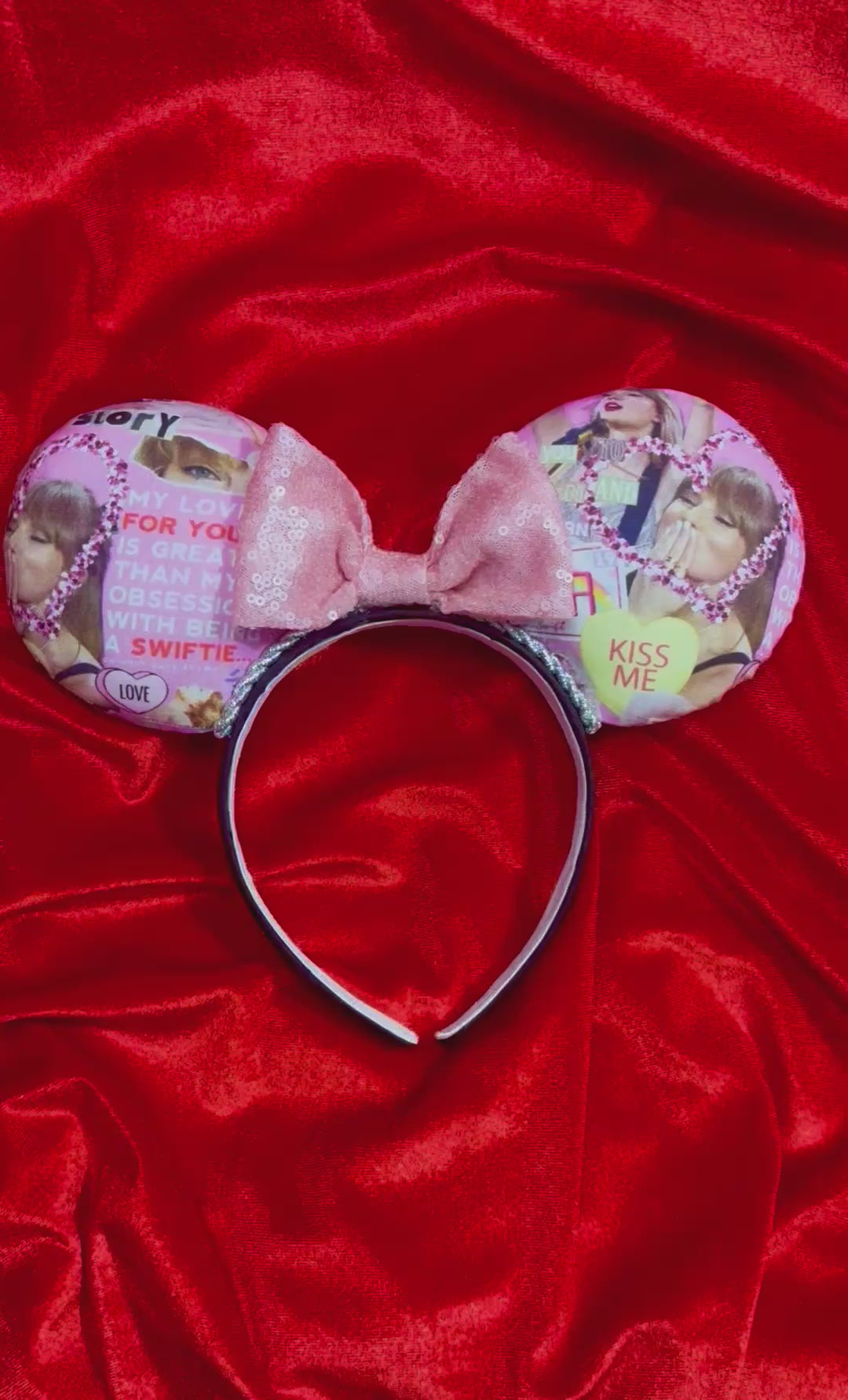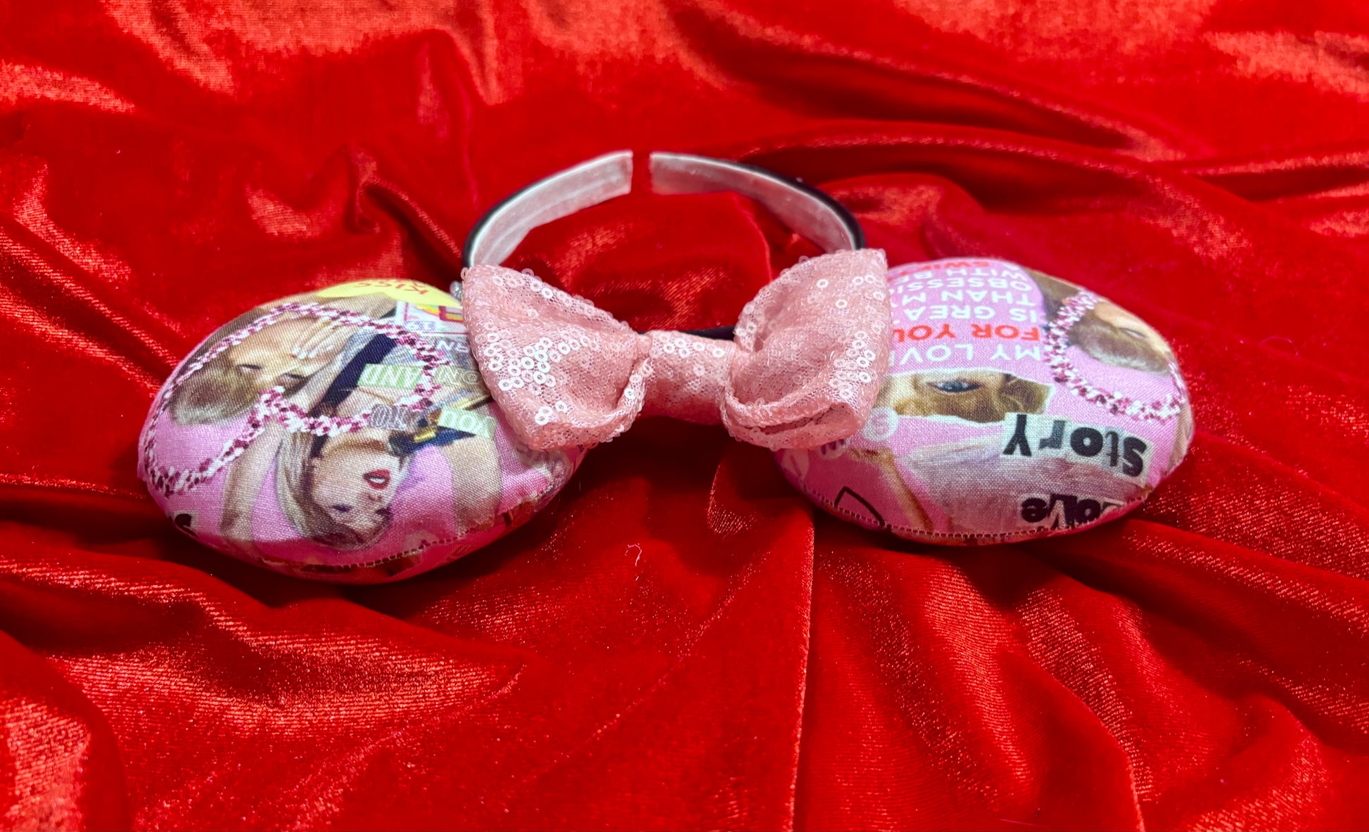 Fabric is on ears front and back. Twisted trim along inner ears with a light pink sequin bow. Elastic color on inner headband is white. ‼️Fabric placement varies.‼️ No two sets are identical. These are handmade items. The ears are sewn and then hot glued to headband then hand stitched for extra protection. They’re lined with twisted trim along inner ears. Headband size is universal and fits most. If you’d like a bow color different than the light pink sequin, leave me a note or message me and I’ll happily attach it for you. I have most colors in sequin bows.