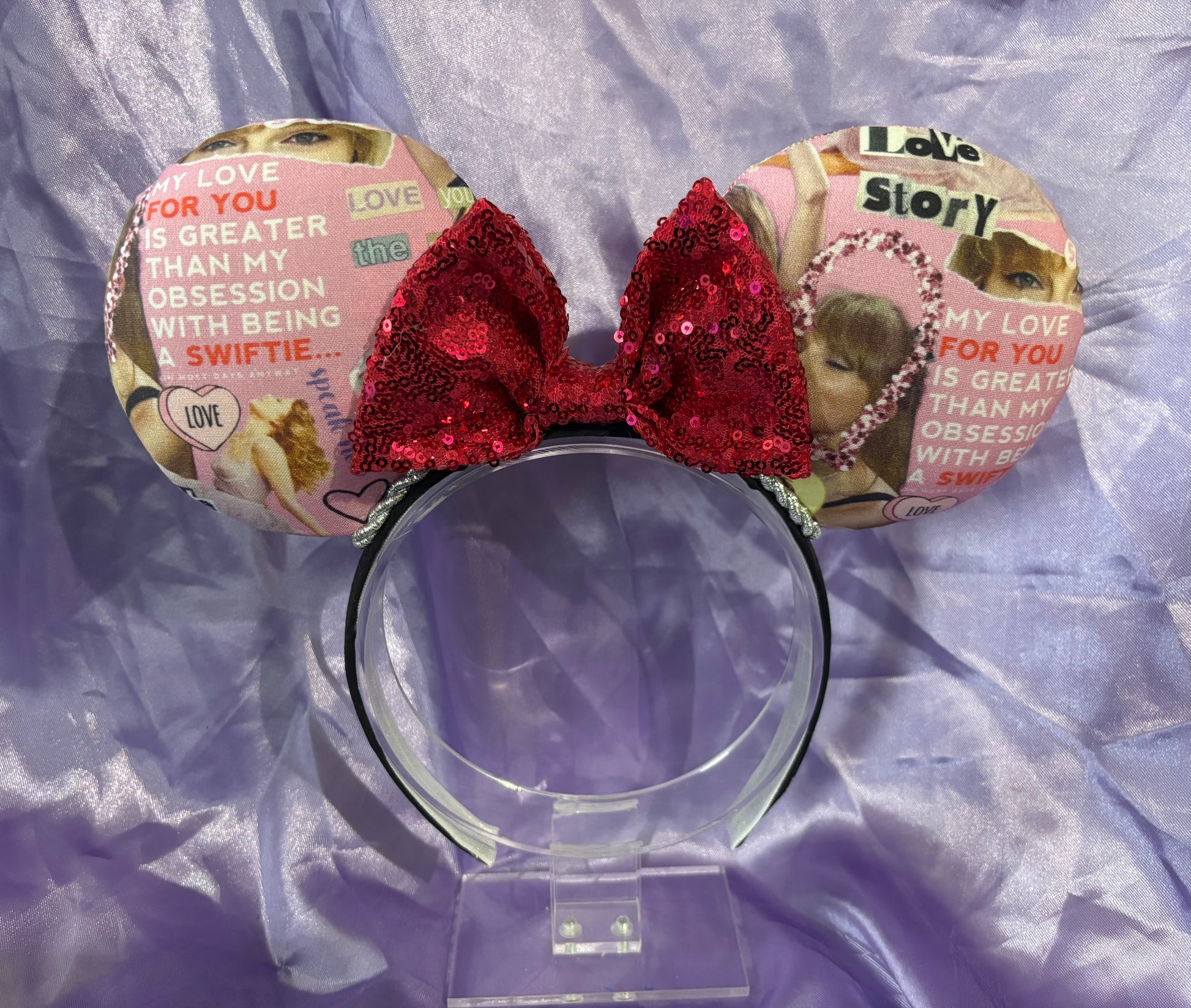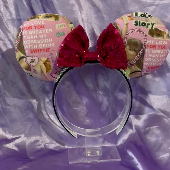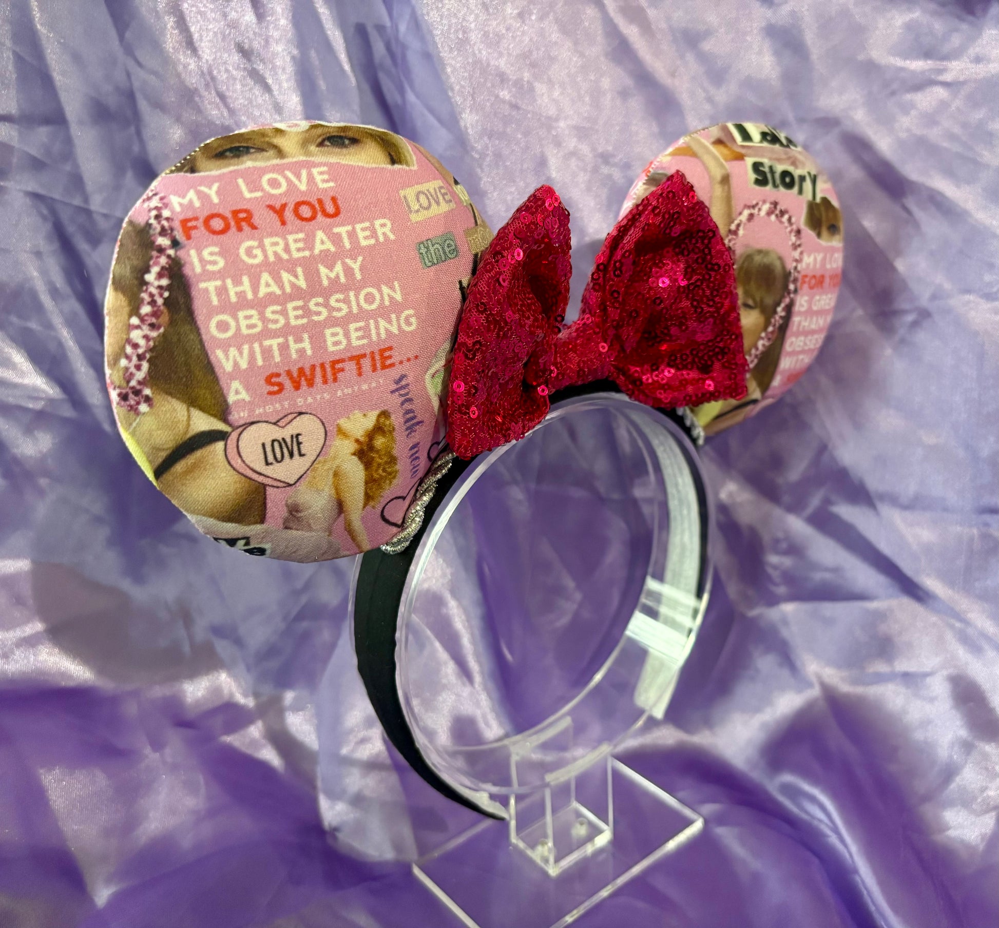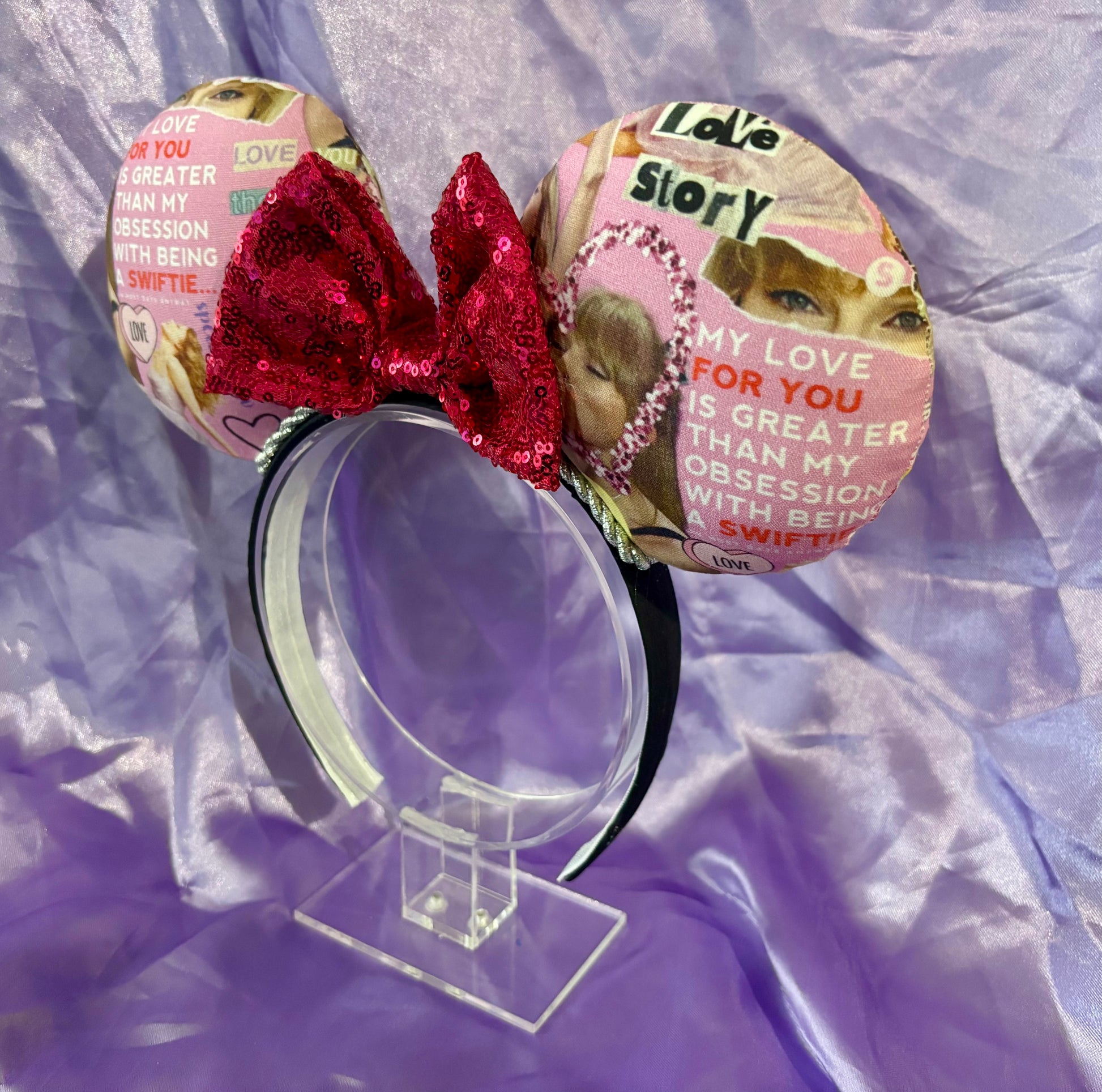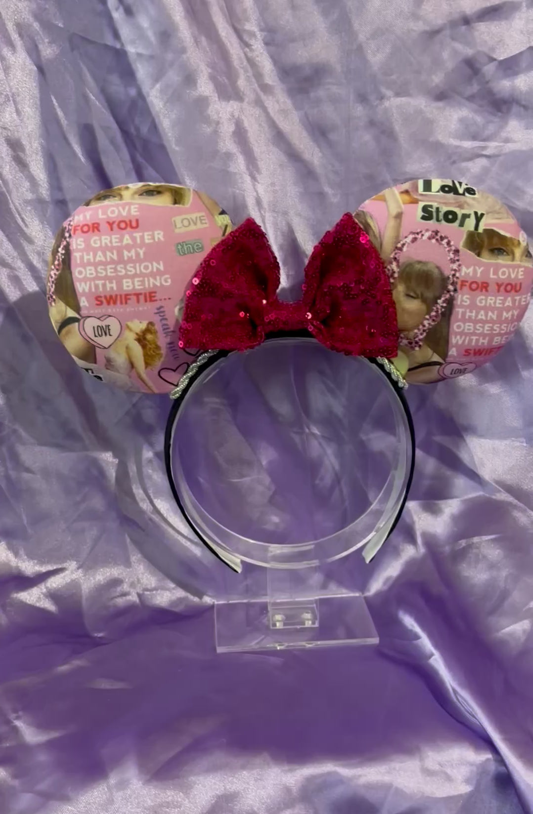 Fabric is on ears front and back. Twisted trim along inner ears with a light pink sequin bow. Elastic color on inner headband is white. ‼️Fabric placement varies.‼️ No two sets are identical. These are handmade items. The ears are sewn and then hot glued to headband then hand stitched for extra protection. They’re lined with twisted trim along inner ears. Headband size is universal and fits most. If you’d like a bow color different than the light pink sequin, leave me a note or message me and I’ll happily attach it for you. I have most colors in sequin bows.