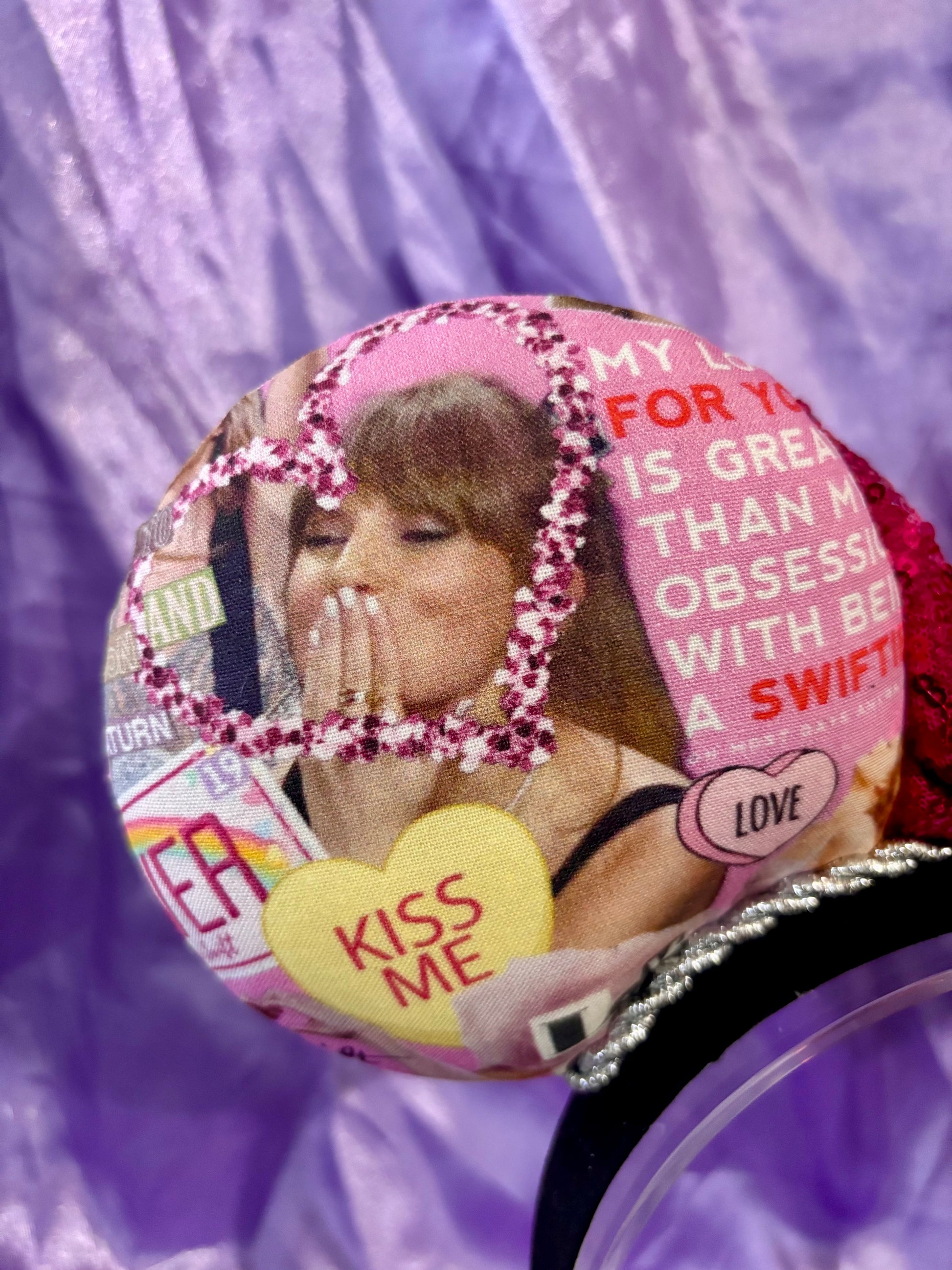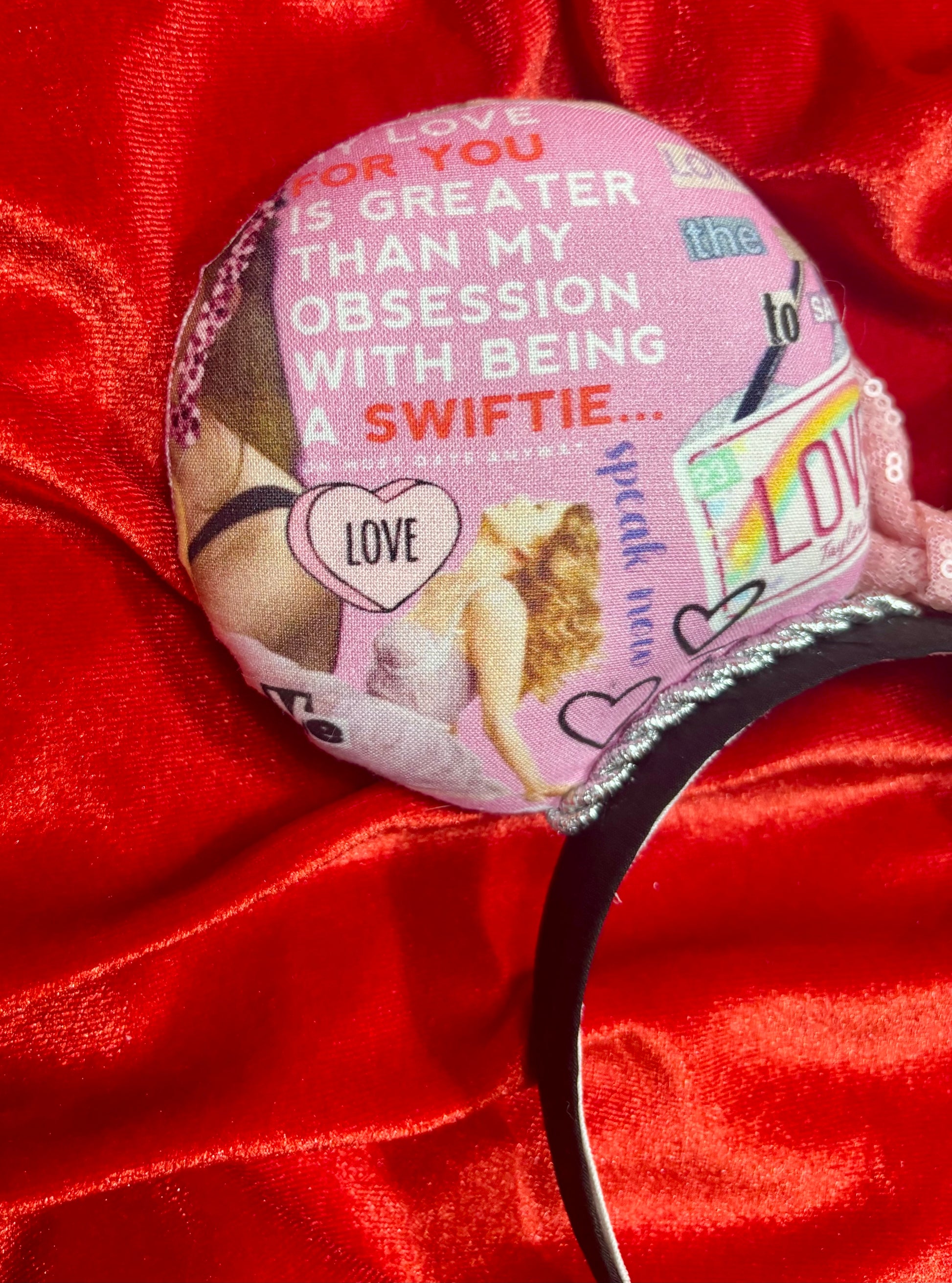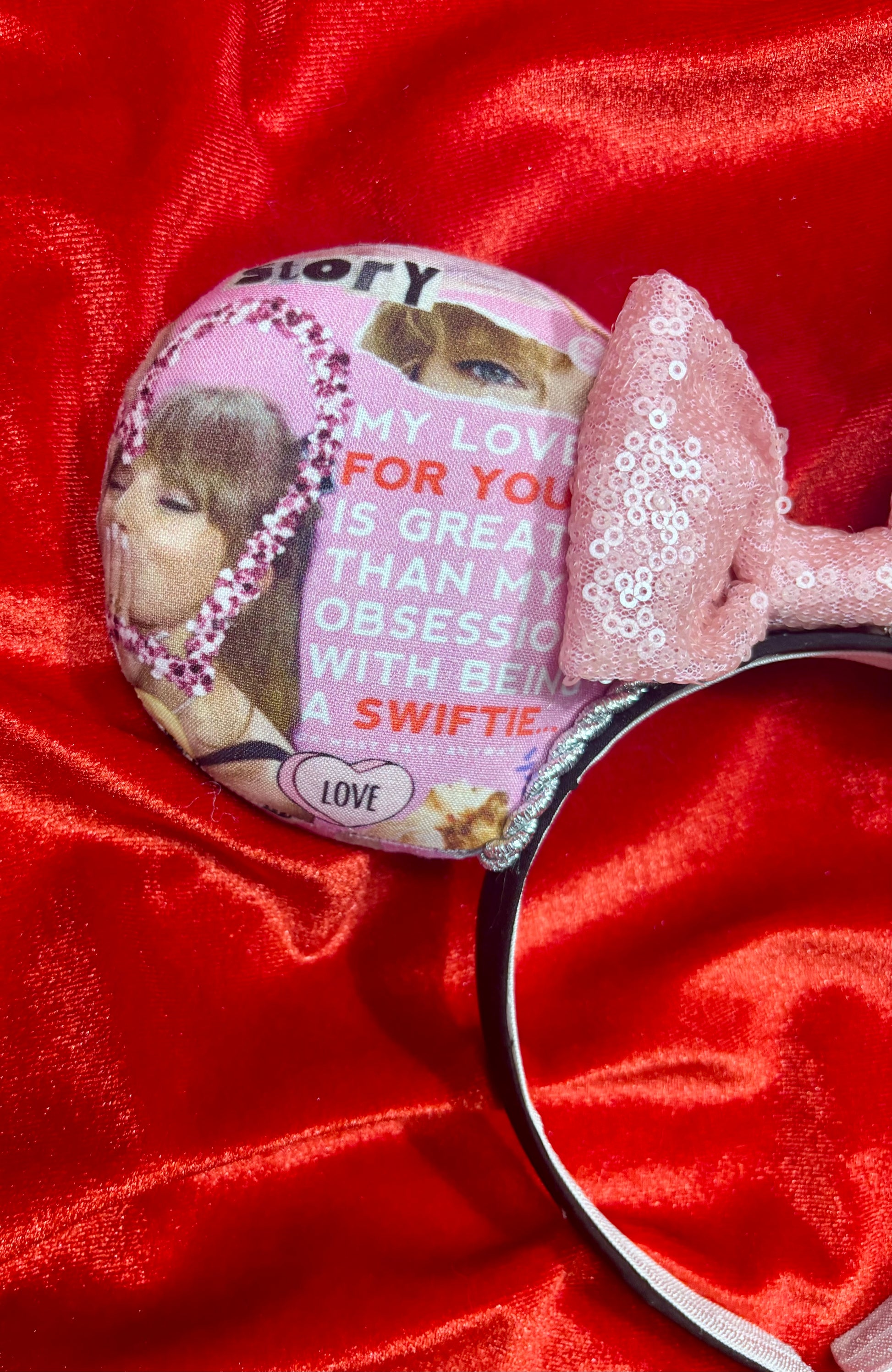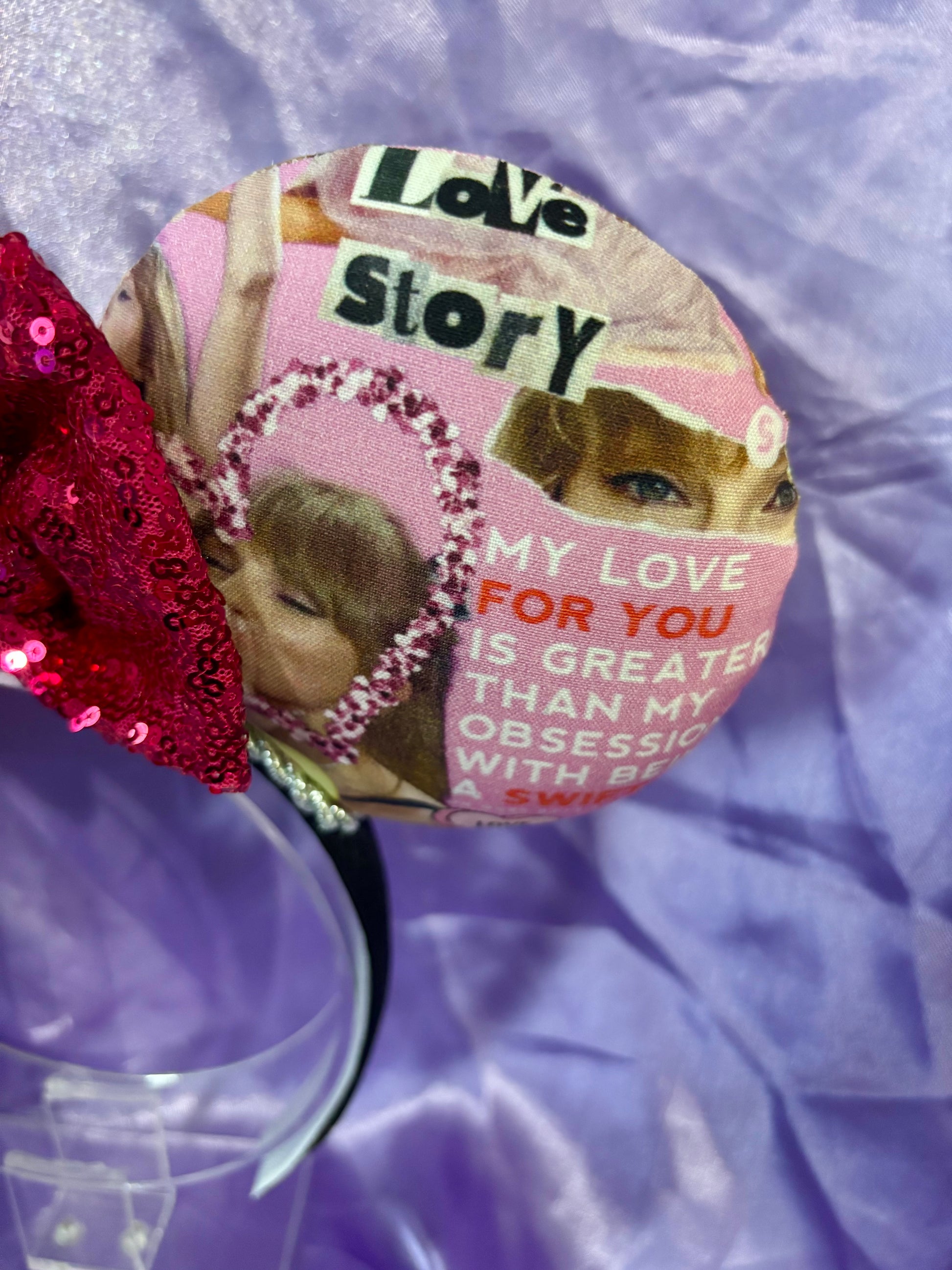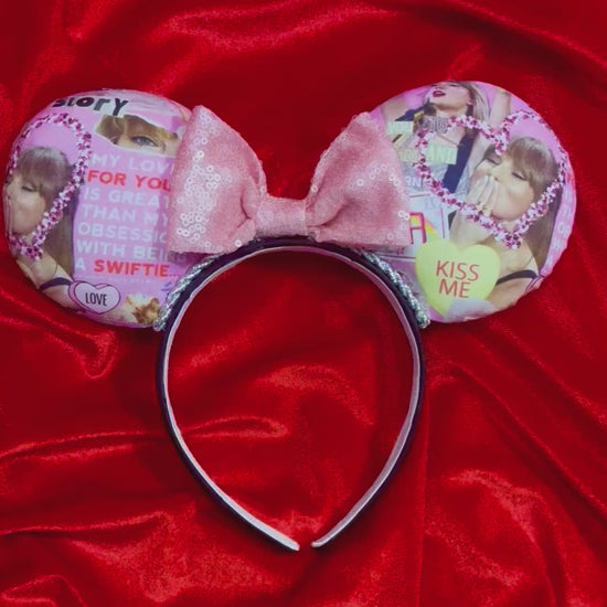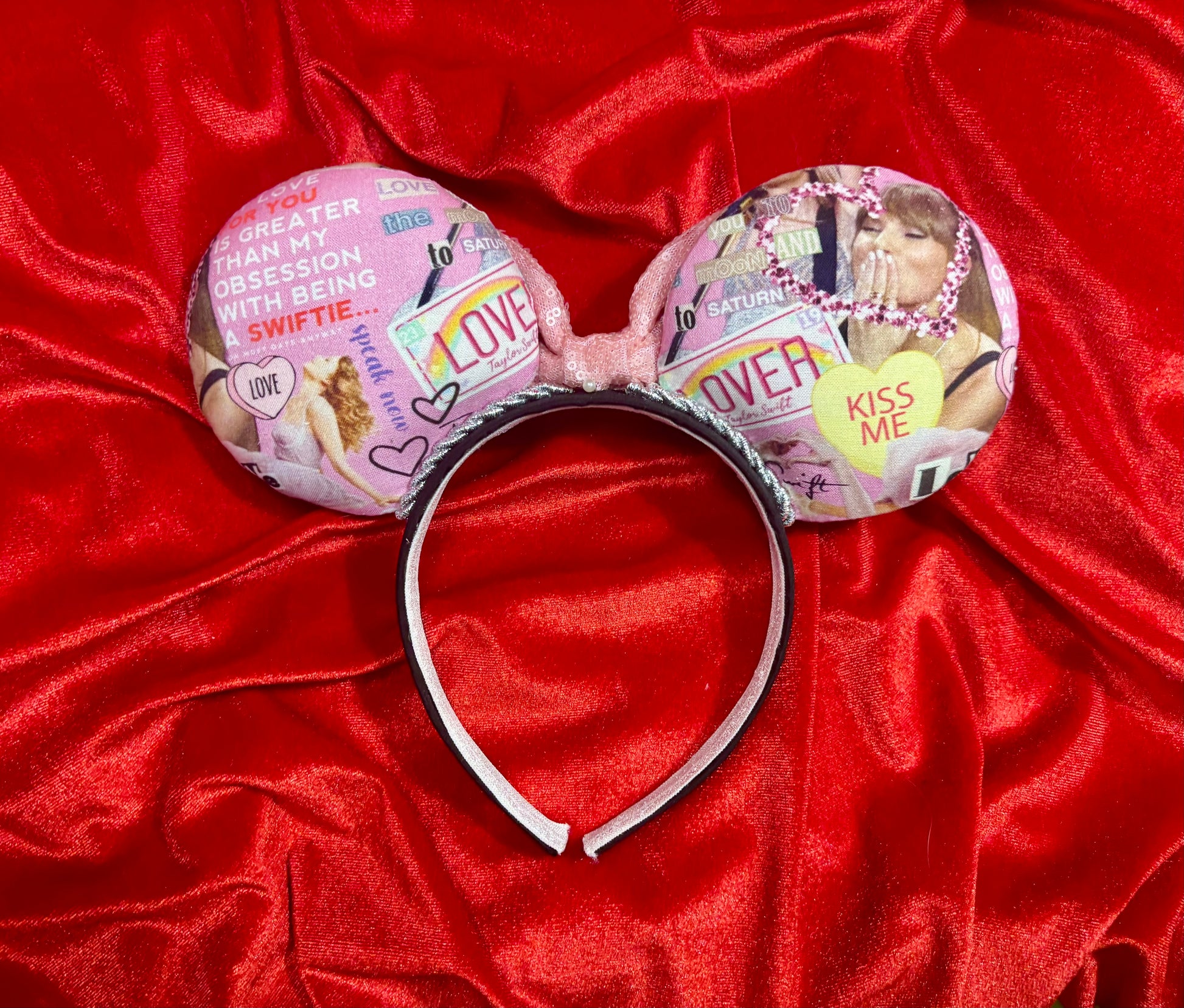 Fabric is on ears front and back. Twisted trim along inner ears with a light pink sequin bow. Elastic color on inner headband is white. ‼️Fabric placement varies.‼️ No two sets are identical. These are handmade items. The ears are sewn and then hot glued to headband then hand stitched for extra protection. They’re lined with twisted trim along inner ears. Headband size is universal and fits most. If you’d like a bow color different than the light pink sequin, leave me a note or message me and I’ll happily attach it for you. I have most colors in sequin bows.