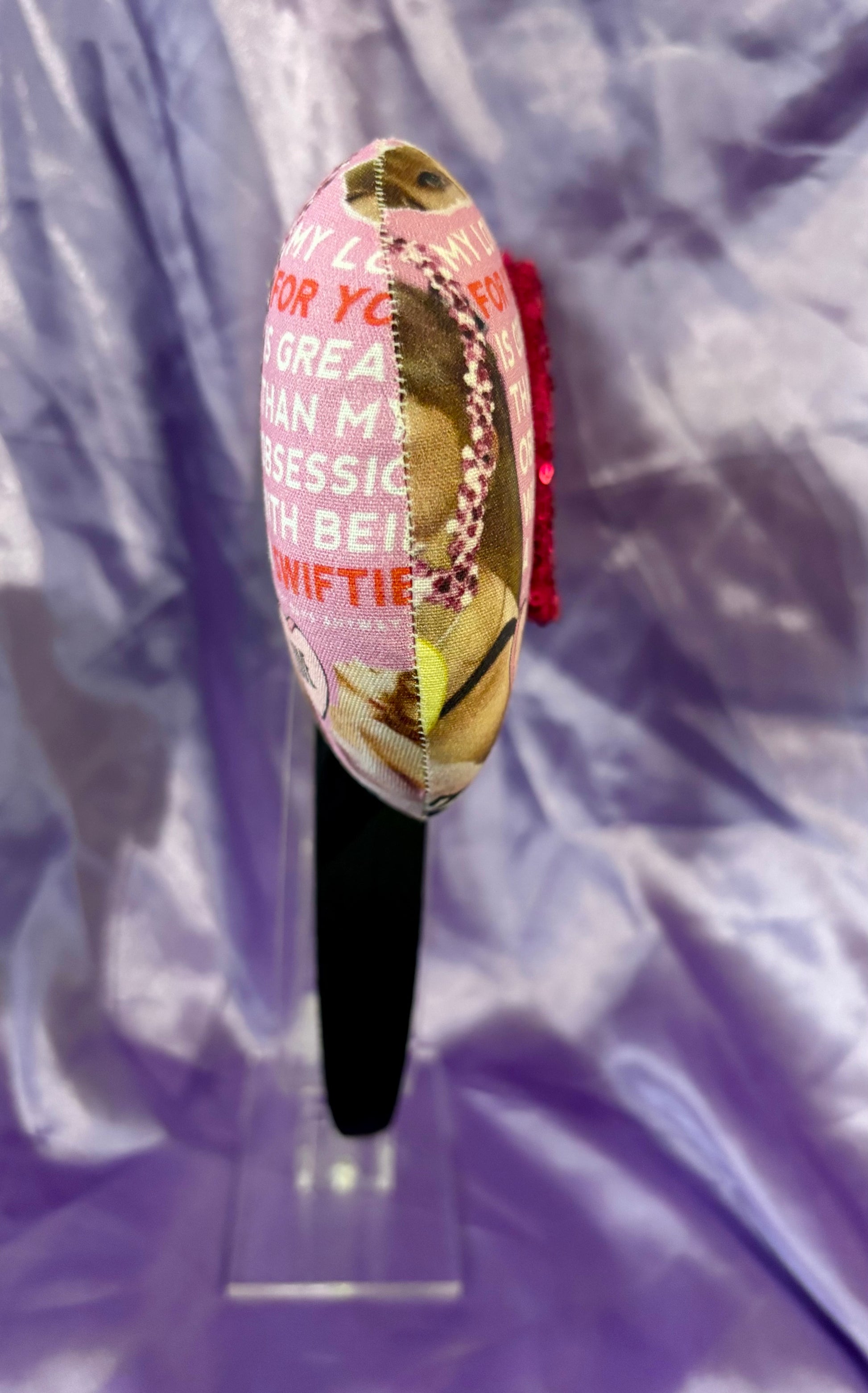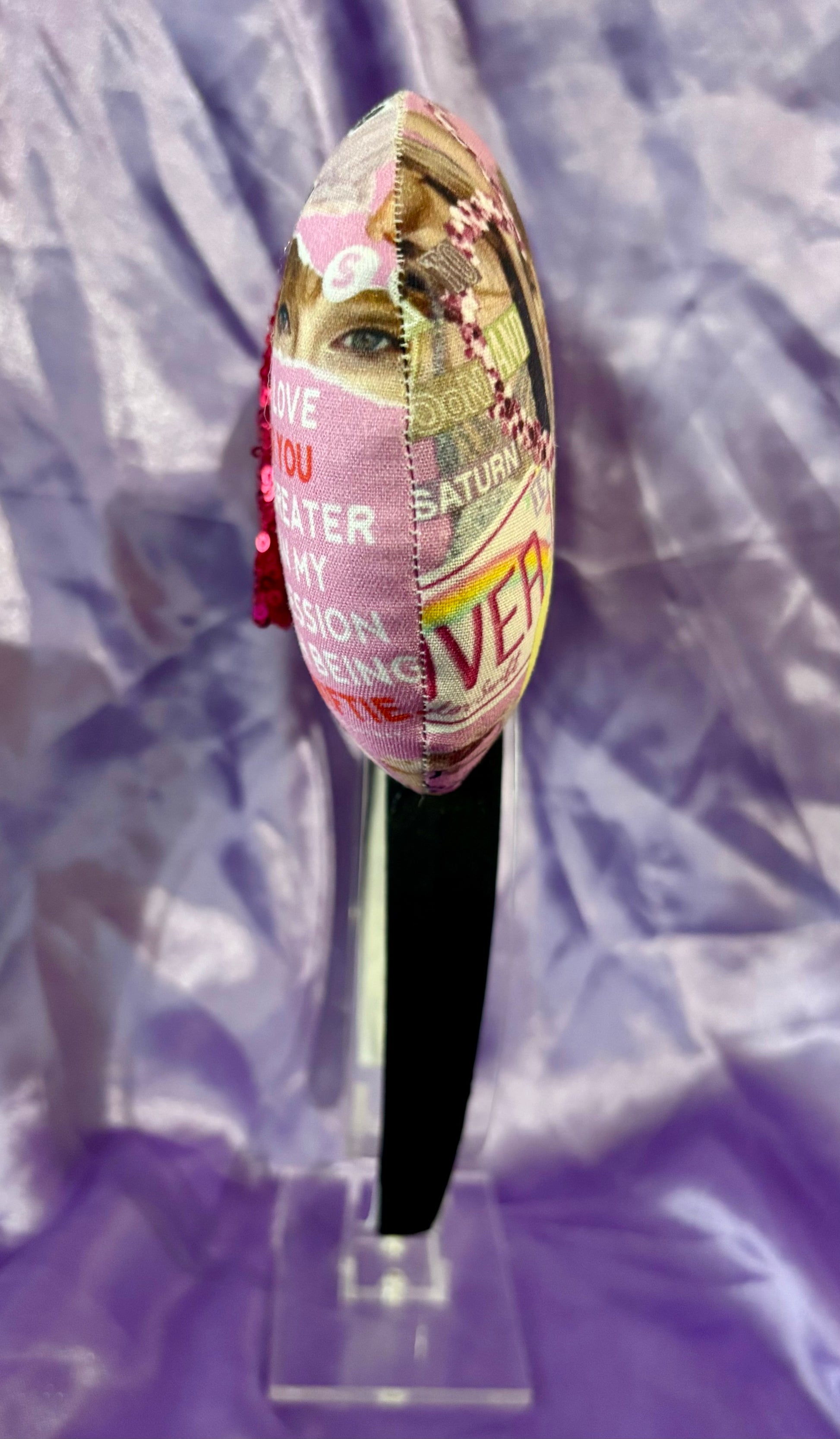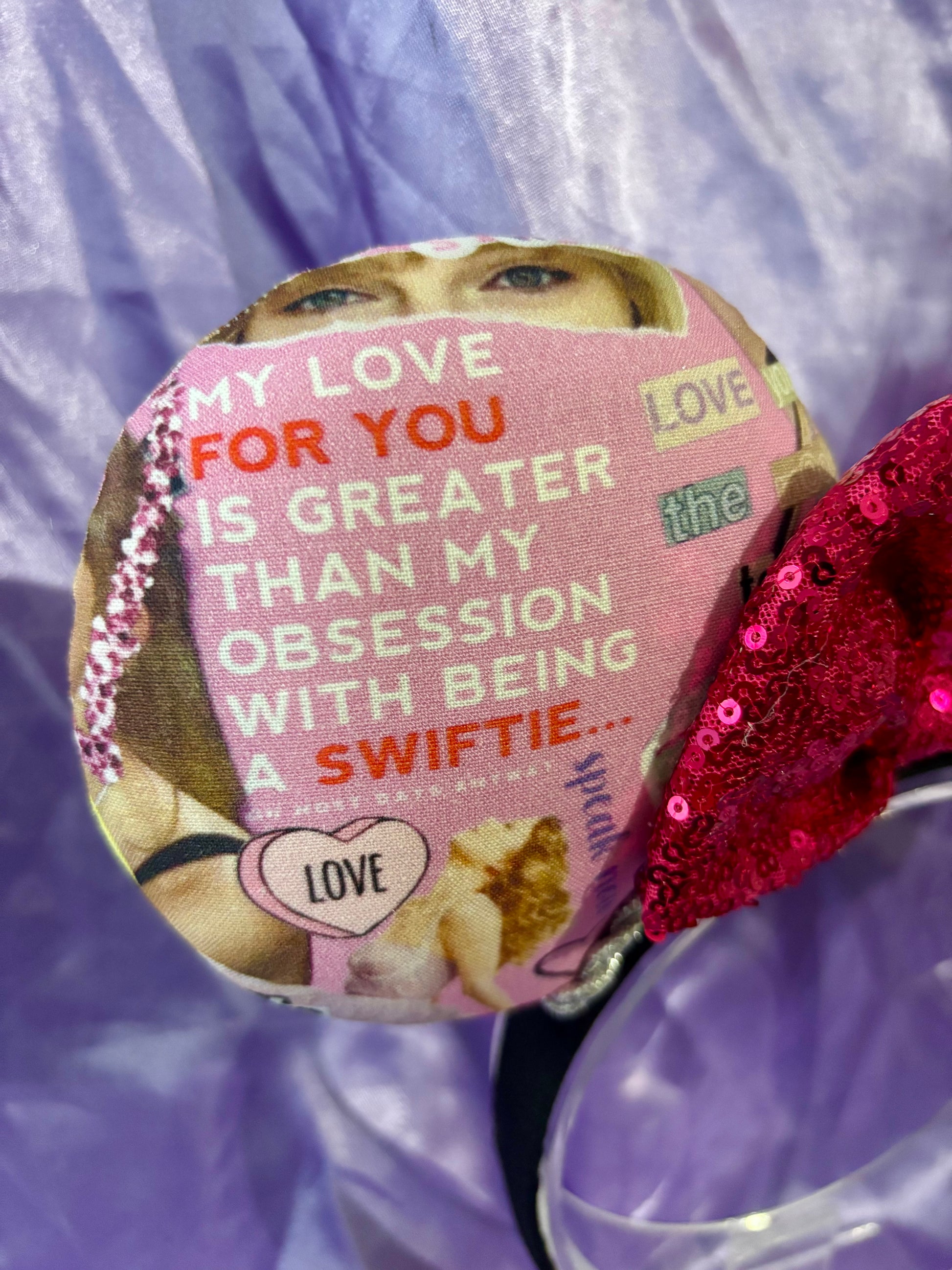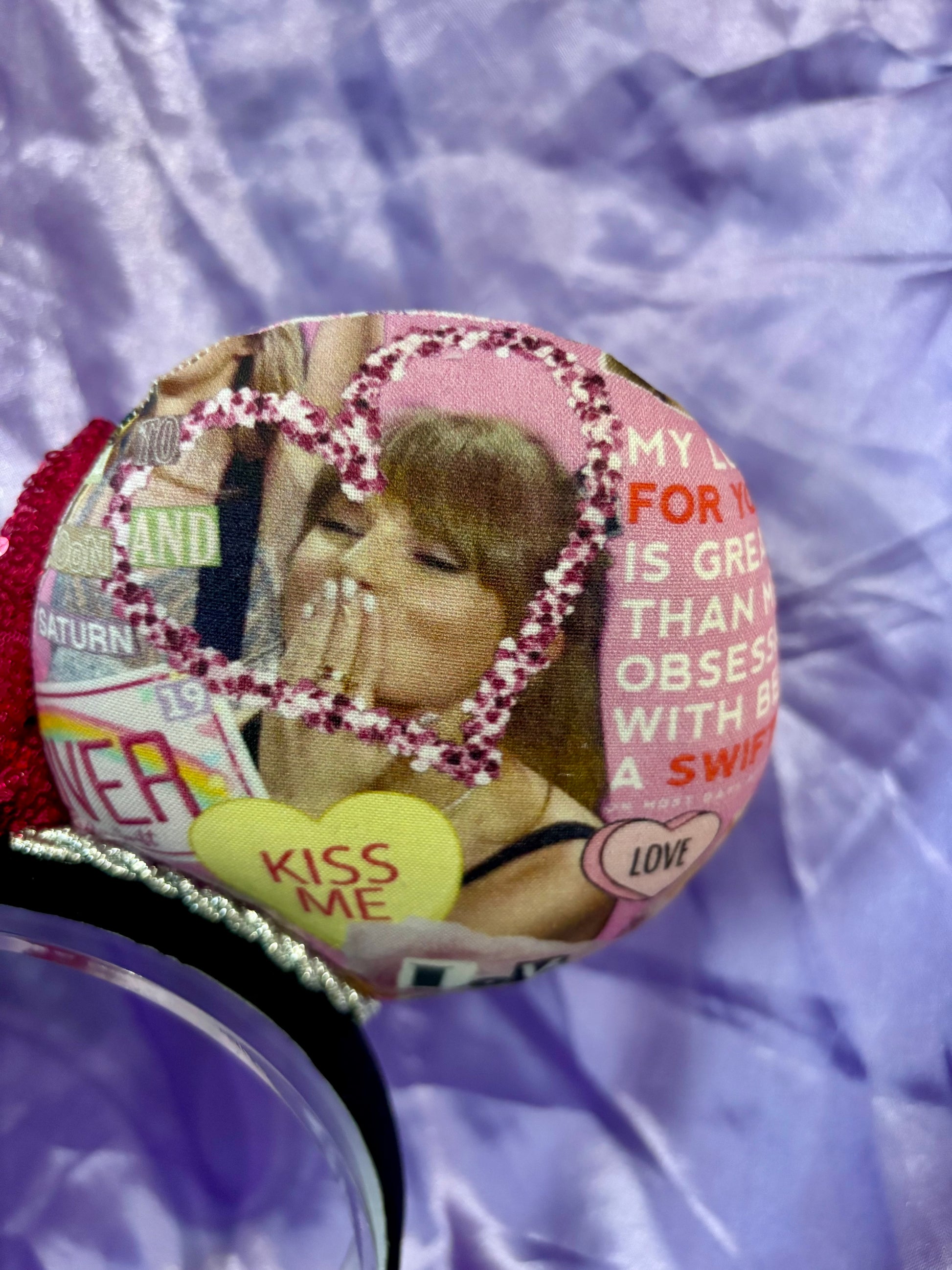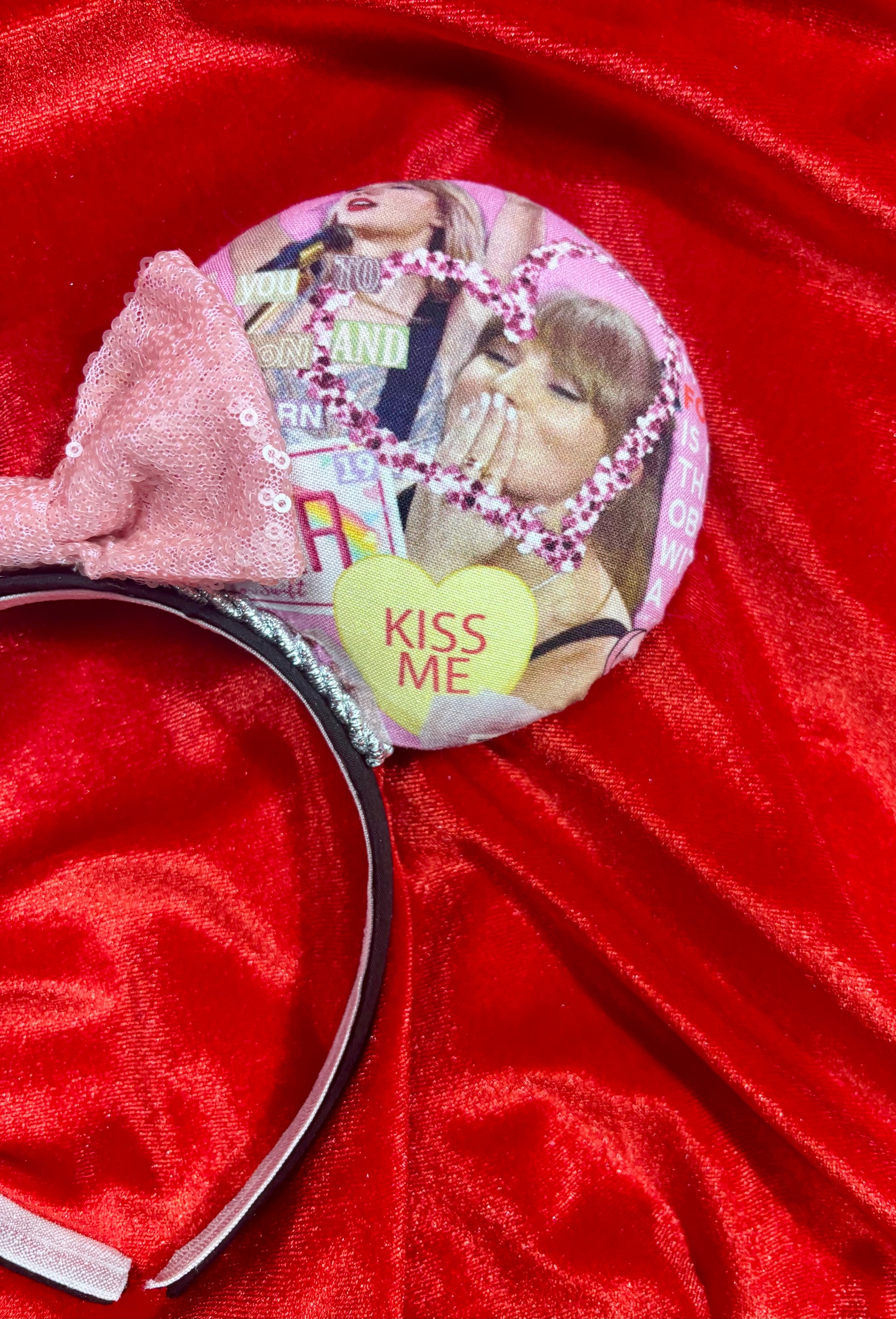 Fabric is on ears front and back. Twisted trim along inner ears with a light pink sequin bow. Elastic color on inner headband is white. ‼️Fabric placement varies.‼️ No two sets are identical. These are handmade items. The ears are sewn and then hot glued to headband then hand stitched for extra protection. They’re lined with twisted trim along inner ears. Headband size is universal and fits most. If you’d like a bow color different than the light pink sequin, leave me a note or message me and I’ll happily attach it for you. I have most colors in sequin bows.