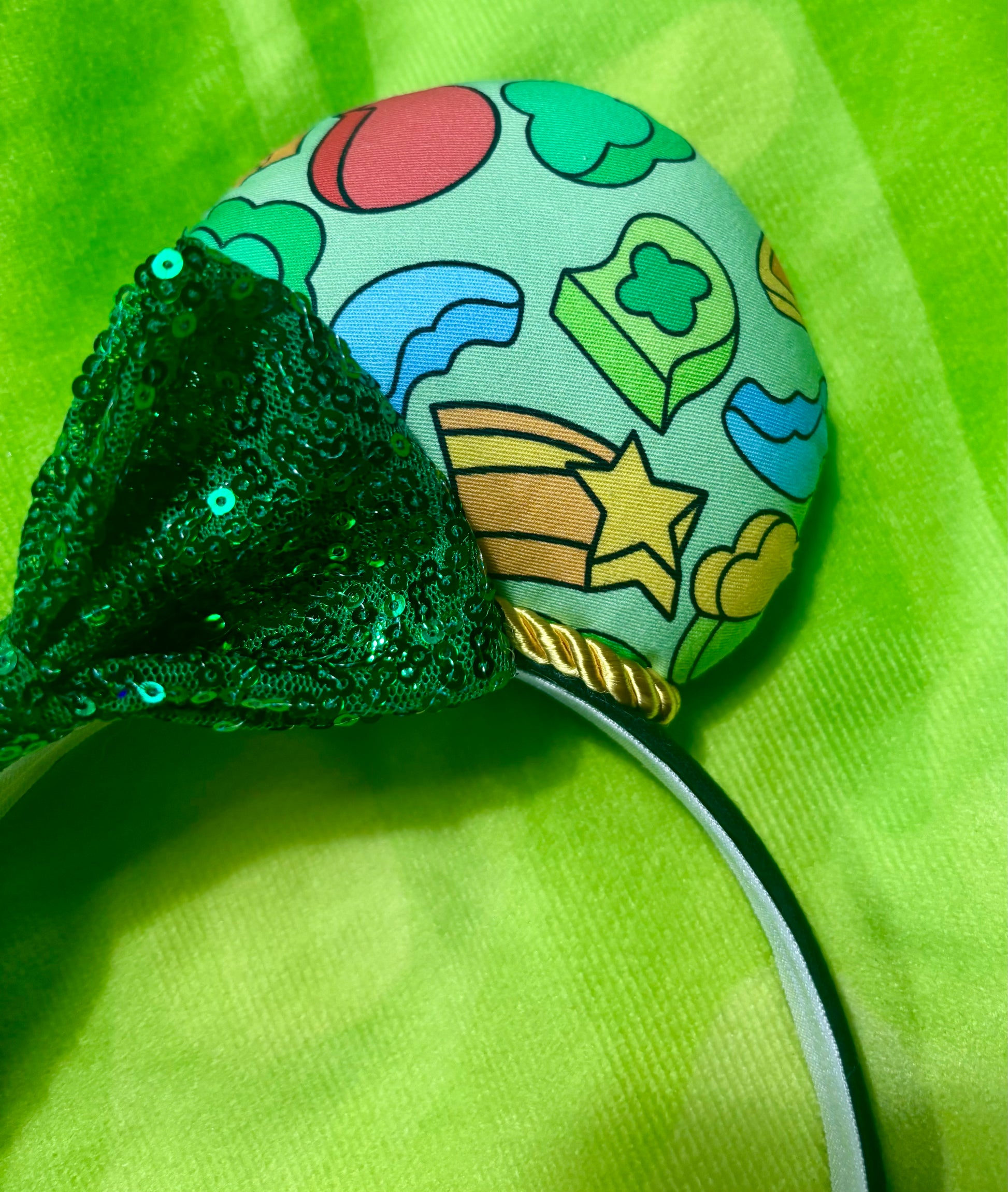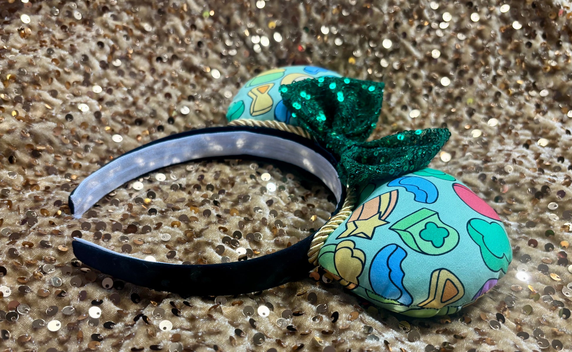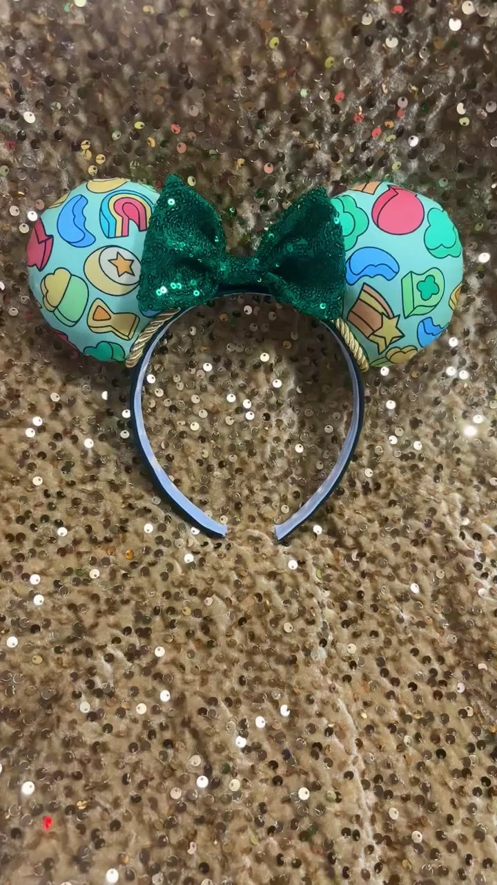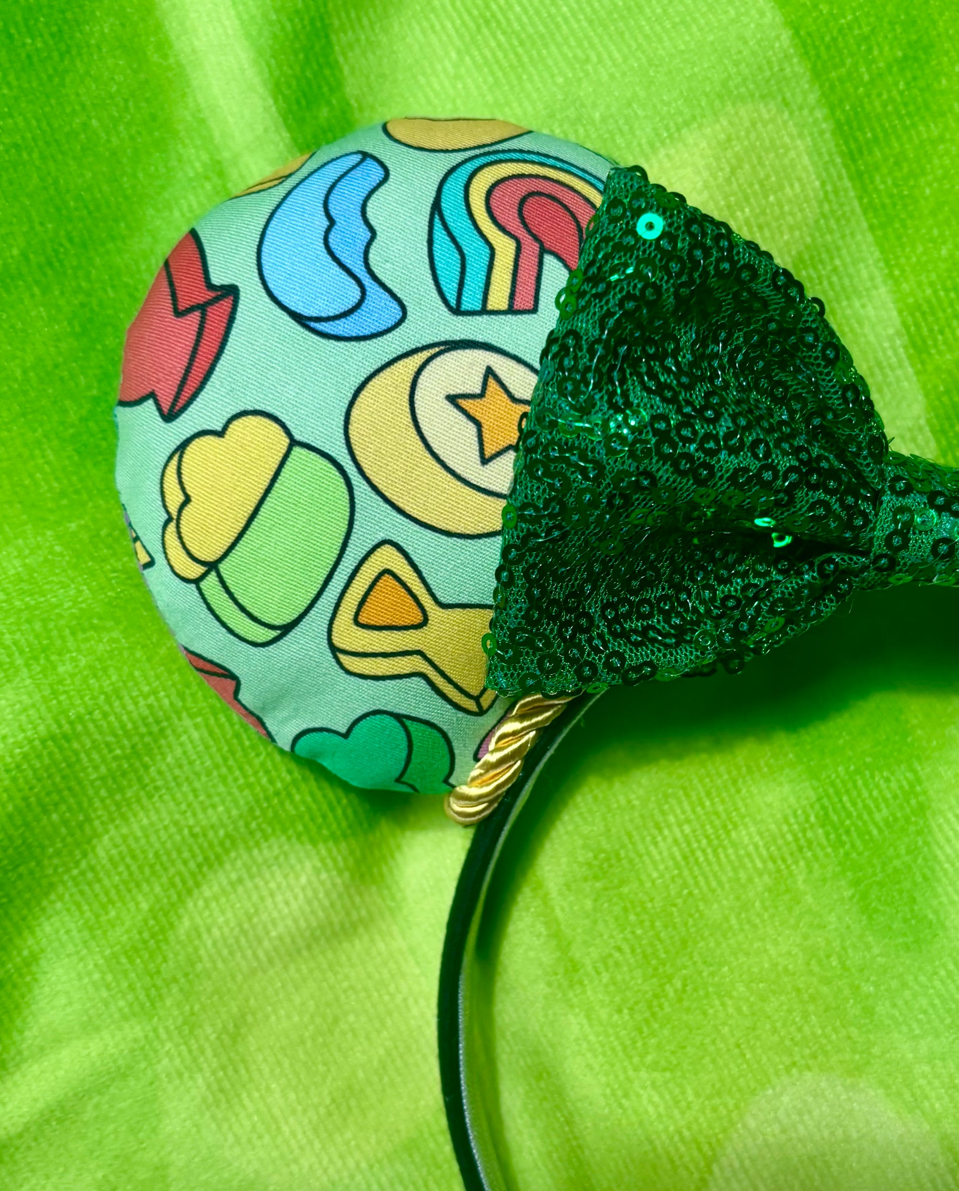 Don’t forget to wear your green this St Patrick’s Day! Fabric is on ears front and back and black fabric on the headband. Gold Twisted trim along inner ears with a green sequin bow. Elastic on inner headband. The headbands are universal sized and fit most. The ears are sewn, hot glued to headband and then handstitched to headband for extra protection!!! 🫶🏻 if you’d prefer a color other than the green sequin, please message me or write me a note in your order and I’ll happily attach it for you. I have most color of sequin bows.